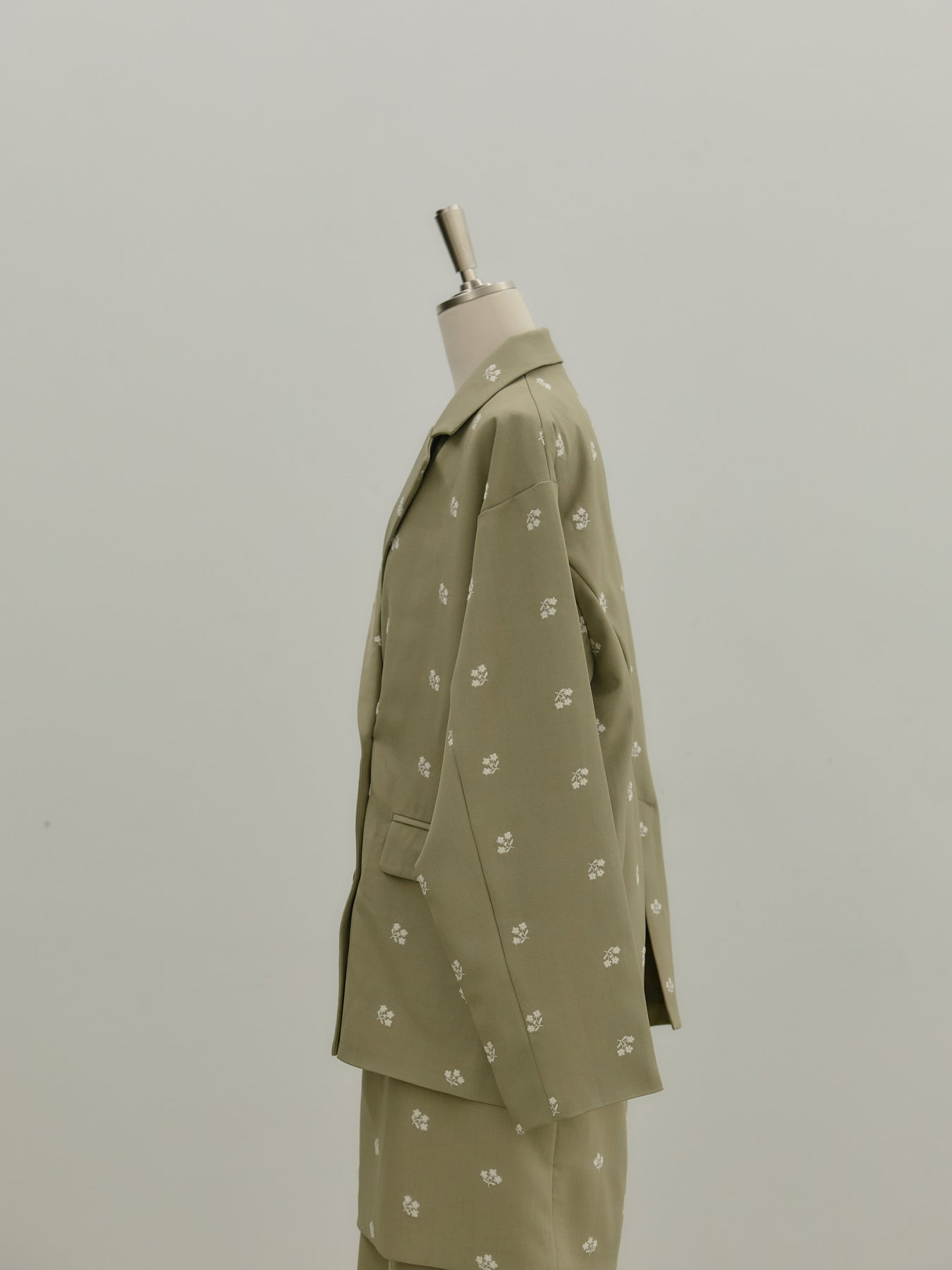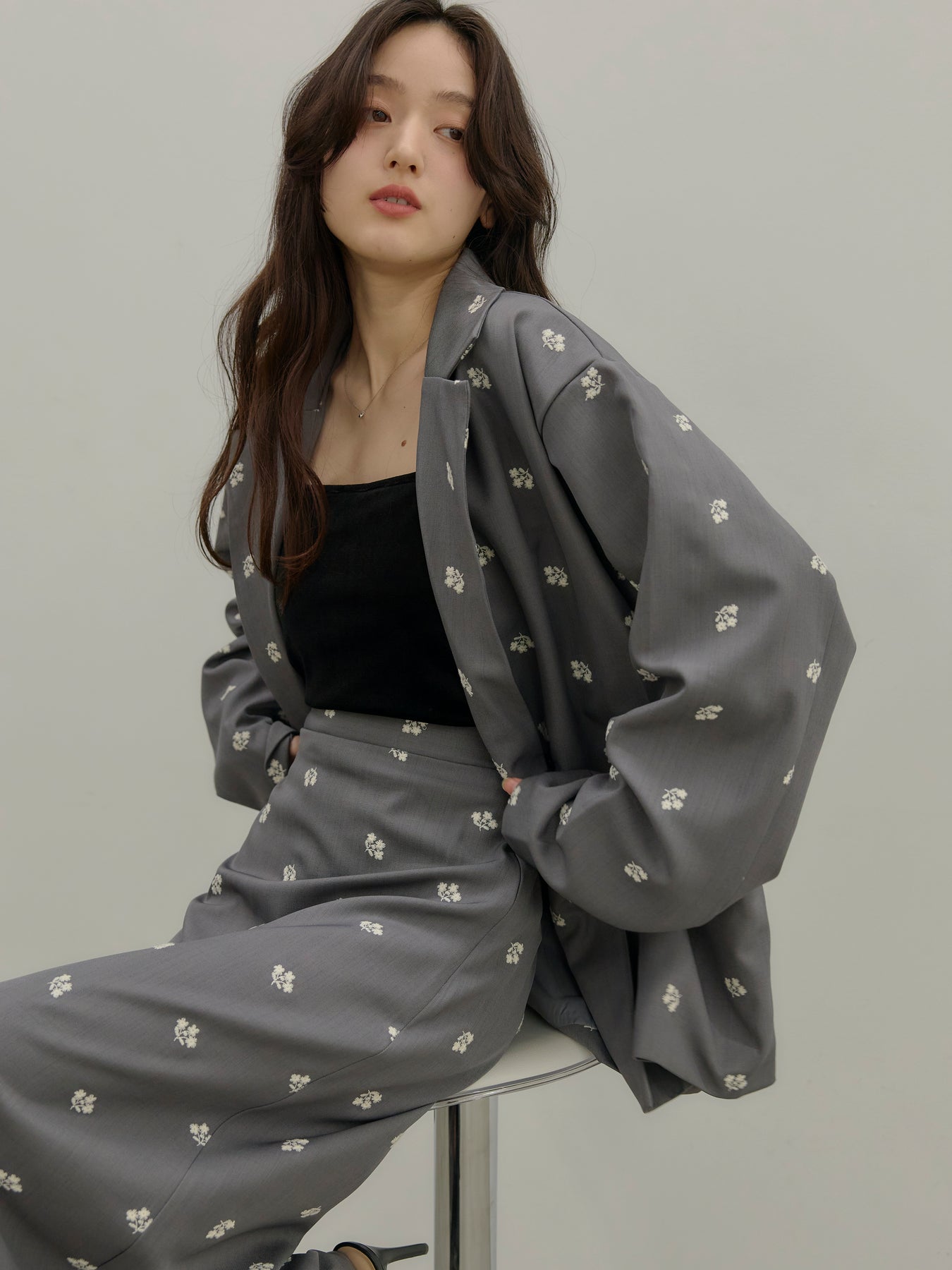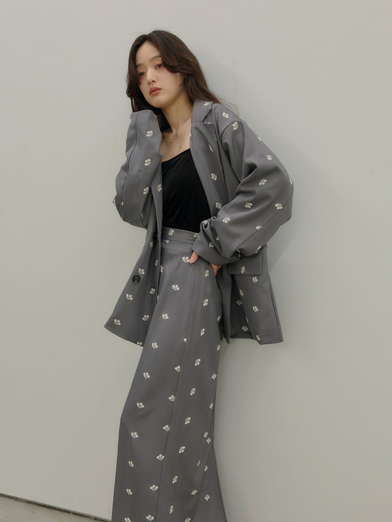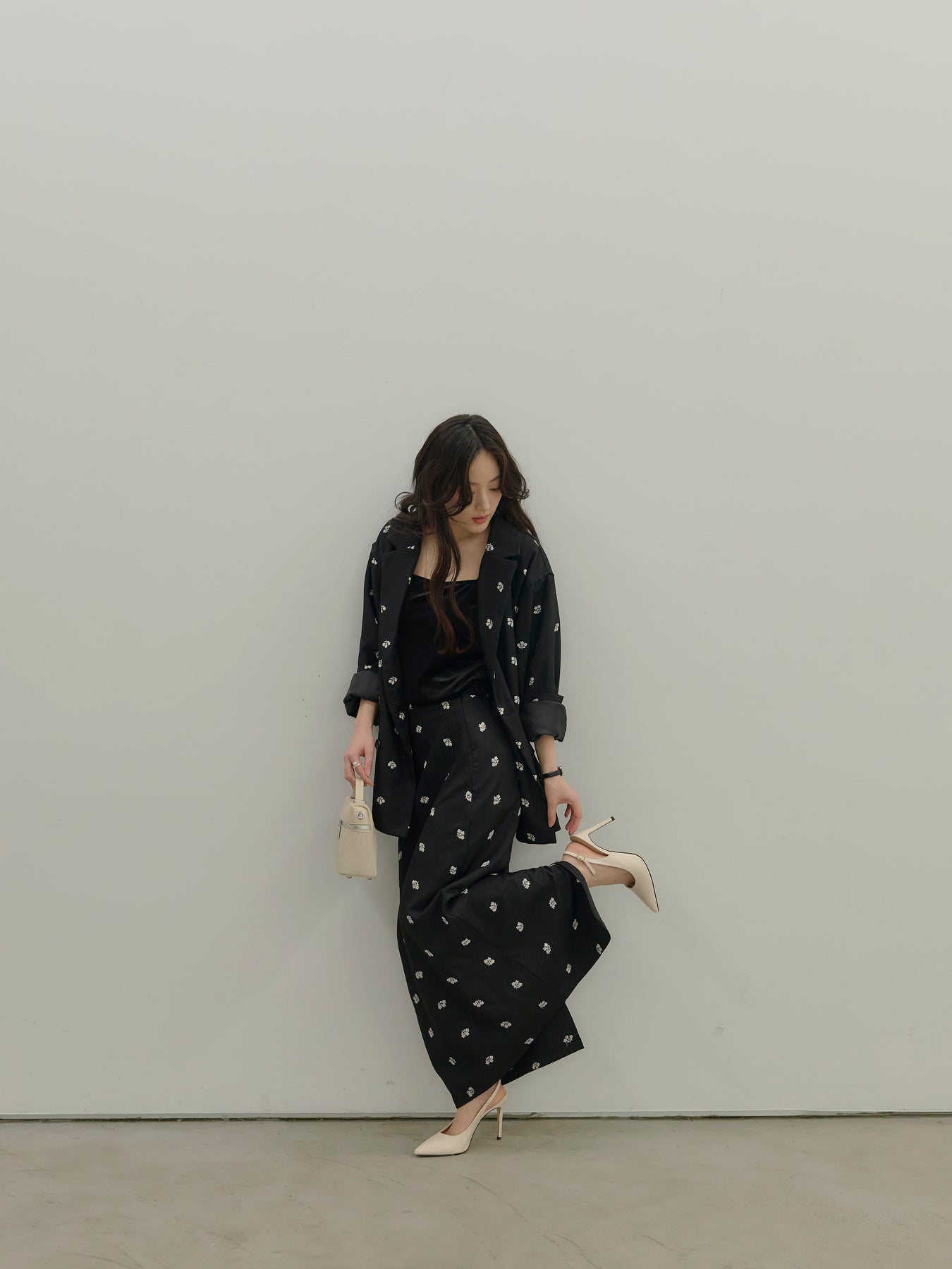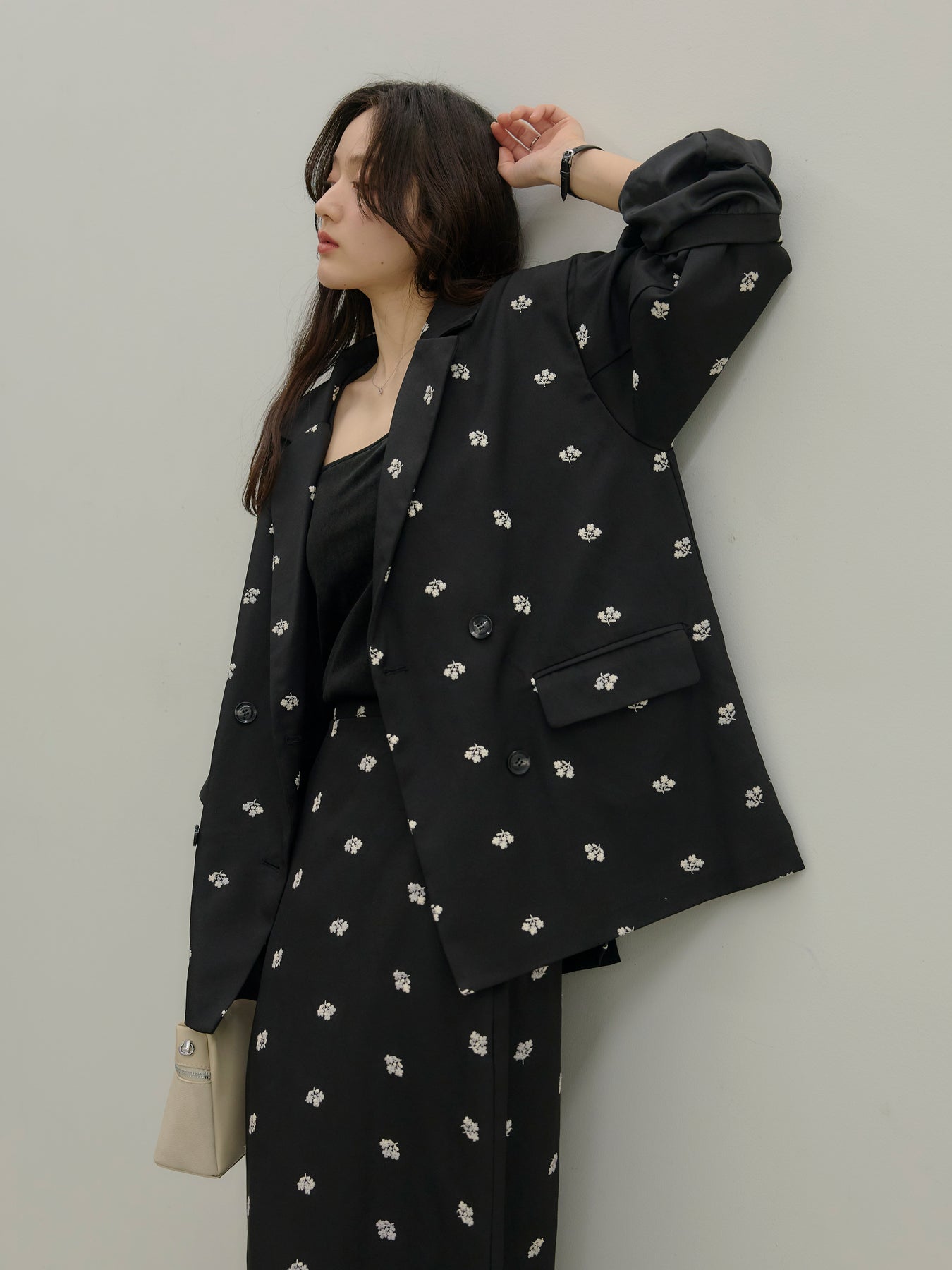 フラワー刺繍が施されたテーラードジャケット。今の気分にぴったりなやや大きめなつくりなのでスタイリングに抜け感を生んでくれます。白で統一された刺繍でさりげないガーリーなアクセントになってくれます。一着で華やかなのでボトムはシンプルな組み合わせを楽しんでいただけます。裏地付き。
