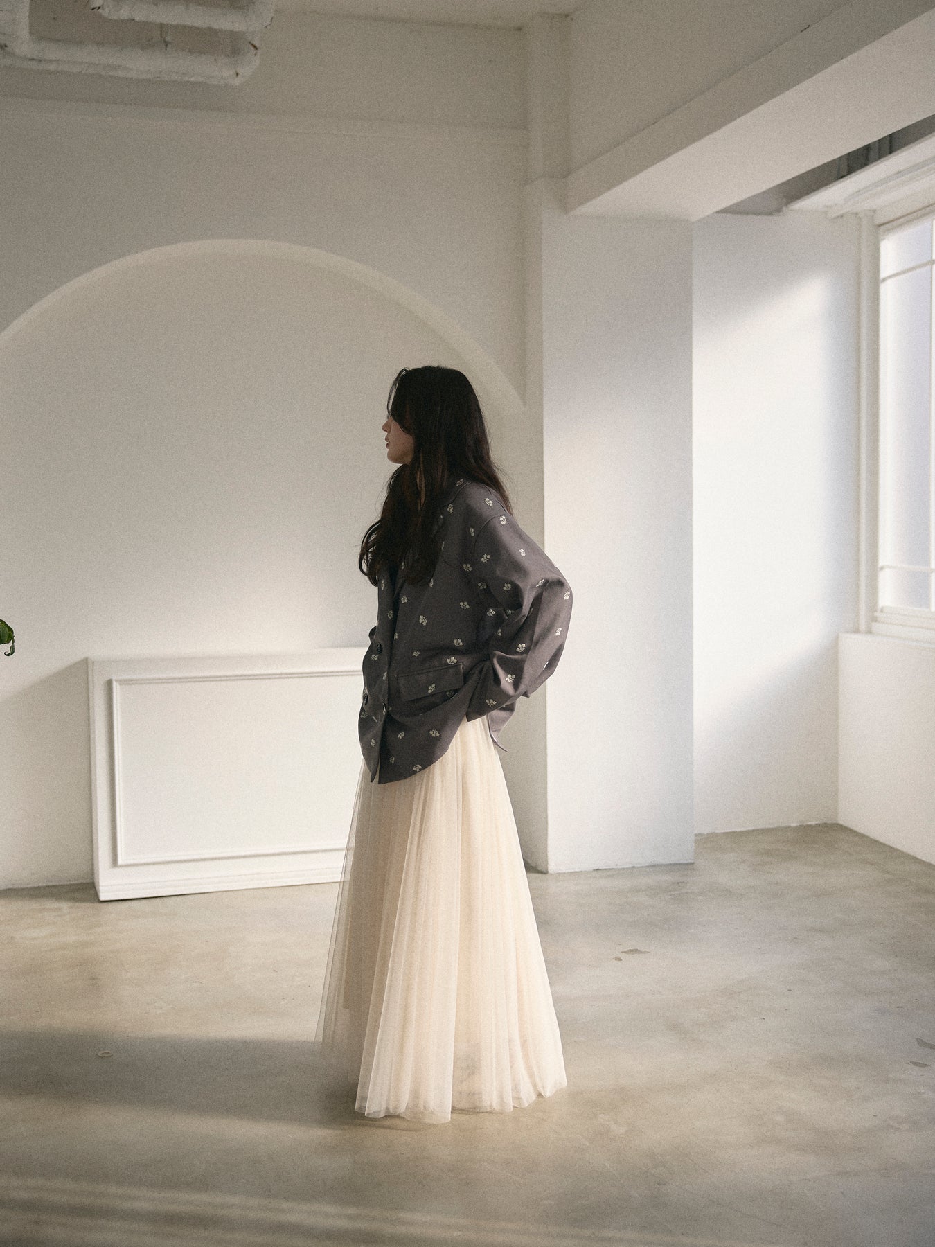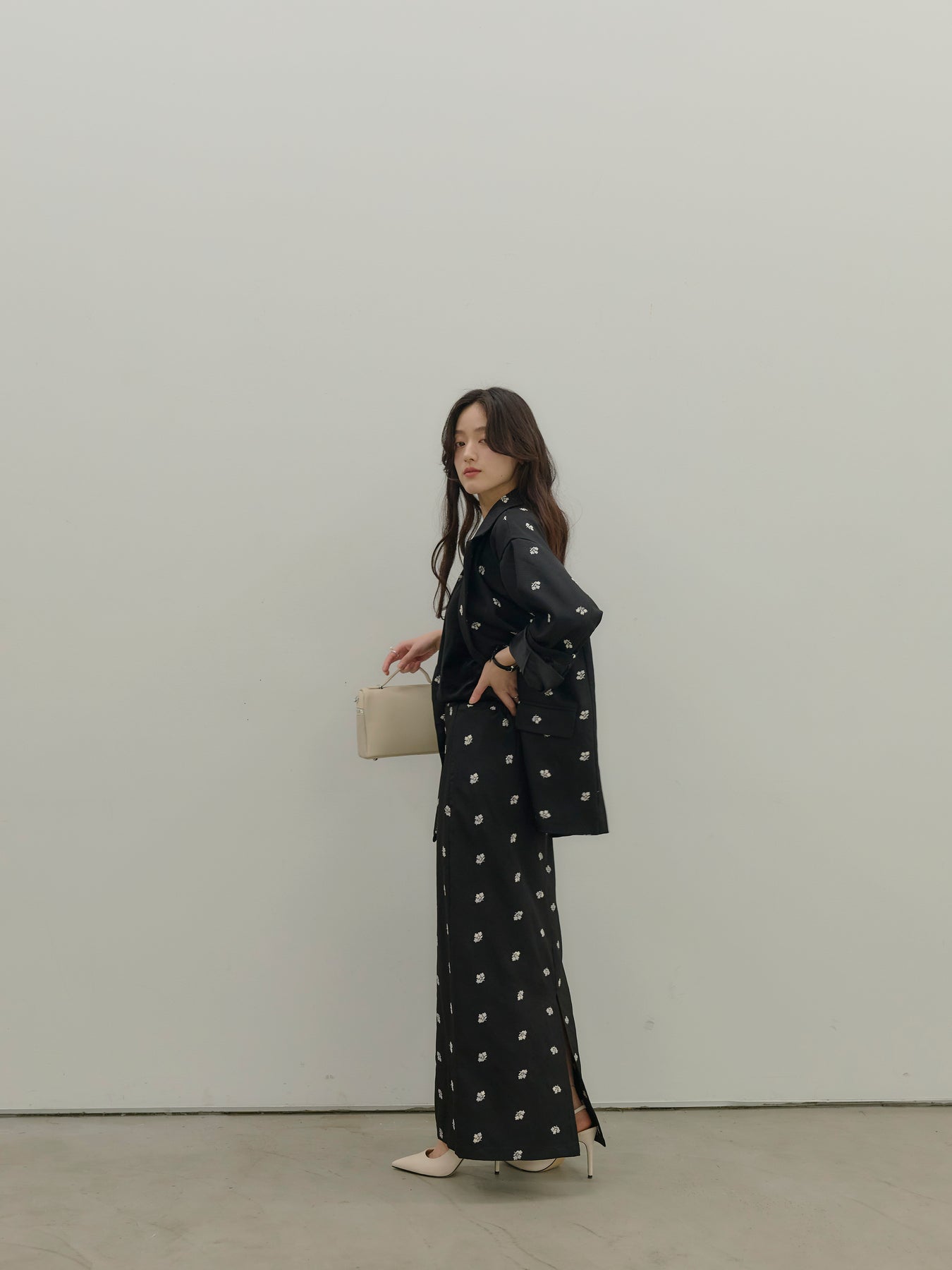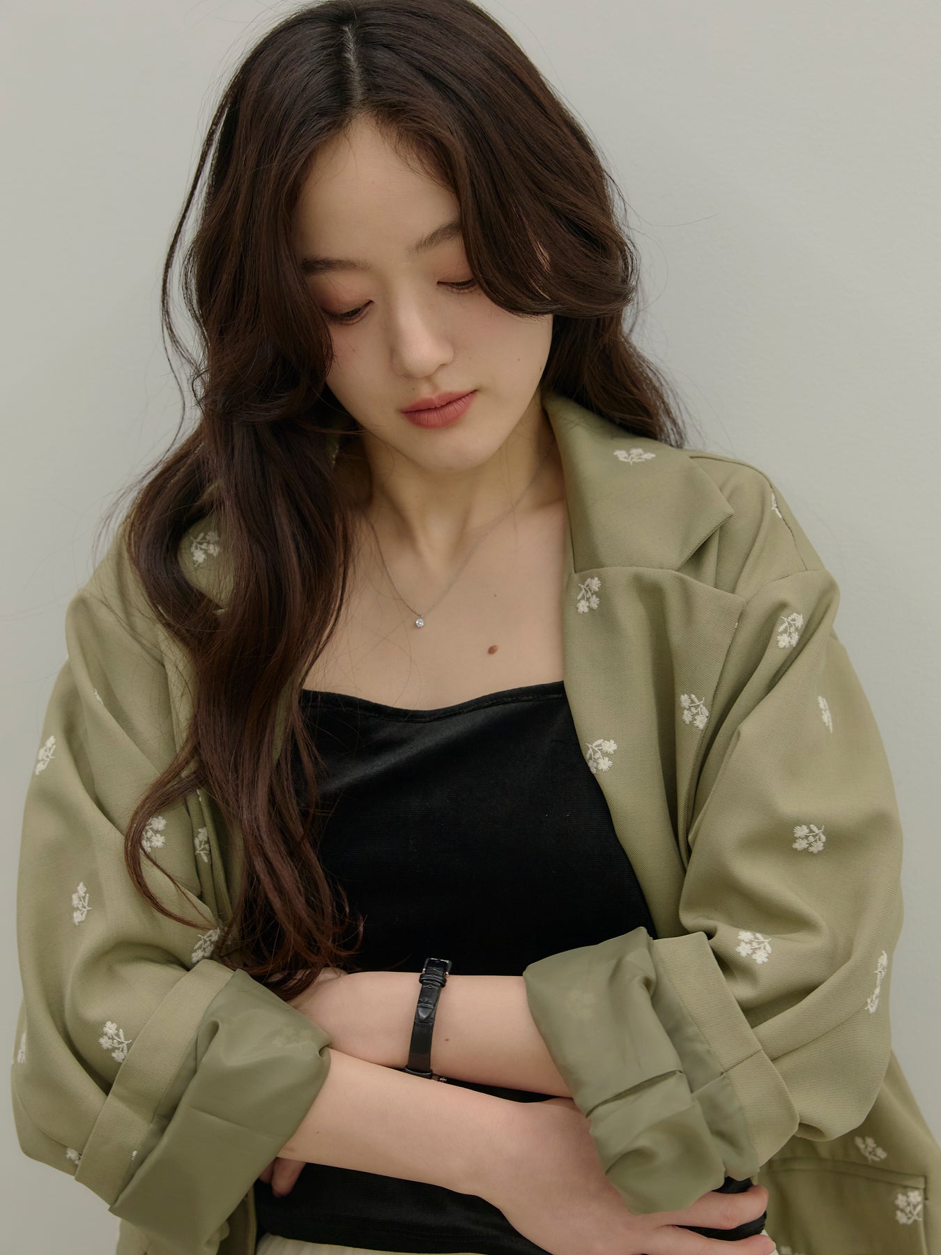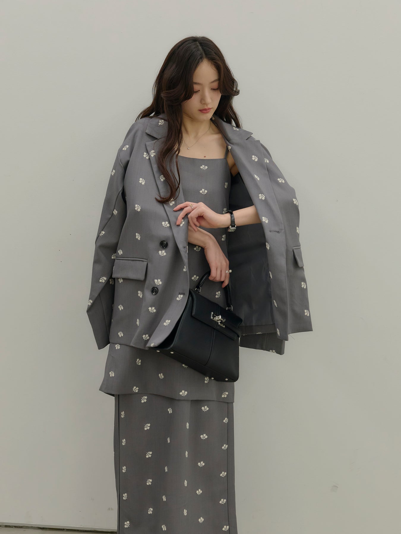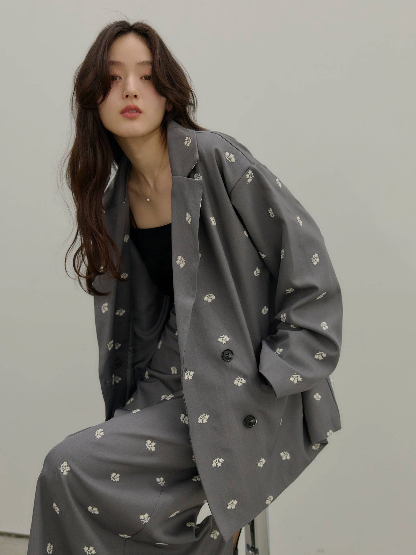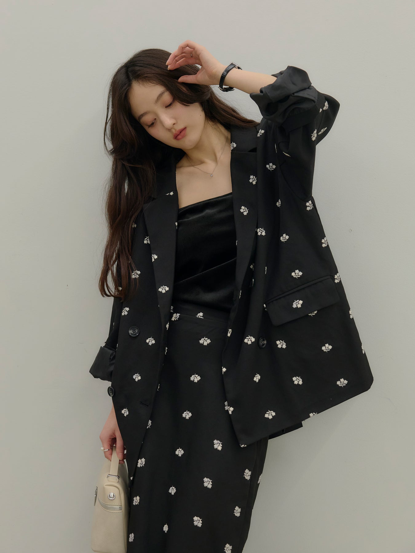 フラワー刺繍が施されたテーラードジャケット。今の気分にぴったりなやや大きめなつくりなのでスタイリングに抜け感を生んでくれます。白で統一された刺繍でさりげないガーリーなアクセントになってくれます。一着で華やかなのでボトムはシンプルな組み合わせを楽しんでいただけます。裏地付き。