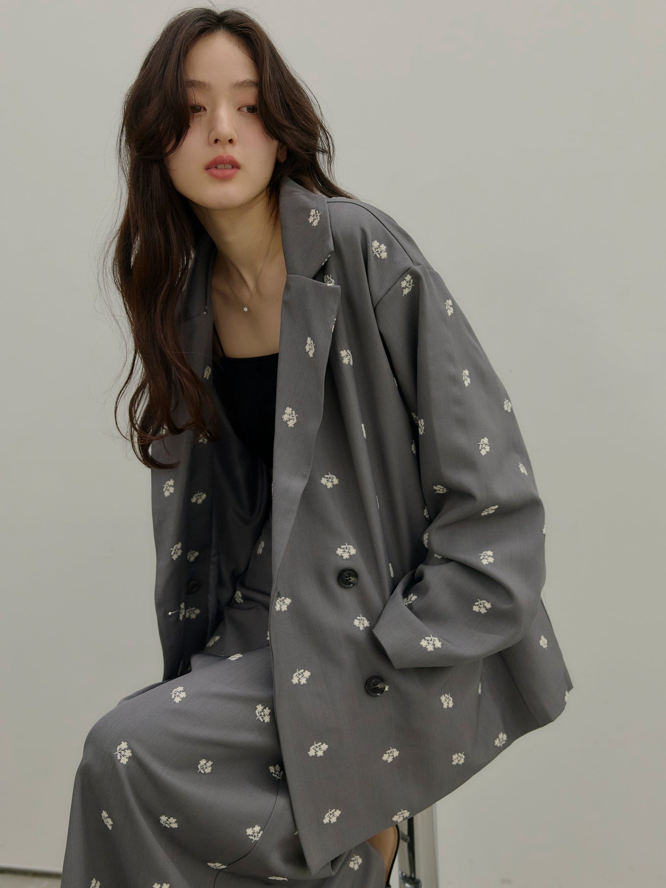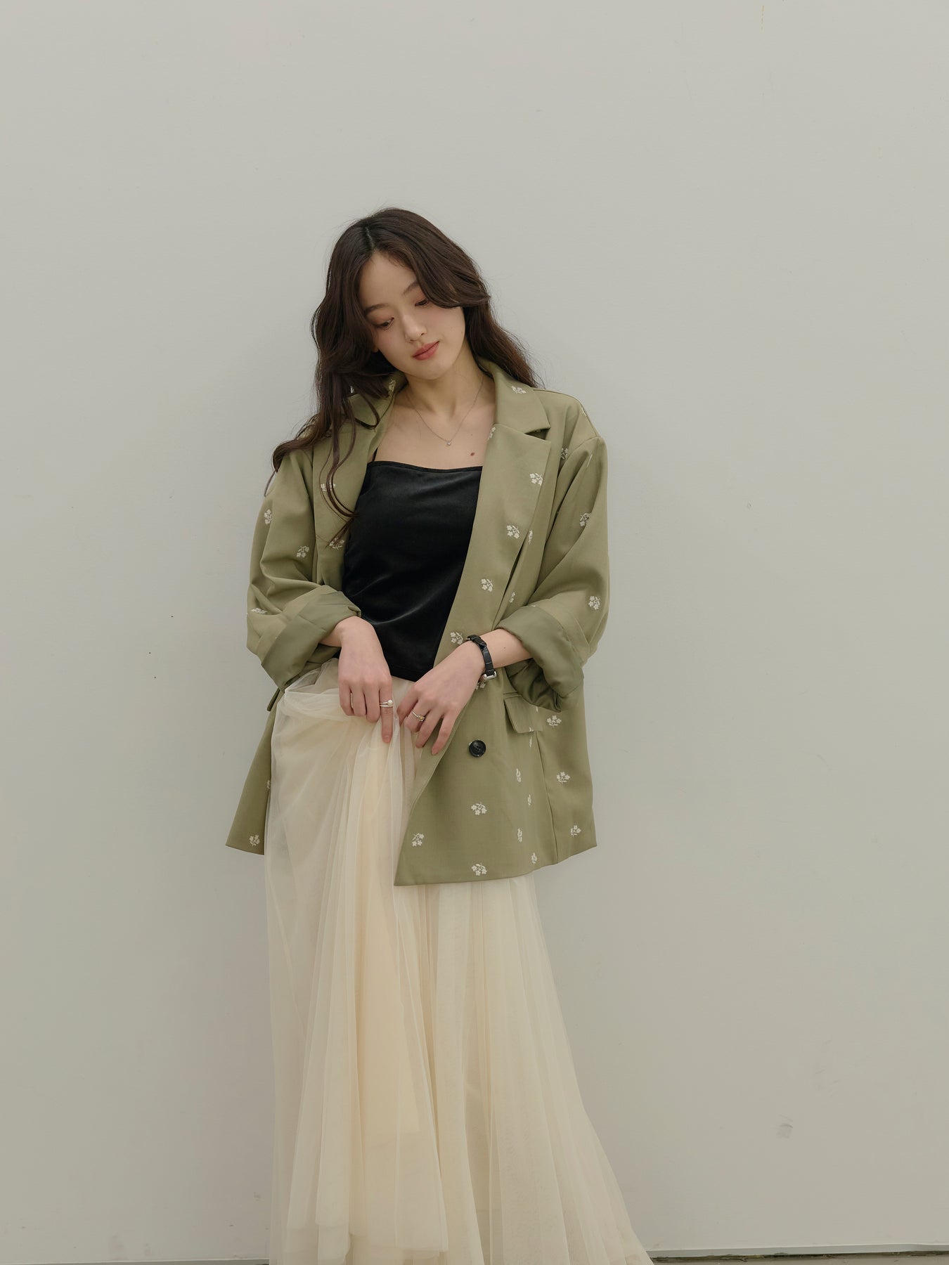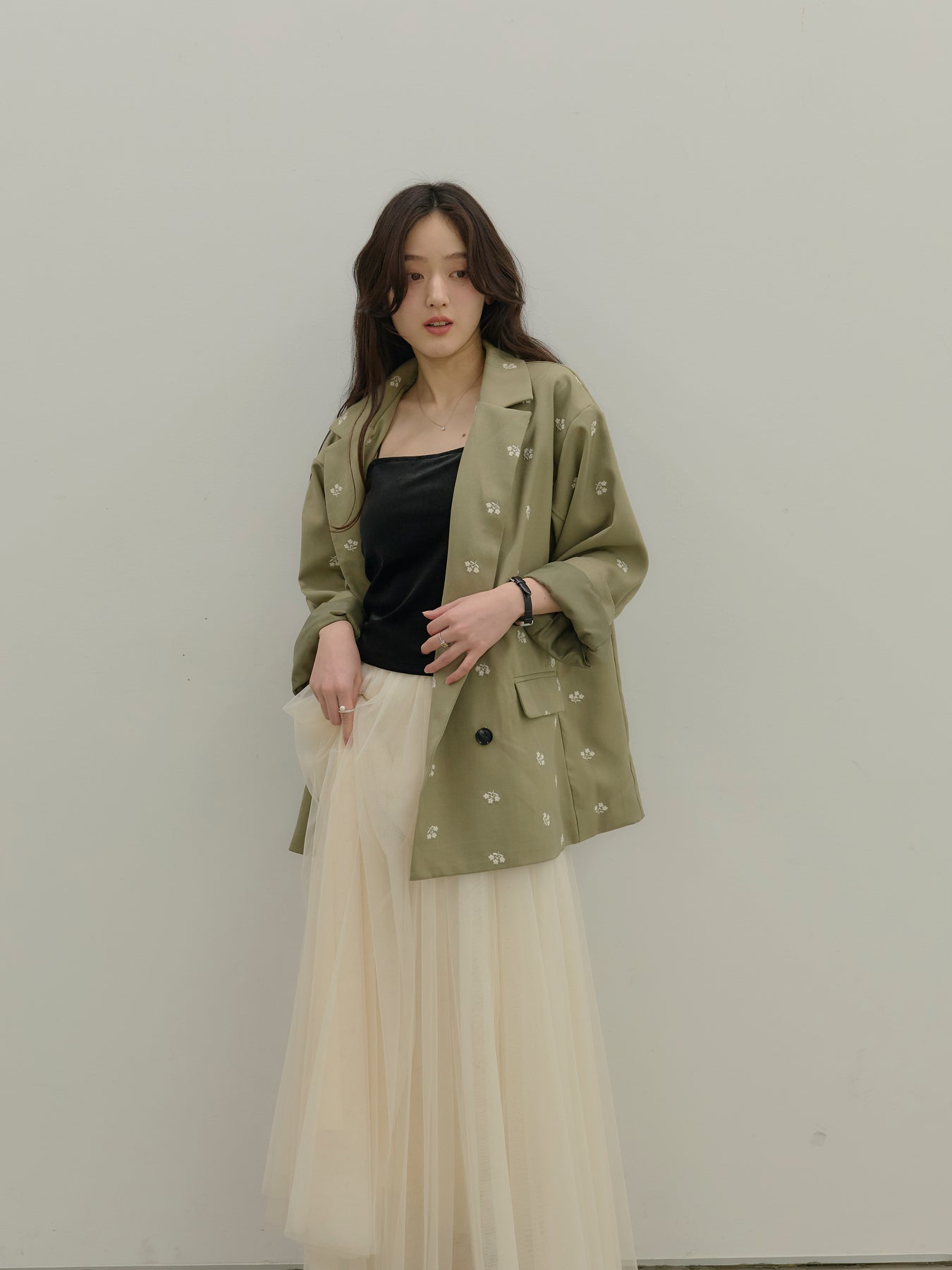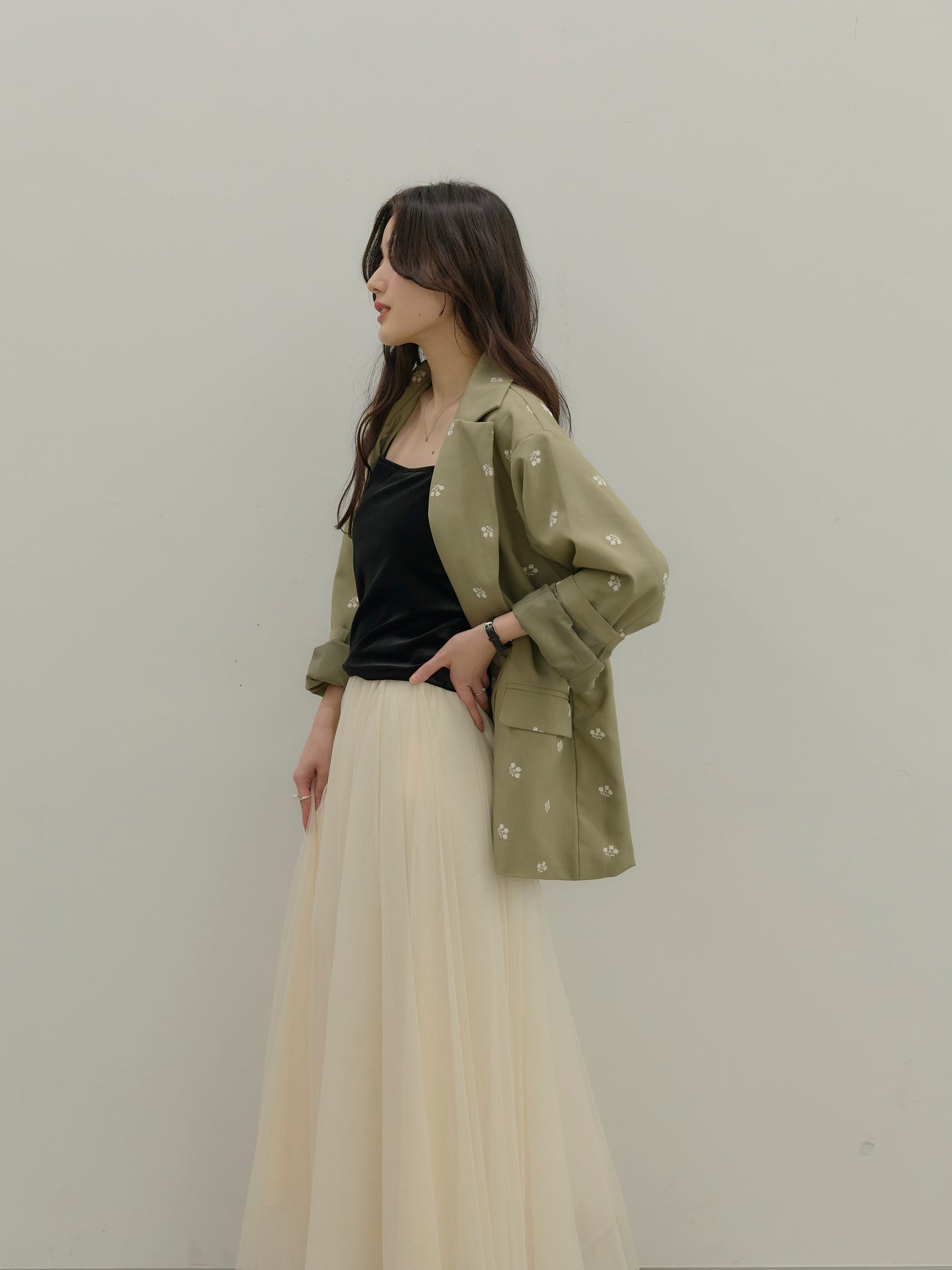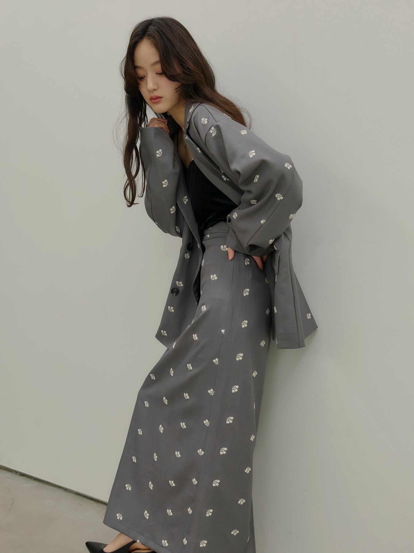 フラワー刺繍が施されたテーラードジャケット。今の気分にぴったりなやや大きめなつくりなのでスタイリングに抜け感を生んでくれます。白で統一された刺繍でさりげないガーリーなアクセントになってくれます。一着で華やかなのでボトムはシンプルな組み合わせを楽しんでいただけます。裏地付き。