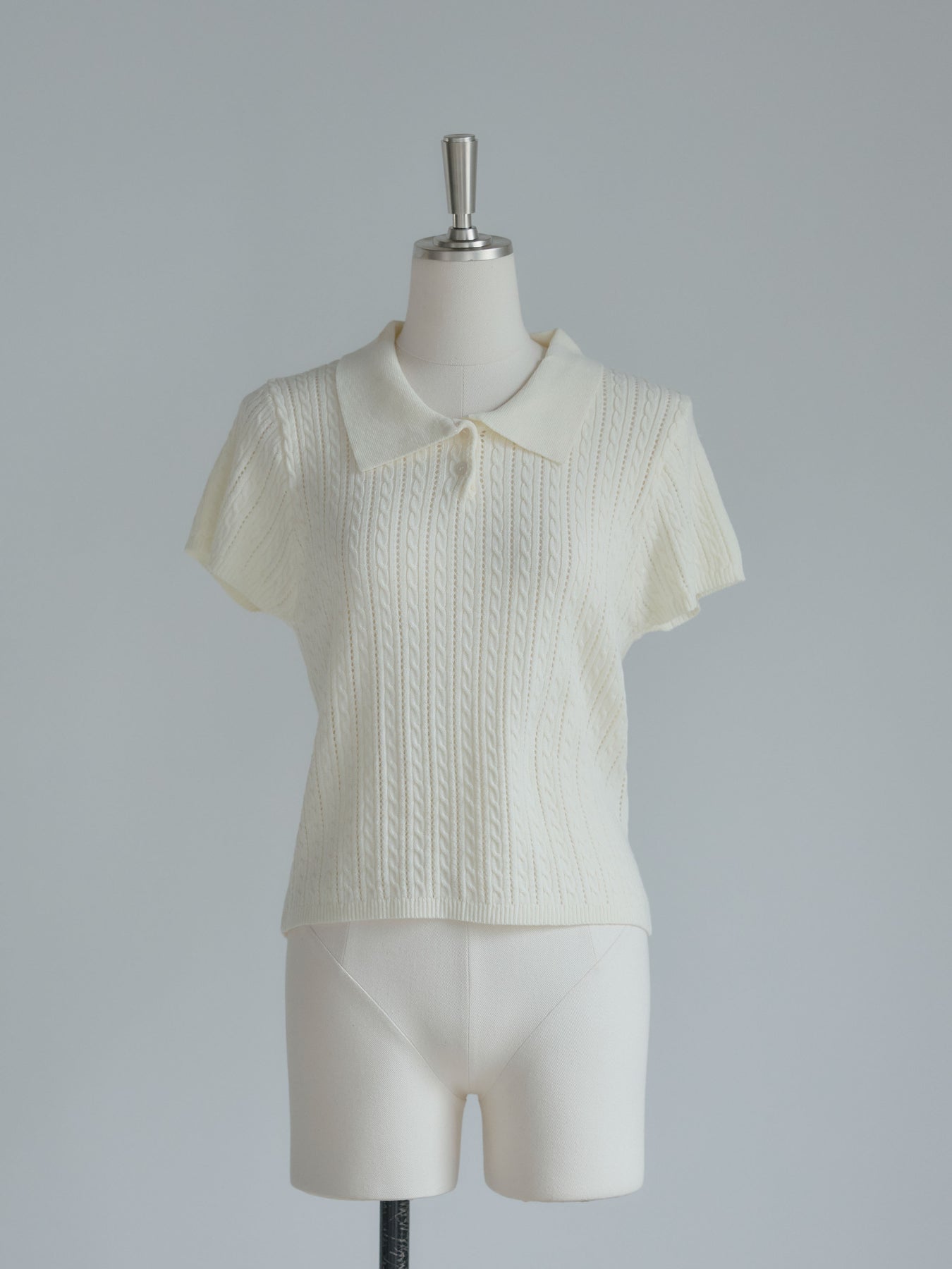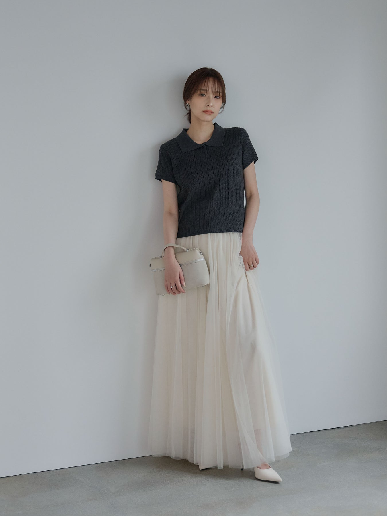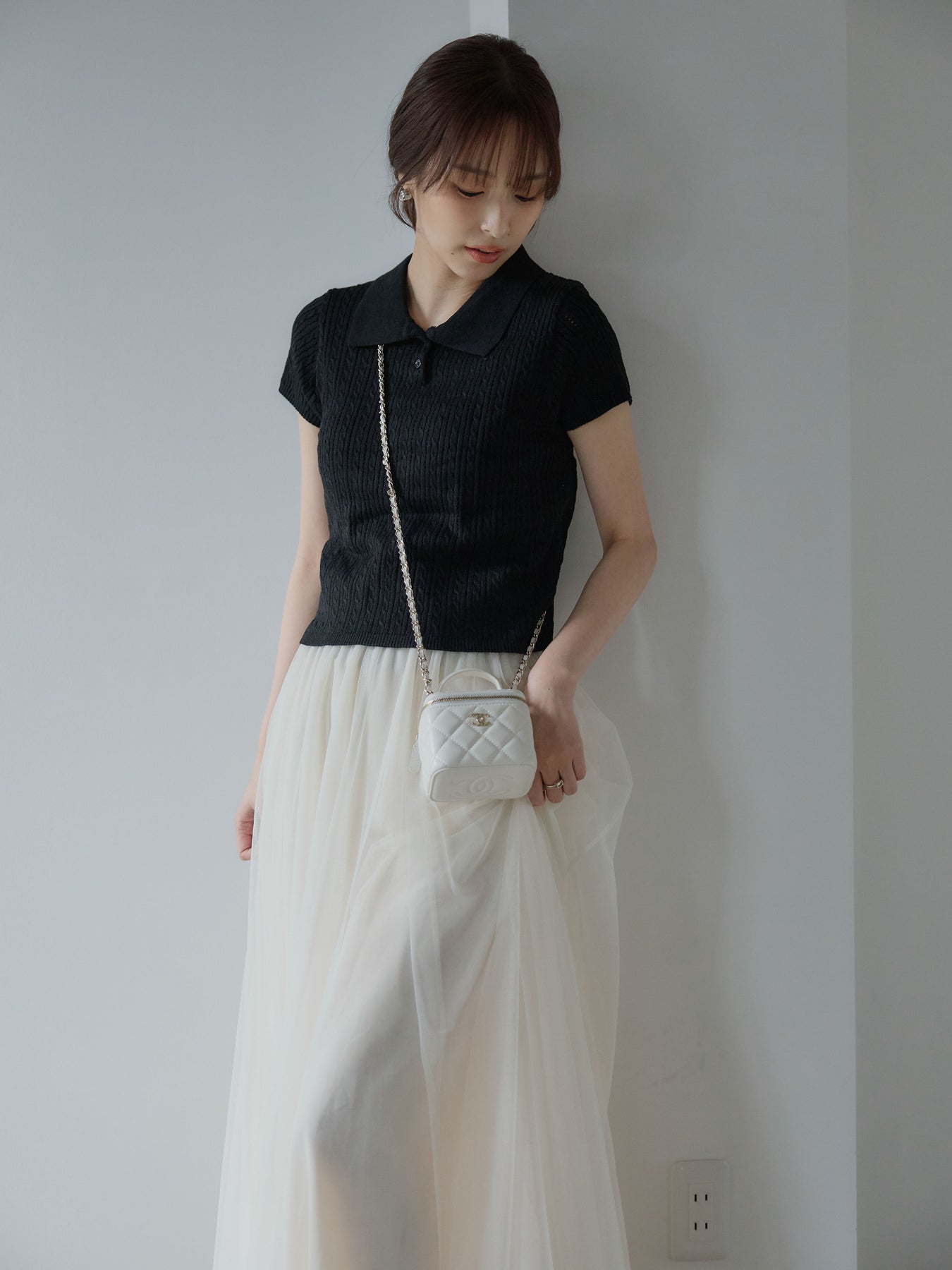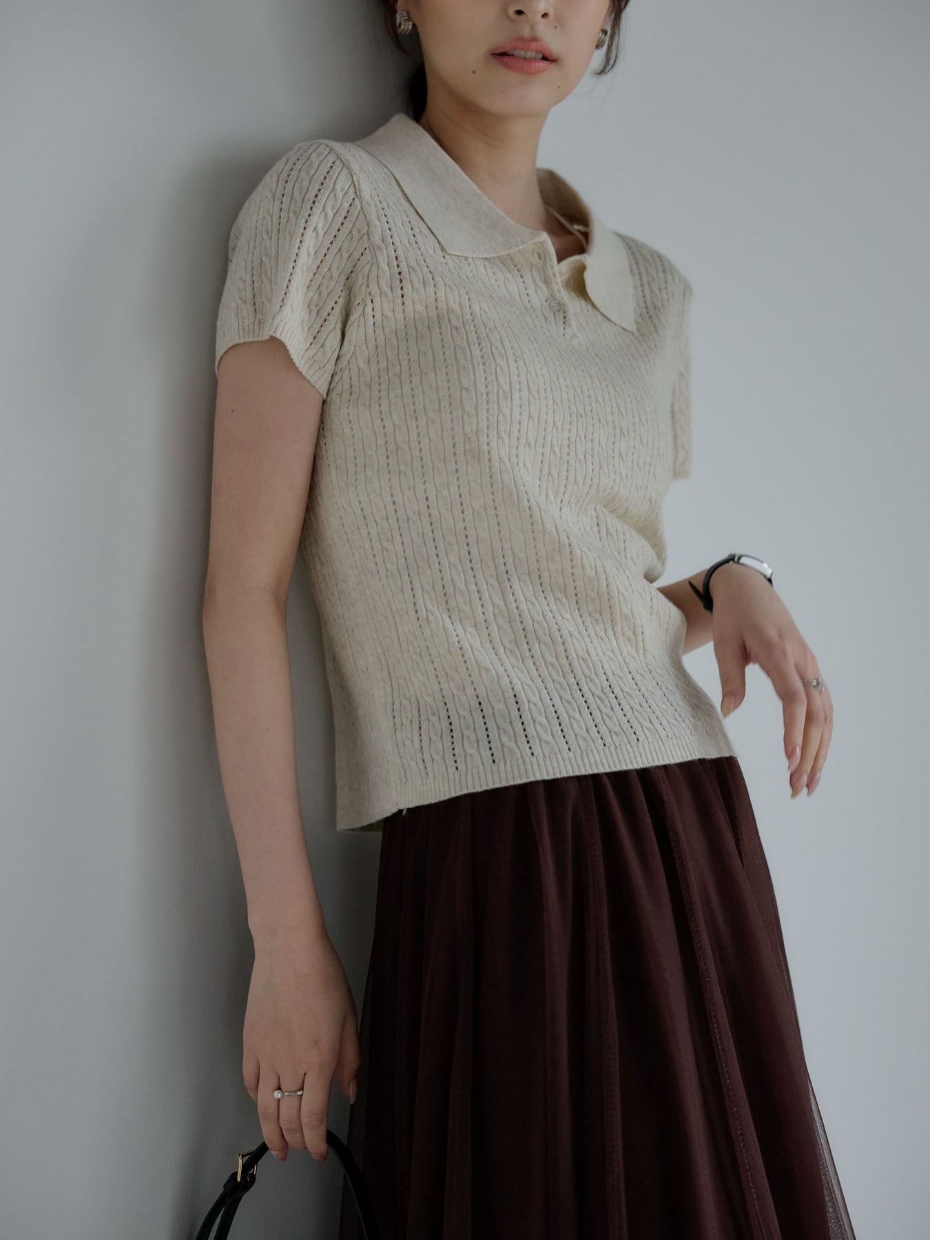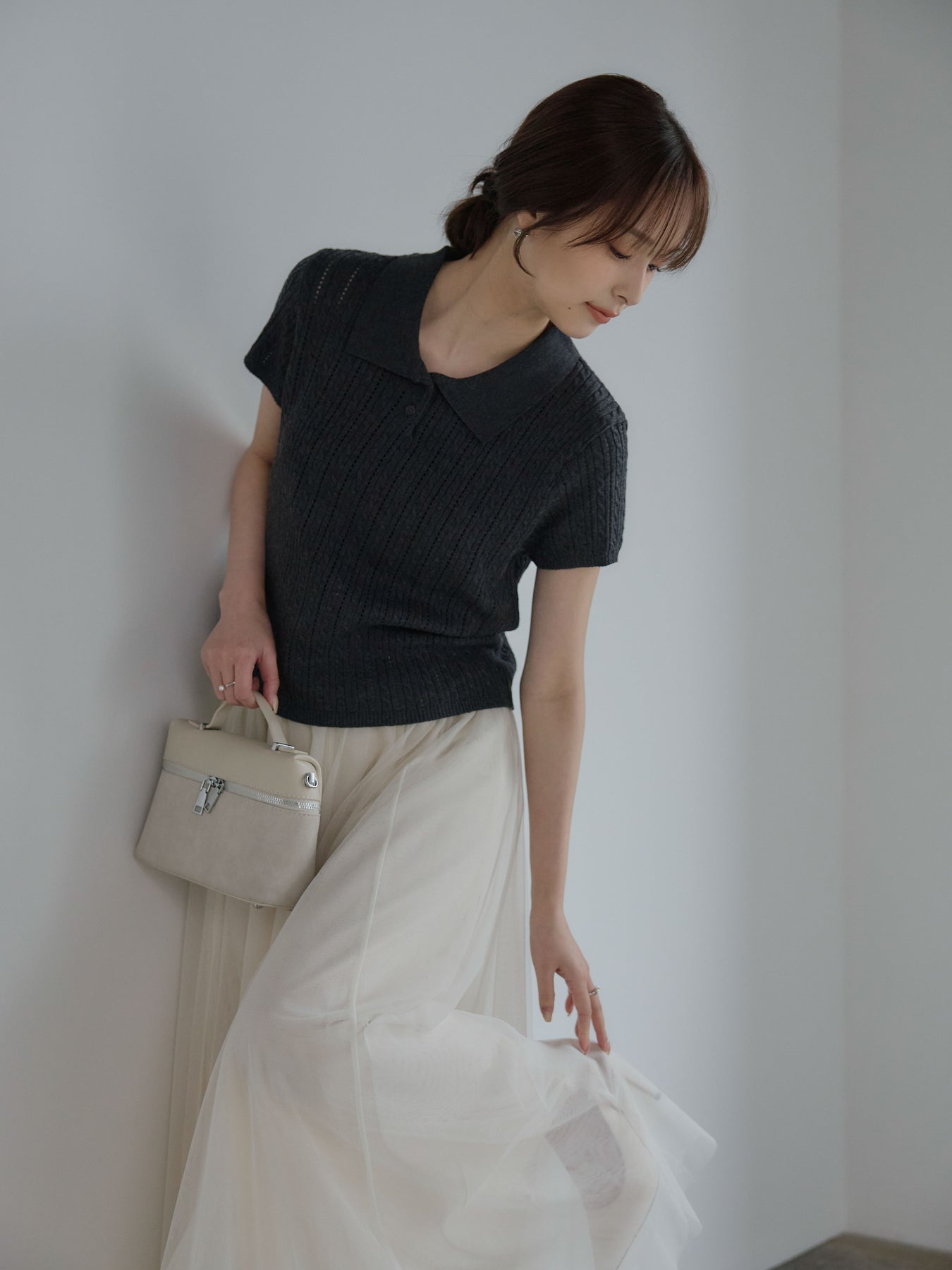 デザイン編みがポイントになるニットトップス。コンパクトなデザインでロングボトムスとも相性抜群。今の季節のスタイリングにぴったりのアイテムです。