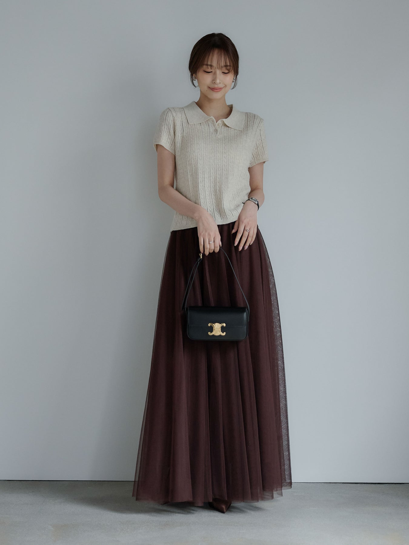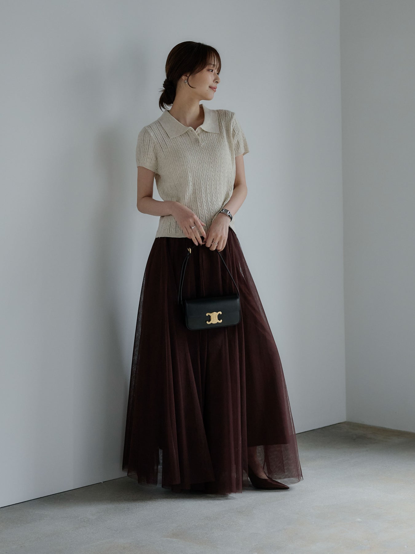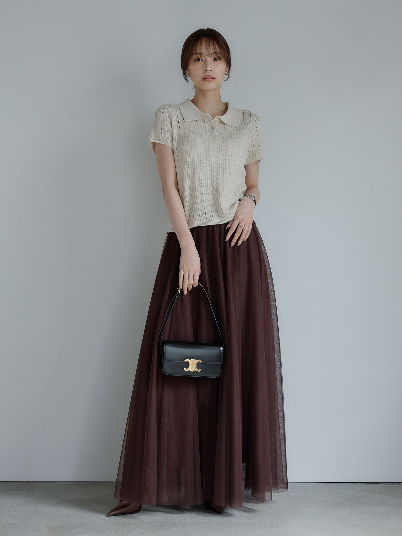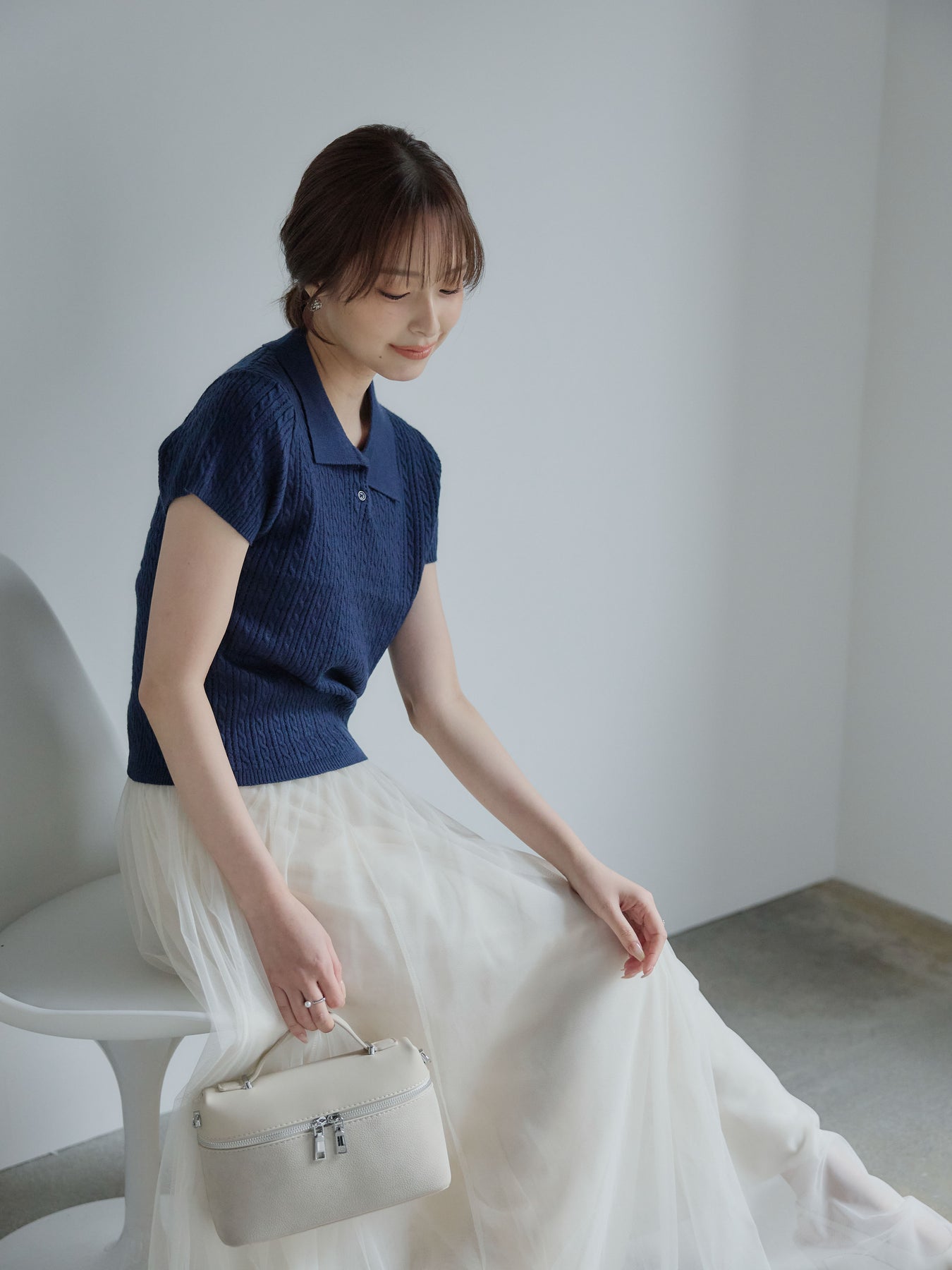 デザイン編みがポイントになるニットトップス。コンパクトなデザインでロングボトムスとも相性抜群。今の季節のスタイリングにぴったりのアイテムです。