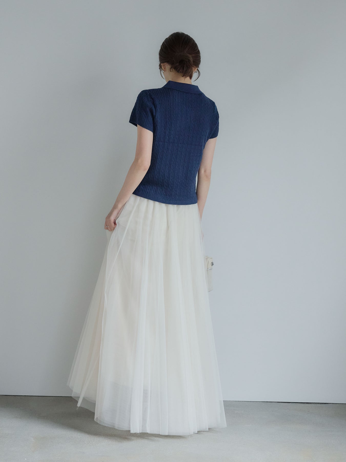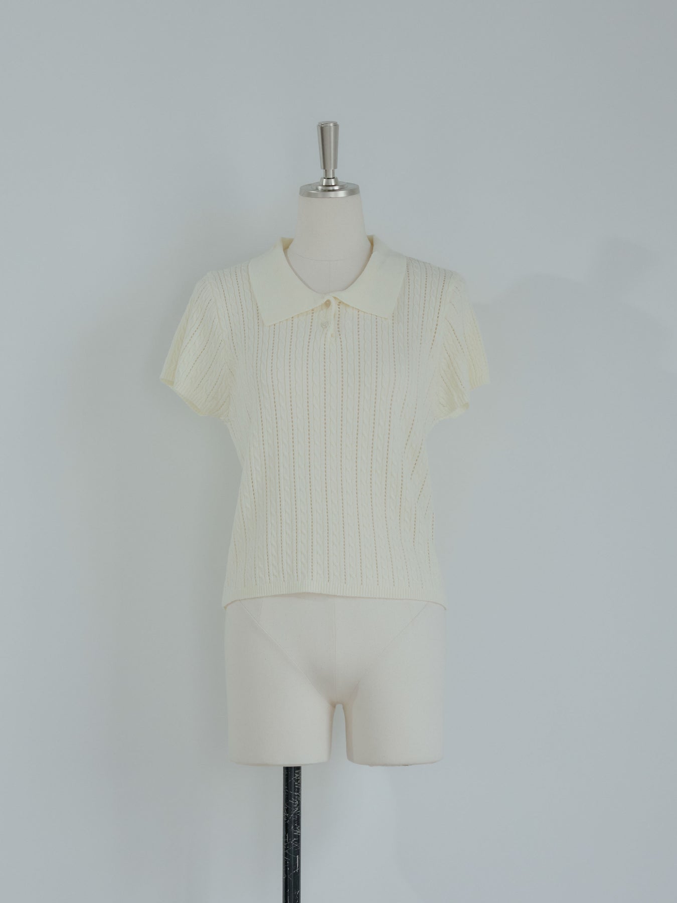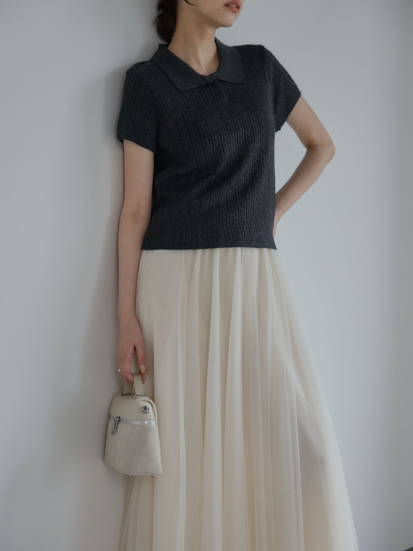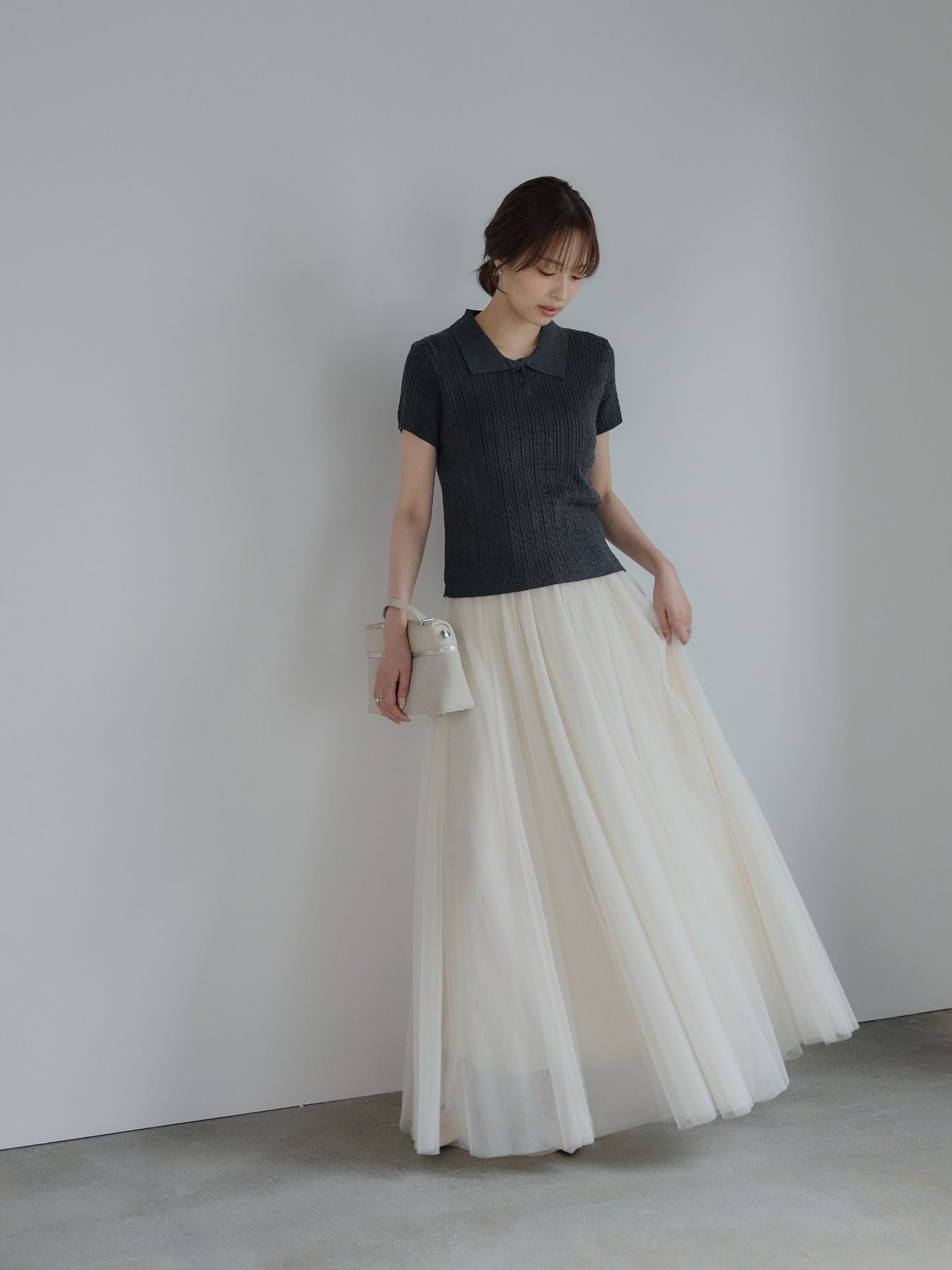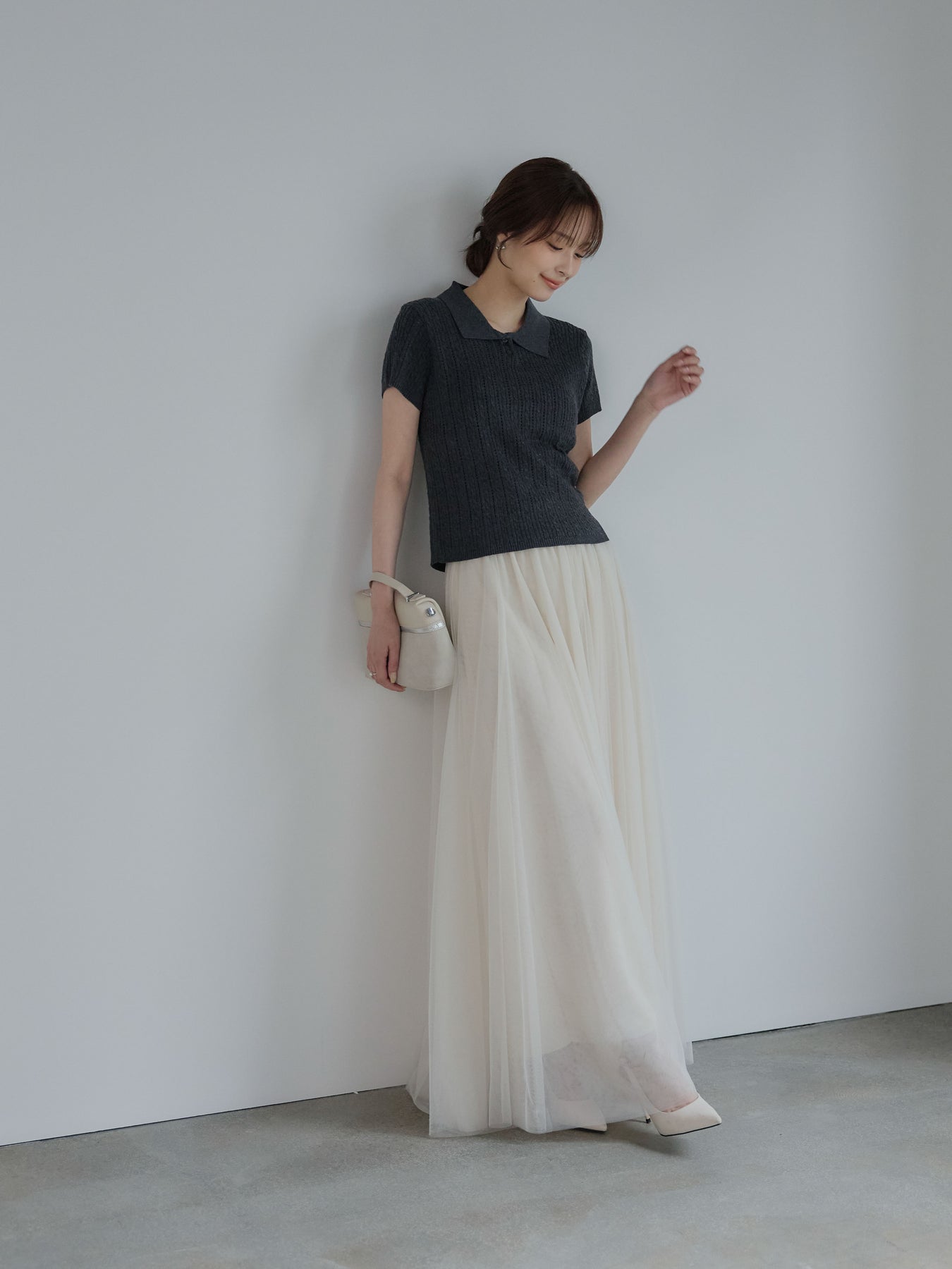 デザイン編みがポイントになるニットトップス。コンパクトなデザインでロングボトムスとも相性抜群。今の季節のスタイリングにぴったりのアイテムです。