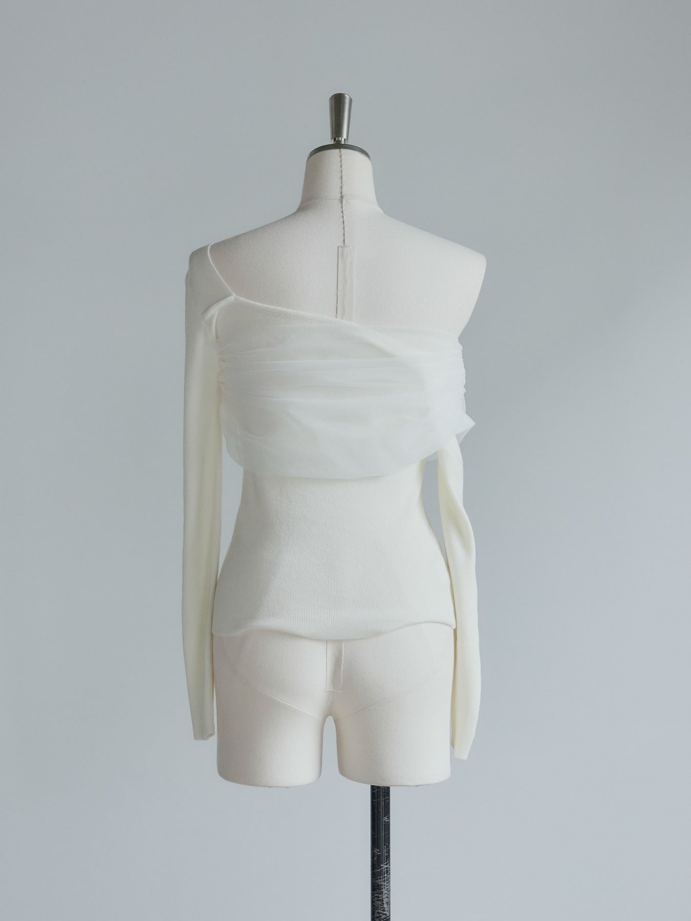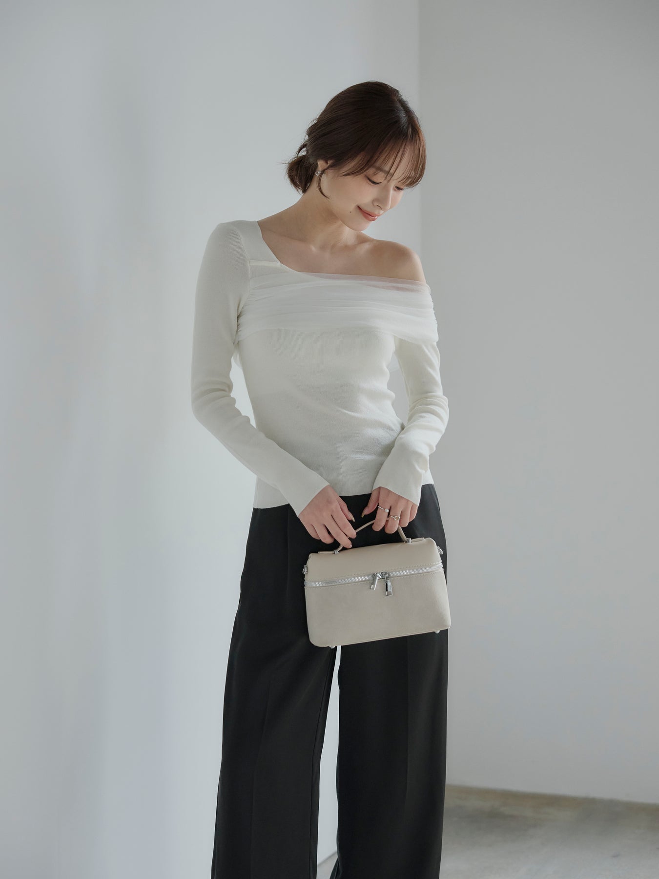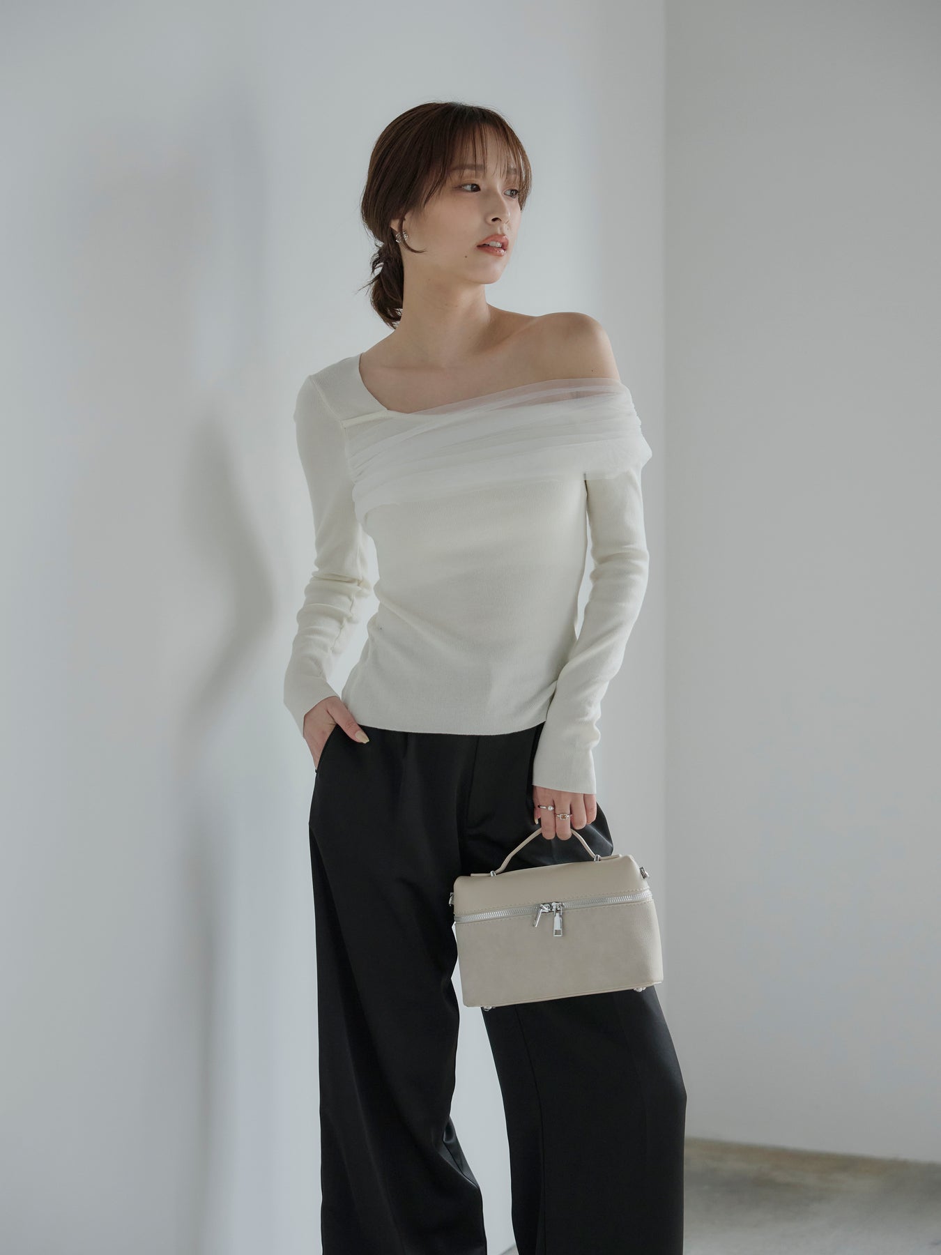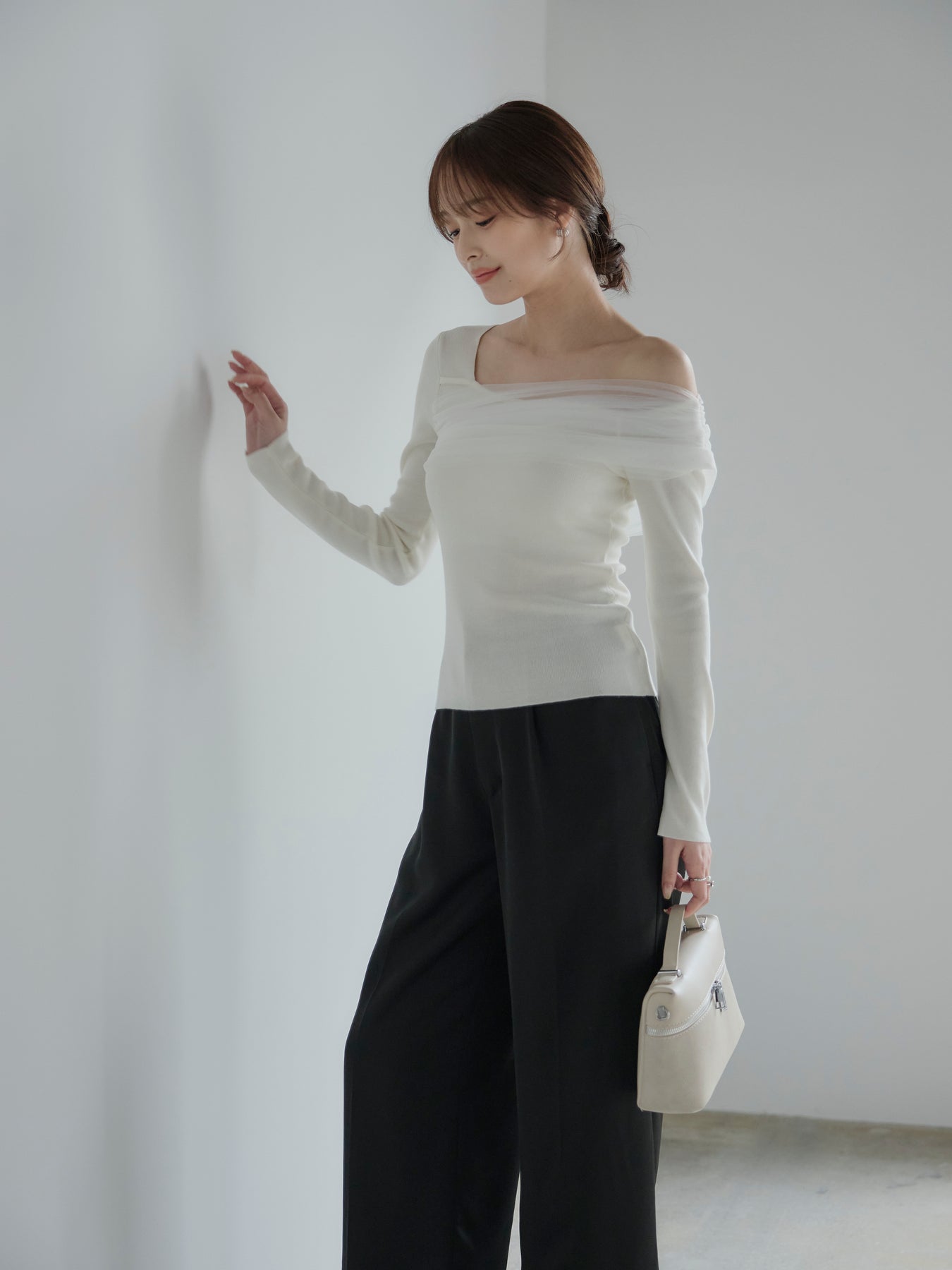 チュールがドッキングされたデザインがポイントのアイテム。1枚で華やかな印象に仕上げてくれる主役級トップスです。ニットは伸びの良い肌触りの良い素材です。