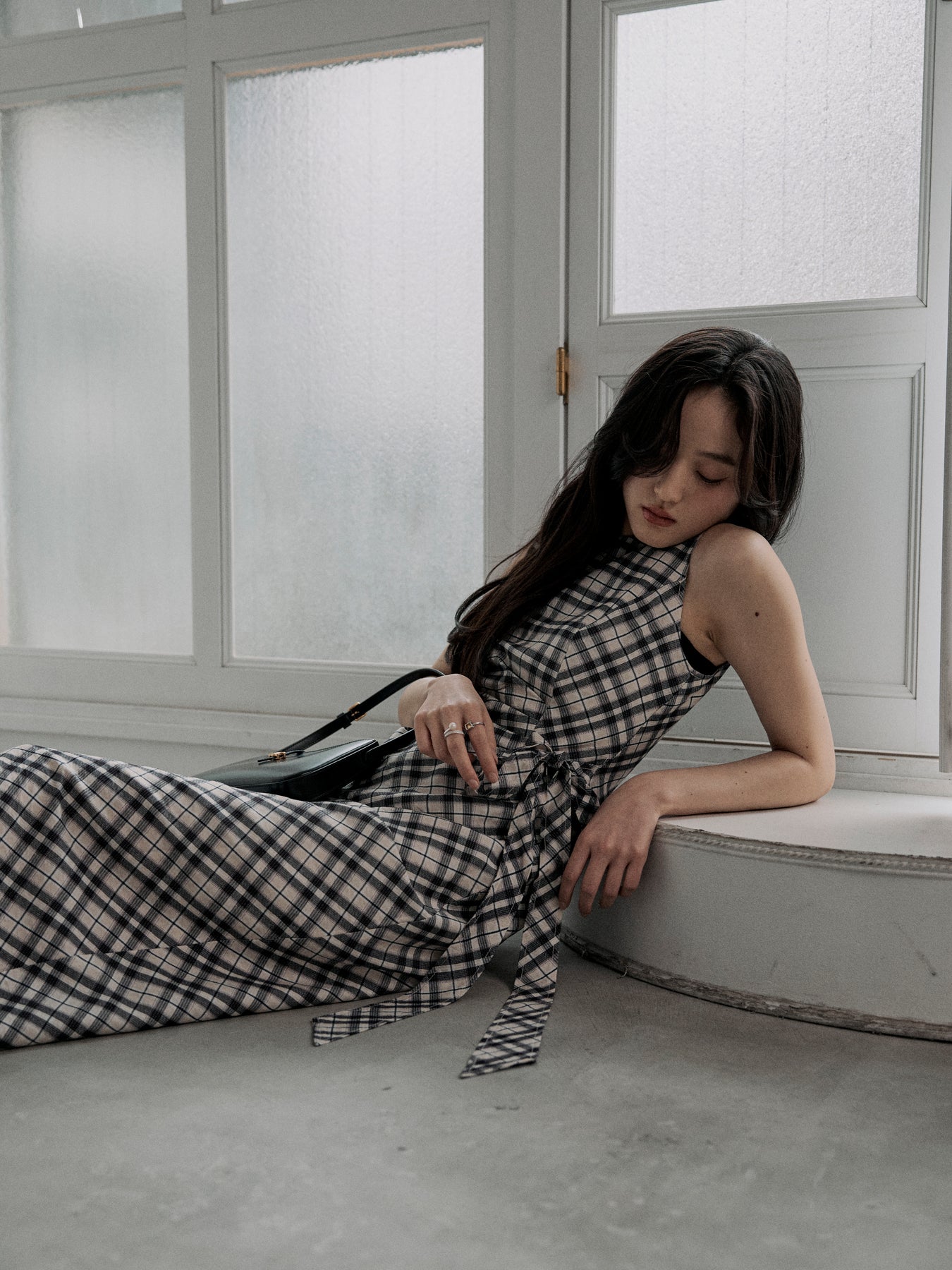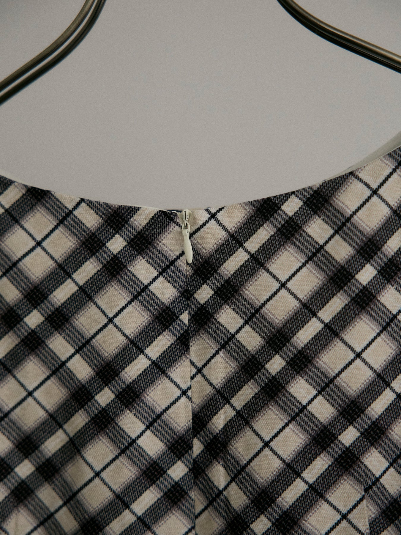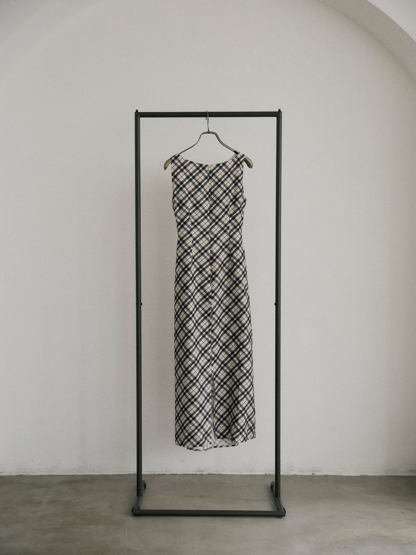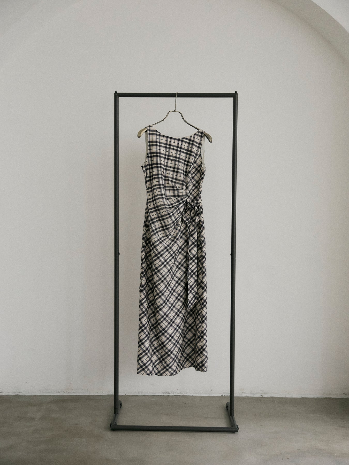 チェック柄にドレープデザインを取り入れたノースリーブワンピース。
