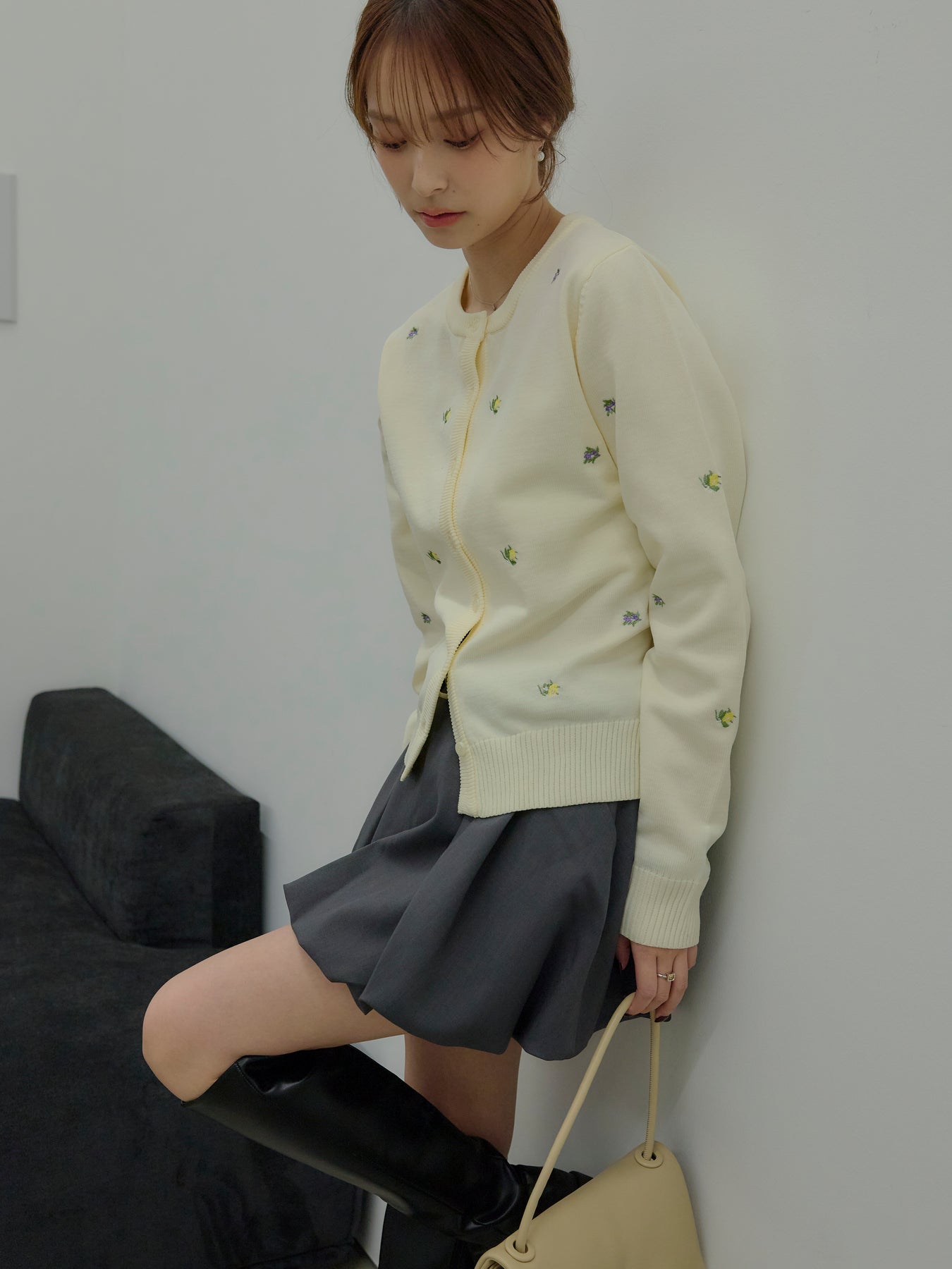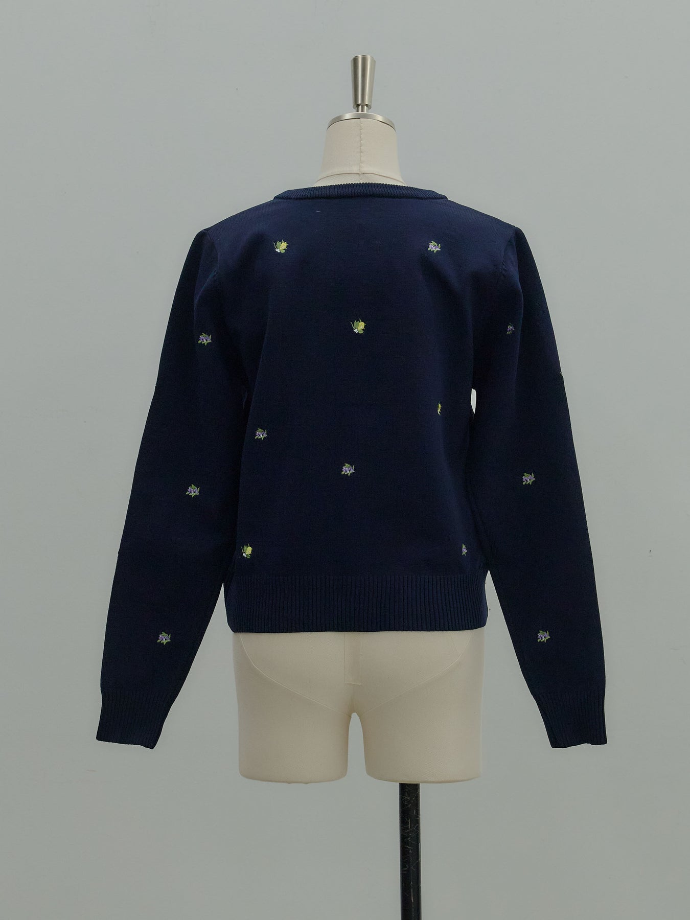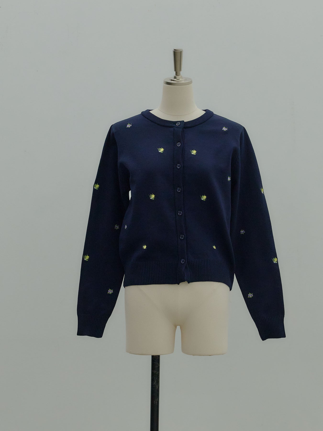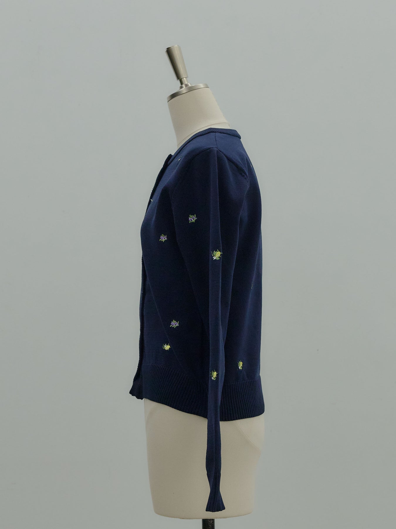 さりげないフルーツ刺繍が目を惹く、遊び心のあるクルーネックカーディガン。
