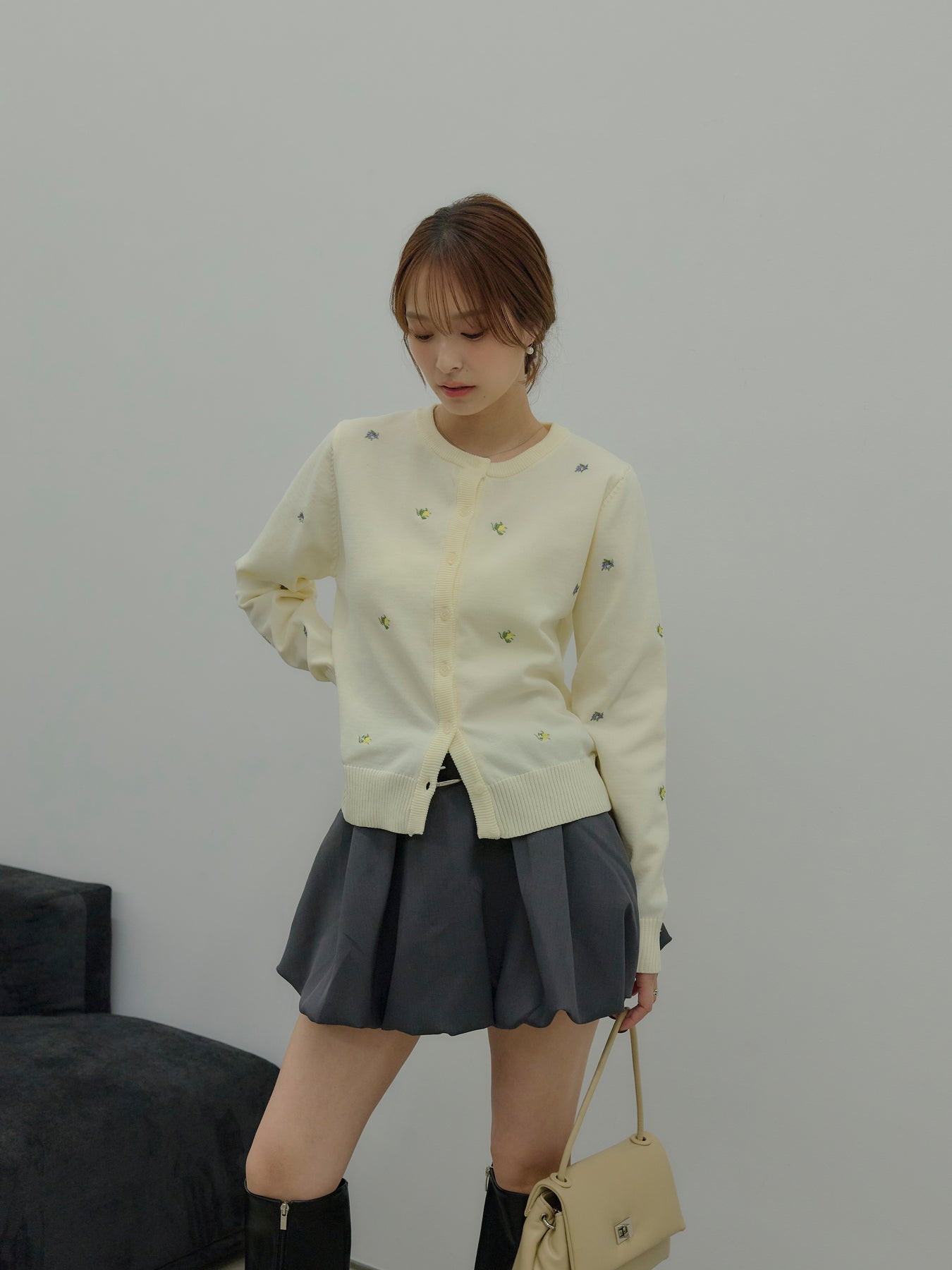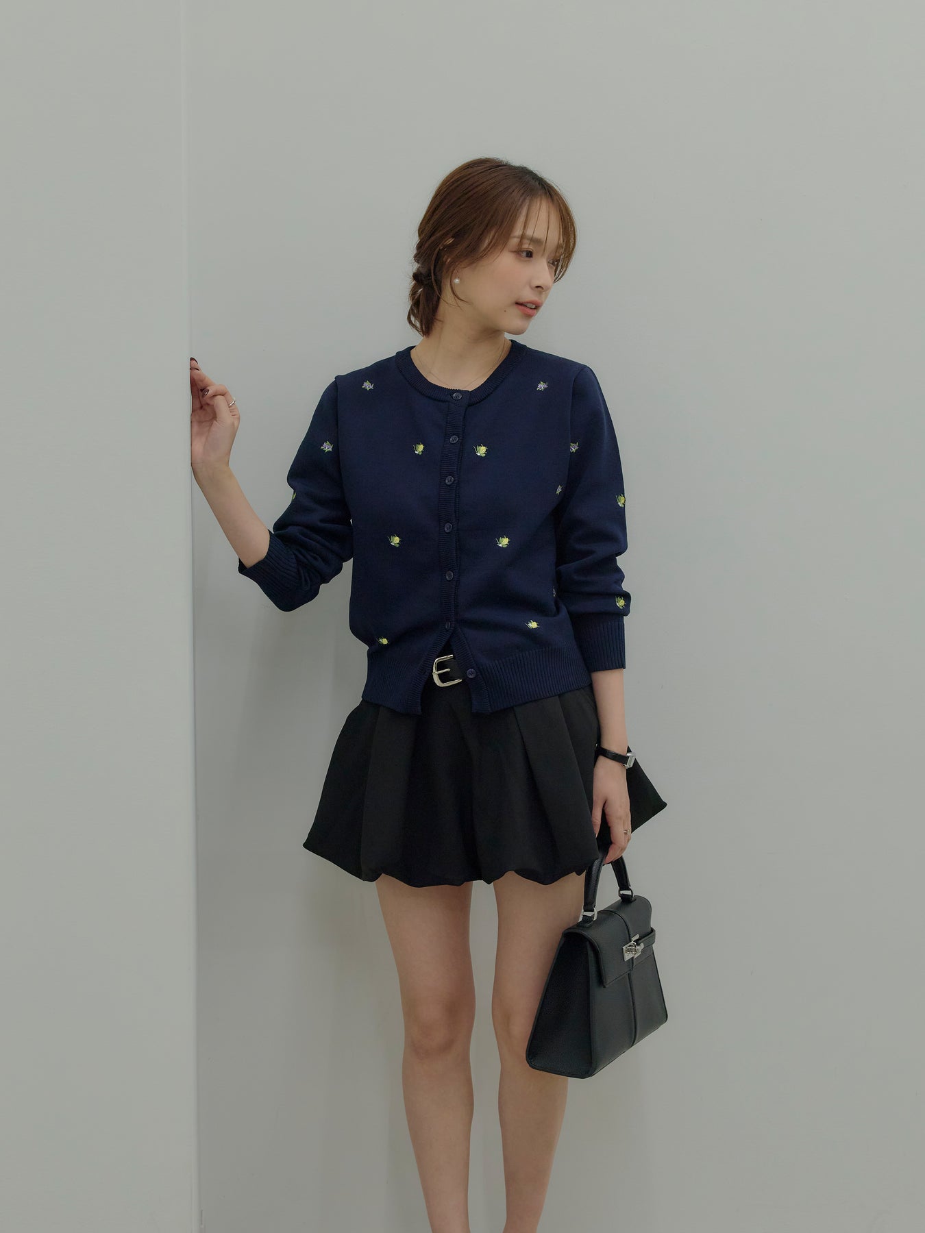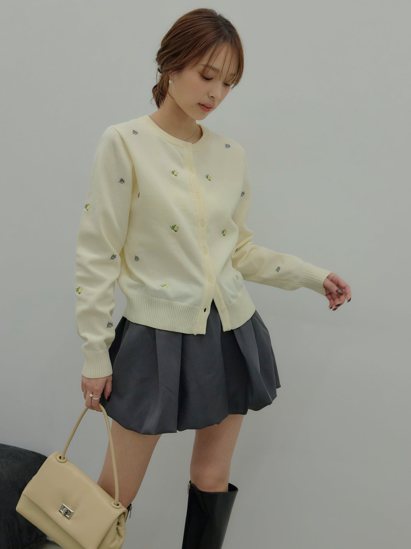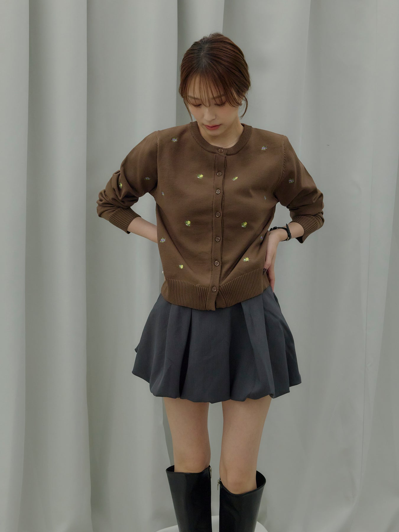 さりげないフルーツ刺繍が目を惹く、遊び心のあるクルーネックカーディガン。