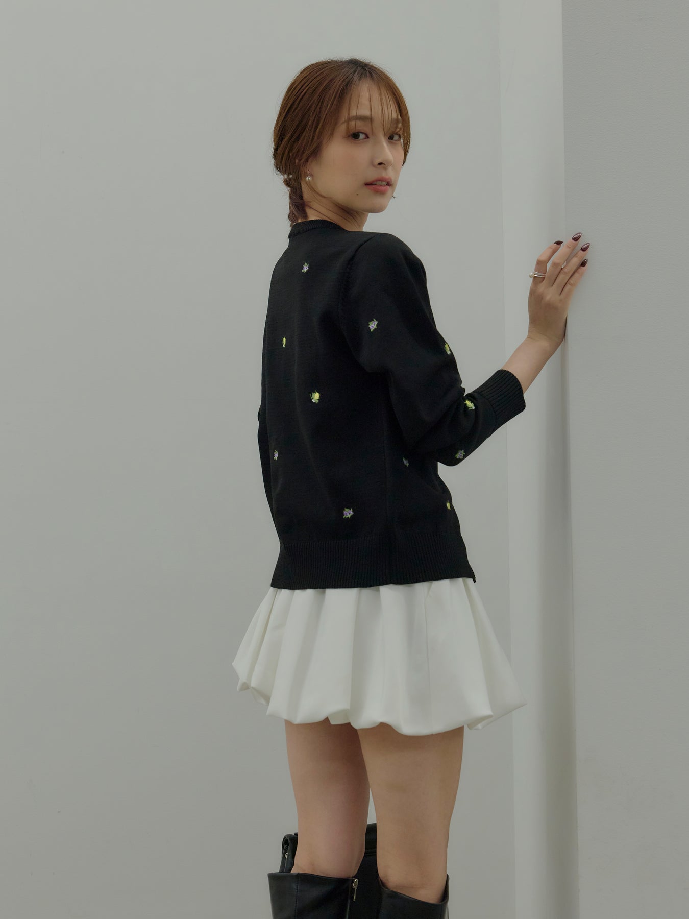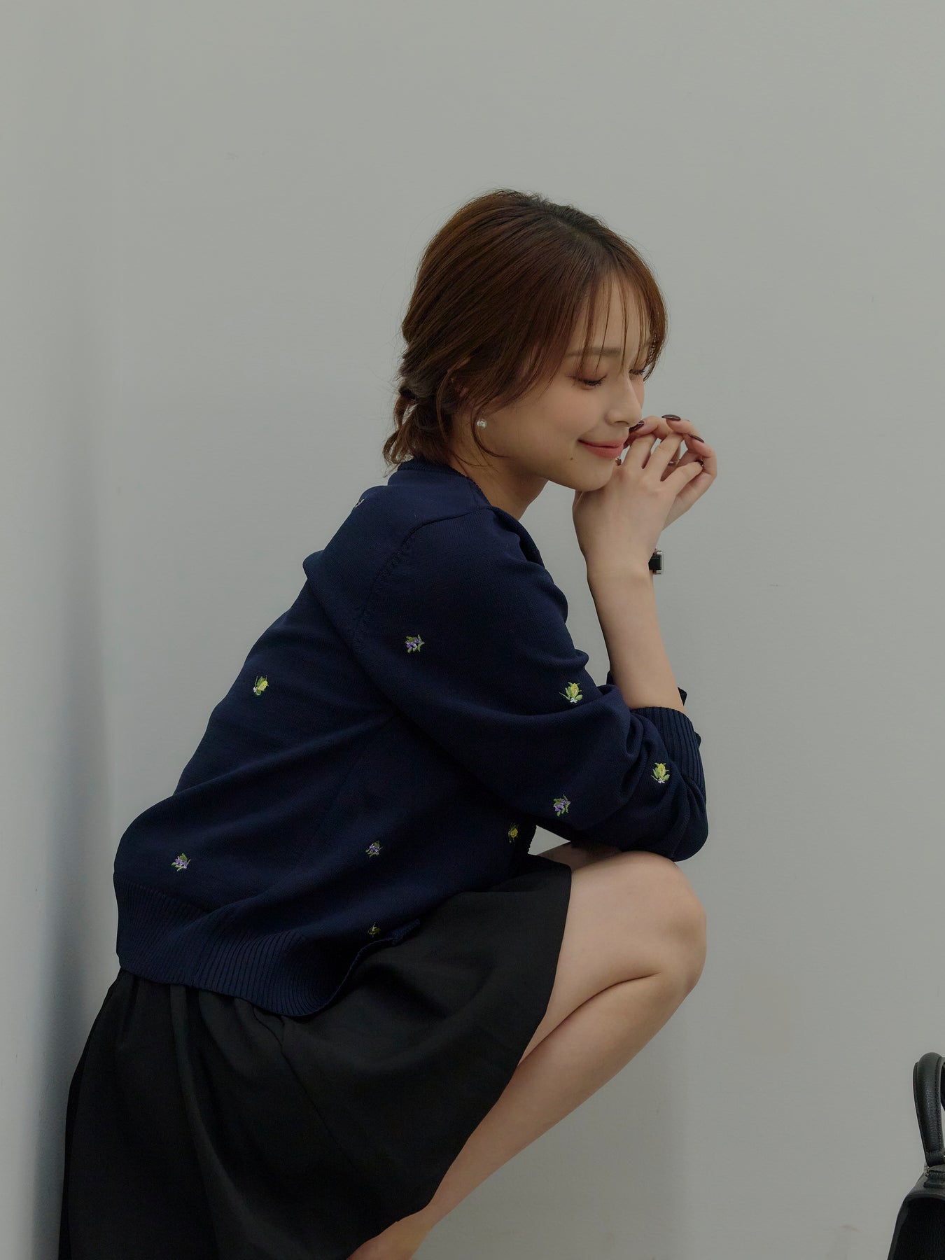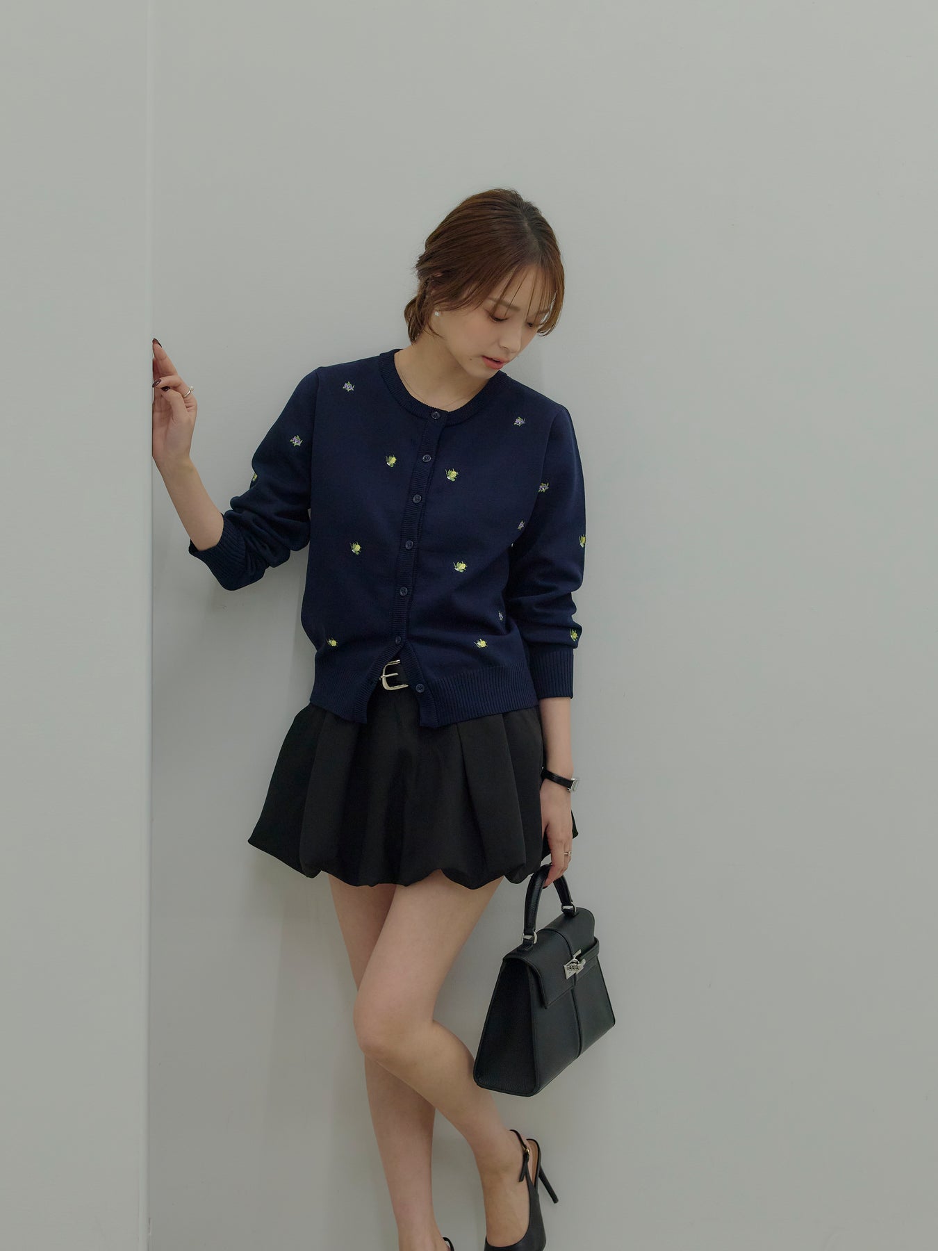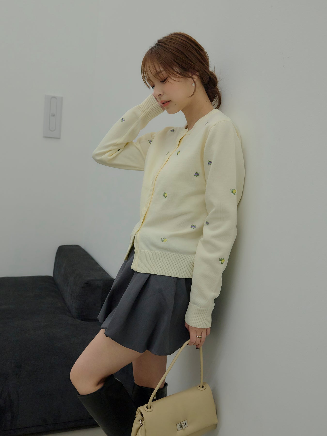 さりげないフルーツ刺繍が目を惹く、遊び心のあるクルーネックカーディガン。