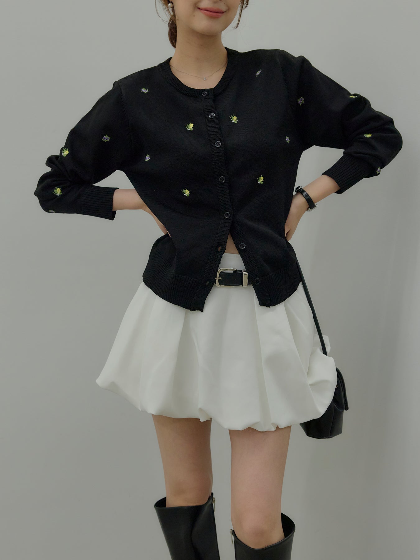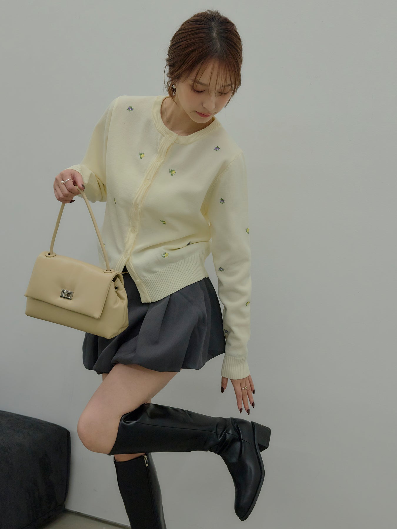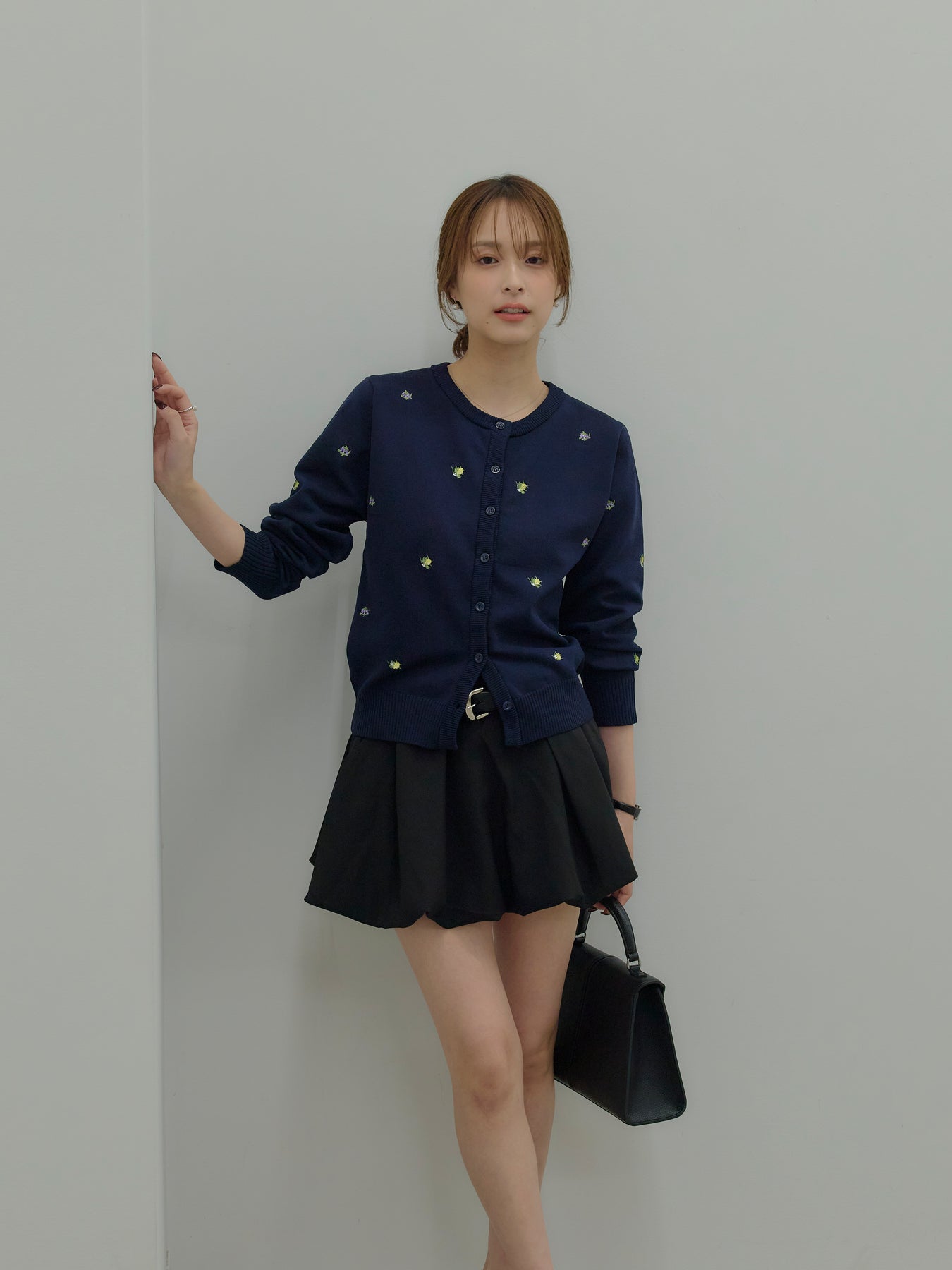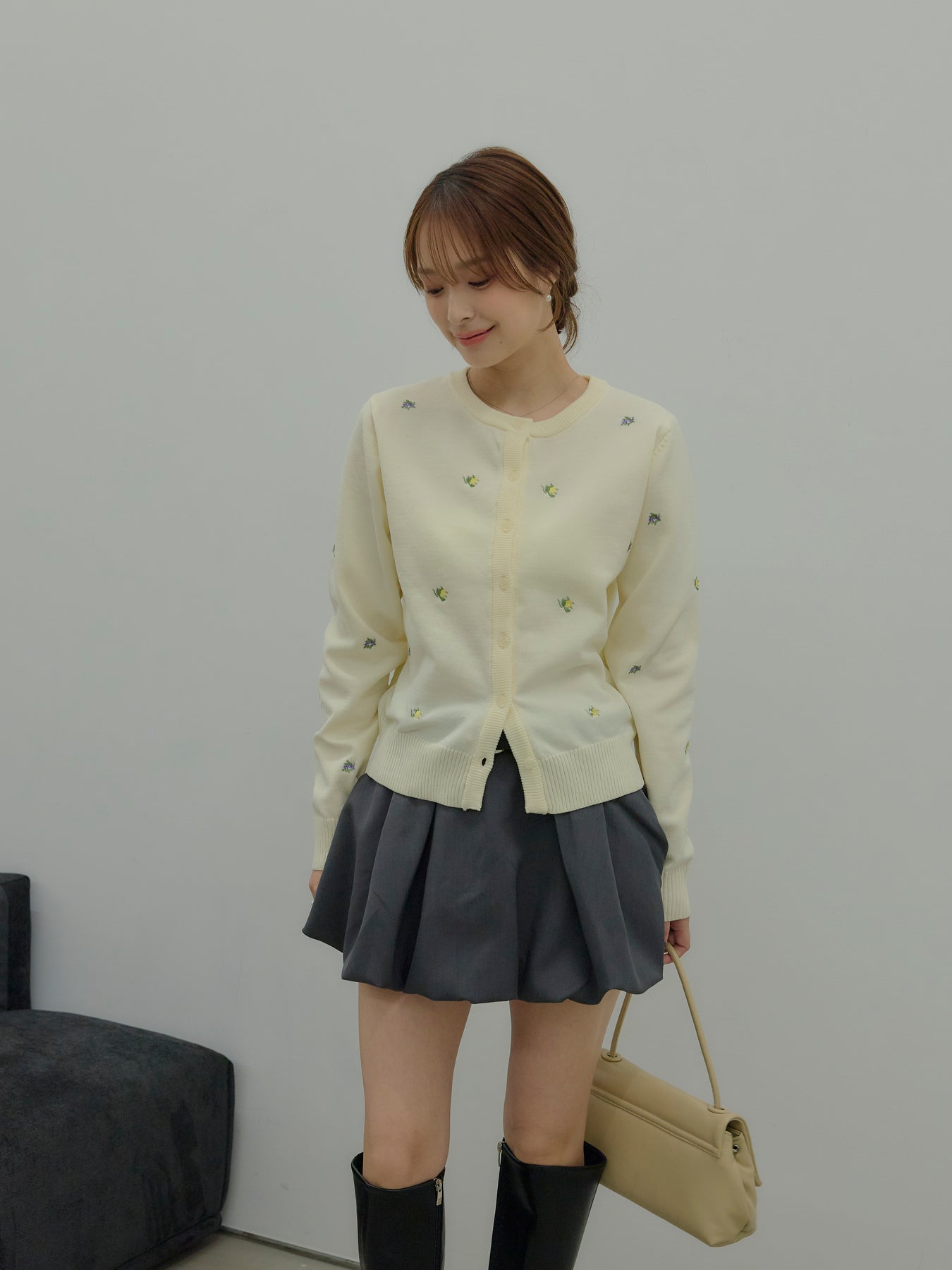 さりげないフルーツ刺繍が目を惹く、遊び心のあるクルーネックカーディガン。