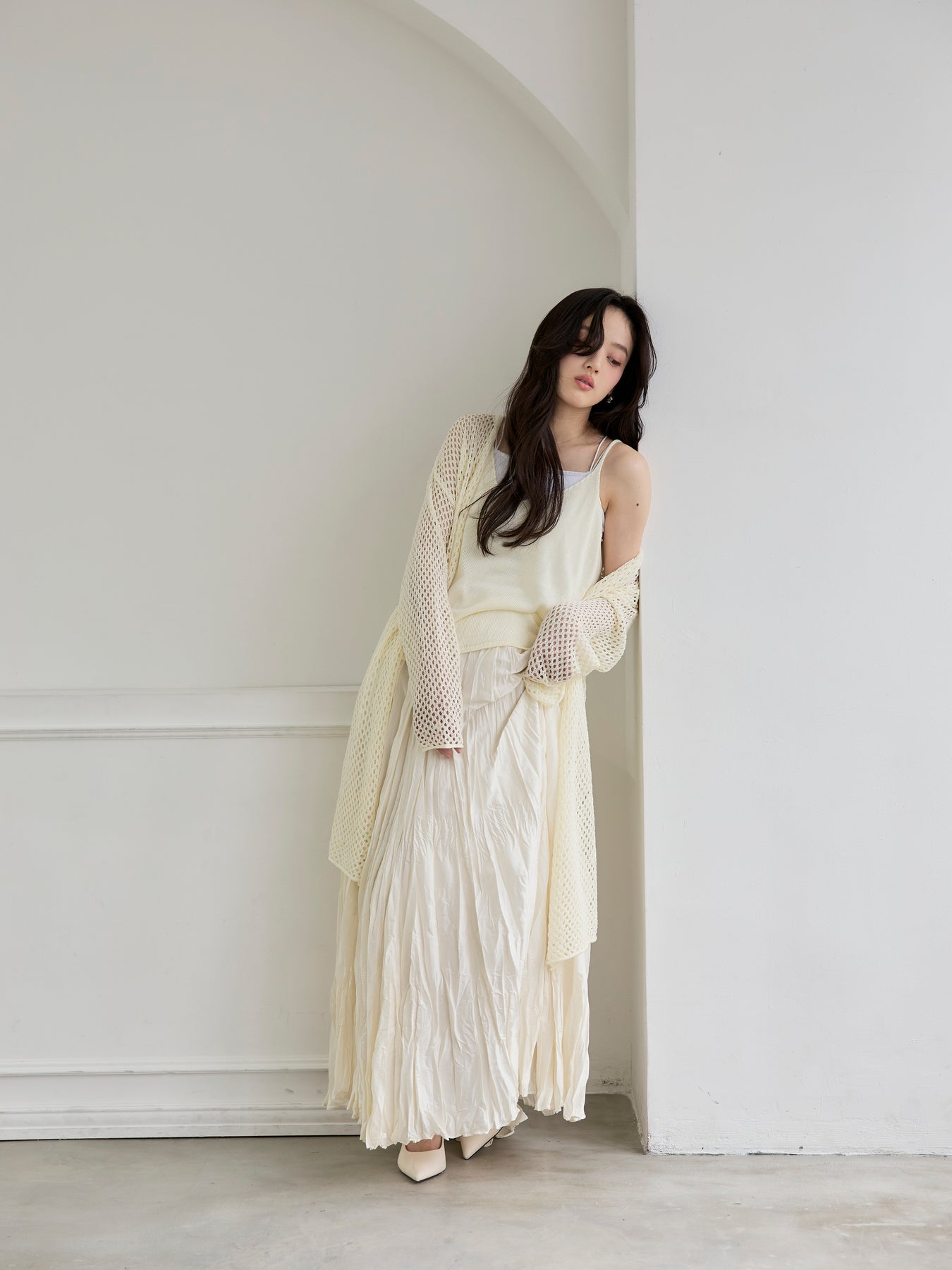 同素材のキャミソールで洗練されたコーディネートに。