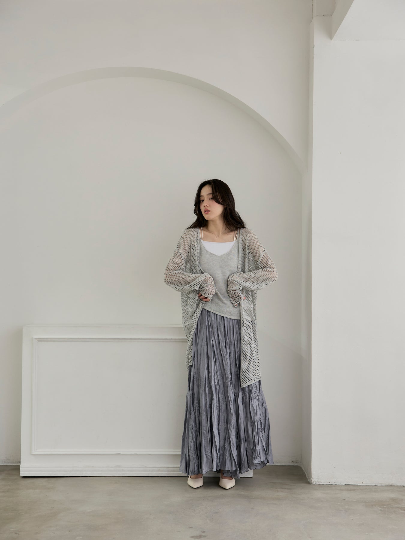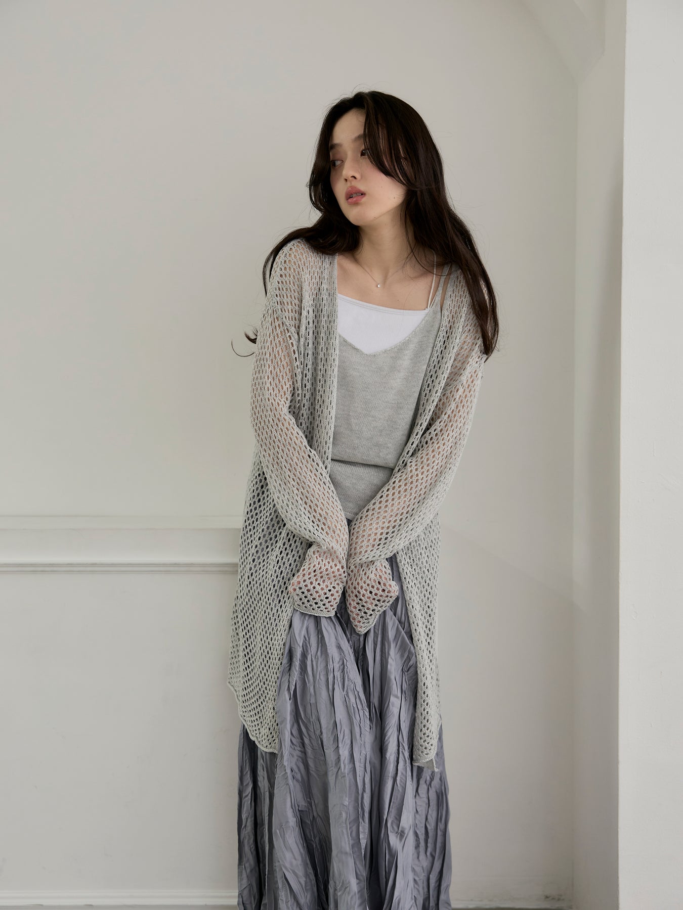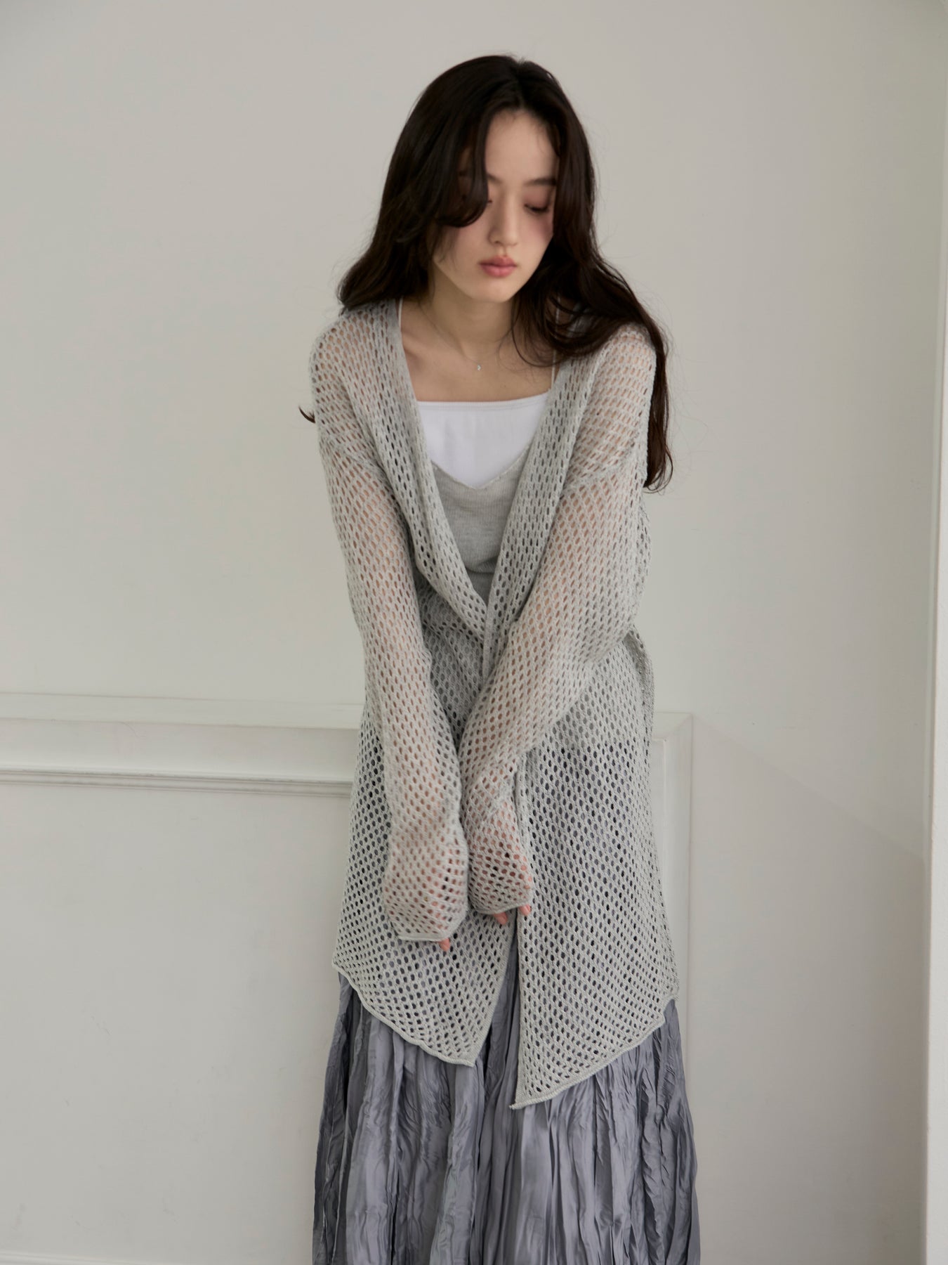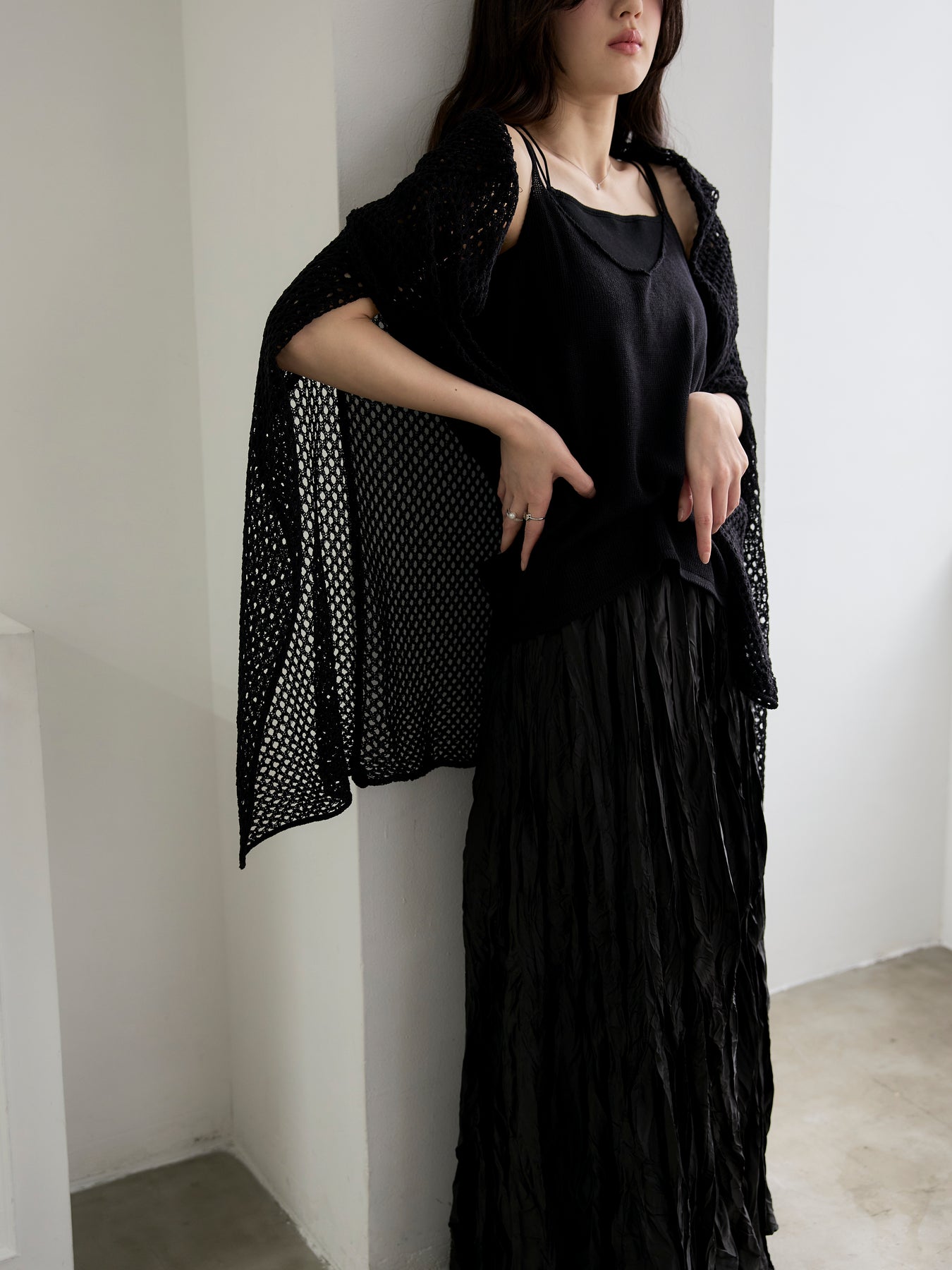 ゆるっとルーズなサイズ感のカーディガンは程よく透けて大人の肌見せにぴったり。