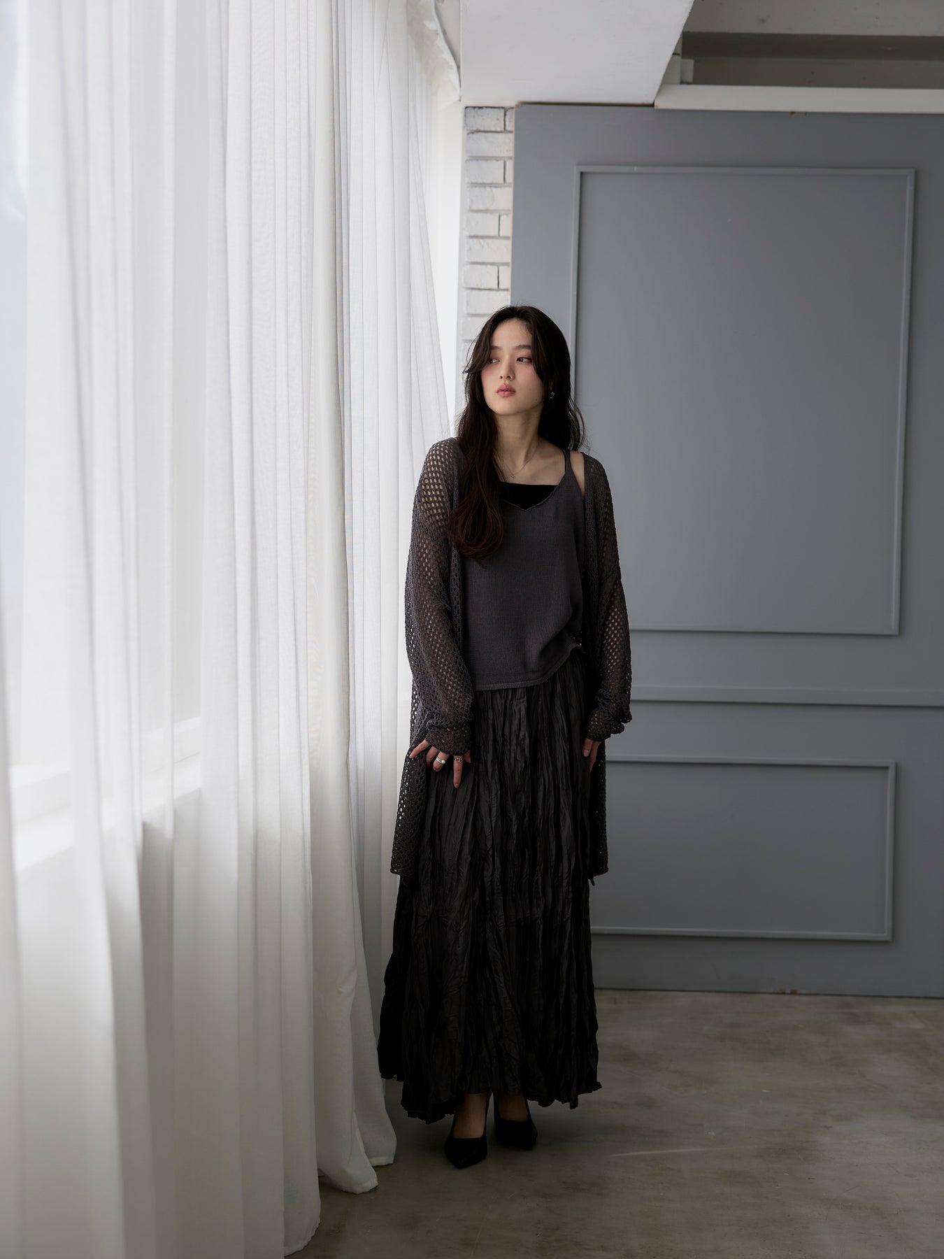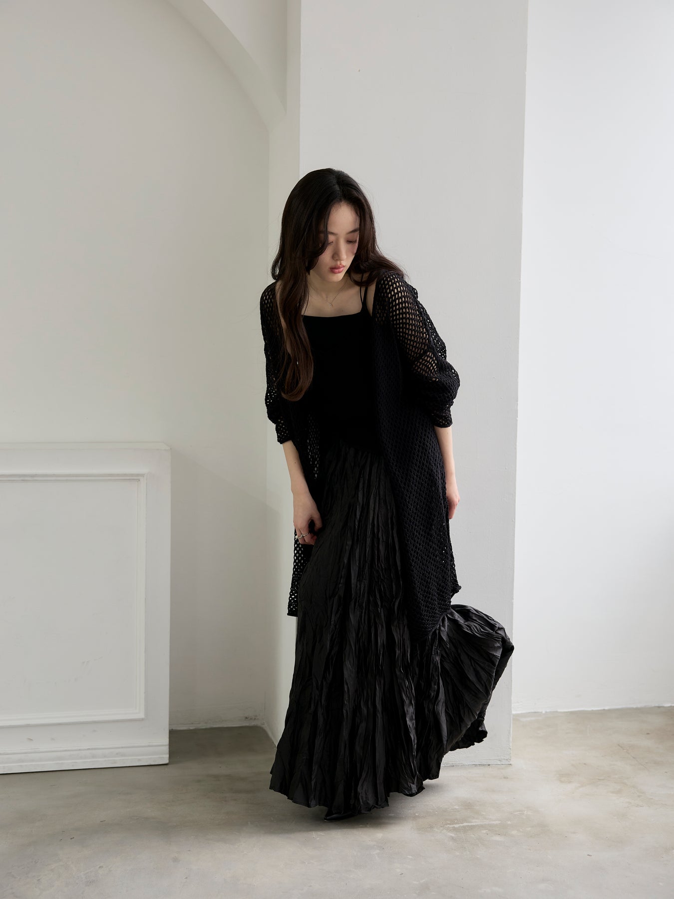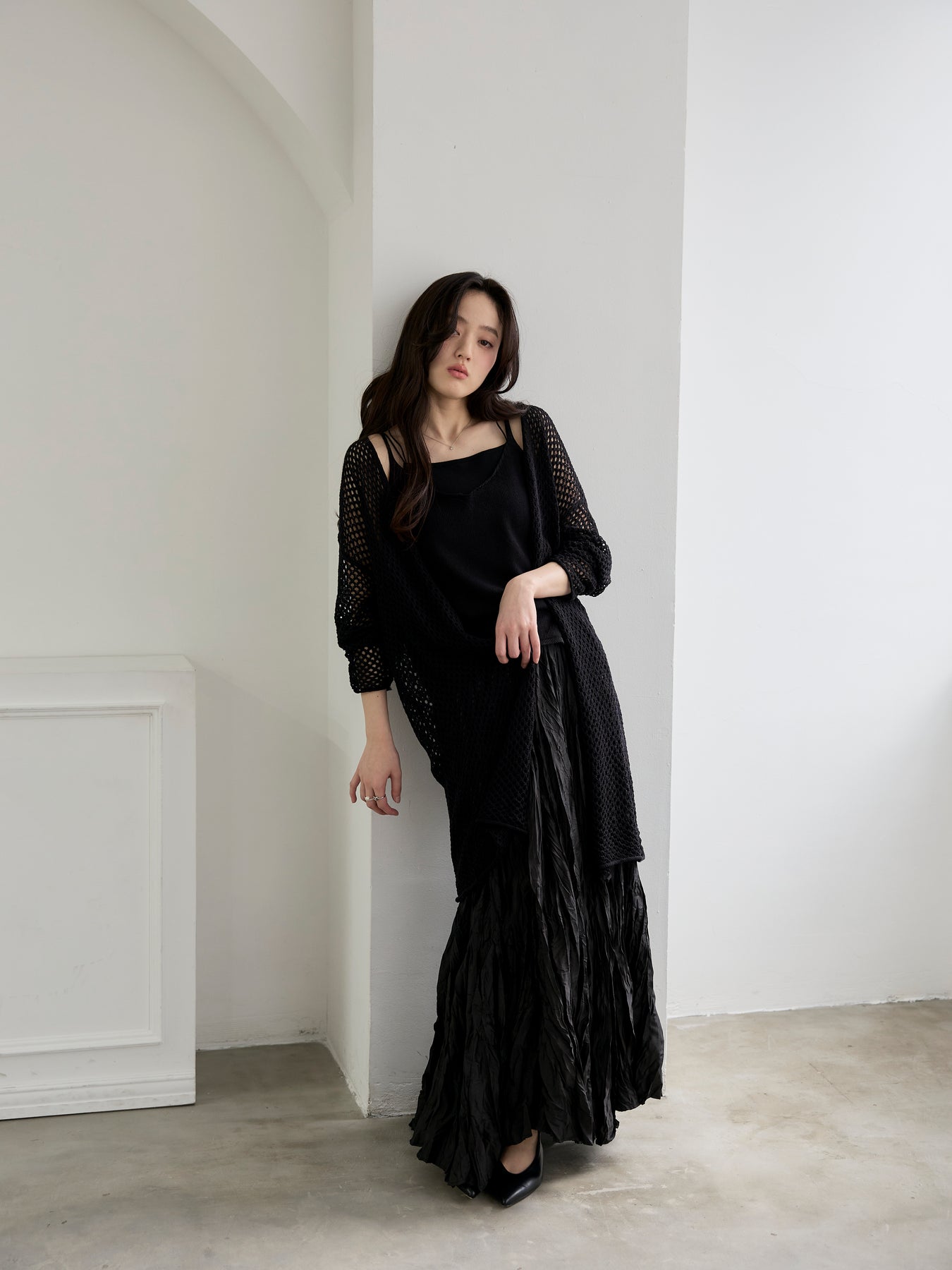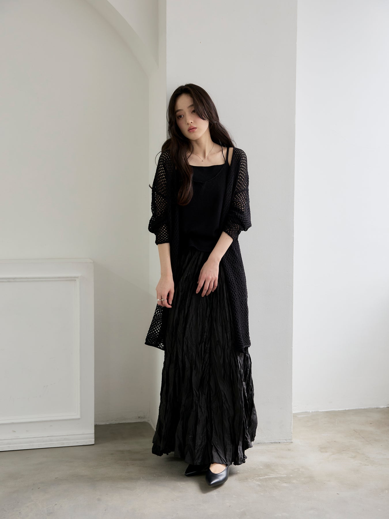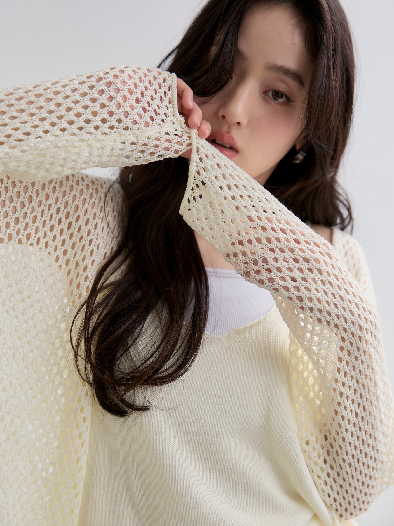 ゆるっとルーズなサイズ感のカーディガンは程よく透けて大人の肌見せにぴったり。