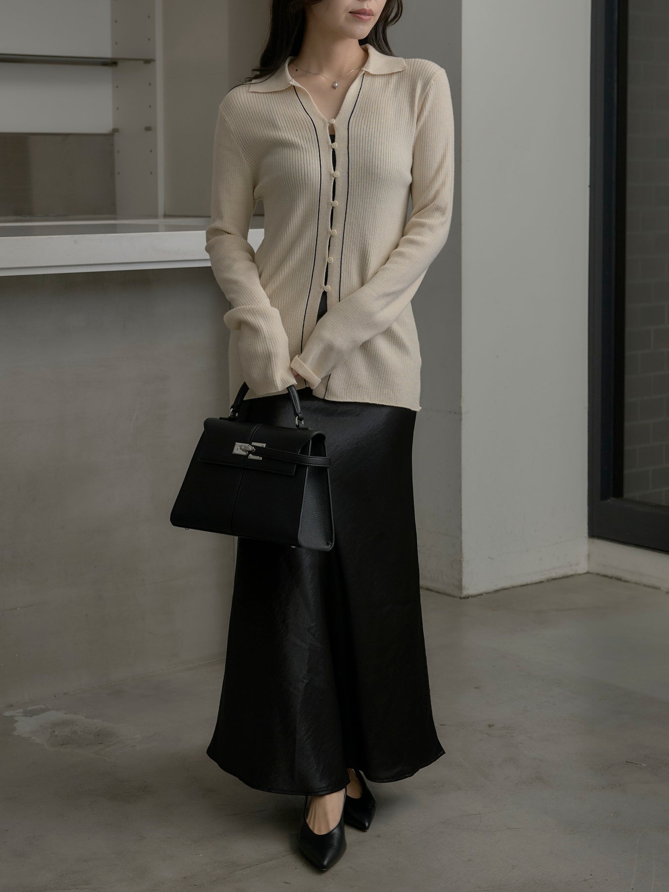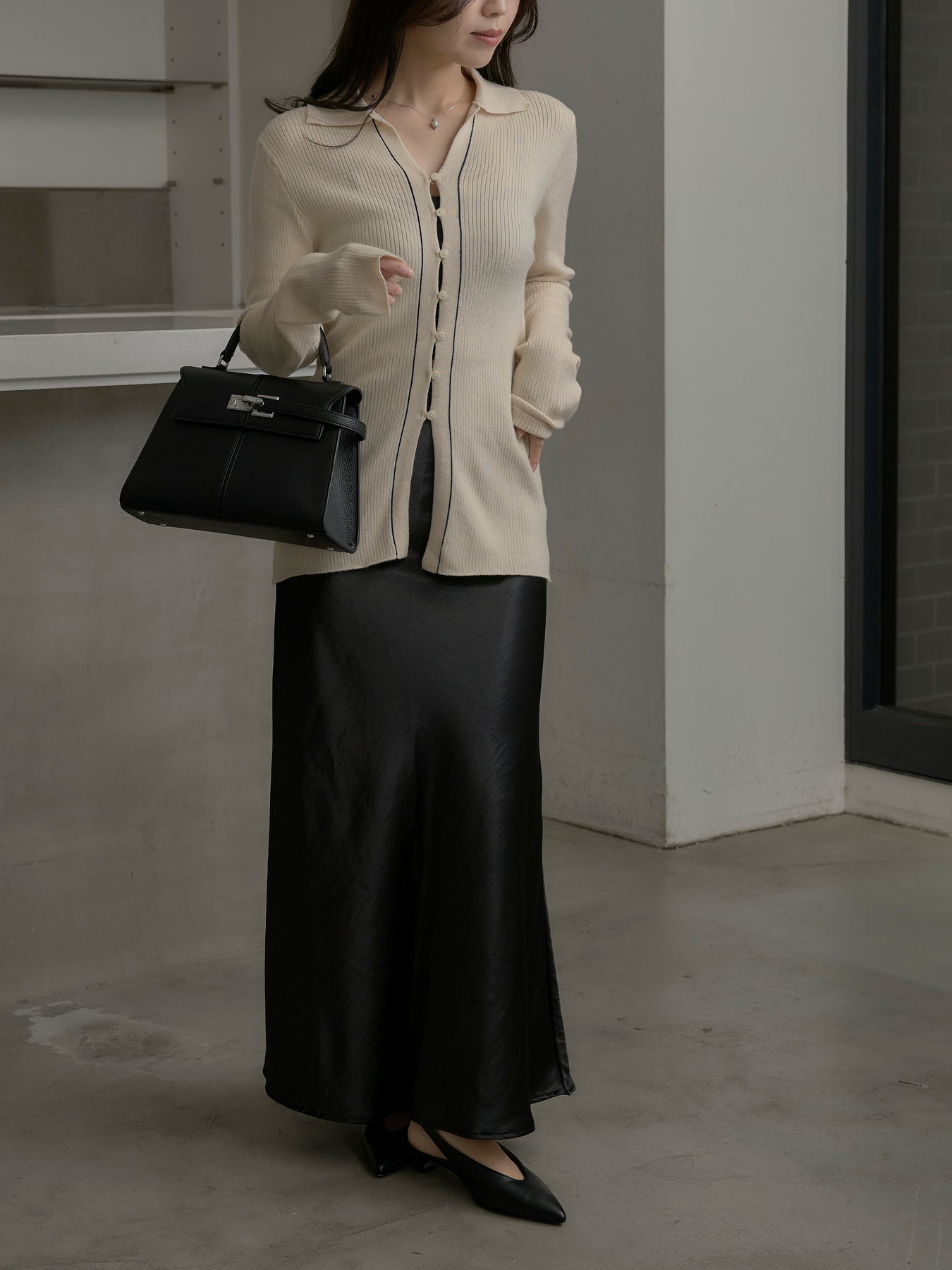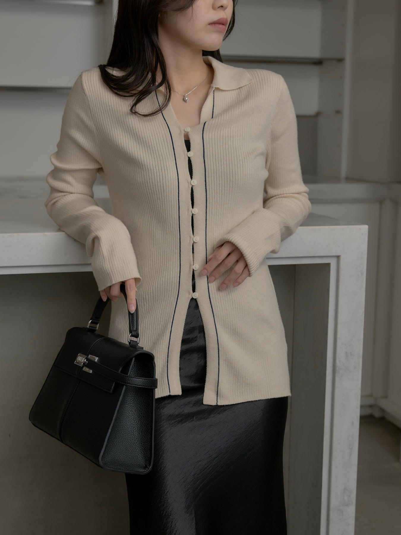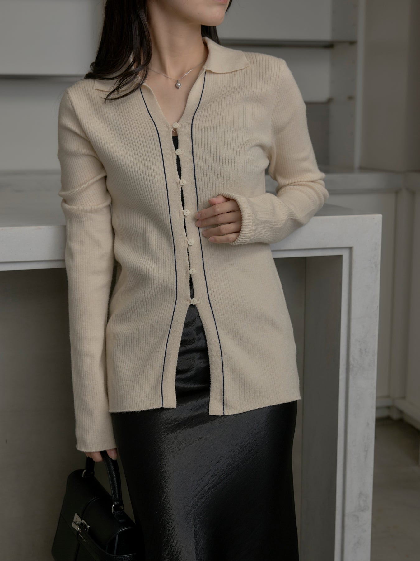 フロントの配色ラインがアクセントになったリブニットカーディガン。