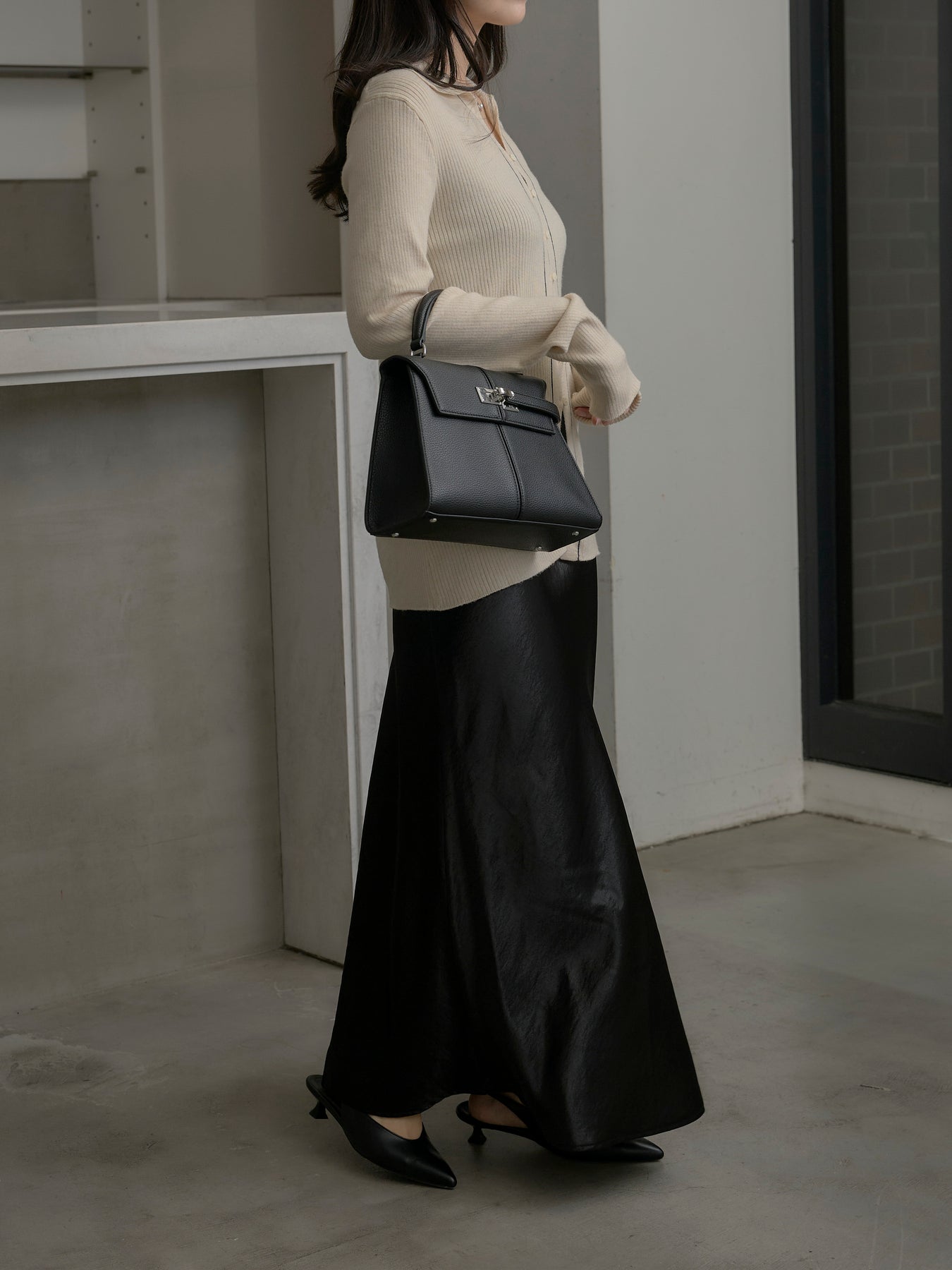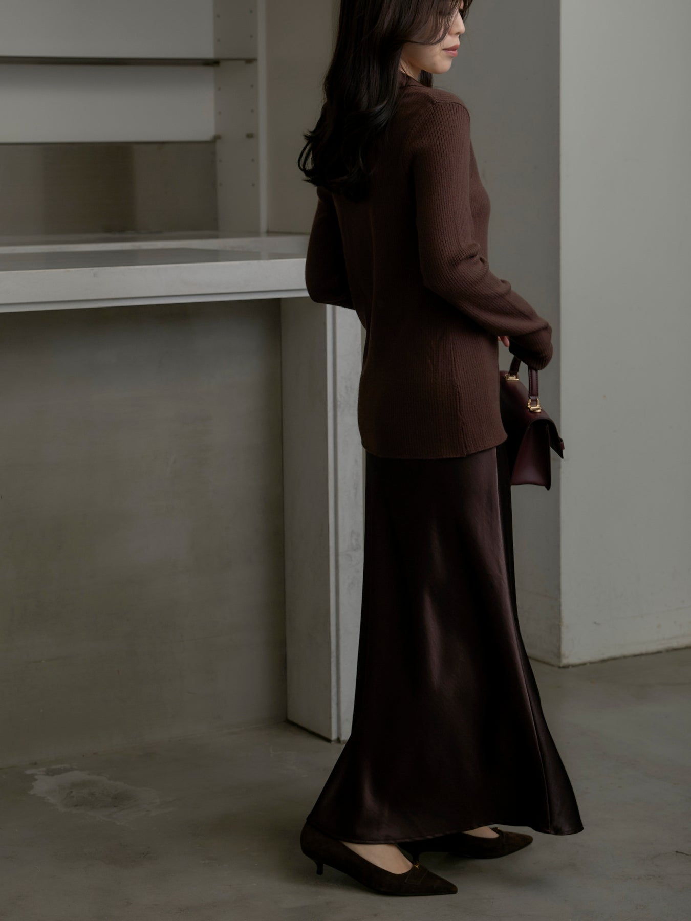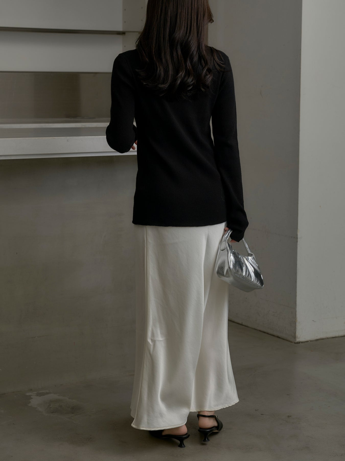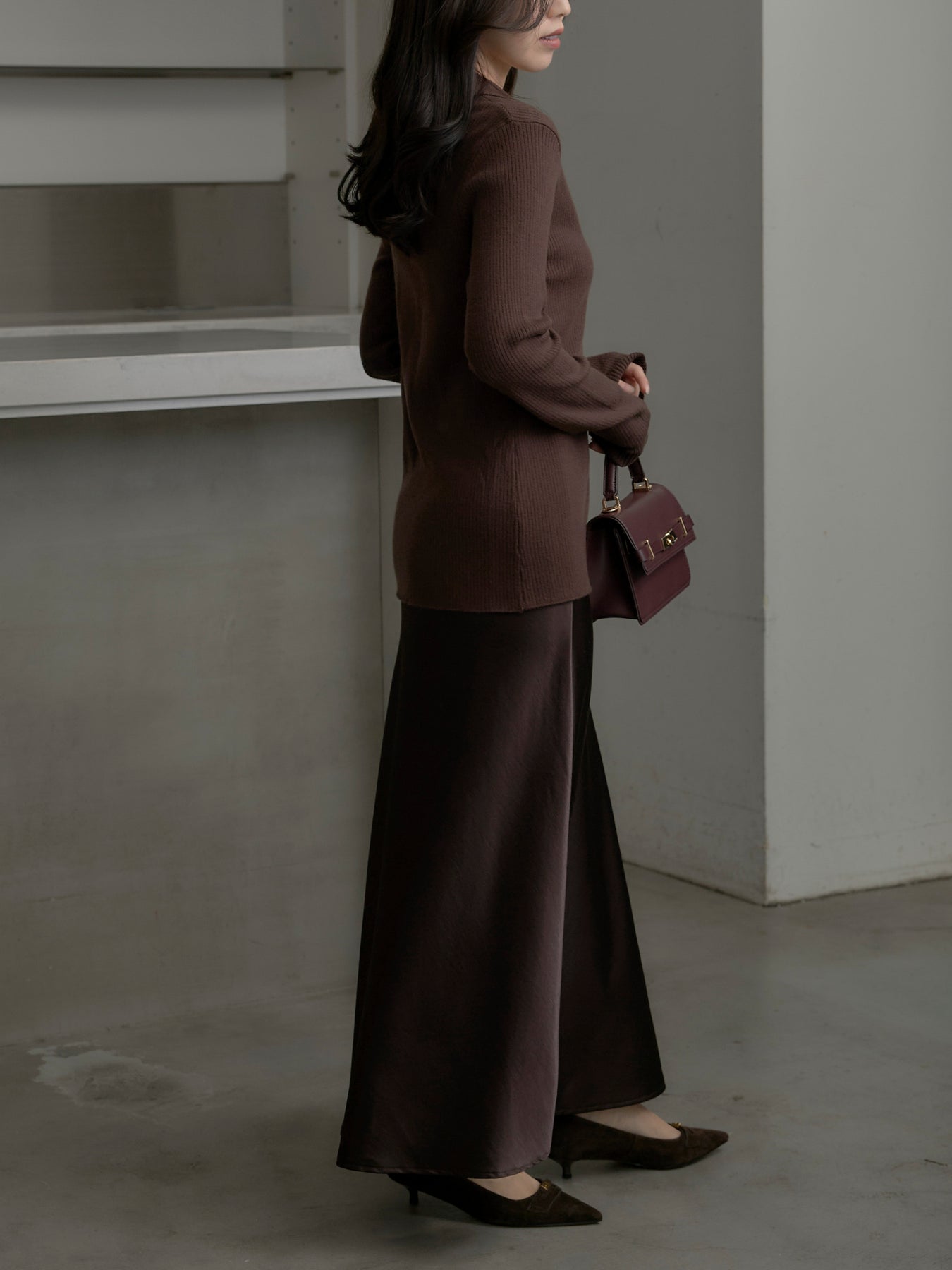 美しい光沢感のあるサテン素材を使用したナローAラインスカート。落ち感のあるシルエットが女性らしさを引き立て、幅広いトップスと好相性です。