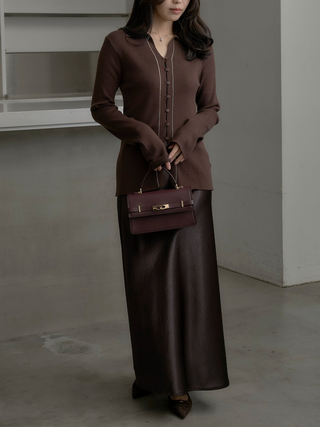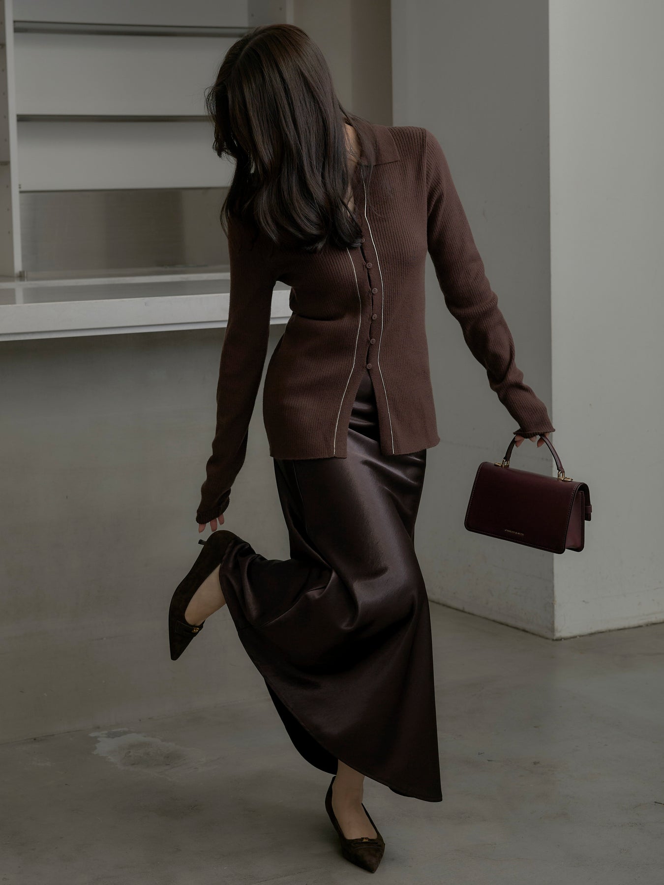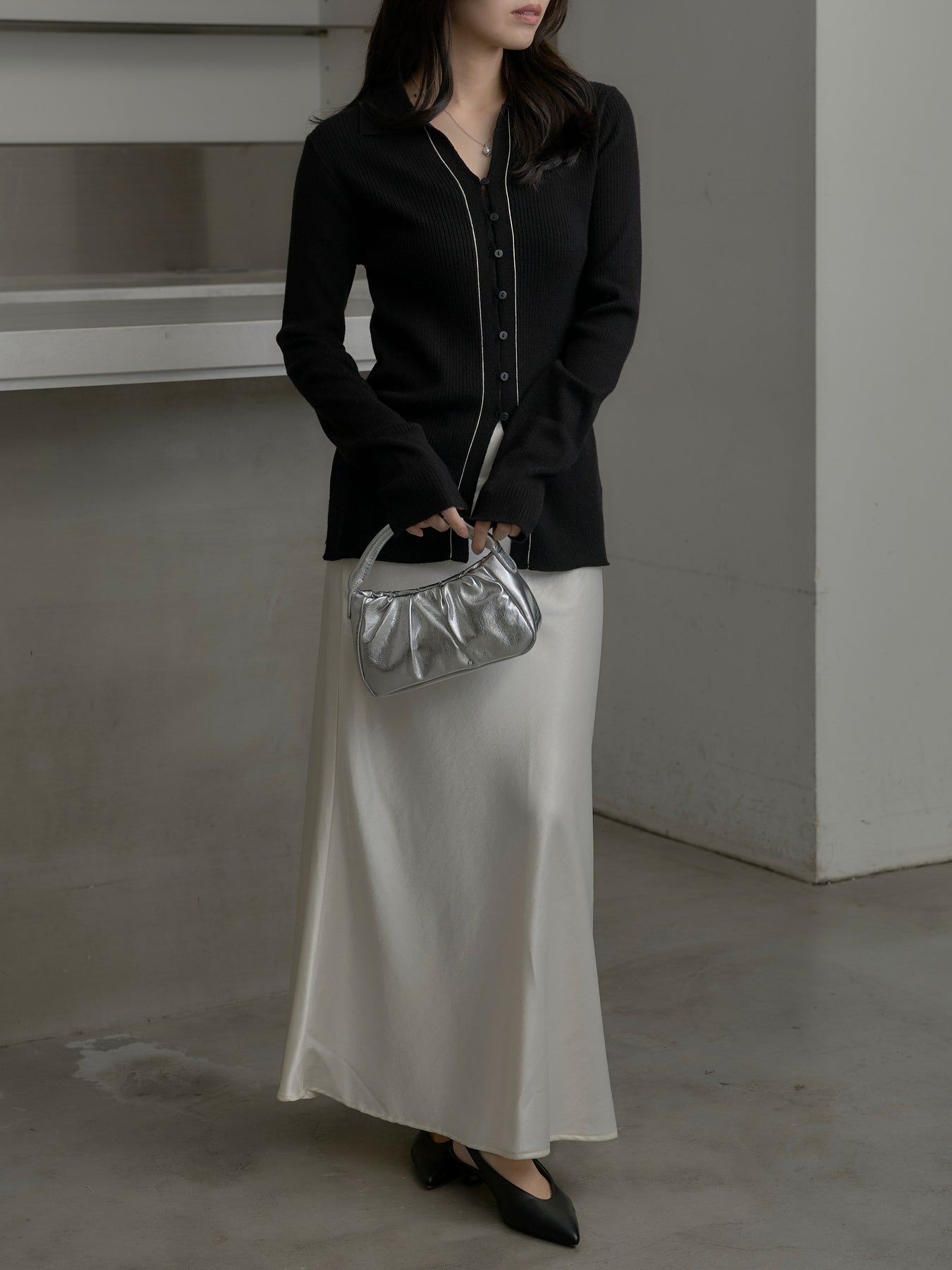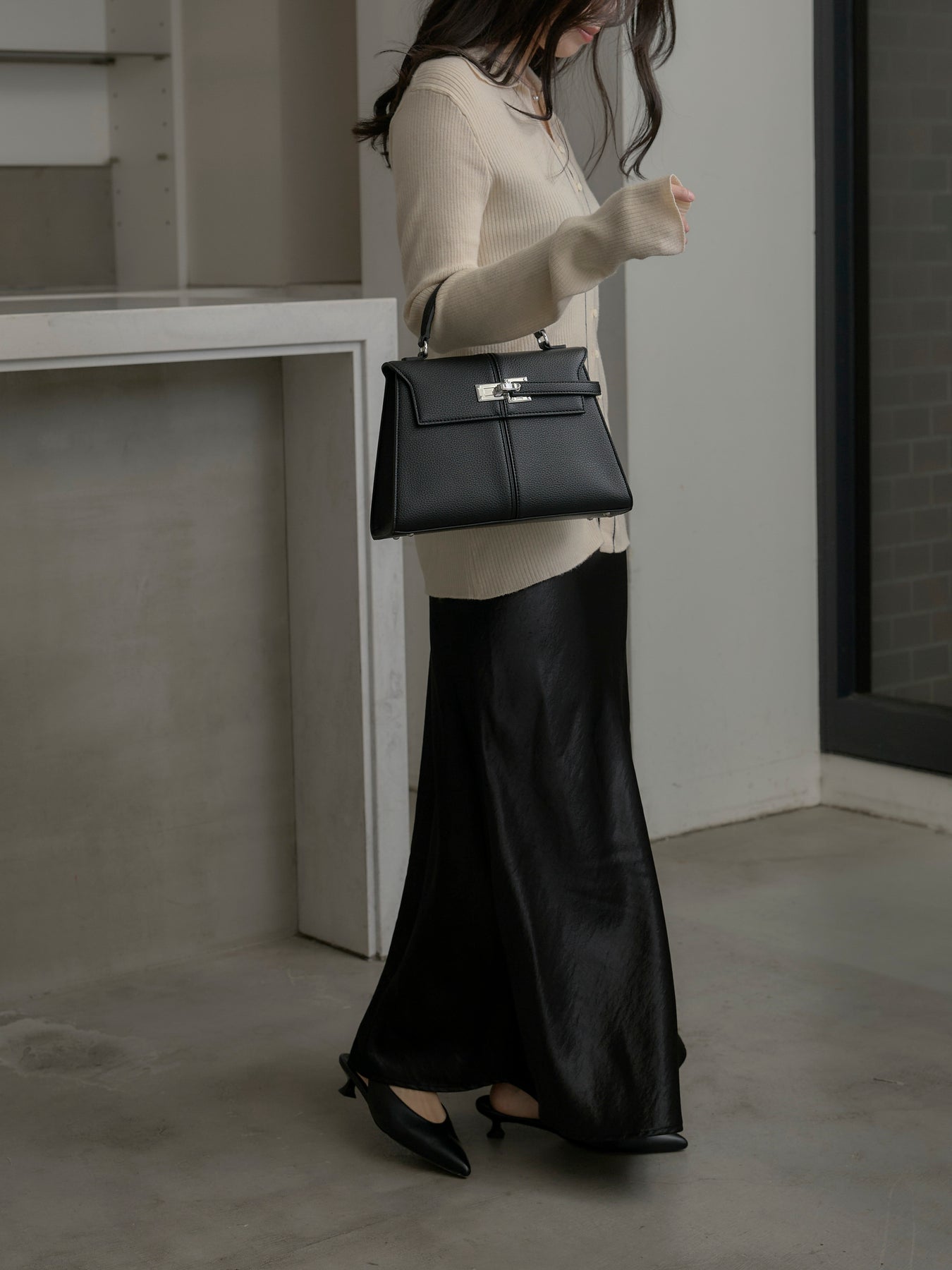 美しい光沢感のあるサテン素材を使用したナローAラインスカート。落ち感のあるシルエットが女性らしさを引き立て、幅広いトップスと好相性です。