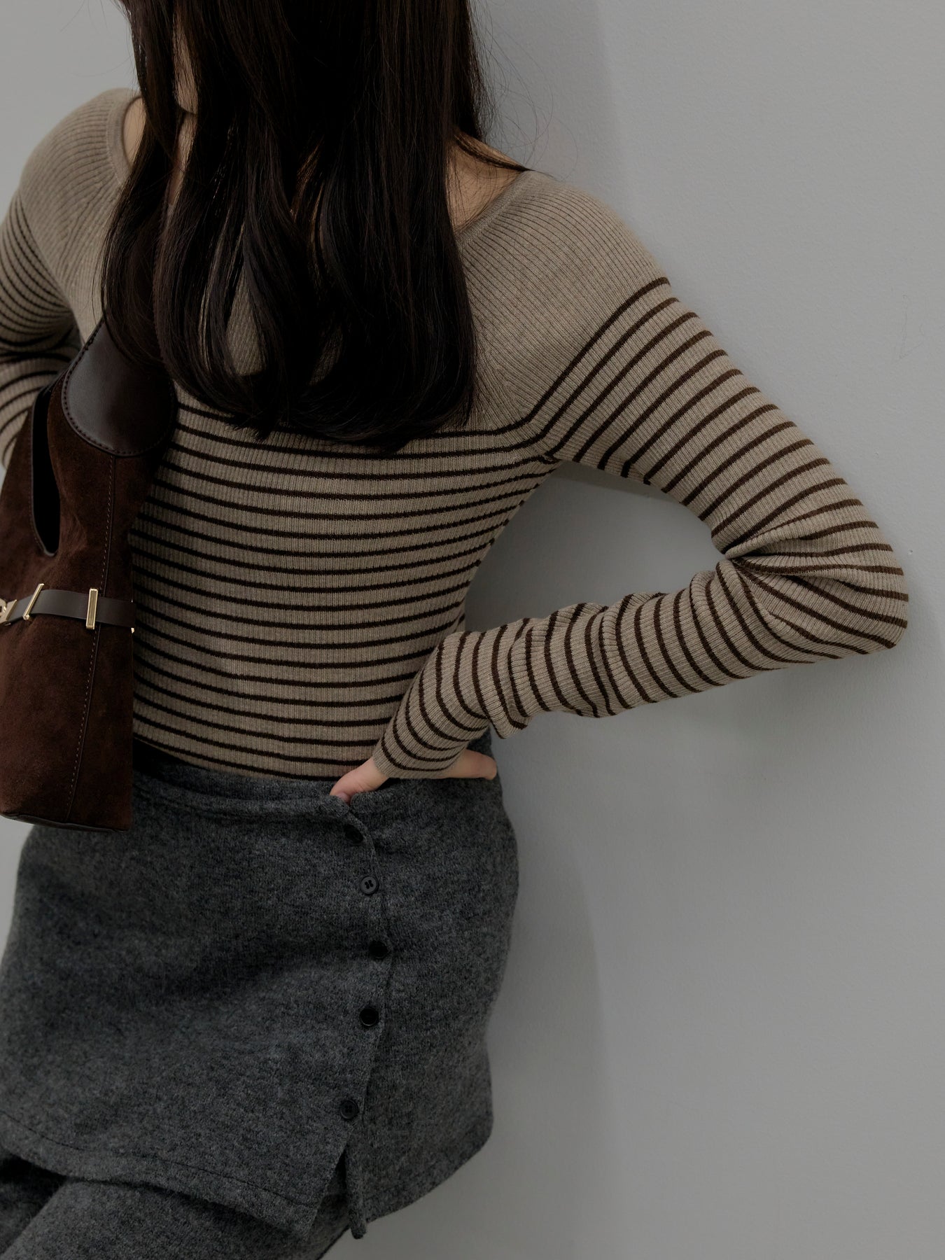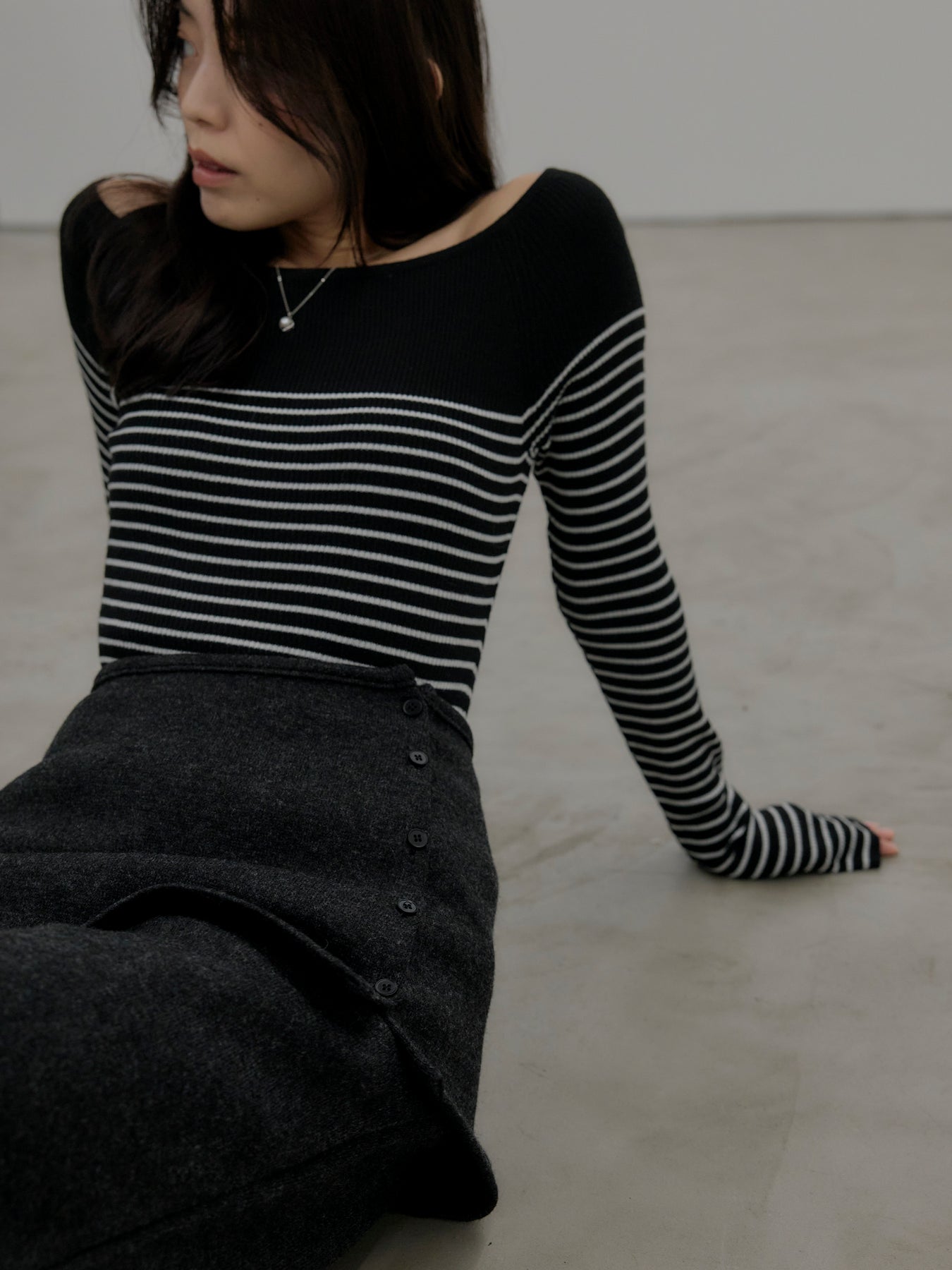 ハーフボーダーデザインが印象的なニットトップス。