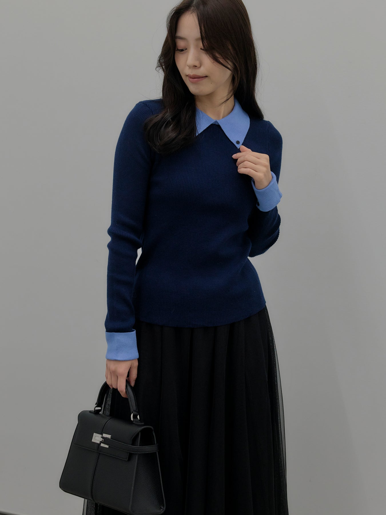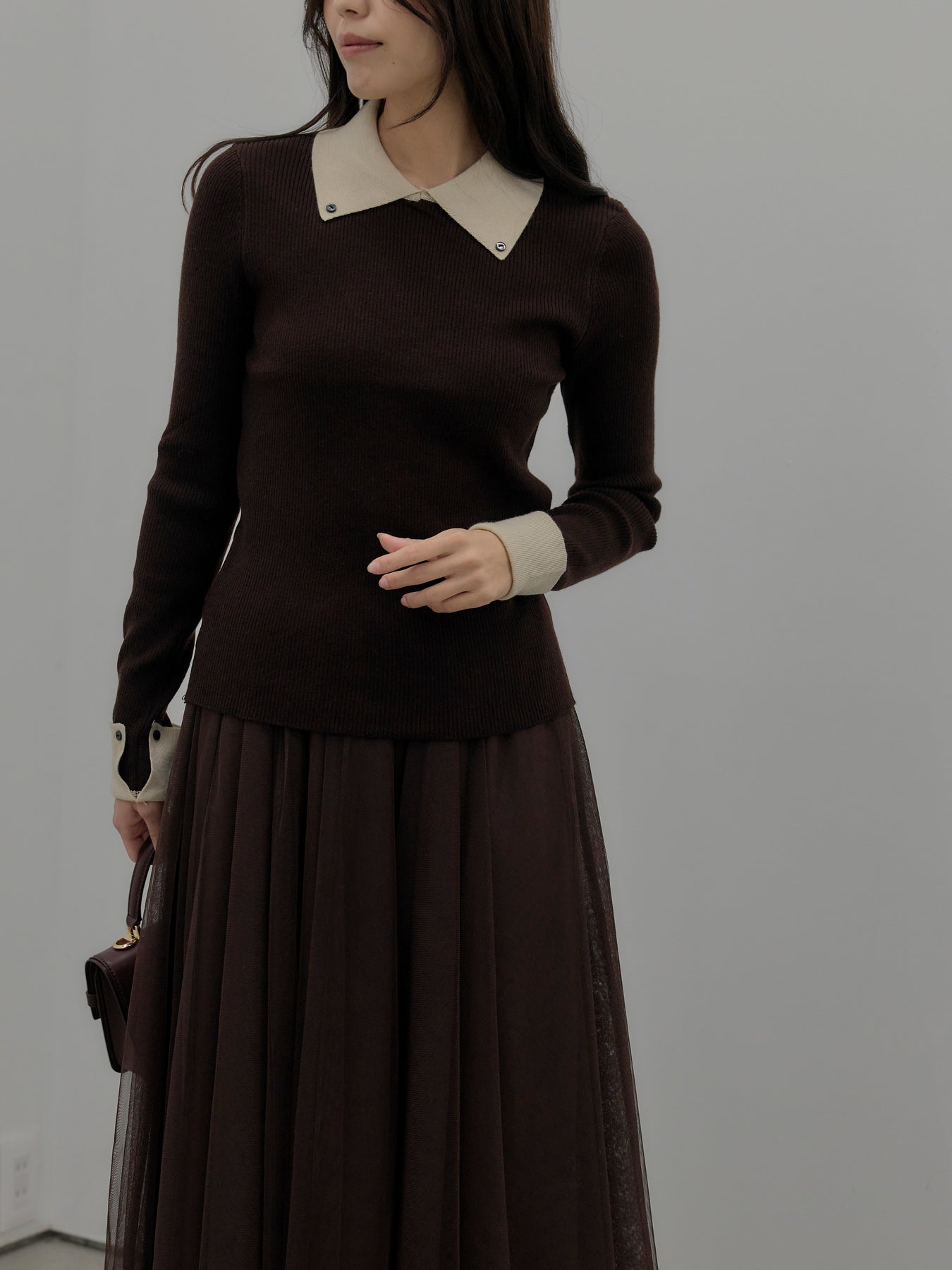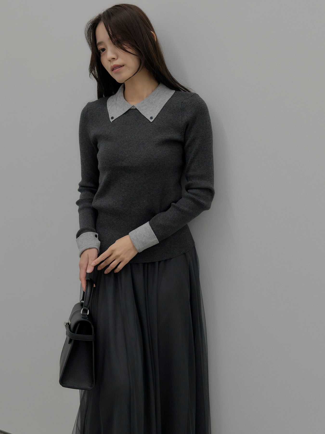 襟付きデザインがきちんと感をプラスし、デニムからスカートまで幅広いスタイリングにマッチします。