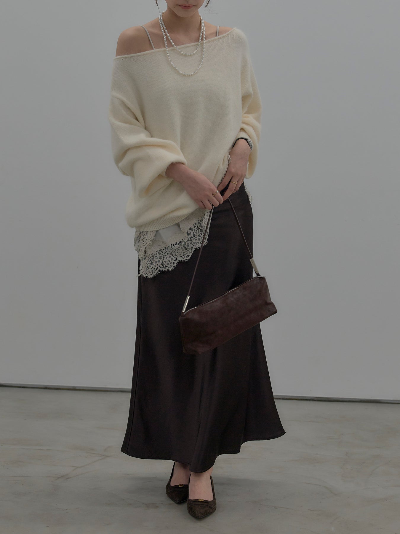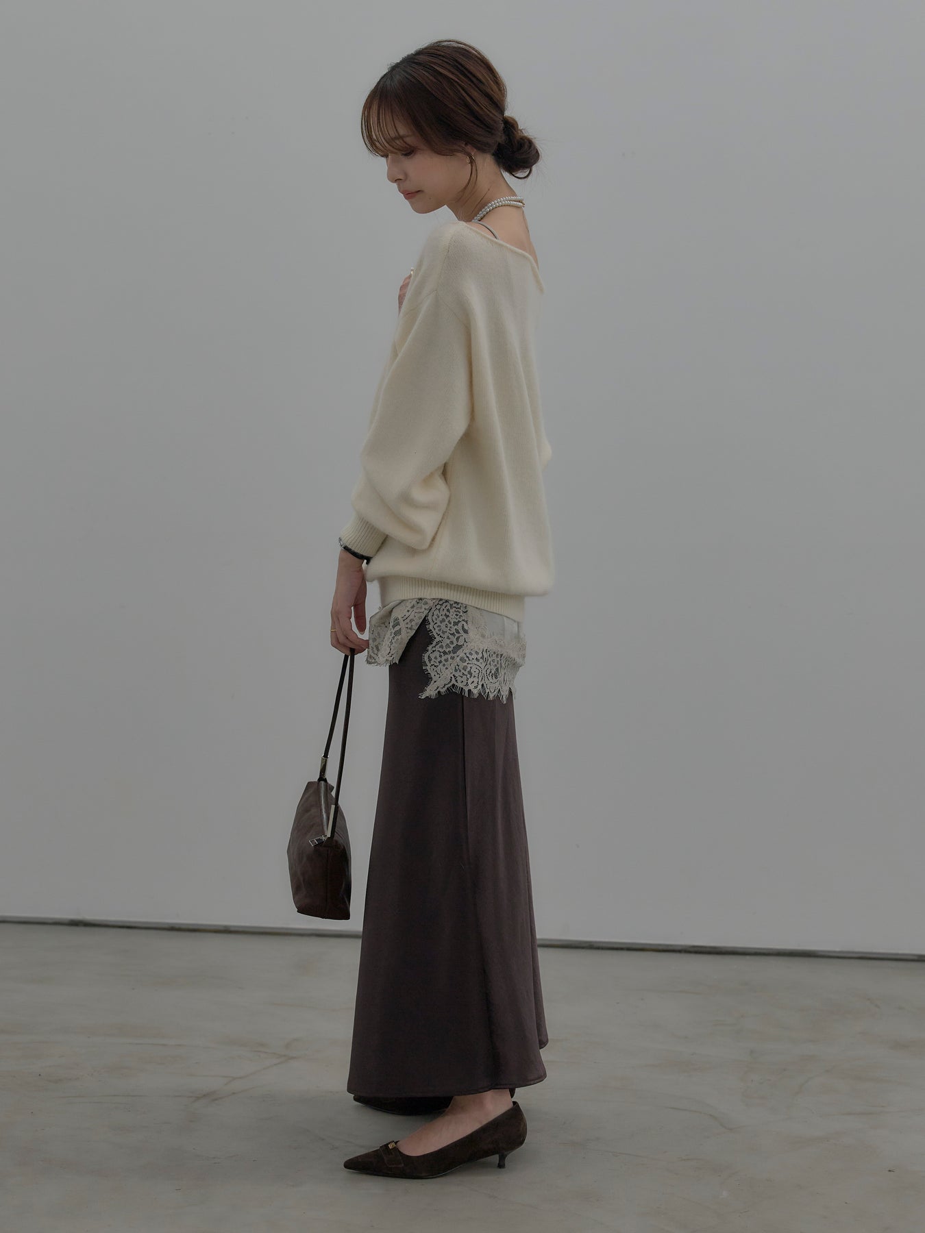 美しい光沢感のあるサテン素材を使用したナローAラインスカート。落ち感のあるシルエットが女性らしさを引き立て、幅広いトップスと好相性です。