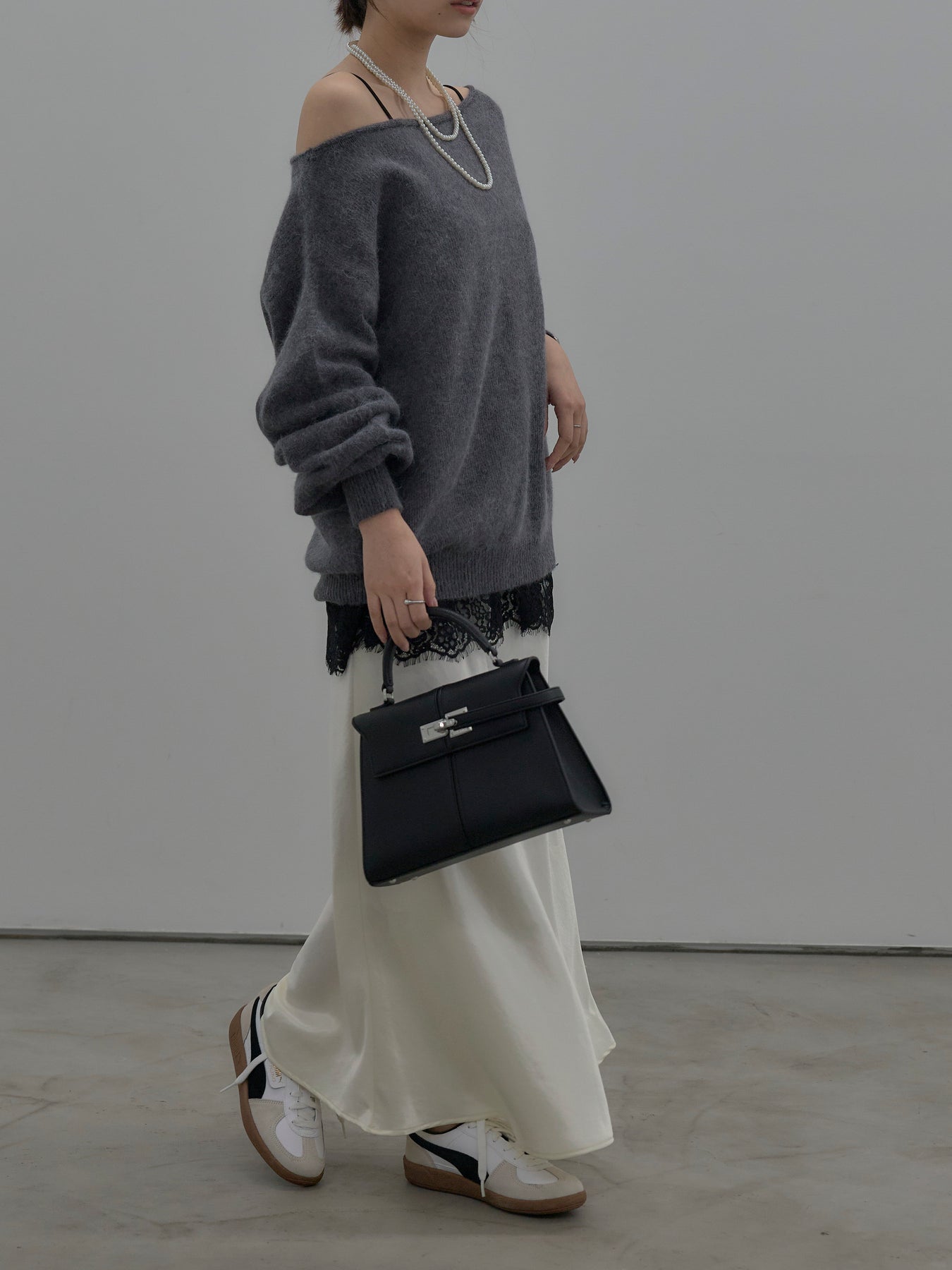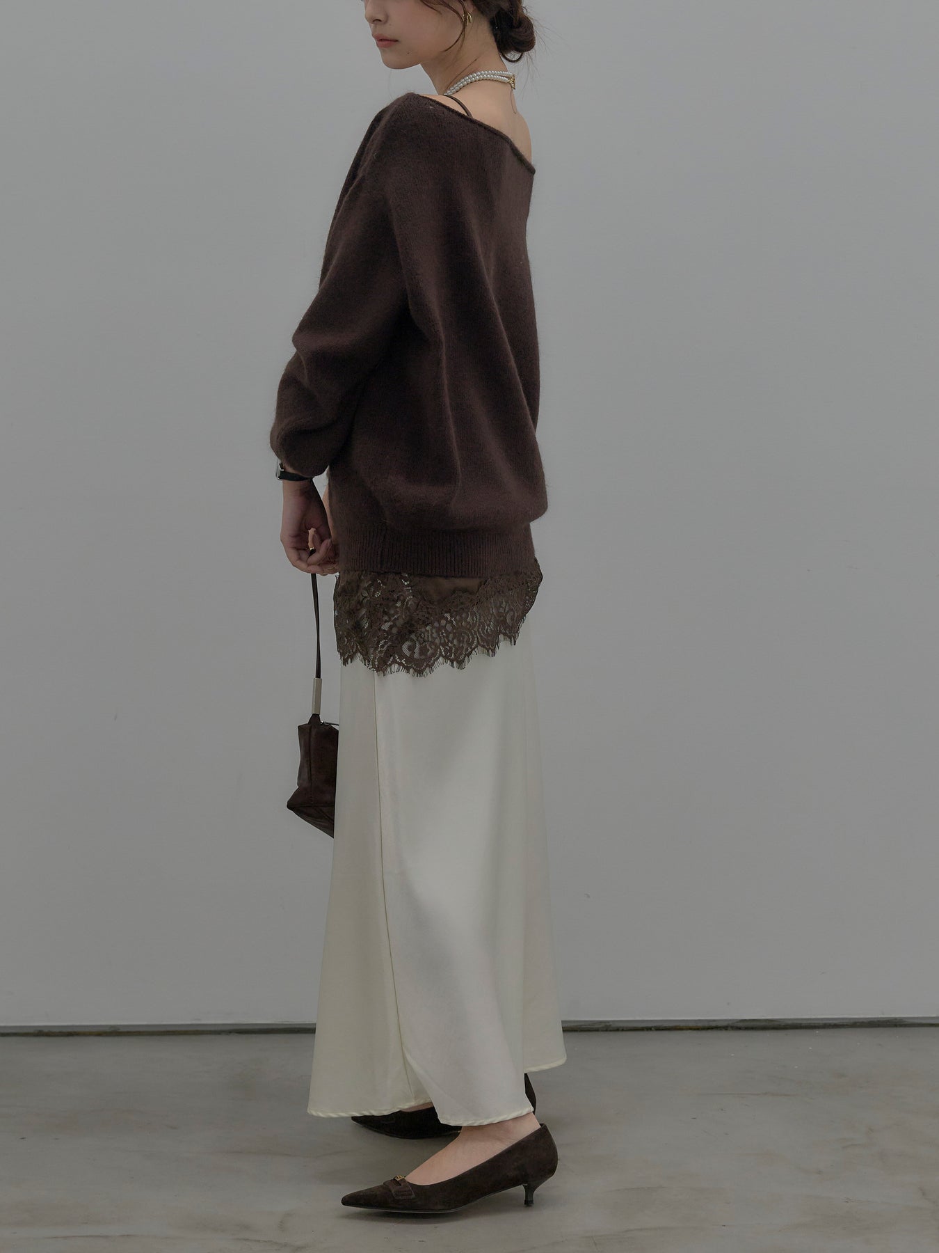華奢なストラップと程よいツヤ感が女性らしさを引き立てます。サイドもしっかりレースがついていて、紐部分もサテンになっているので下着感なく、都会的に落とし込んでいただけます。