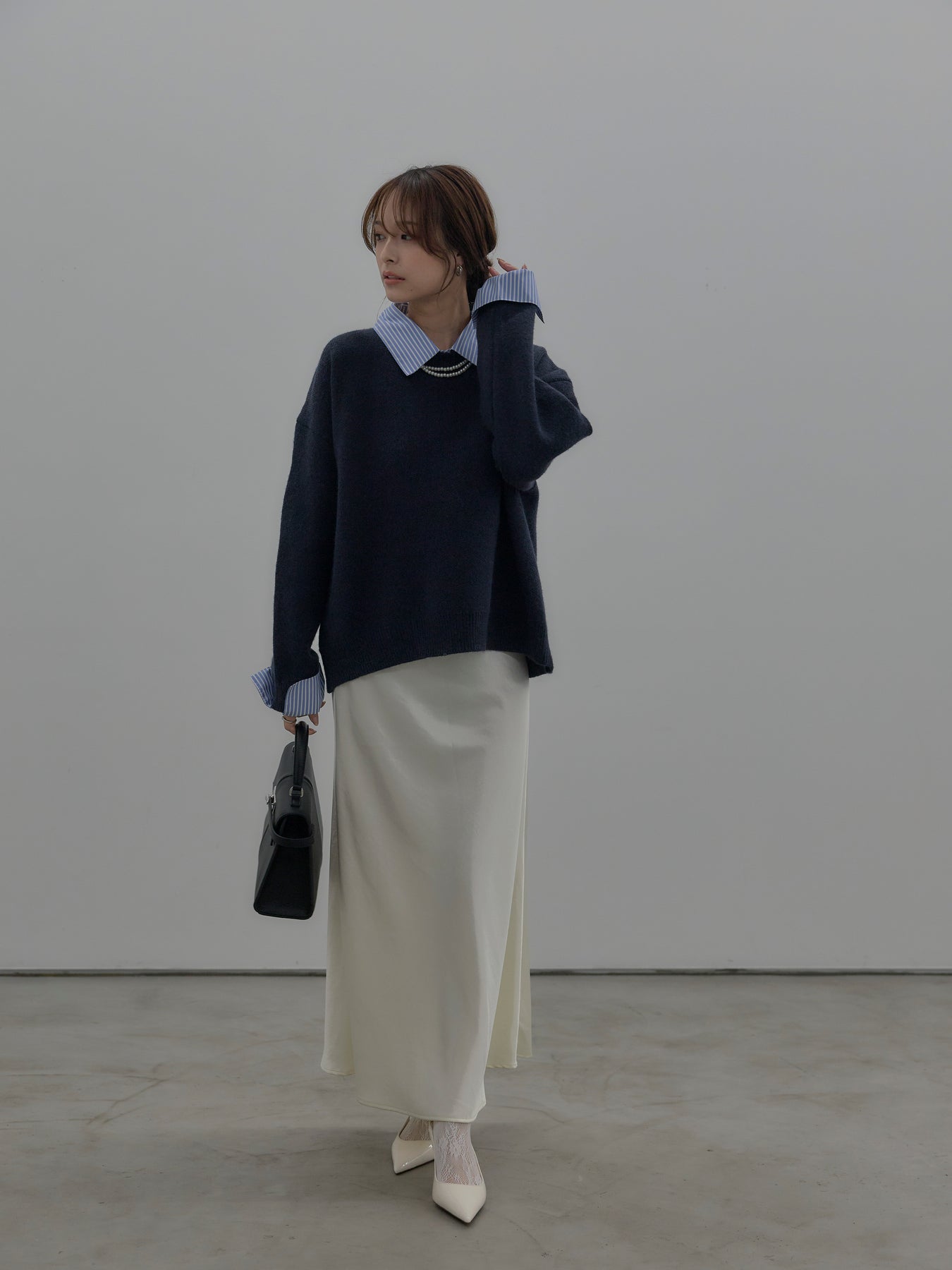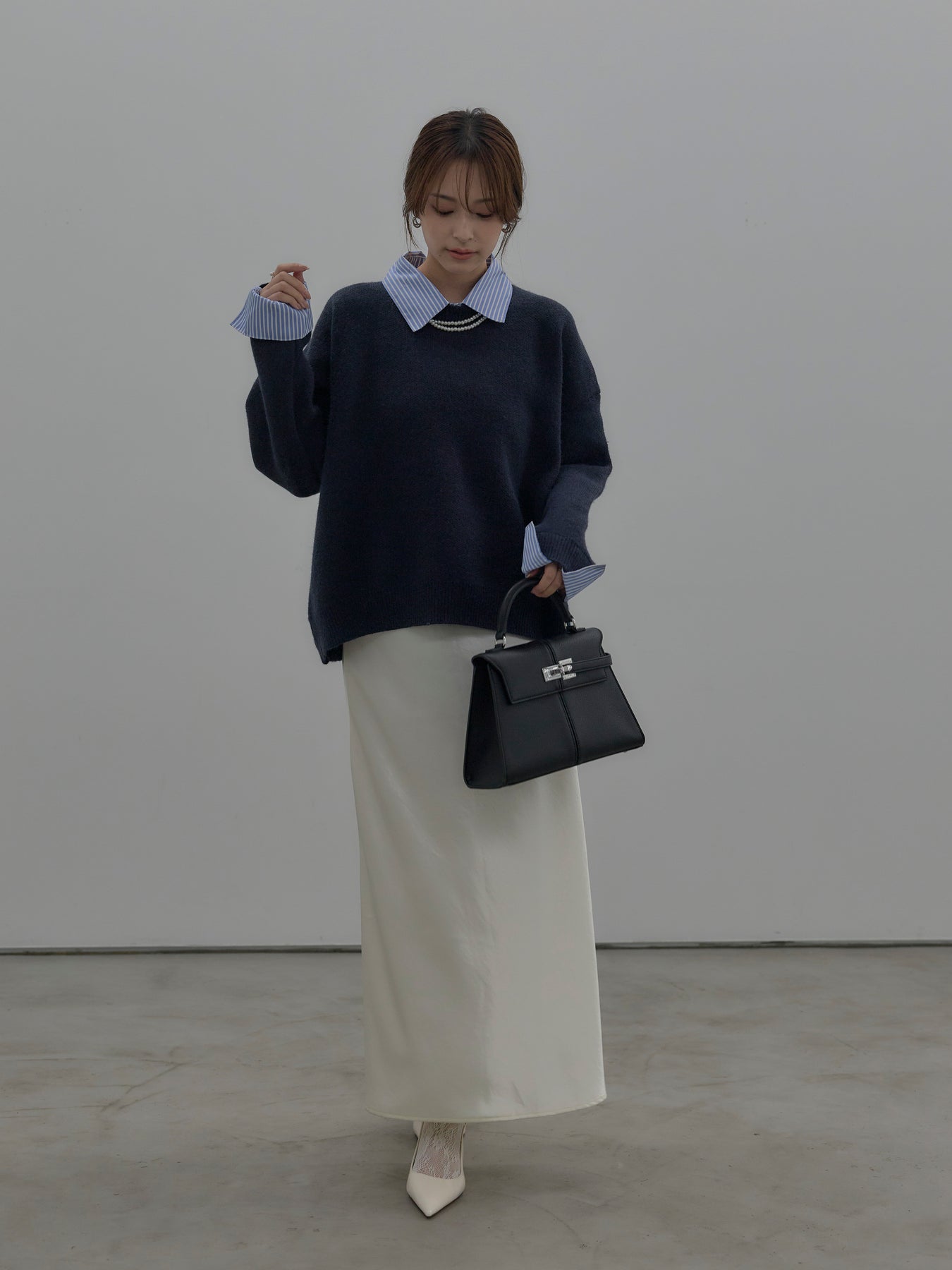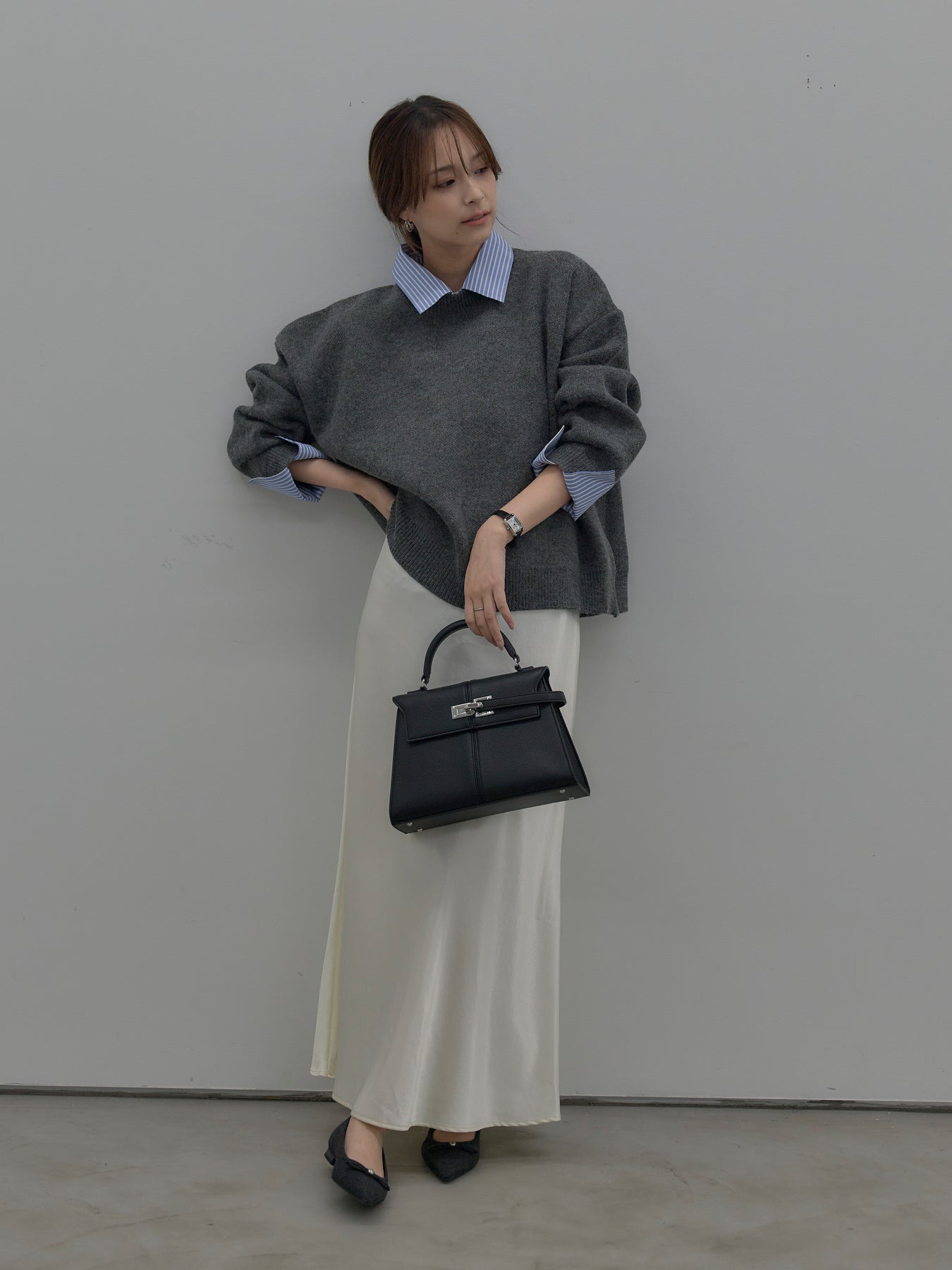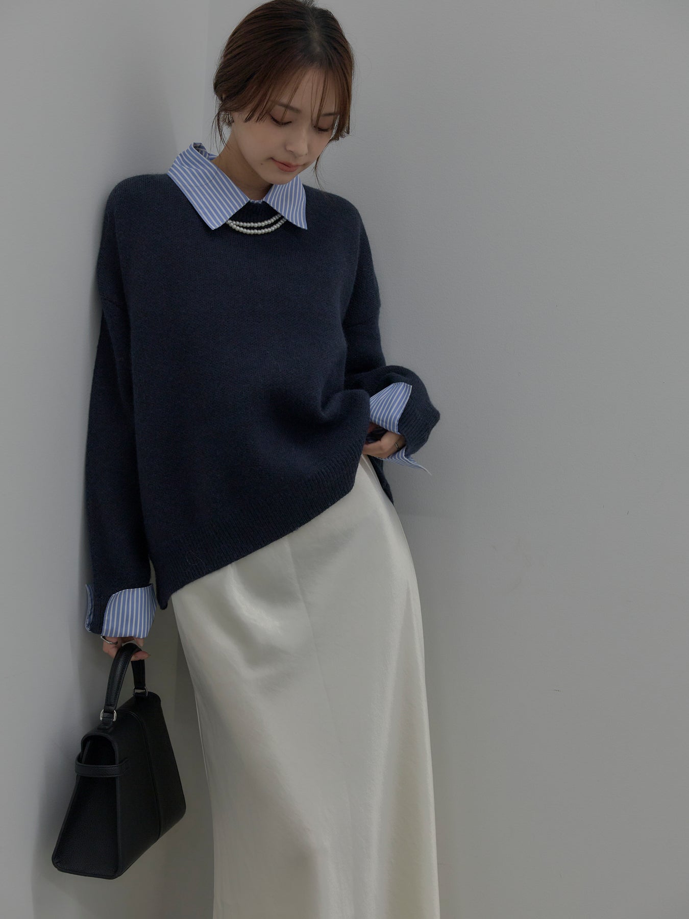 【SET】シャツドッキング肉厚ニットプルオーバー+ナローAラインサテンスカート(2set)