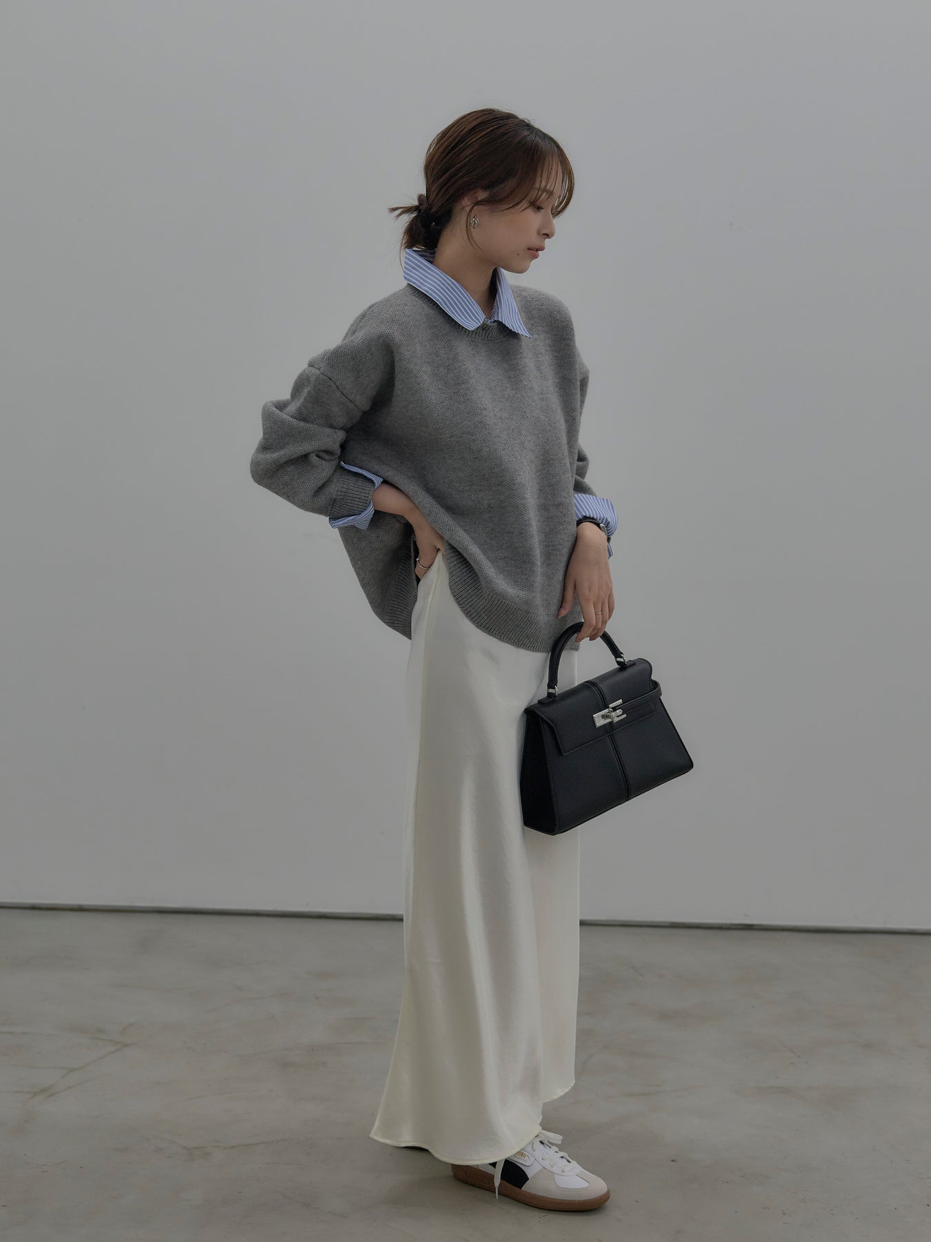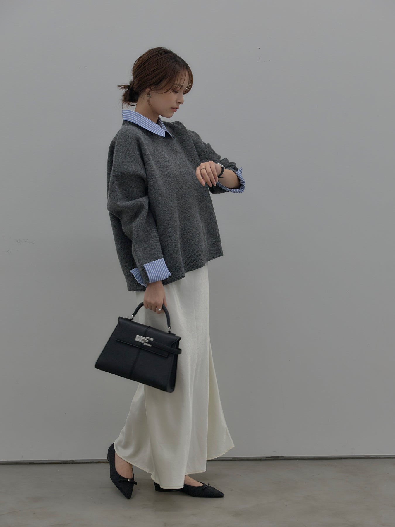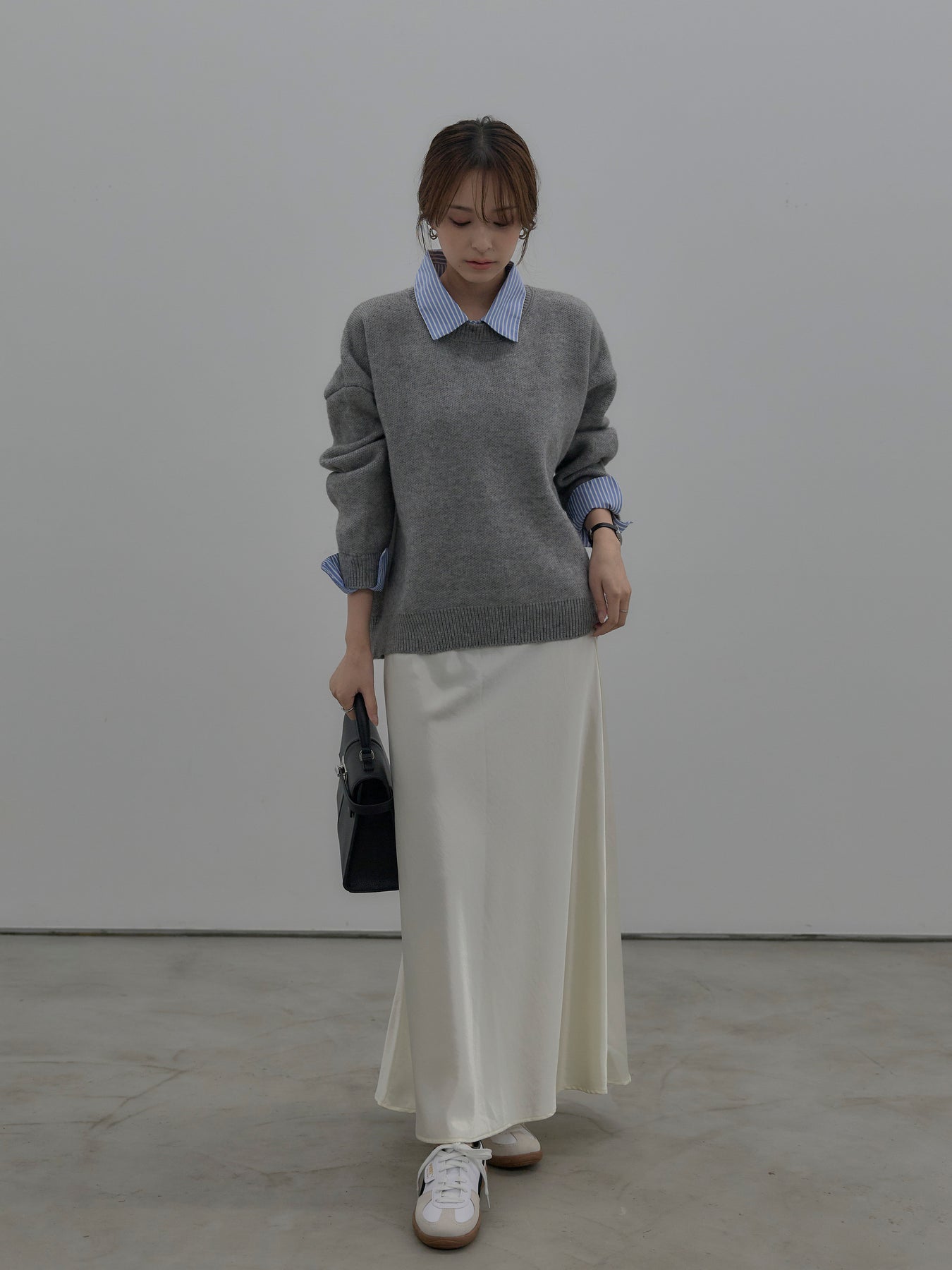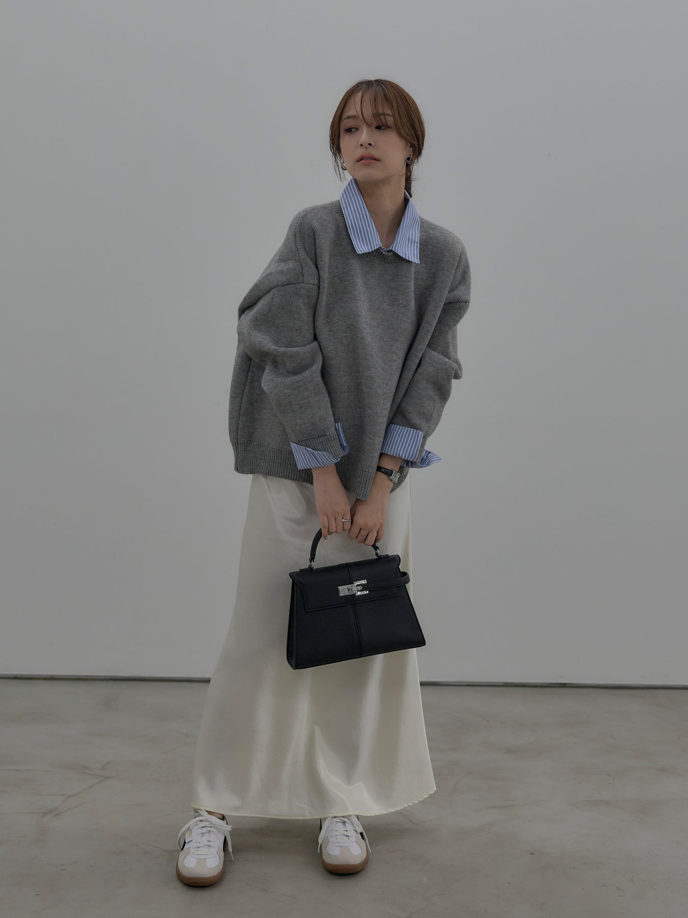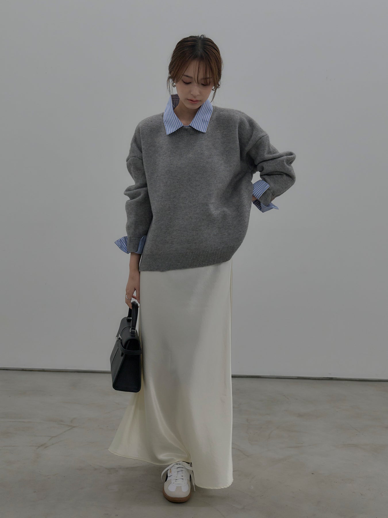【SET】シャツドッキング肉厚ニットプルオーバー+ナローAラインサテンスカート(2set)