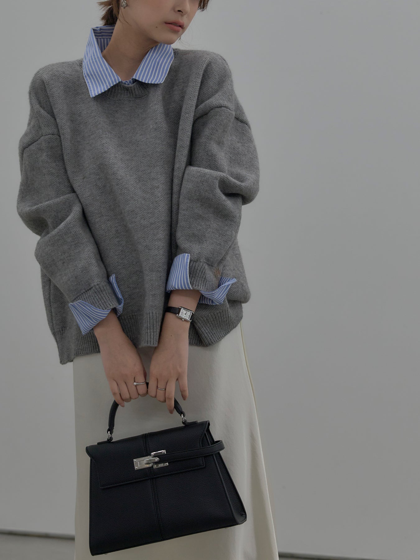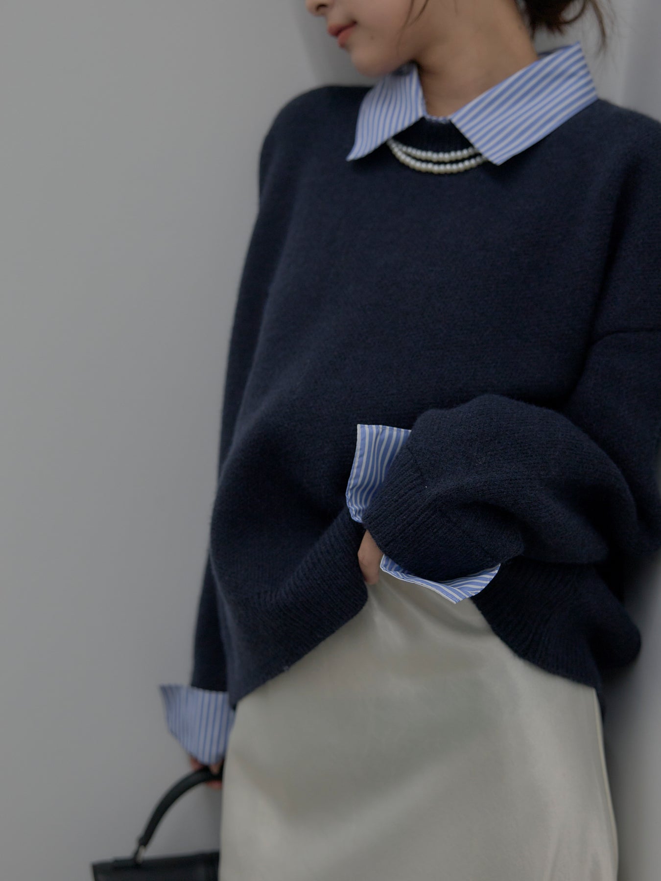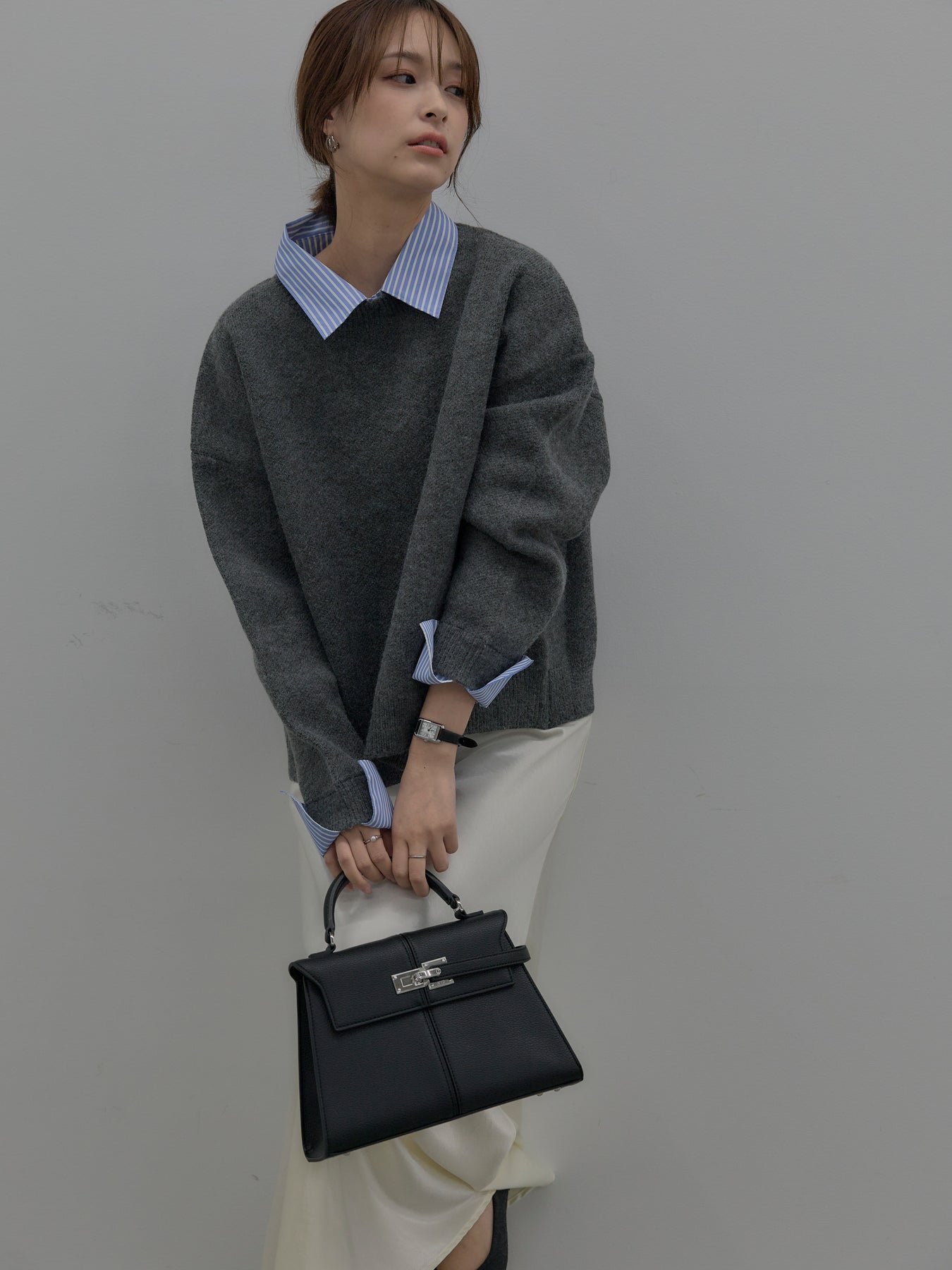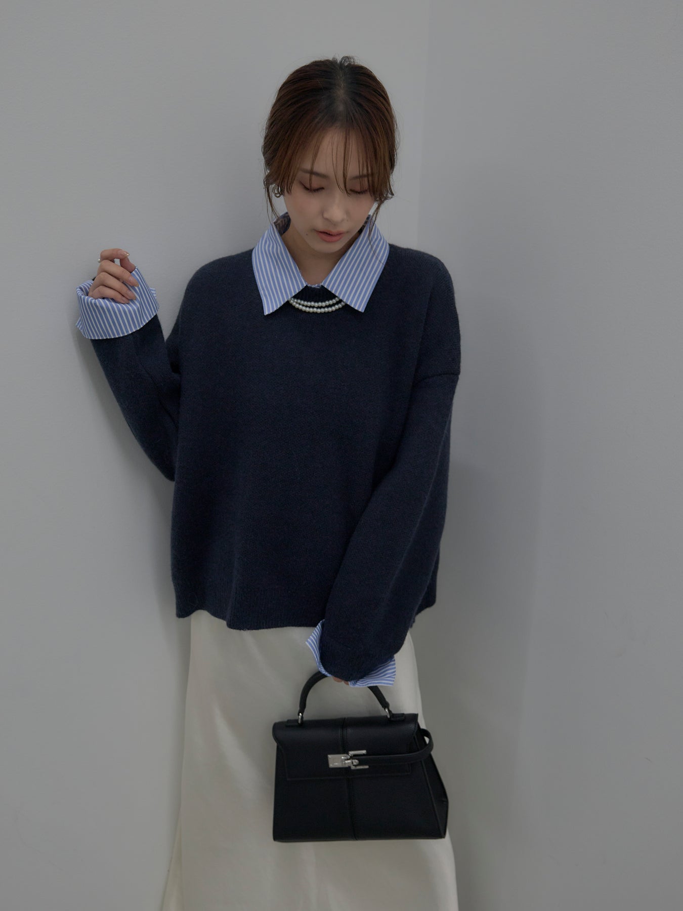 【SET】シャツドッキング肉厚ニットプルオーバー+ナローAラインサテンスカート(2set)