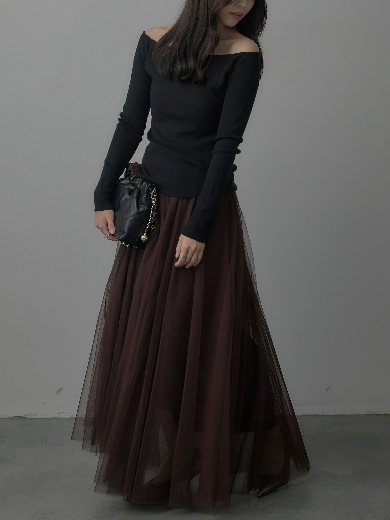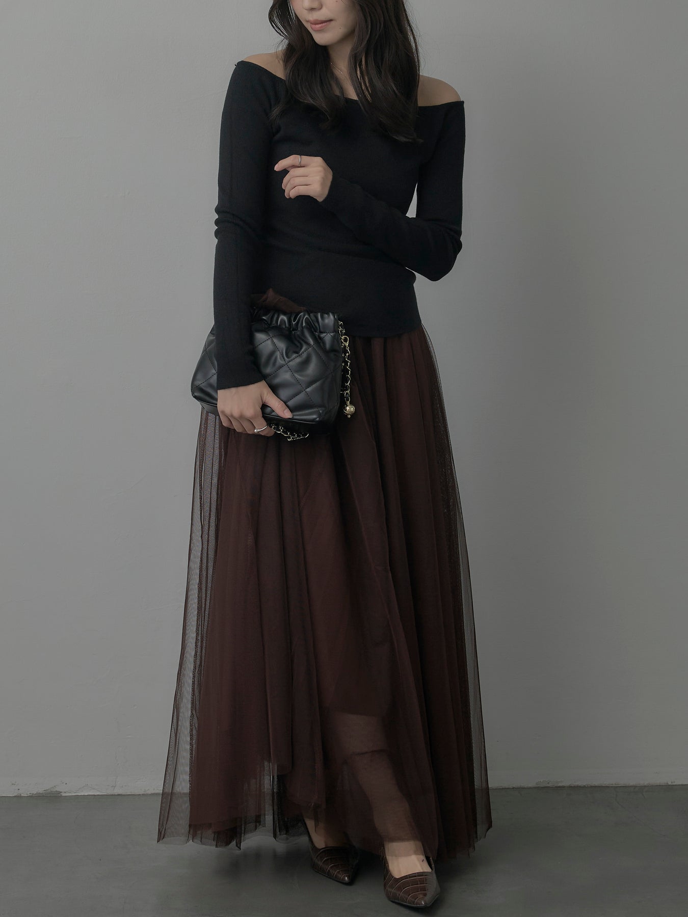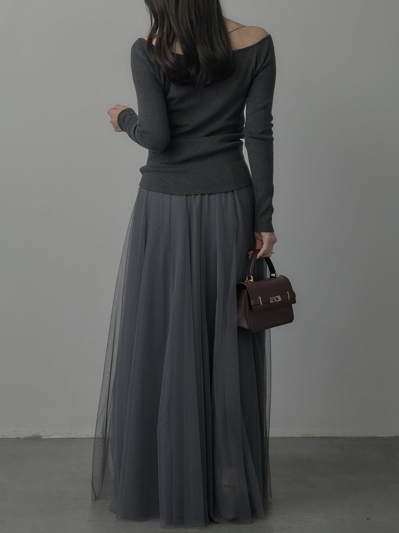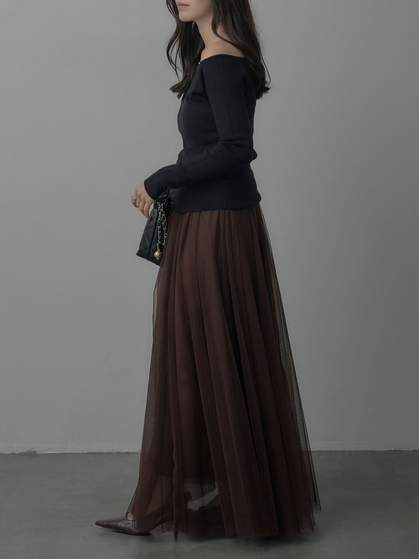 【モデル着用サイズ:M】重ねたチュールでボリュームたっぷりのスカートに仕上げました。振り向く瞬間、ドラマチックな裾の広がりに心躍ること間違いなし。オールシーズン使えてどんなアイテムとも好相性です。