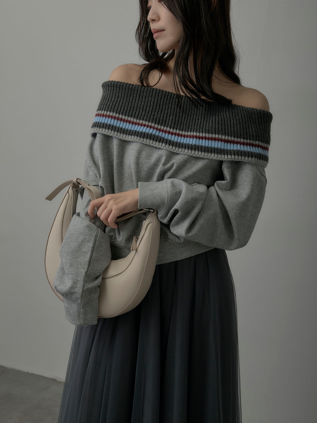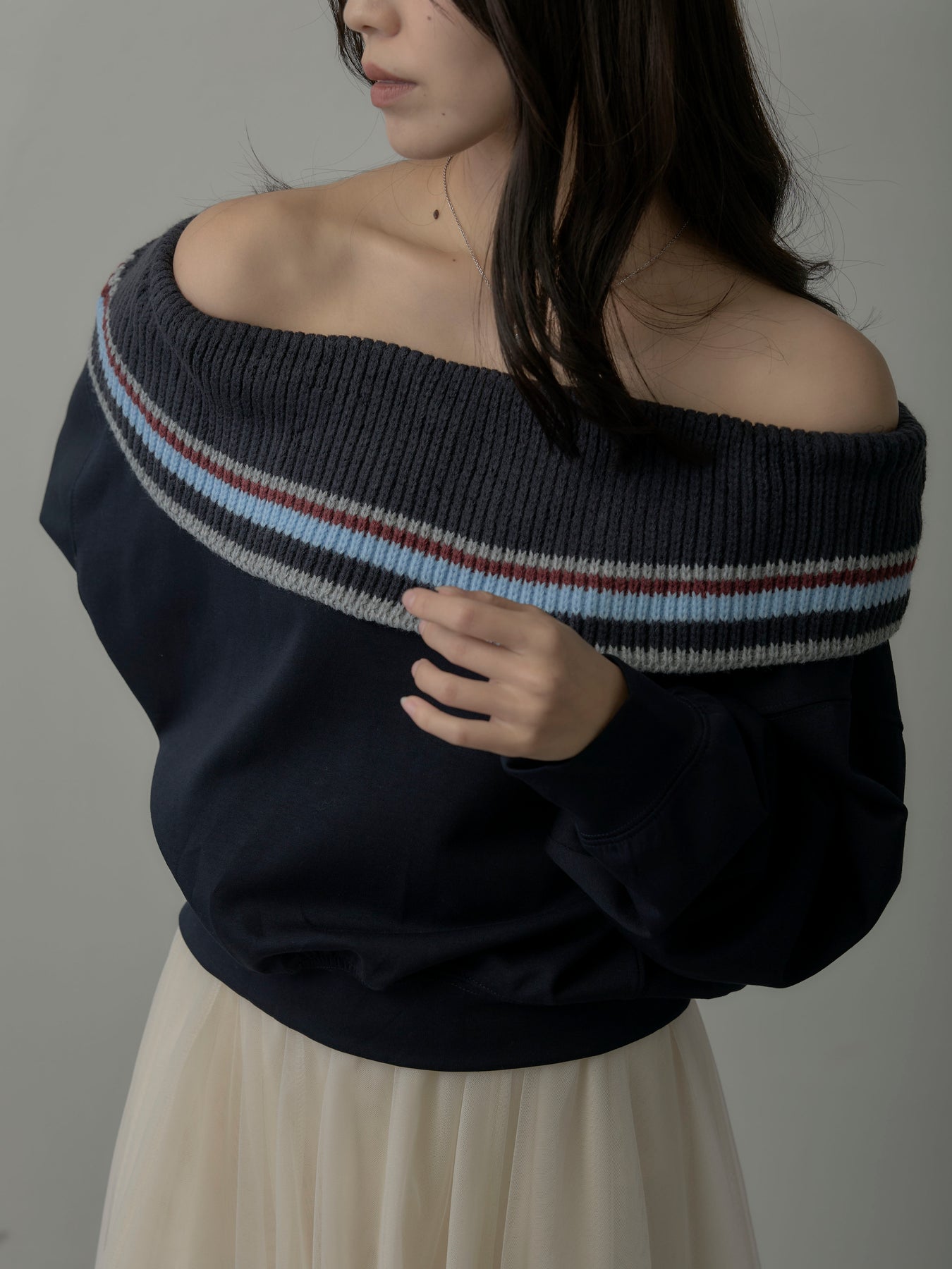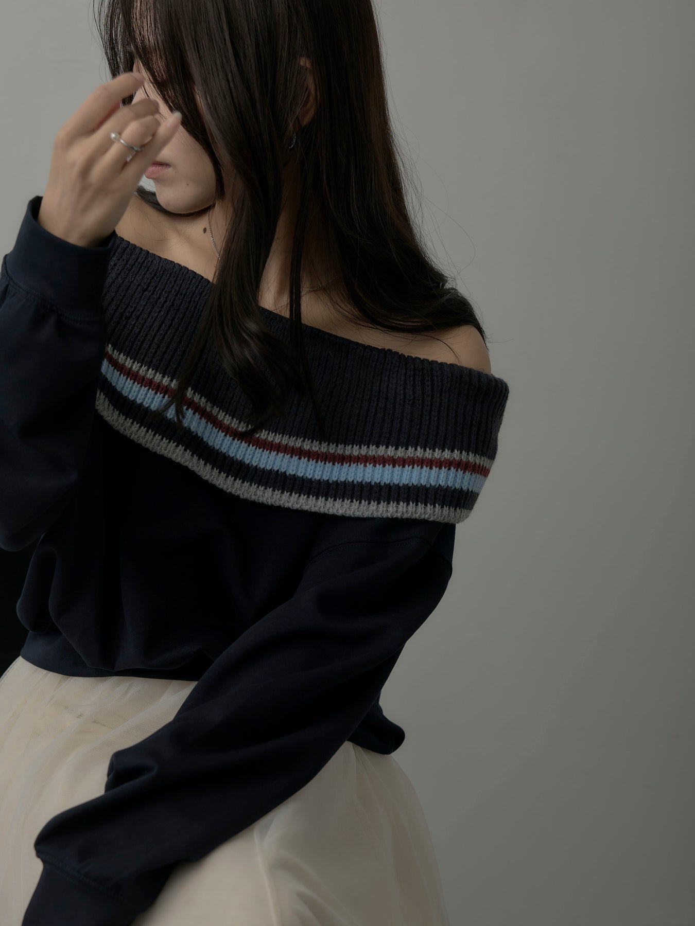 リブ部分に配色ボーダーをあしらったオフショルダースウェット。肩を落とした抜け感のあるデザインが、リラックスムードの中に華やかさをプラス。柔らかな素材で着心地も良く、デイリーコーデに旬なアクセントを添える一枚。