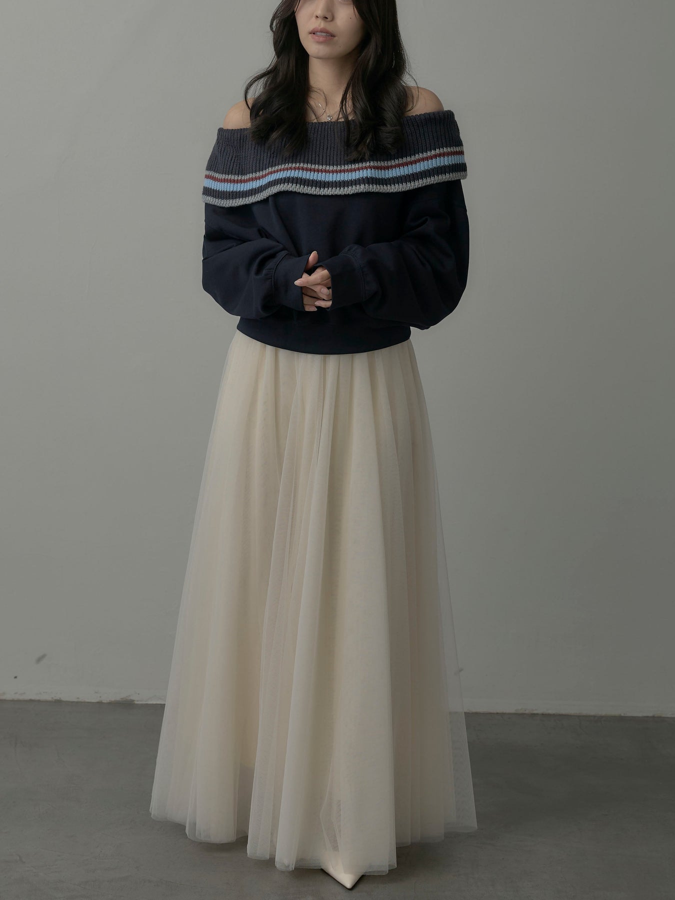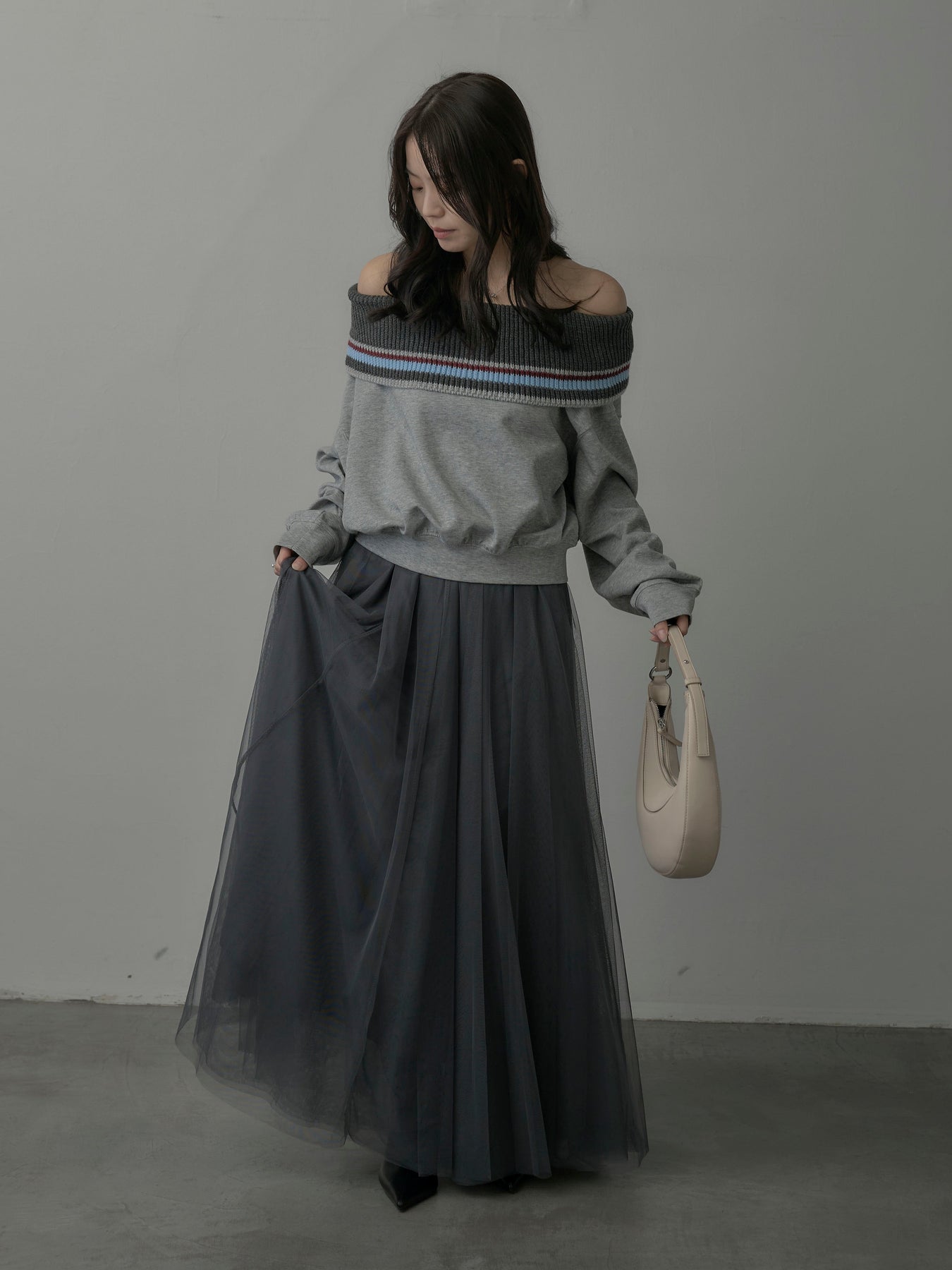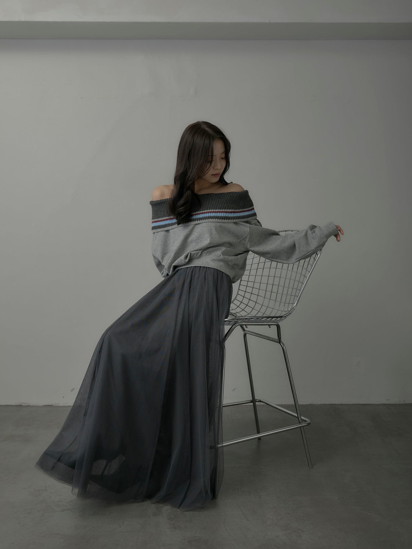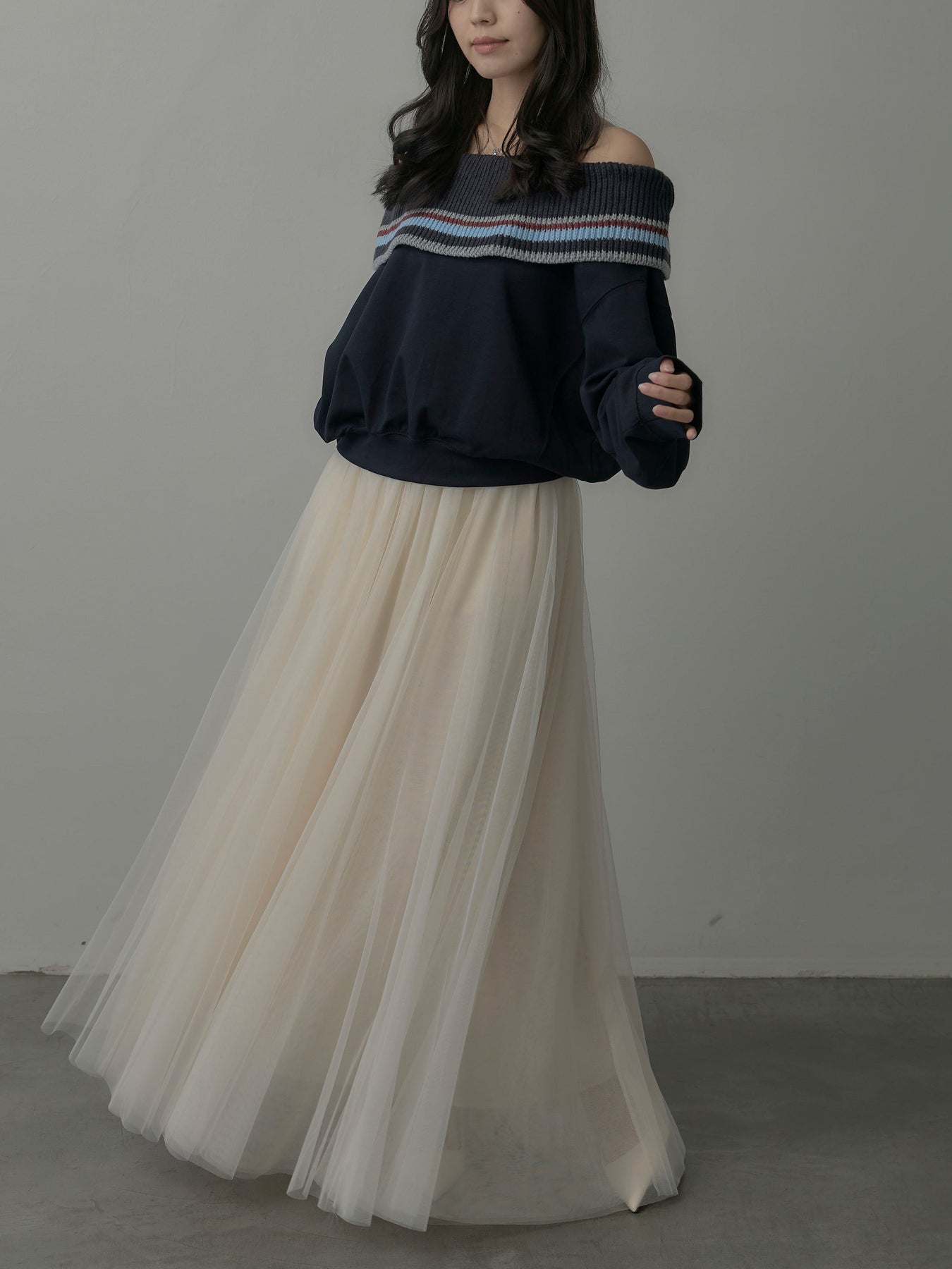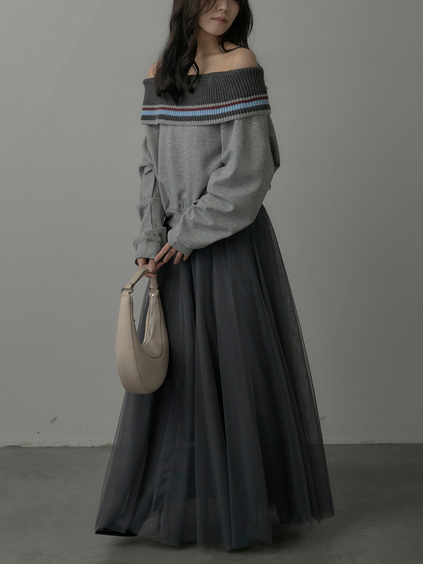 【SET】配色ボーダースウェットオフショルトップス+ボリュームチュールスカート(2set)