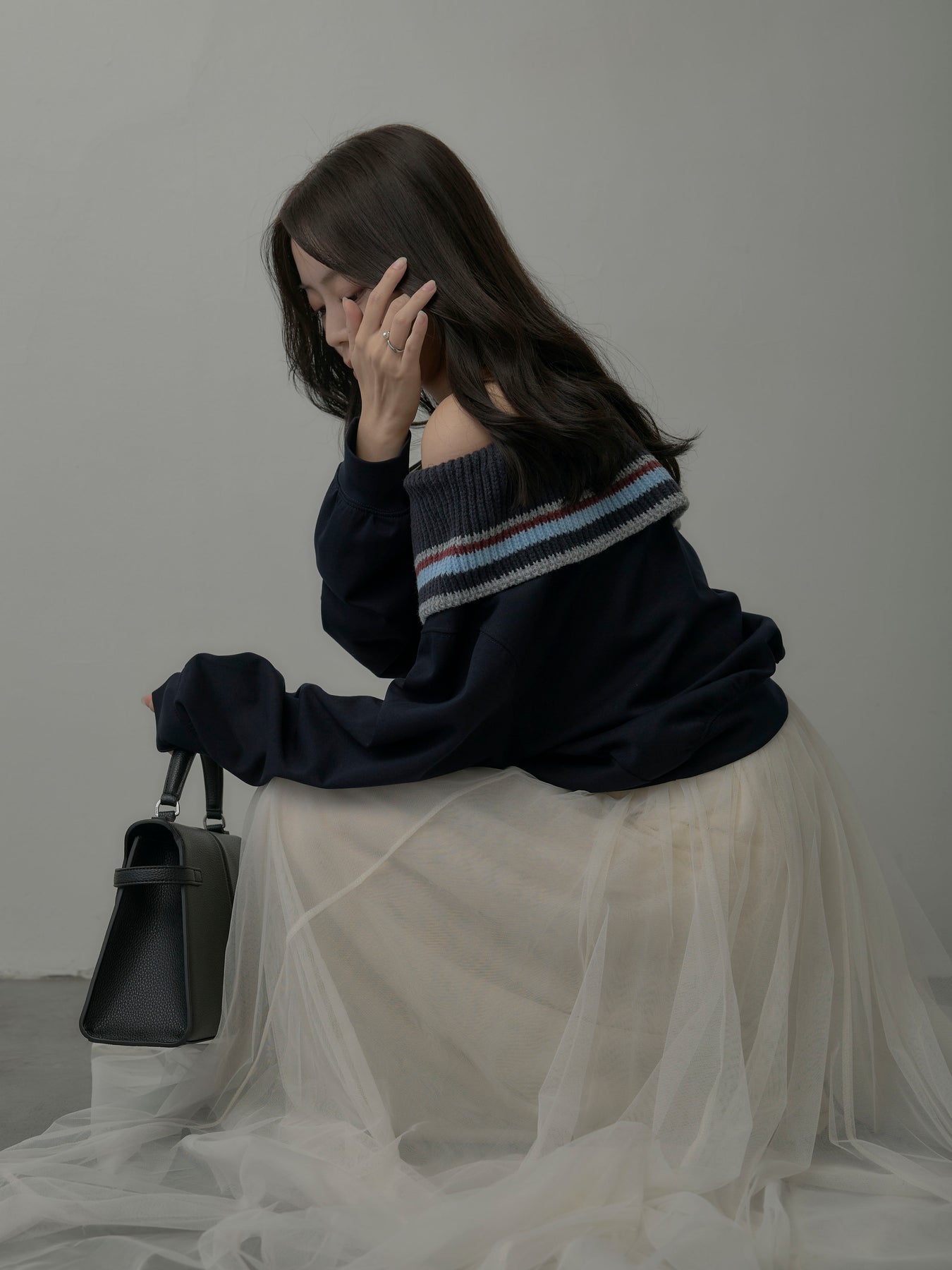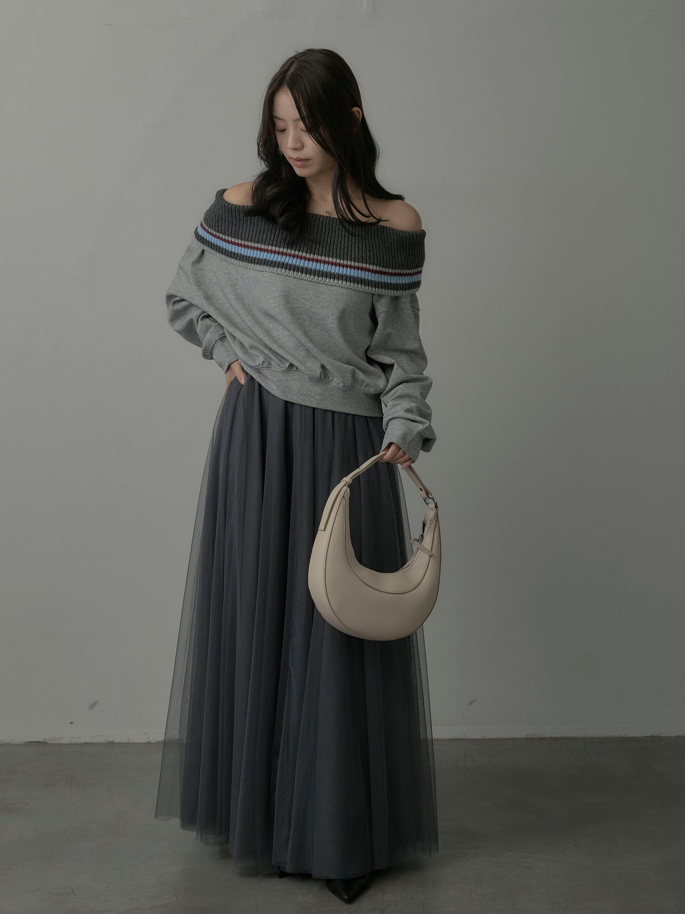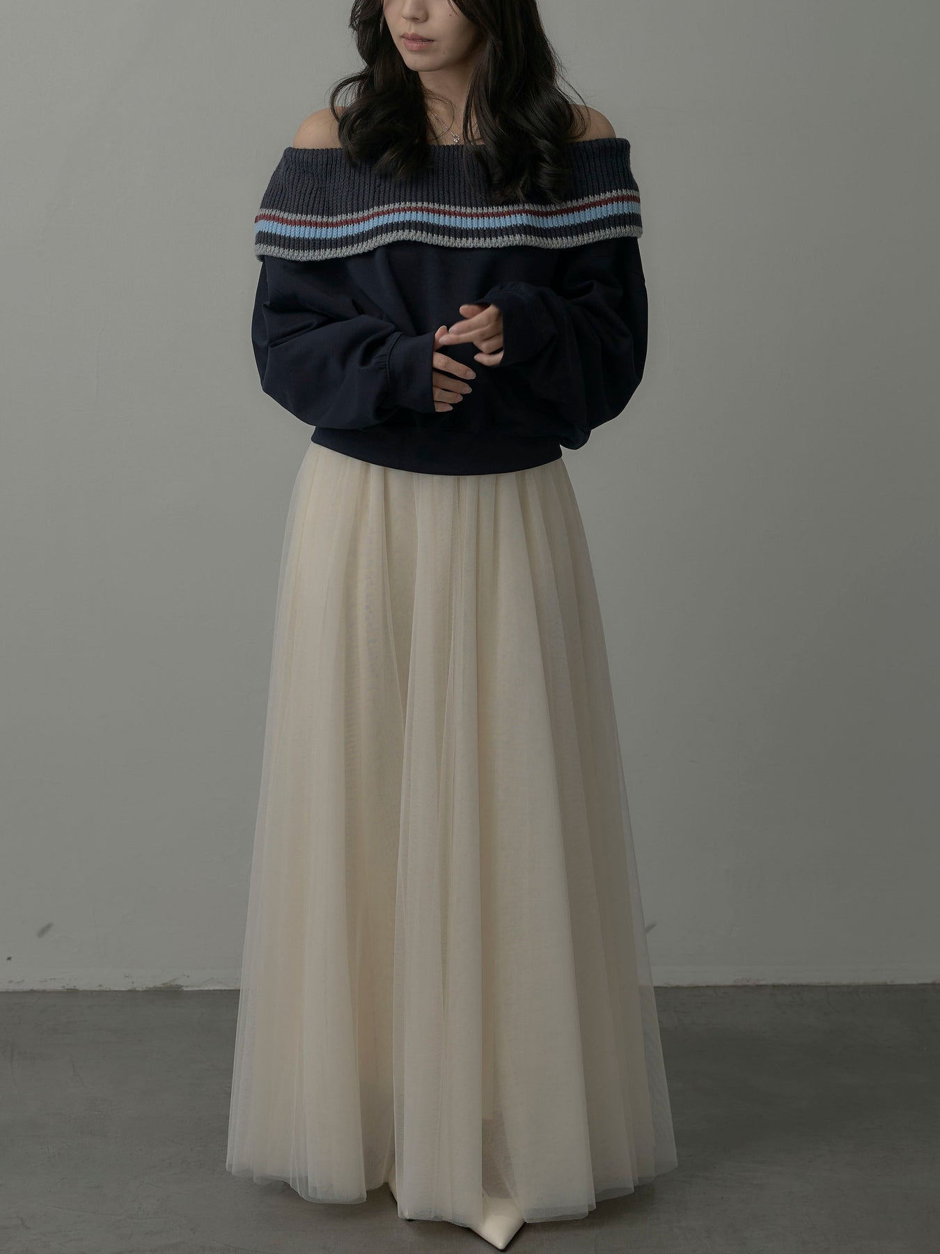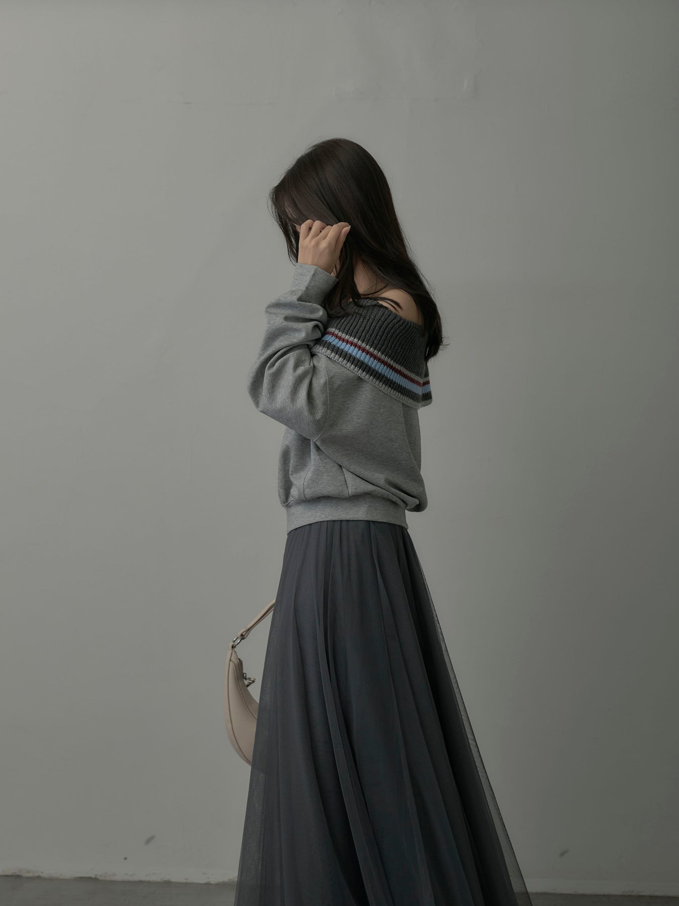 【SET】配色ボーダースウェットオフショルトップス+ボリュームチュールスカート(2set)