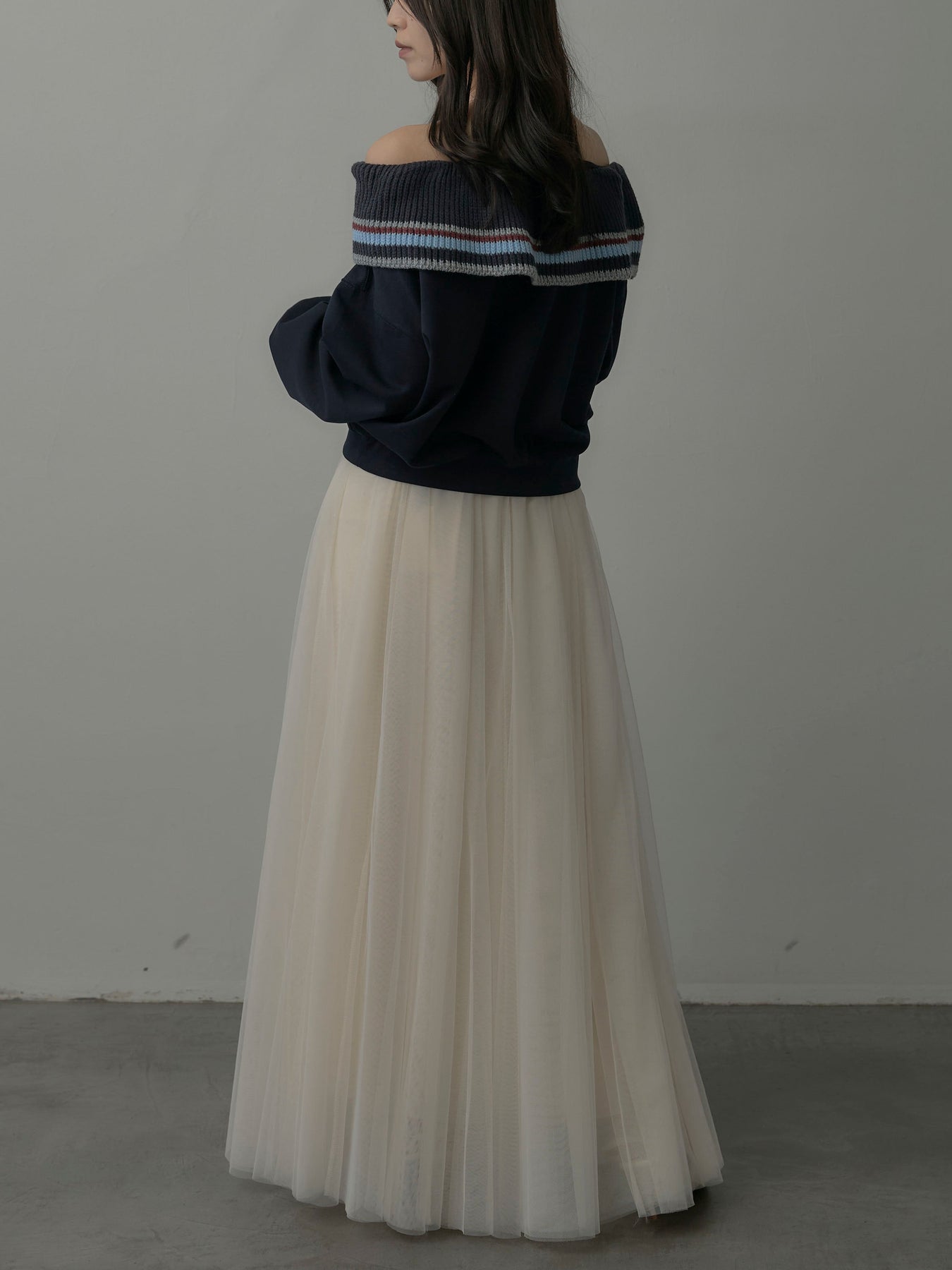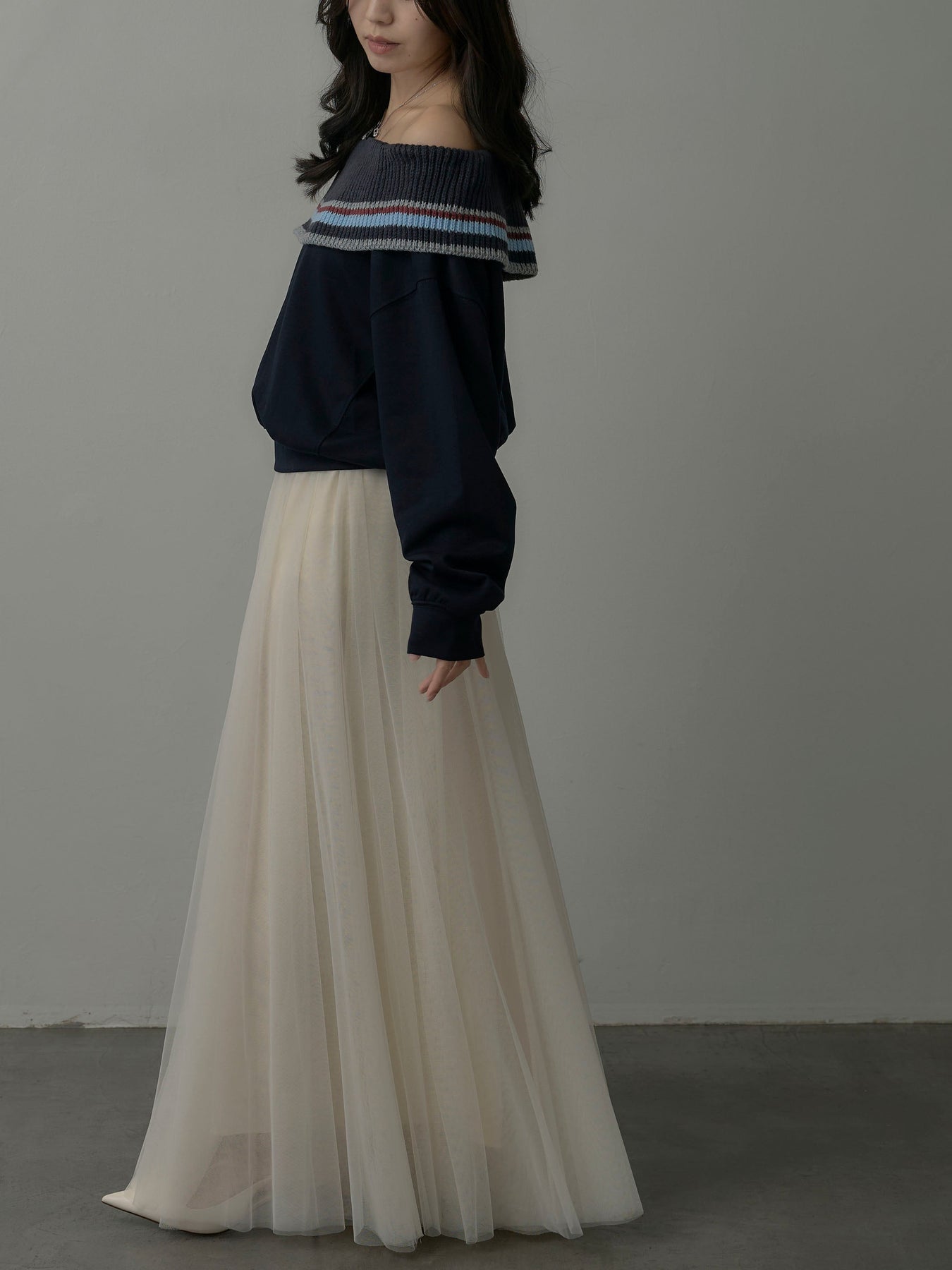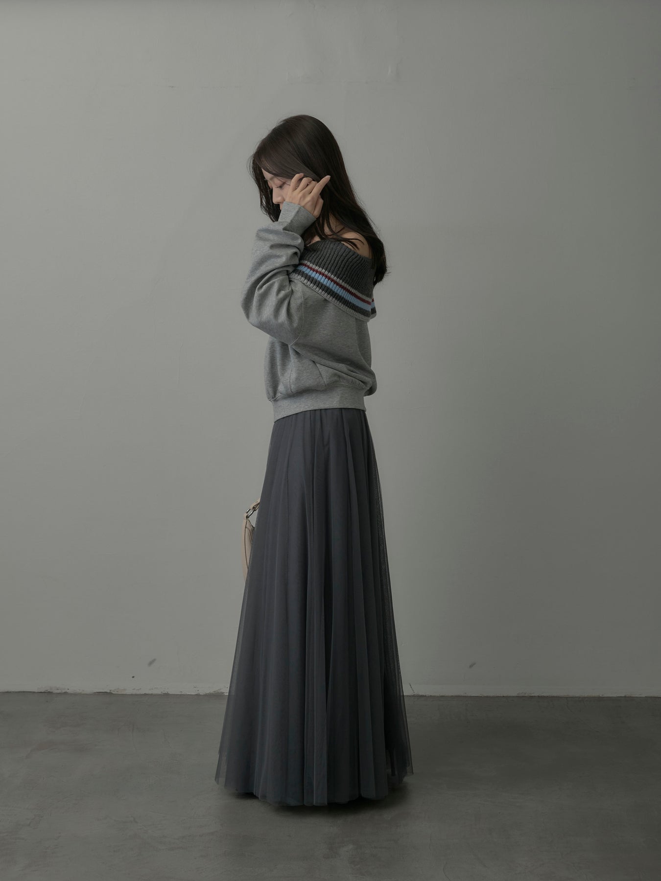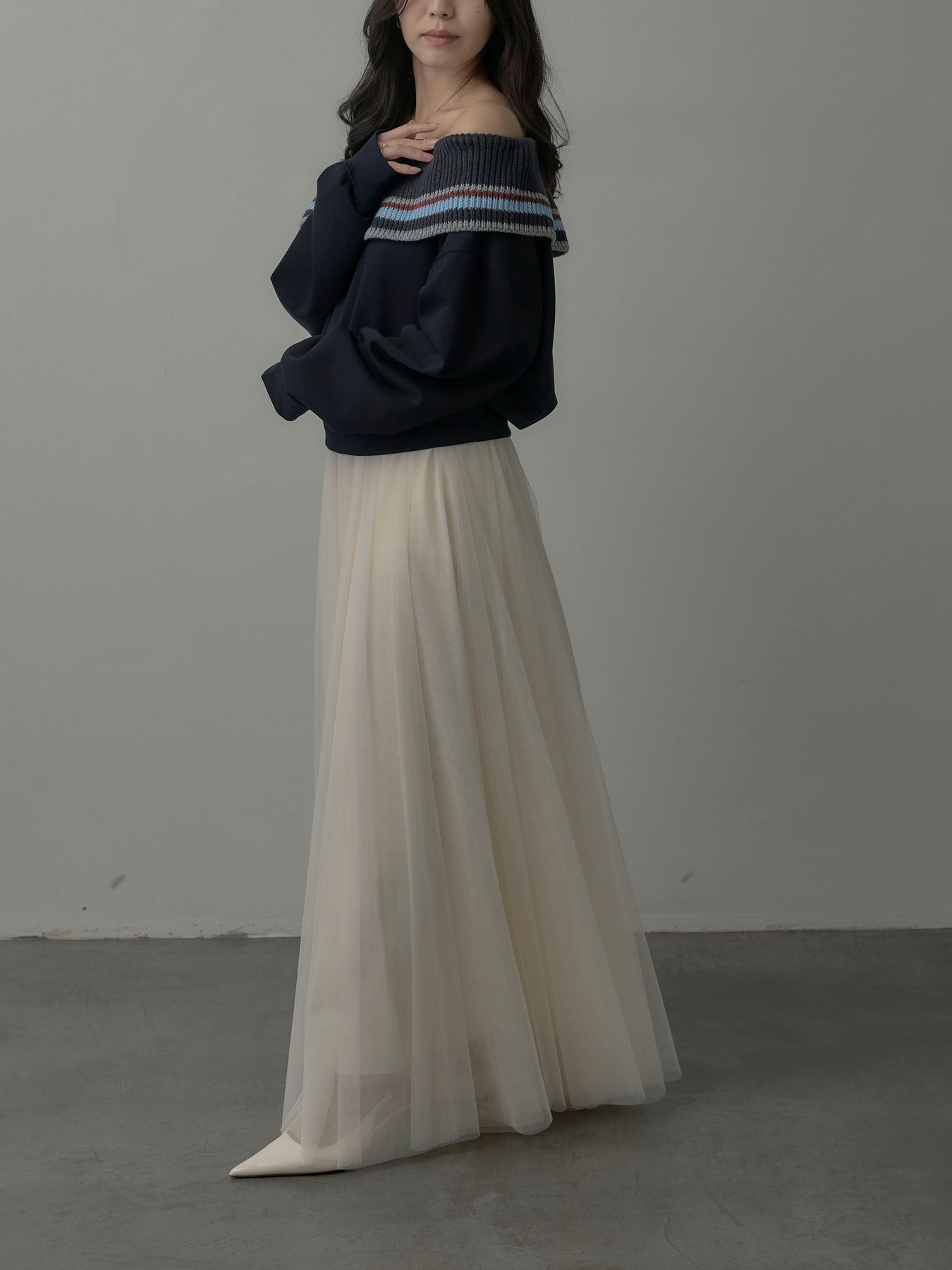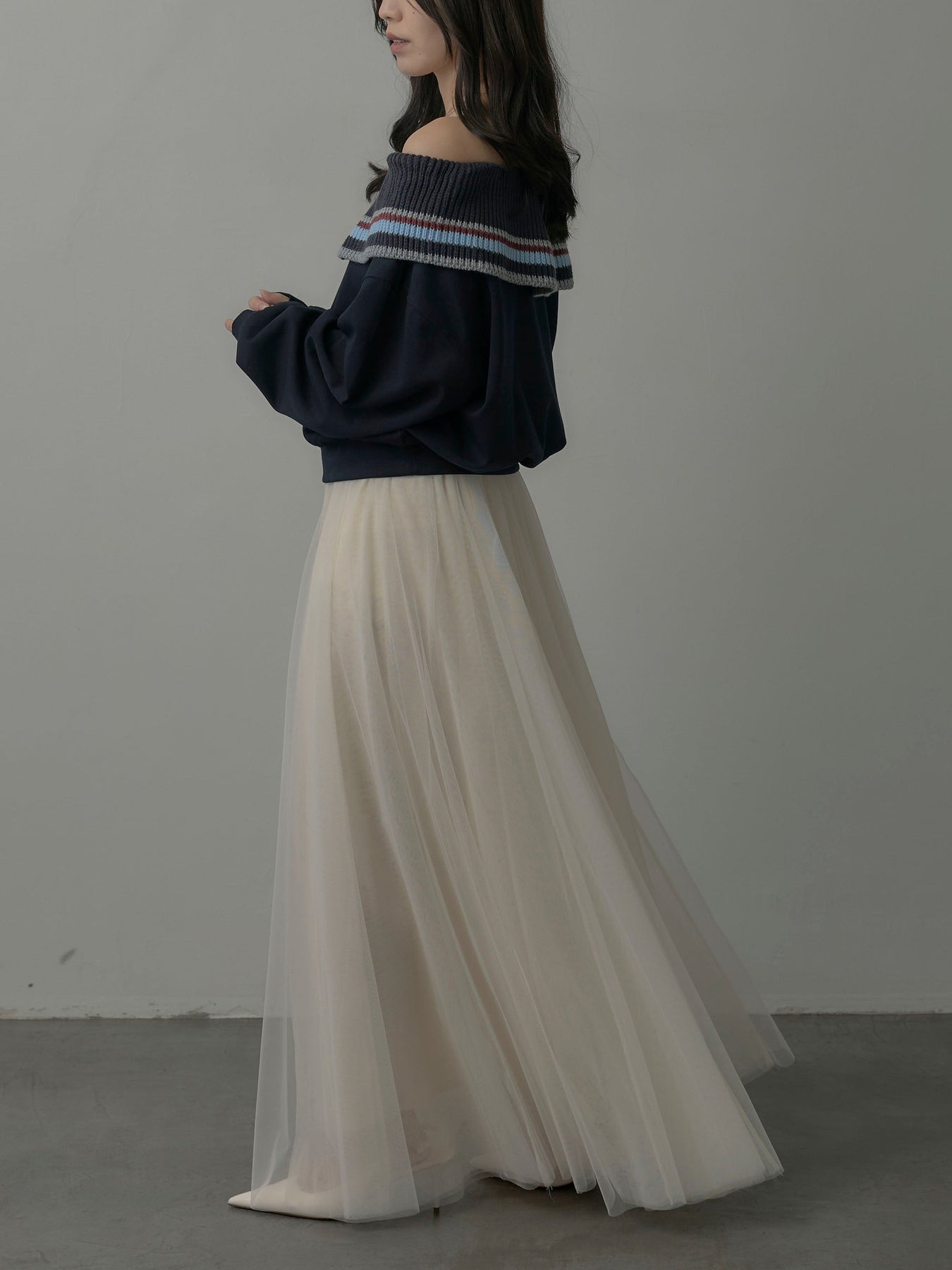 【SET】配色ボーダースウェットオフショルトップス+ボリュームチュールスカート(2set)