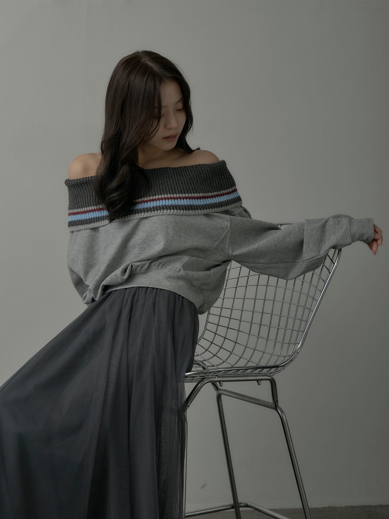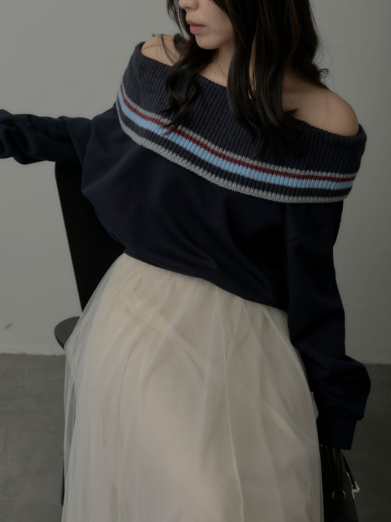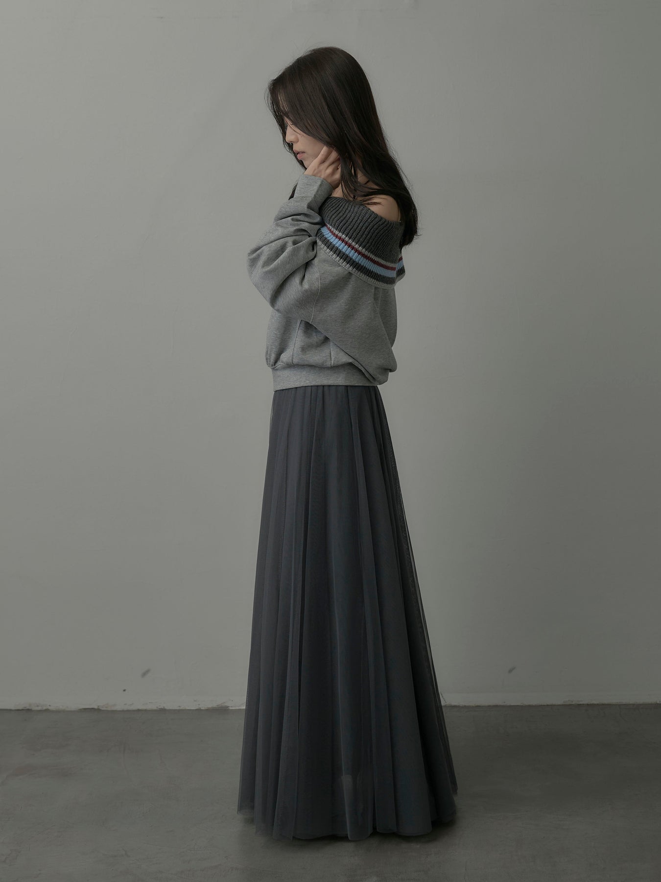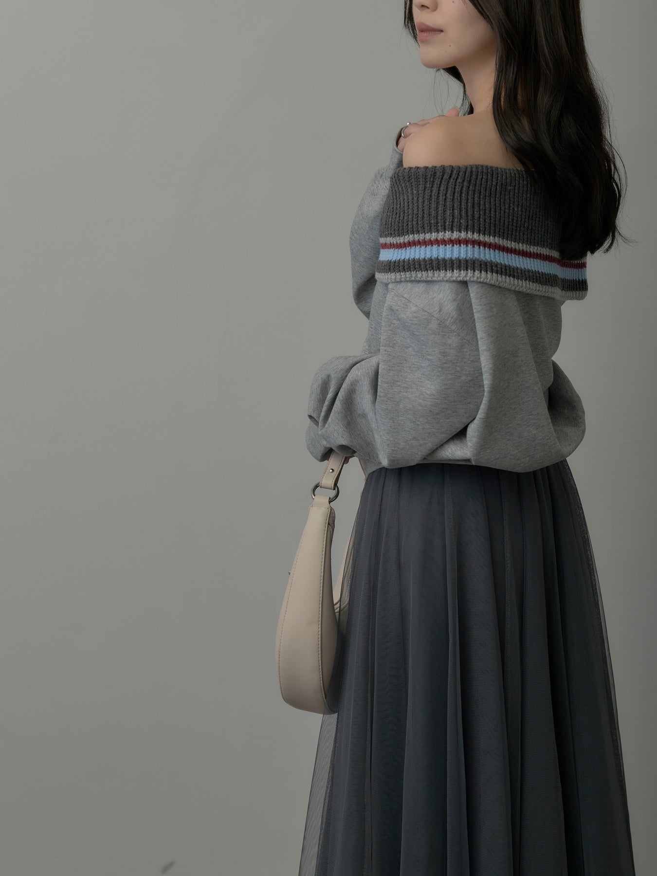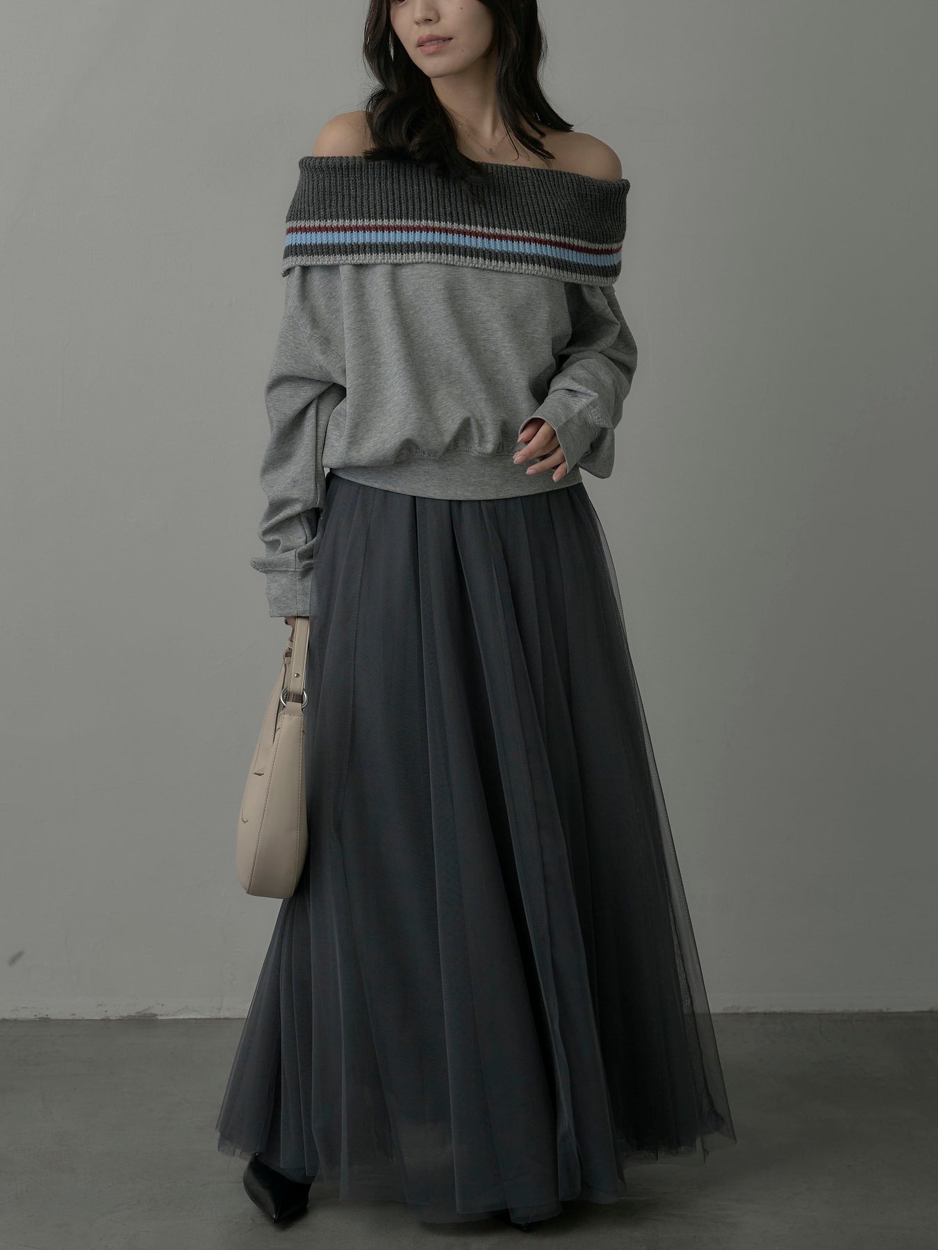 【SET】配色ボーダースウェットオフショルトップス+ボリュームチュールスカート(2set)