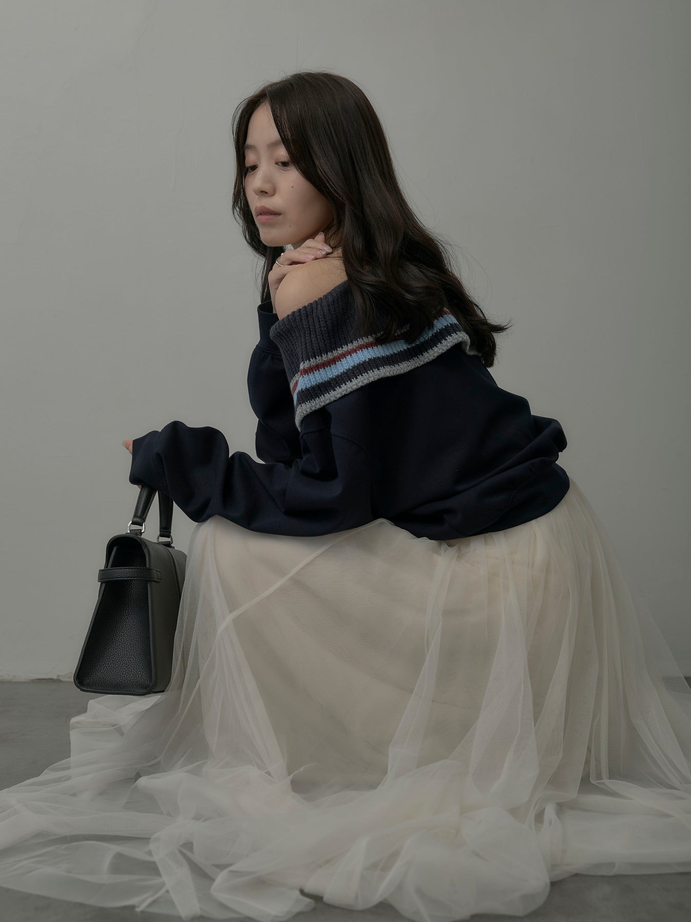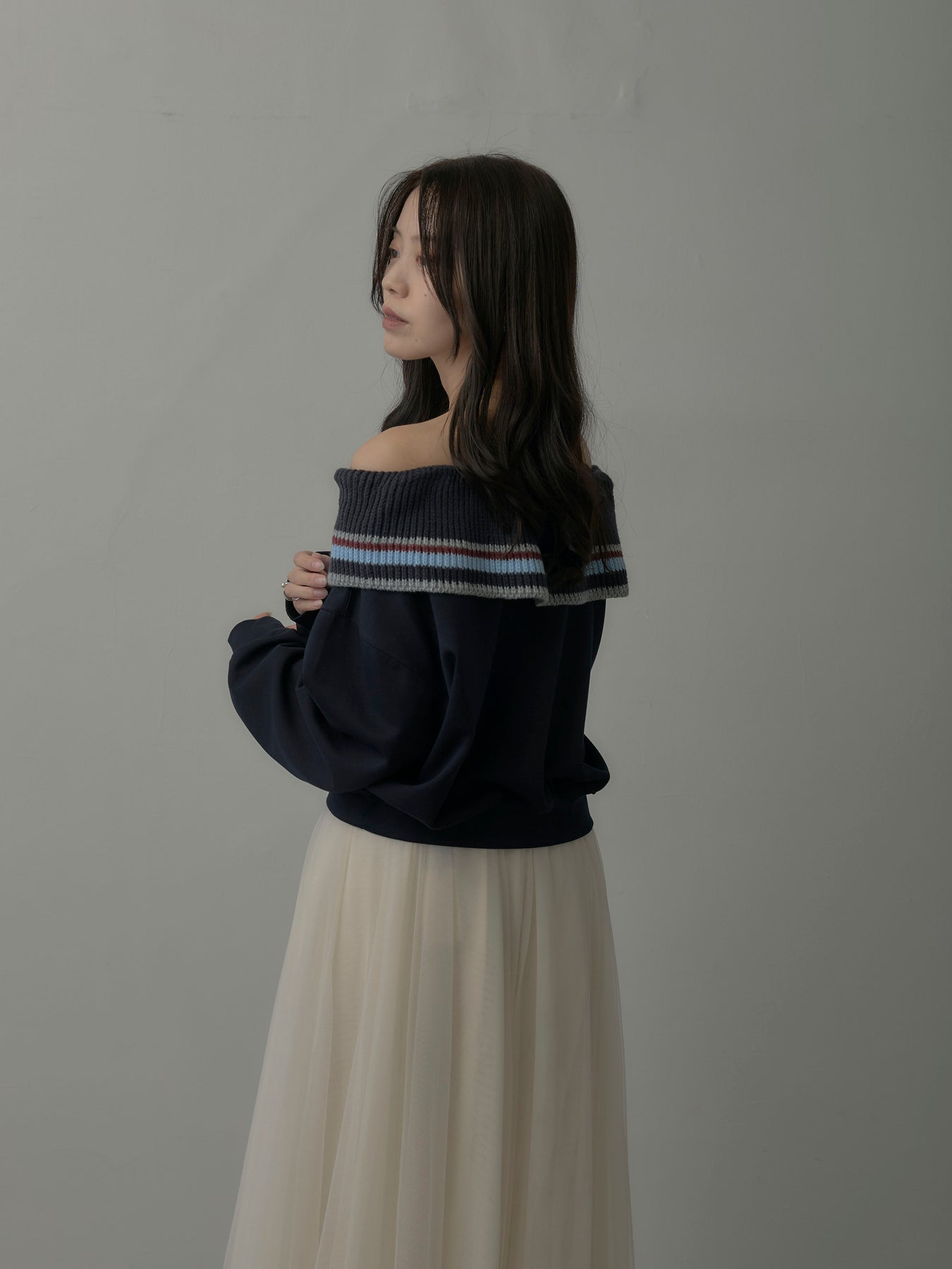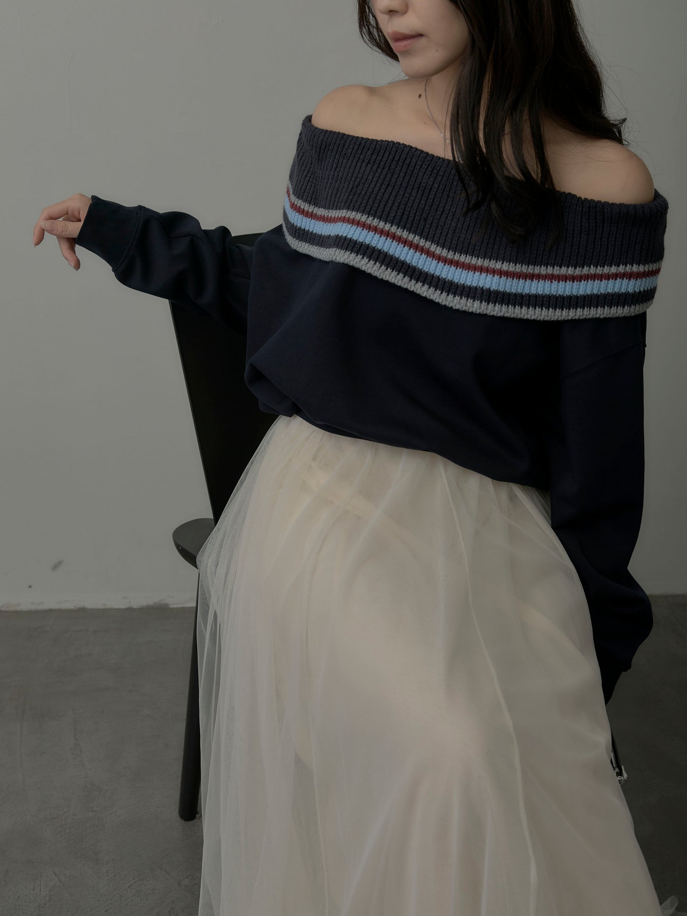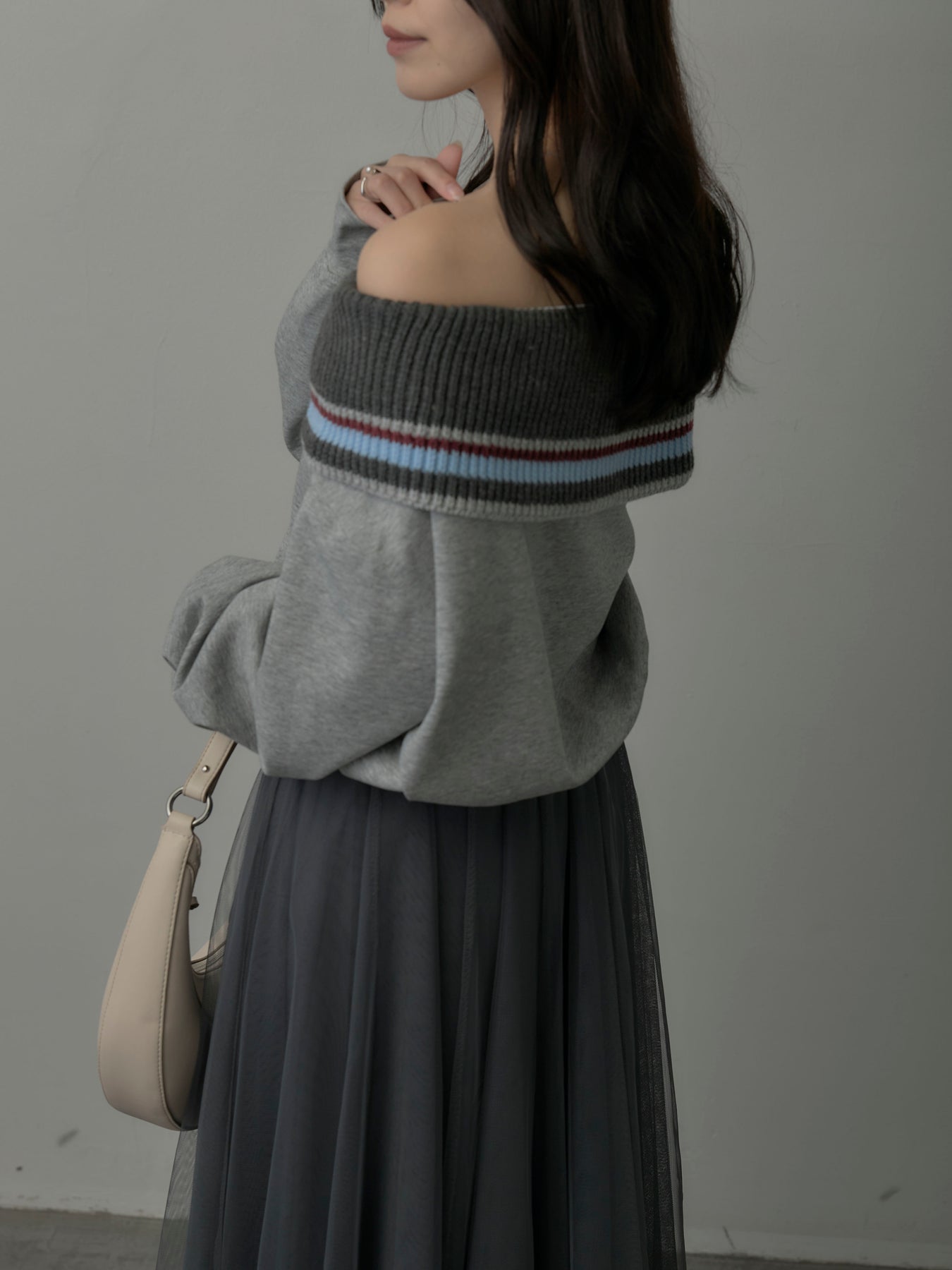 【SET】配色ボーダースウェットオフショルトップス+ボリュームチュールスカート(2set)