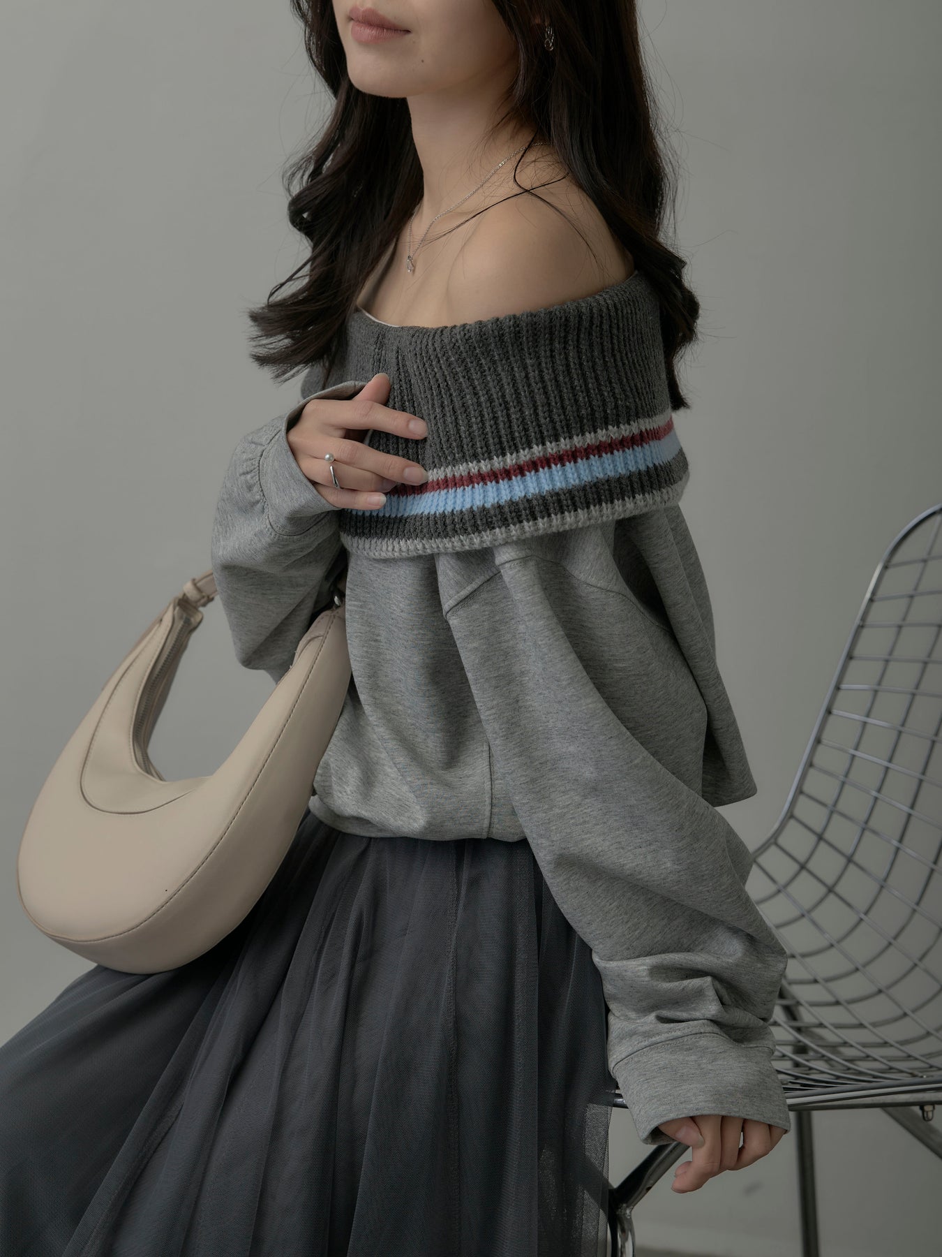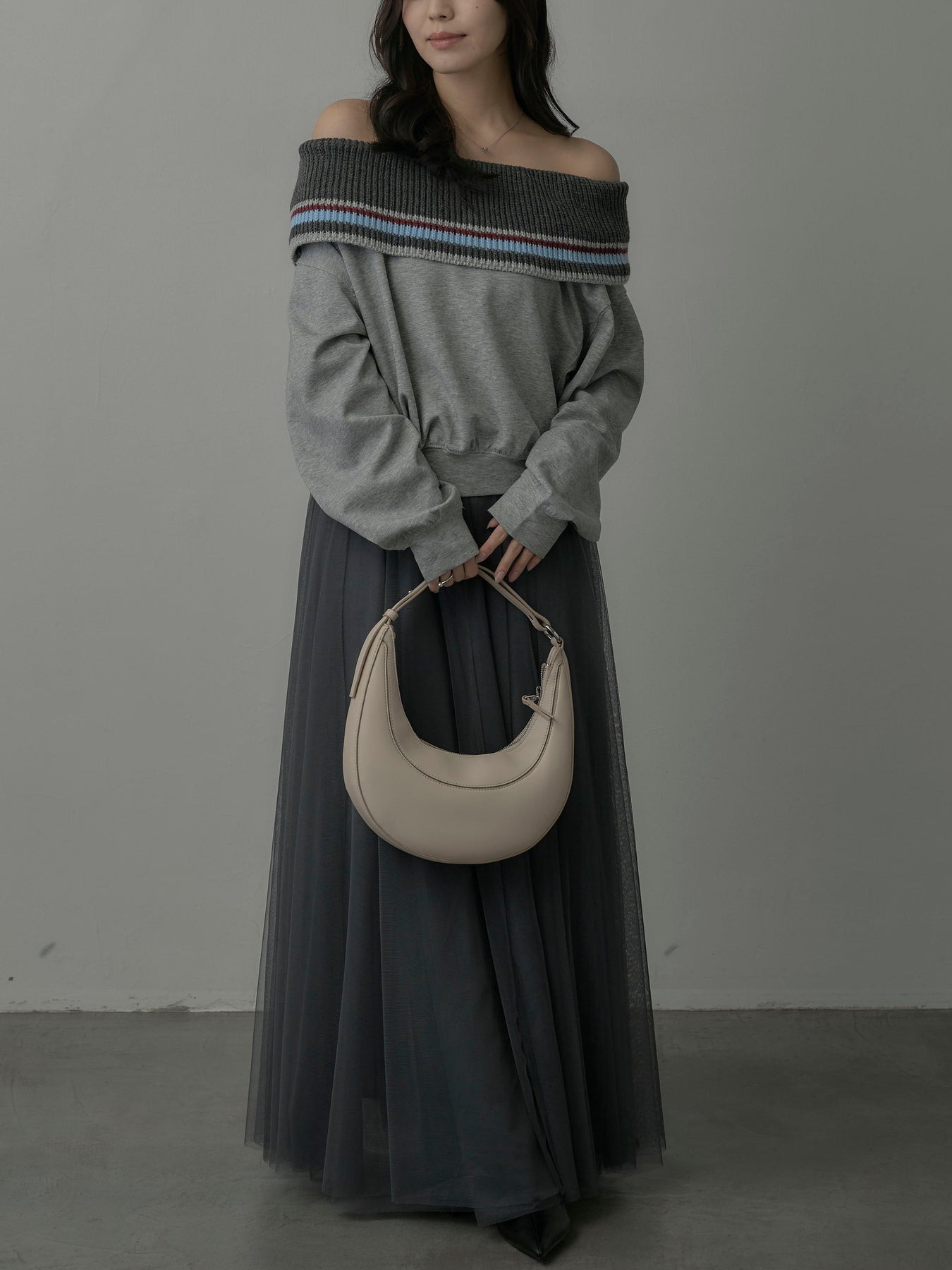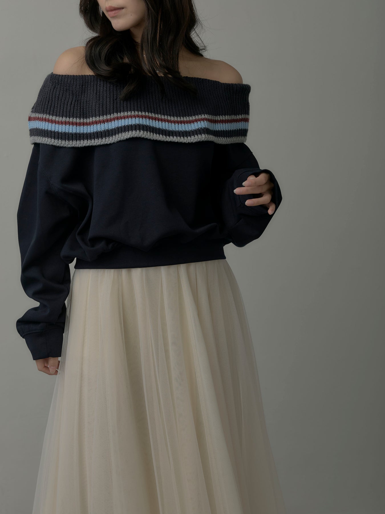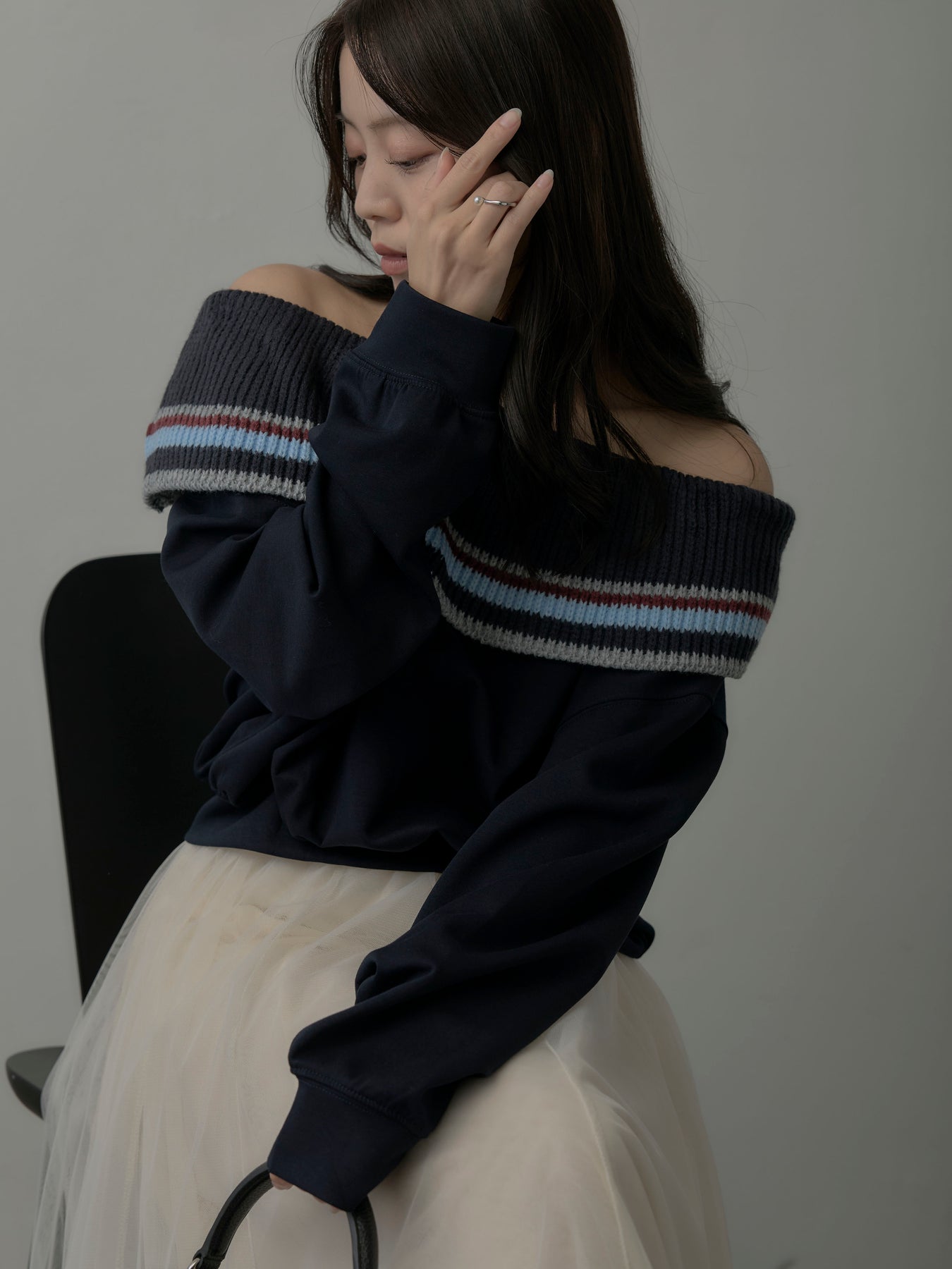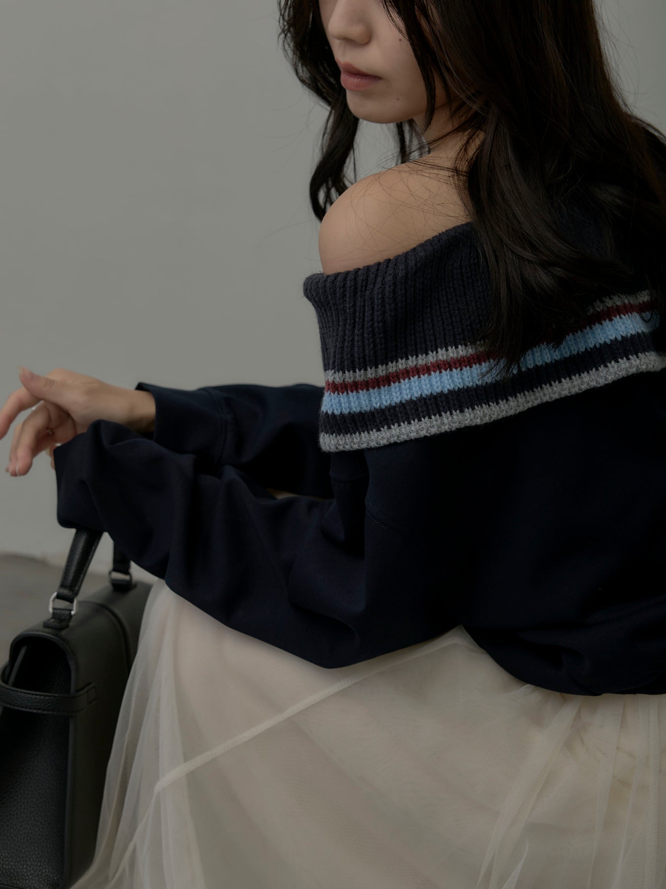 【SET】配色ボーダースウェットオフショルトップス+ボリュームチュールスカート(2set)
