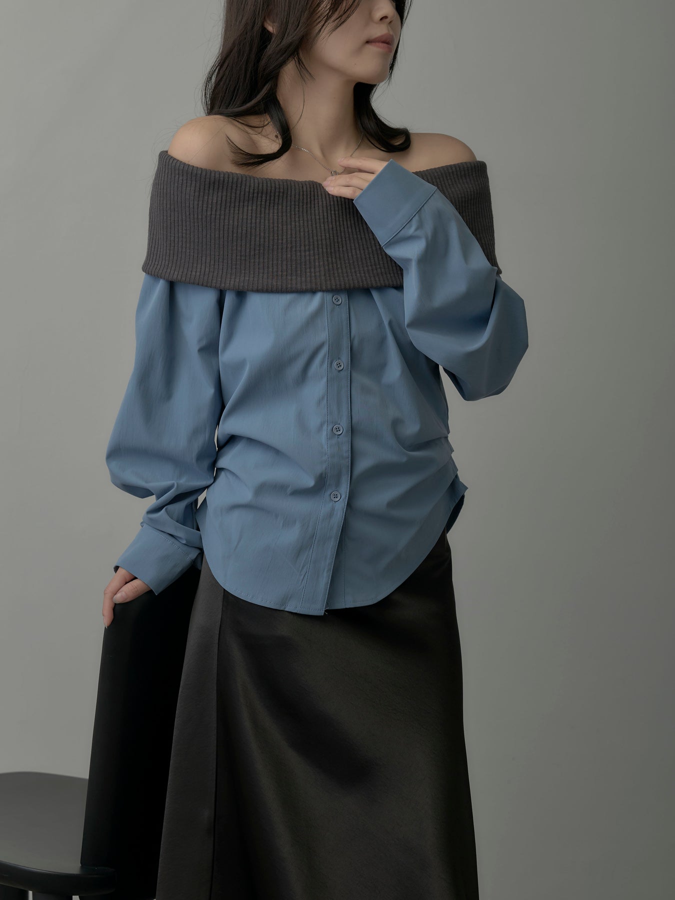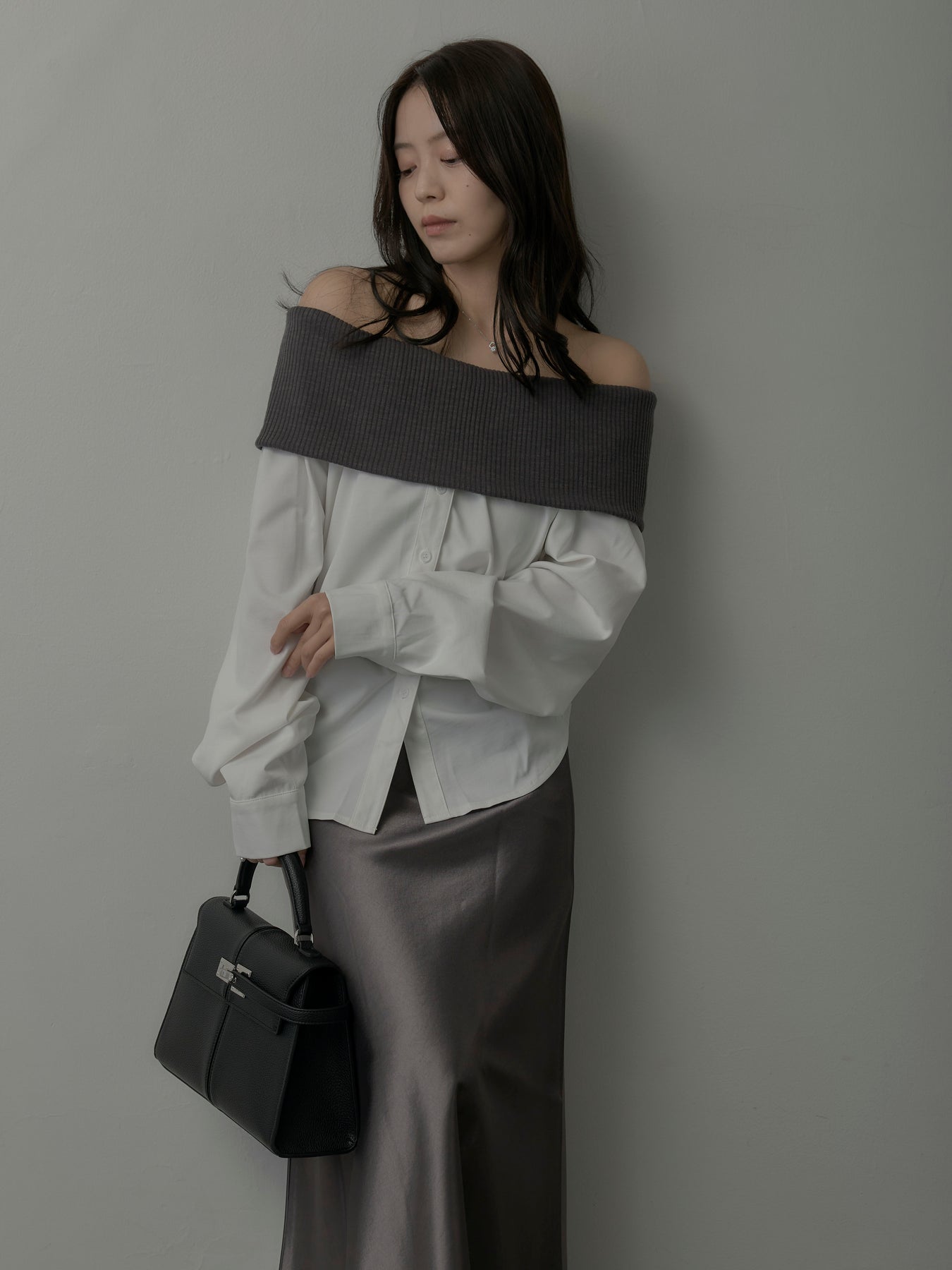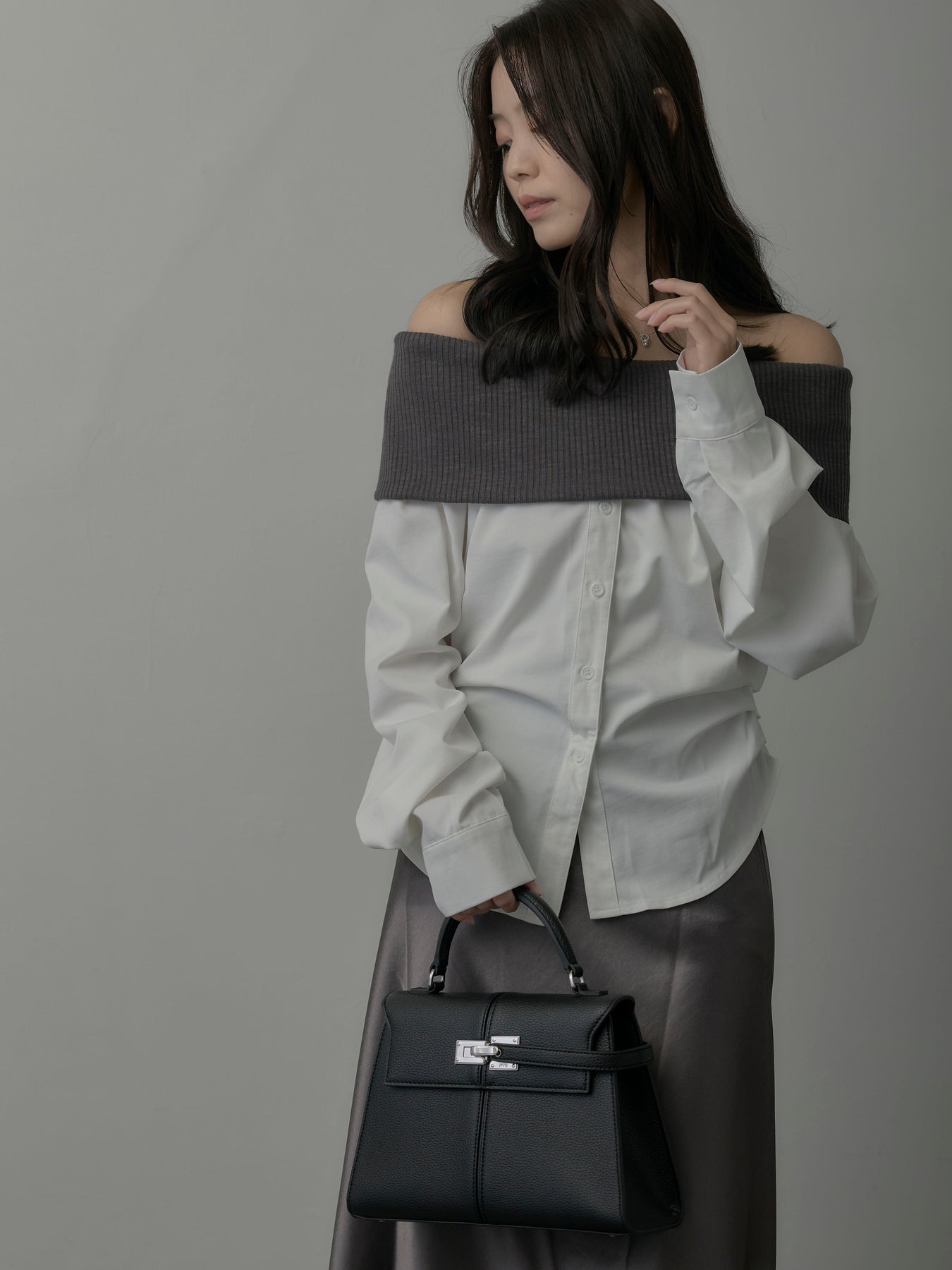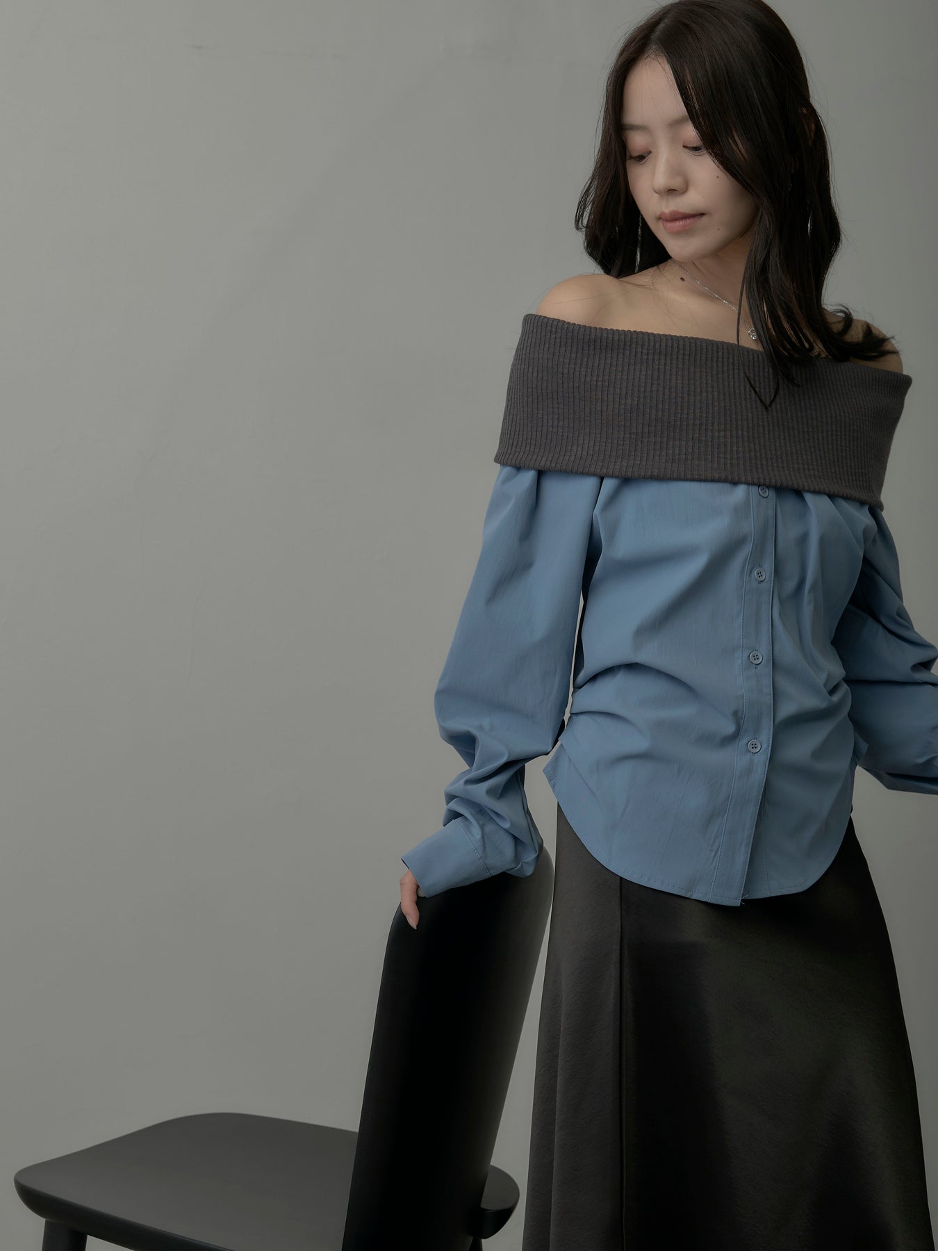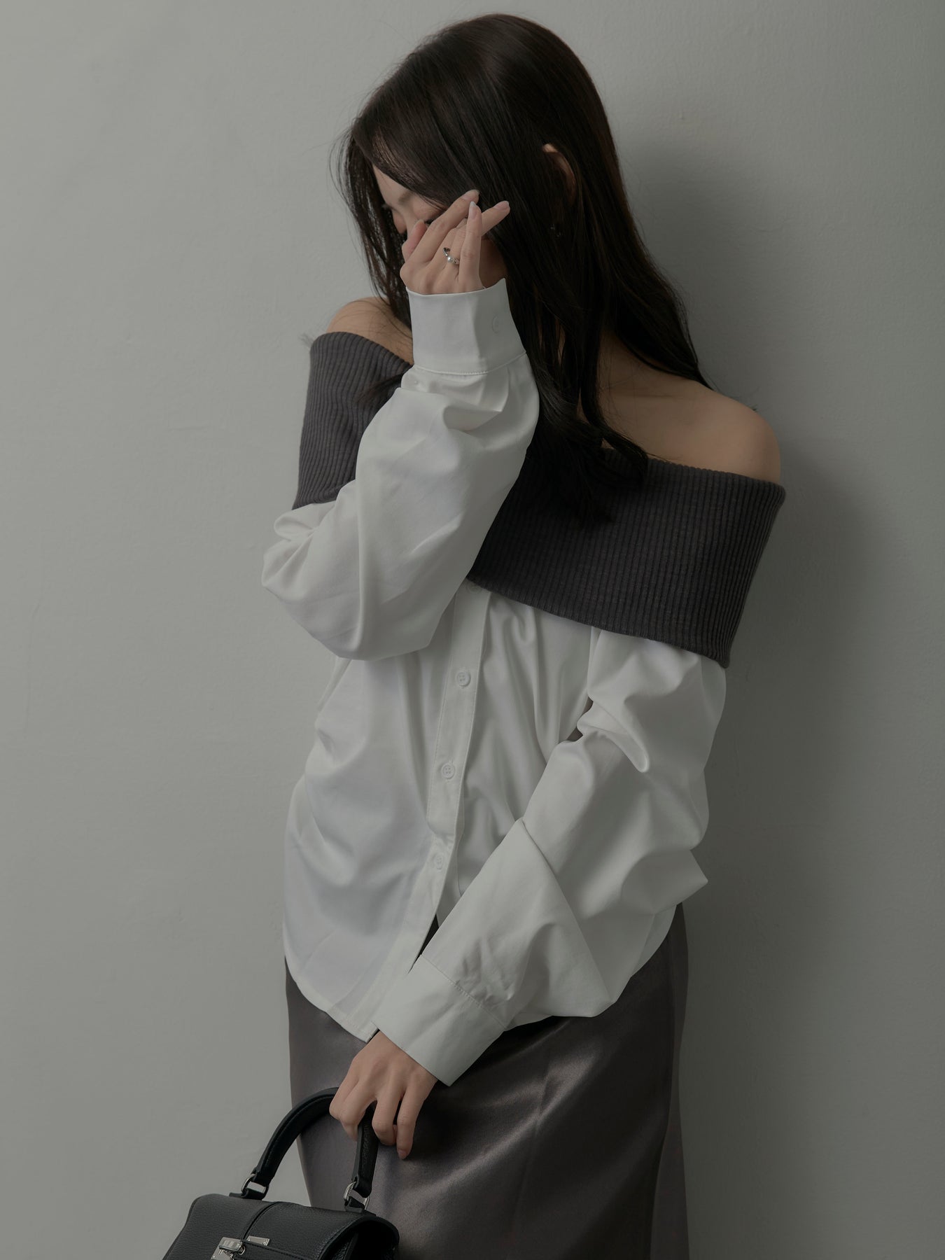 リブニットとシャツを組み合わせたドッキングデザインのオフショルトップス。肩を見せた抜け感のあるシルエットが印象的で、1枚でこなれたスタイルが完成します。異素材のコントラストが魅力的で、シンプルなボトムを合わせても存在感のある一枚。