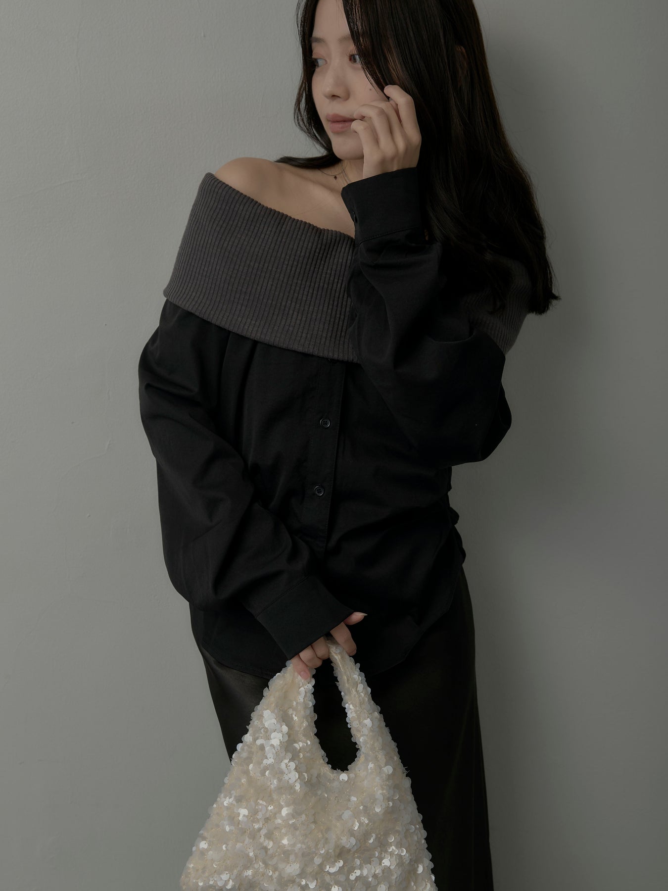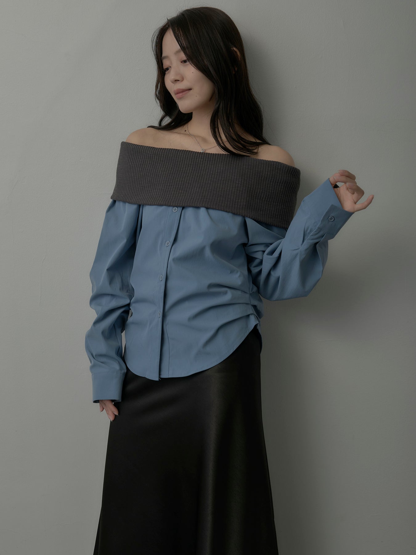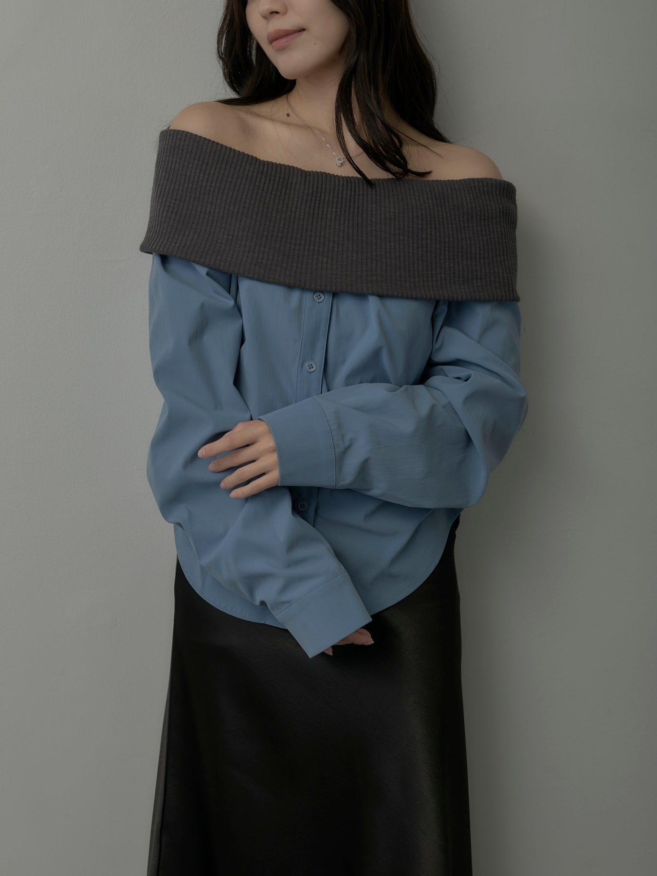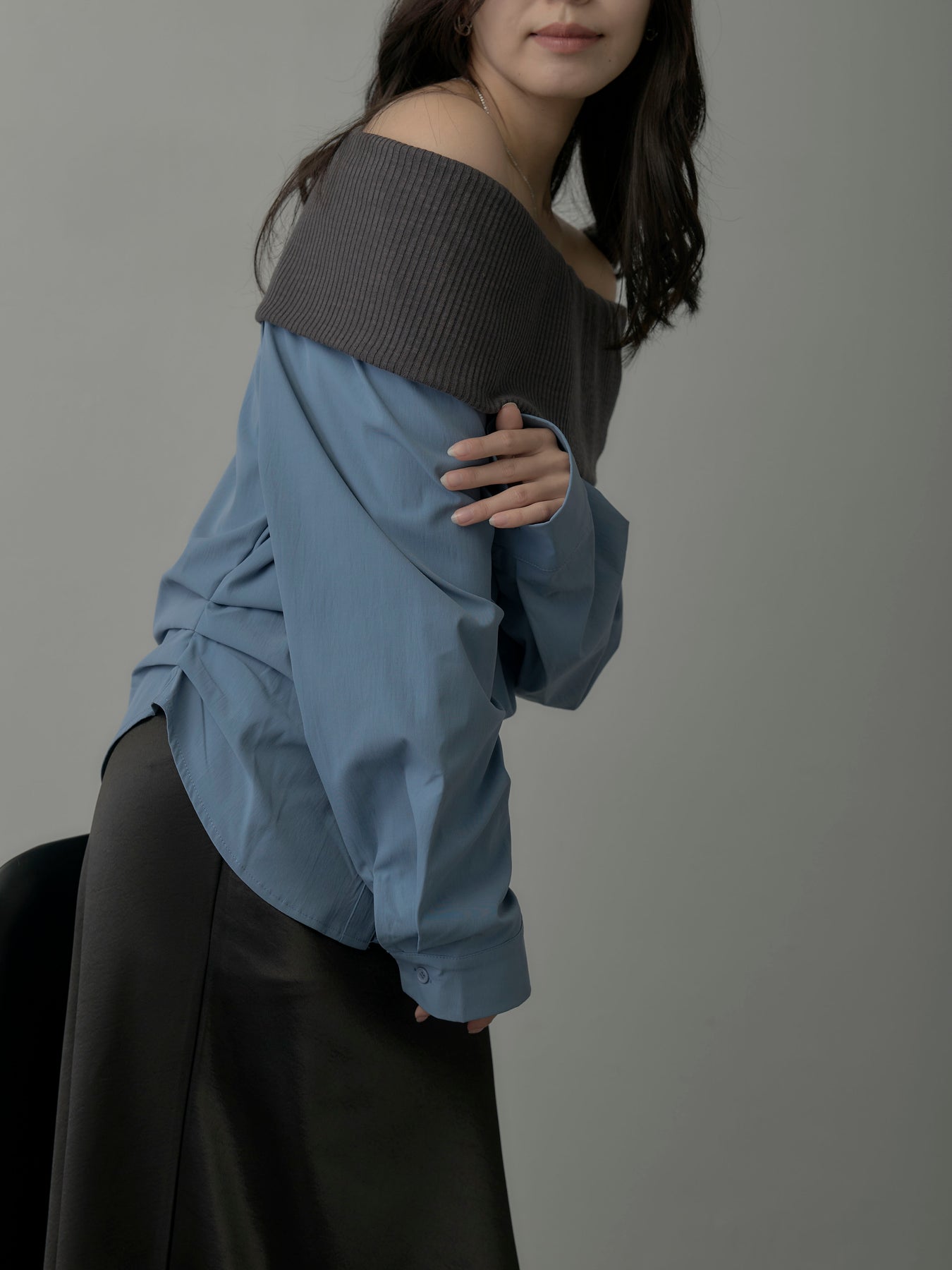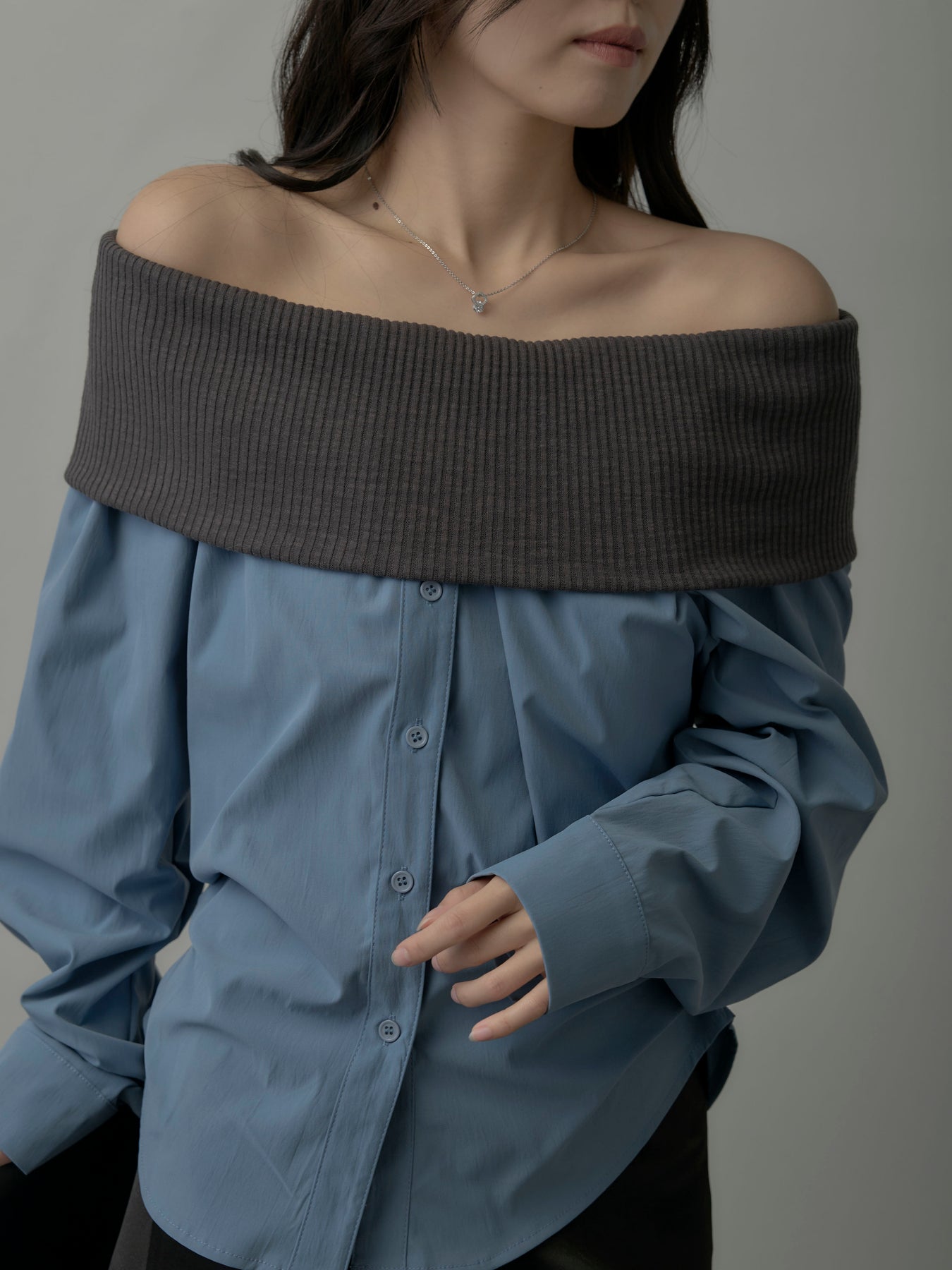 リブニットとシャツを組み合わせたドッキングデザインのオフショルトップス。肩を見せた抜け感のあるシルエットが印象的で、1枚でこなれたスタイルが完成します。異素材のコントラストが魅力的で、シンプルなボトムを合わせても存在感のある一枚。