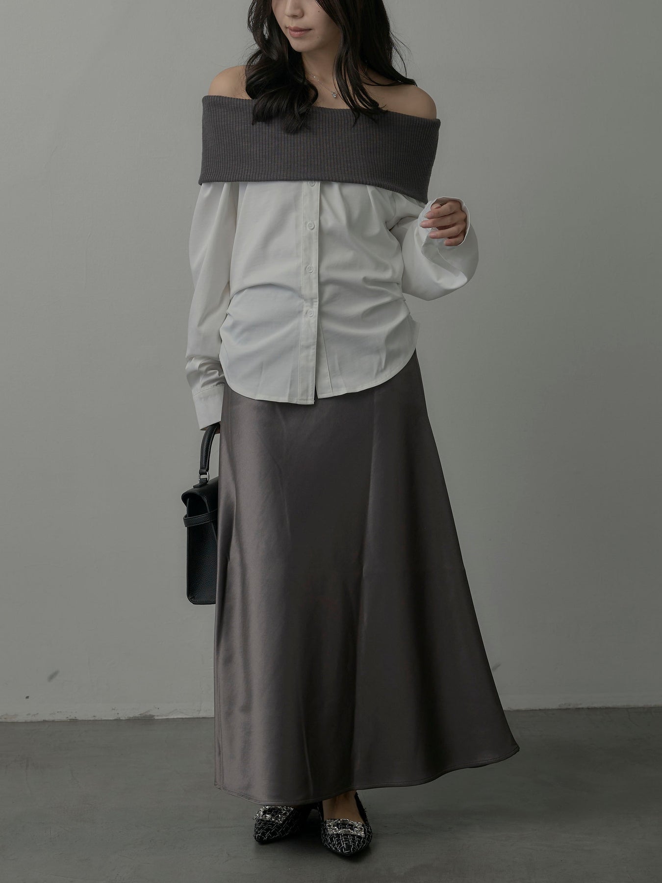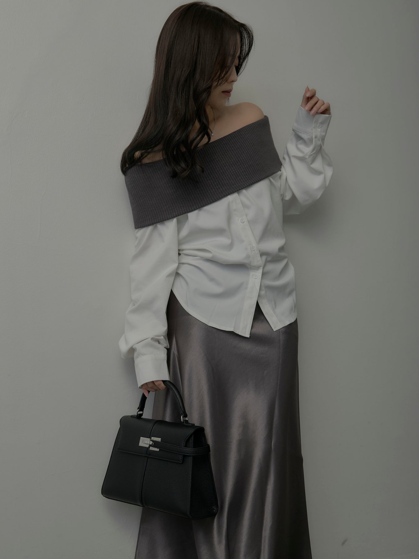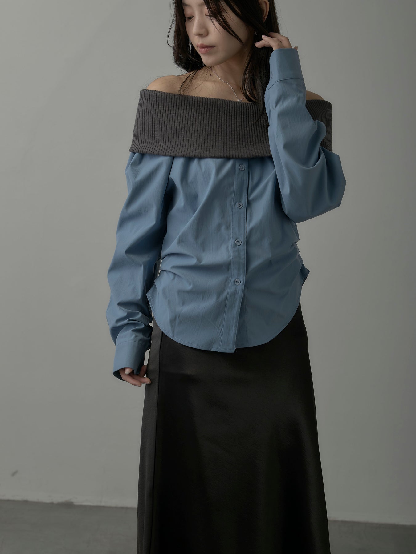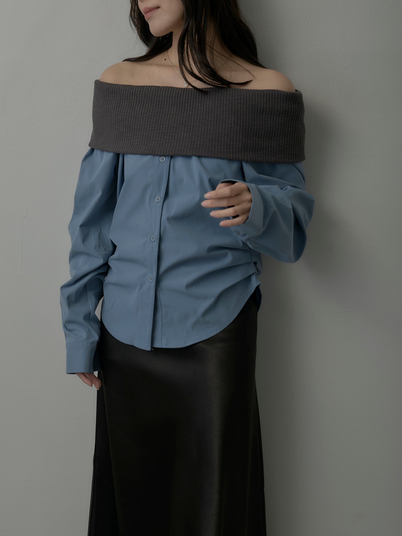 リブニットとシャツを組み合わせたドッキングデザインのオフショルトップス。肩を見せた抜け感のあるシルエットが印象的で、1枚でこなれたスタイルが完成します。異素材のコントラストが魅力的で、シンプルなボトムを合わせても存在感のある一枚。