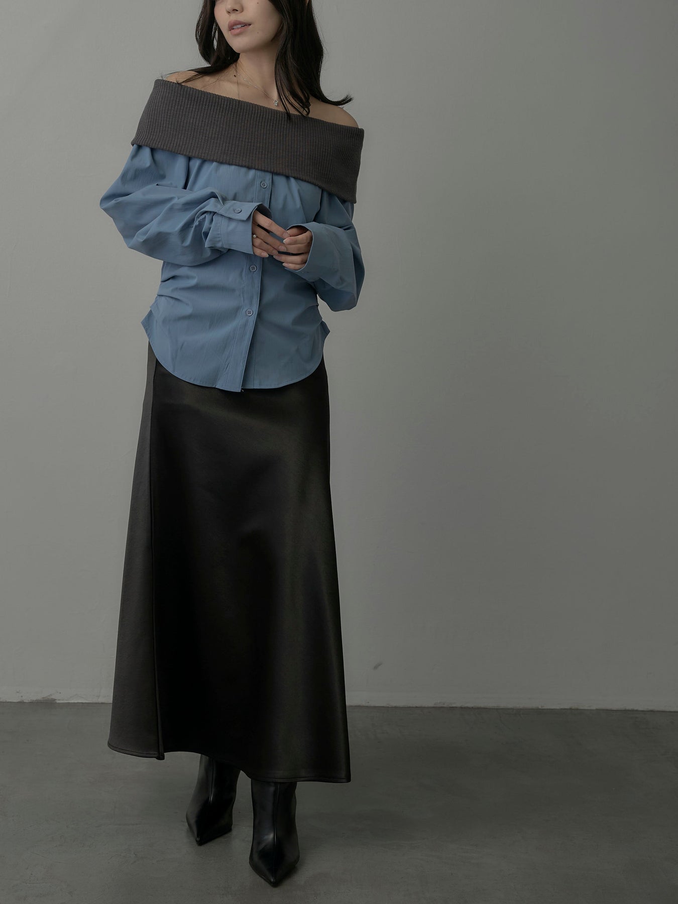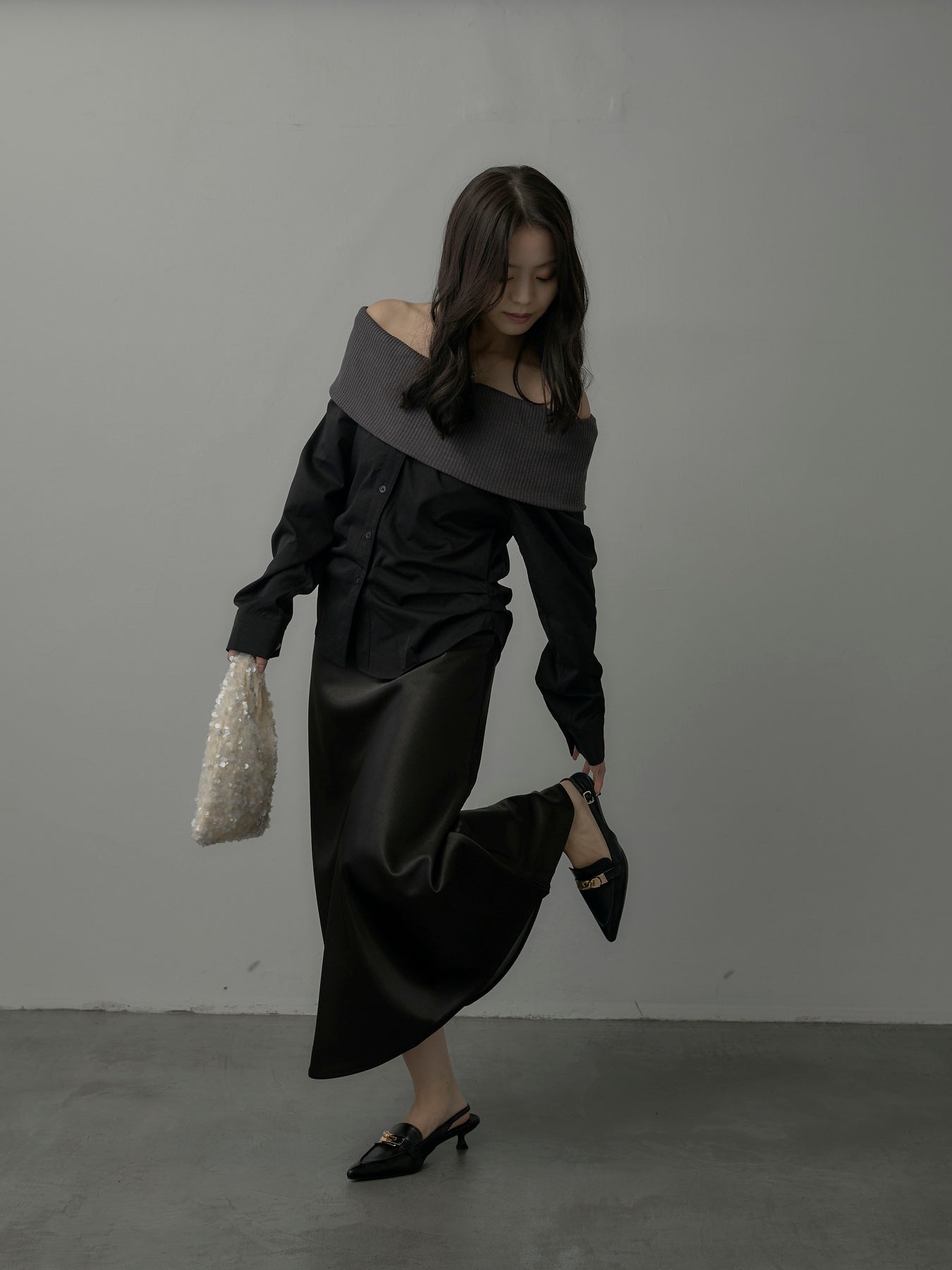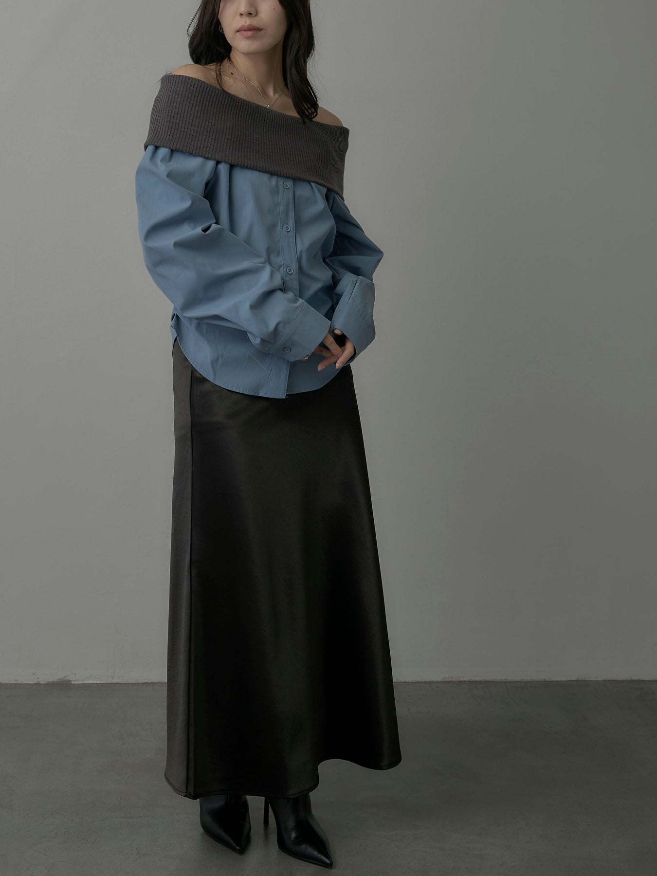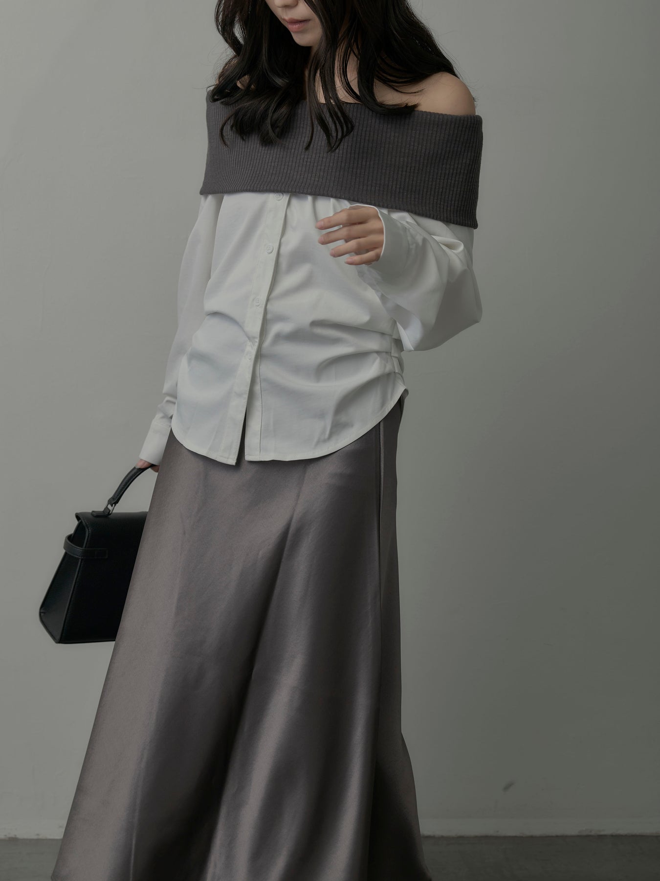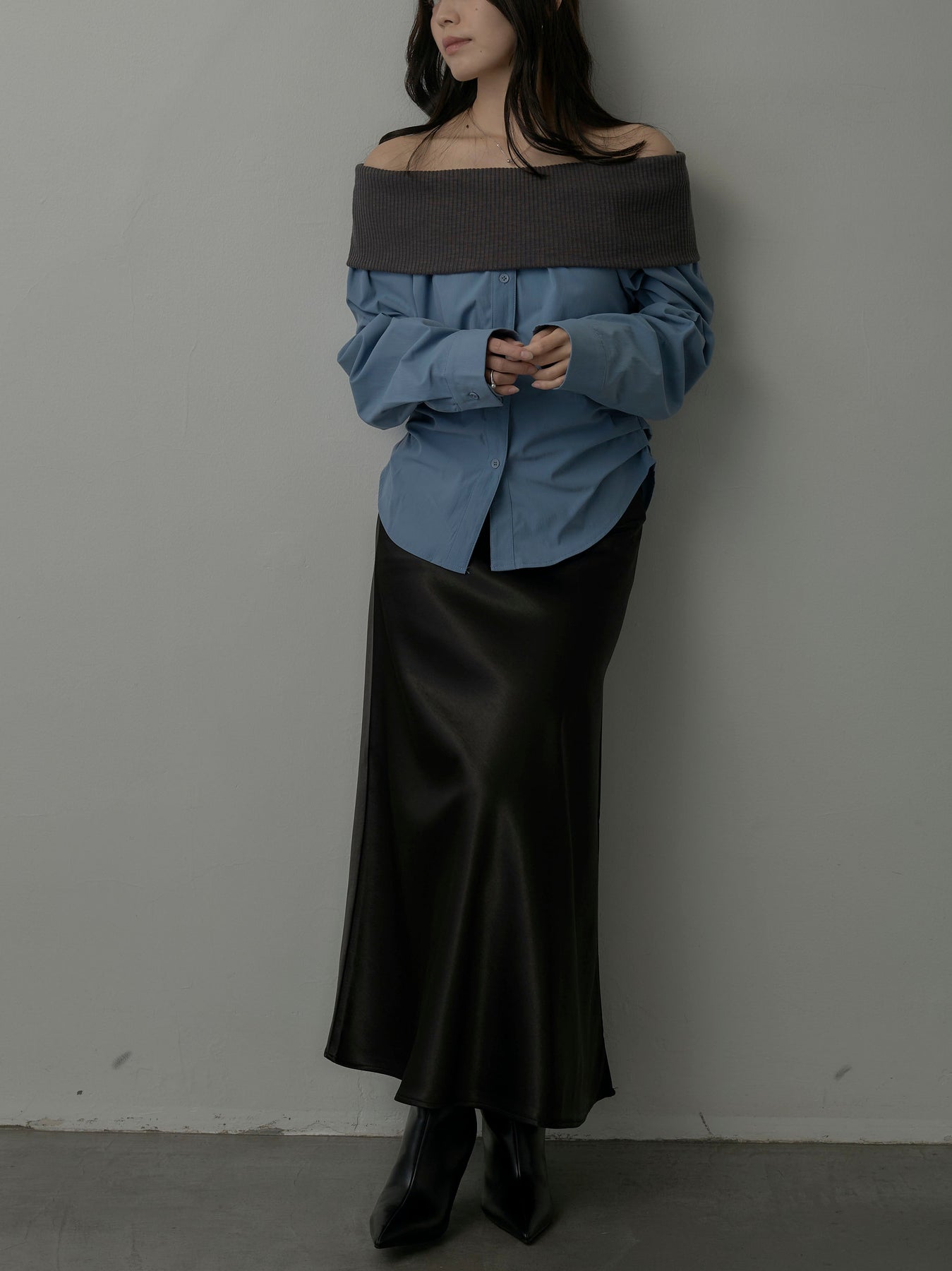リブニットとシャツを組み合わせたドッキングデザインのオフショルトップス。肩を見せた抜け感のあるシルエットが印象的で、1枚でこなれたスタイルが完成します。異素材のコントラストが魅力的で、シンプルなボトムを合わせても存在感のある一枚。