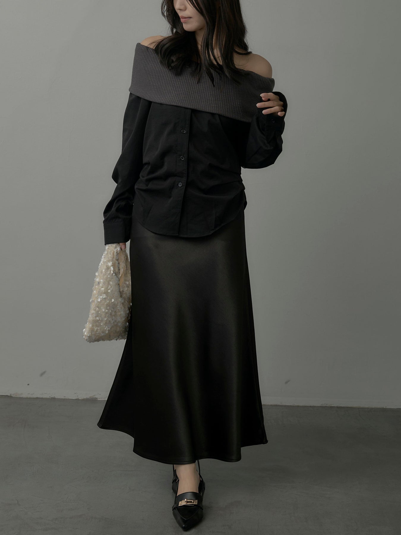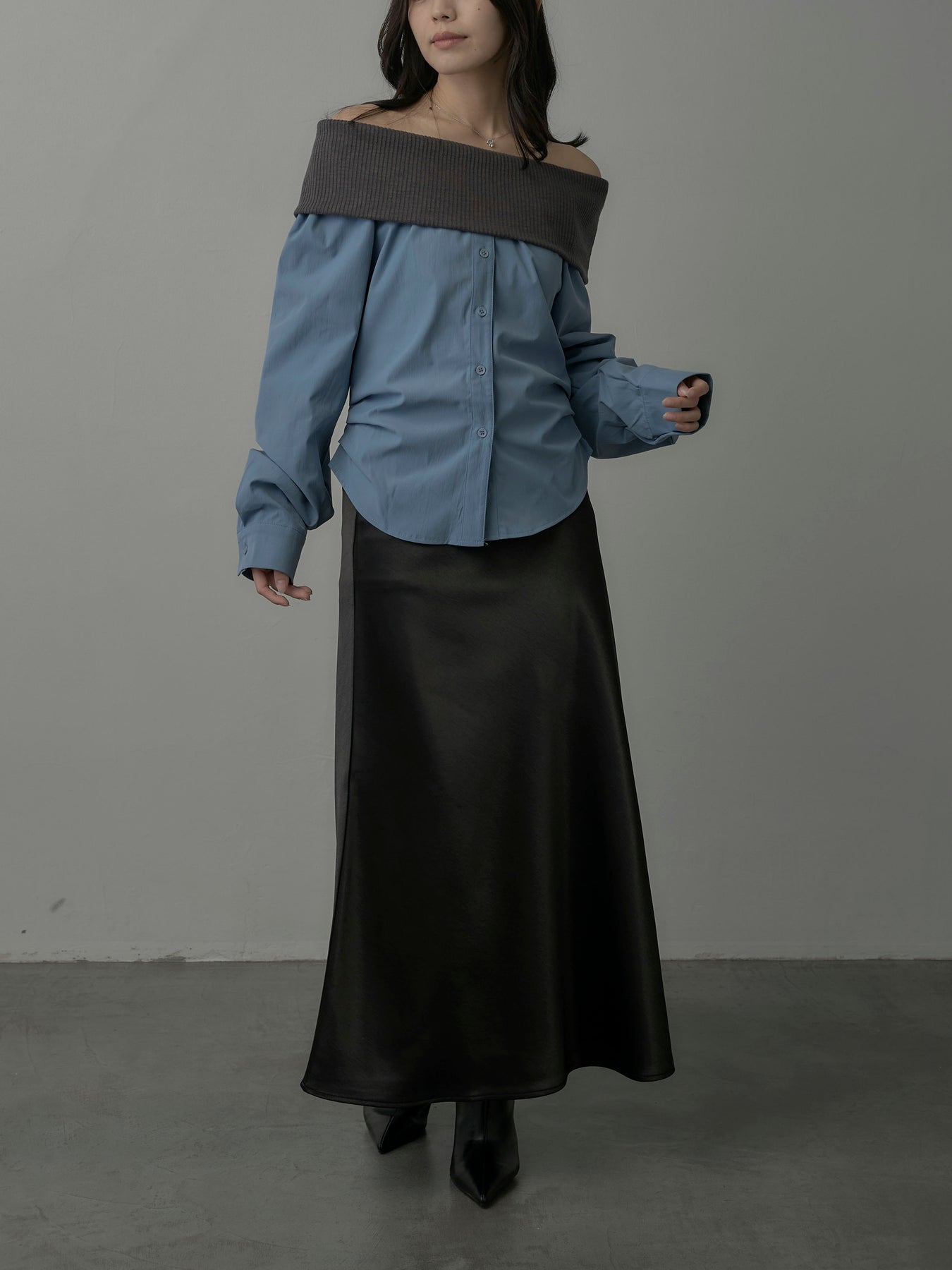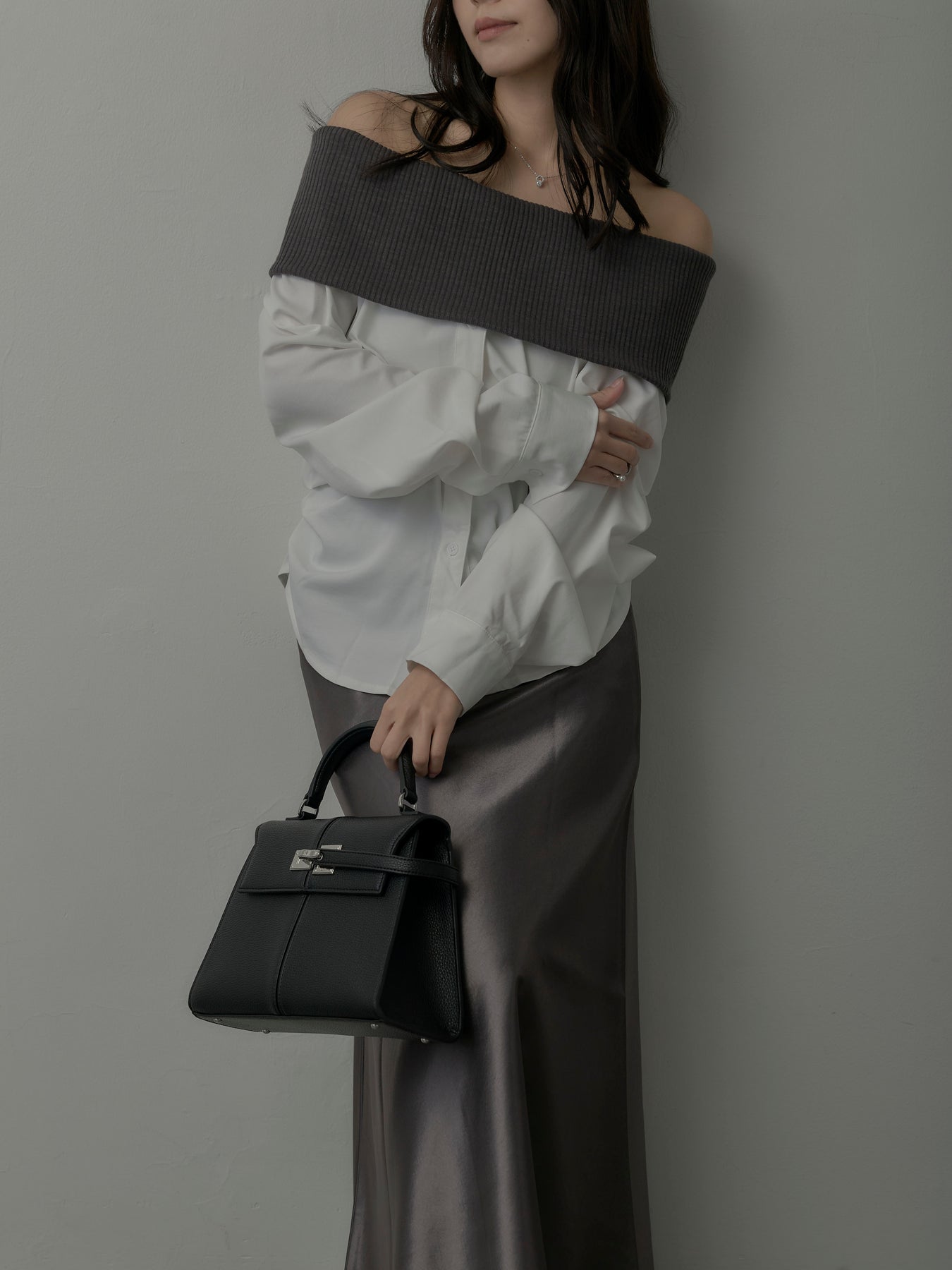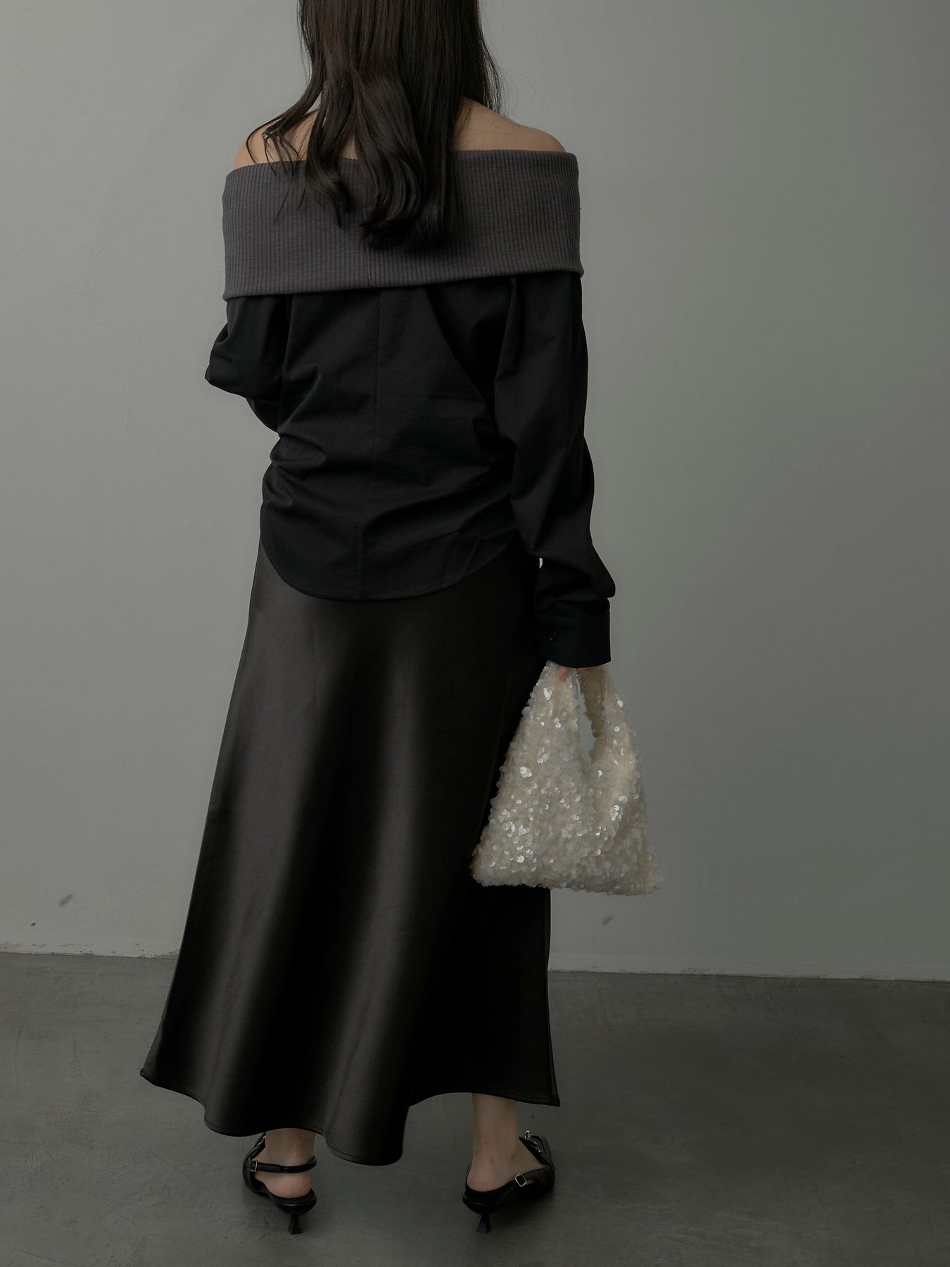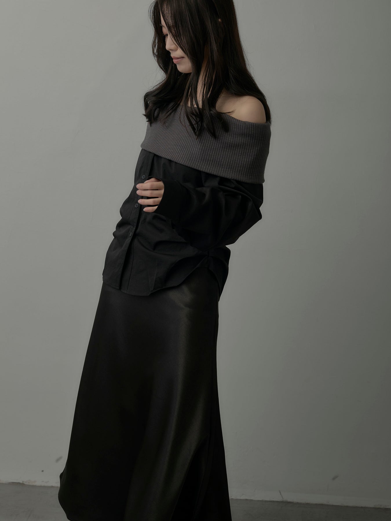リブニットとシャツを組み合わせたドッキングデザインのオフショルトップス。肩を見せた抜け感のあるシルエットが印象的で、1枚でこなれたスタイルが完成します。異素材のコントラストが魅力的で、シンプルなボトムを合わせても存在感のある一枚。