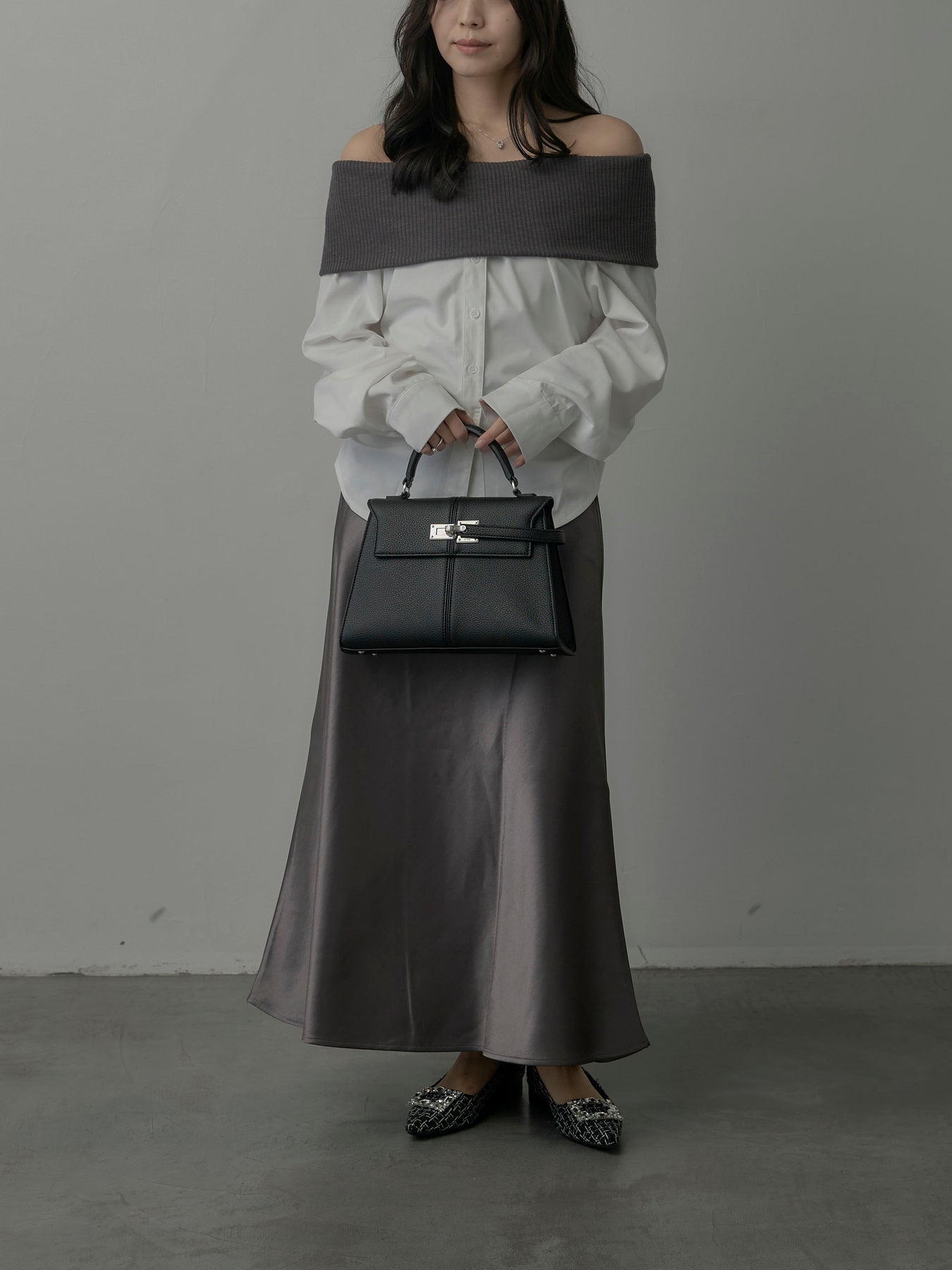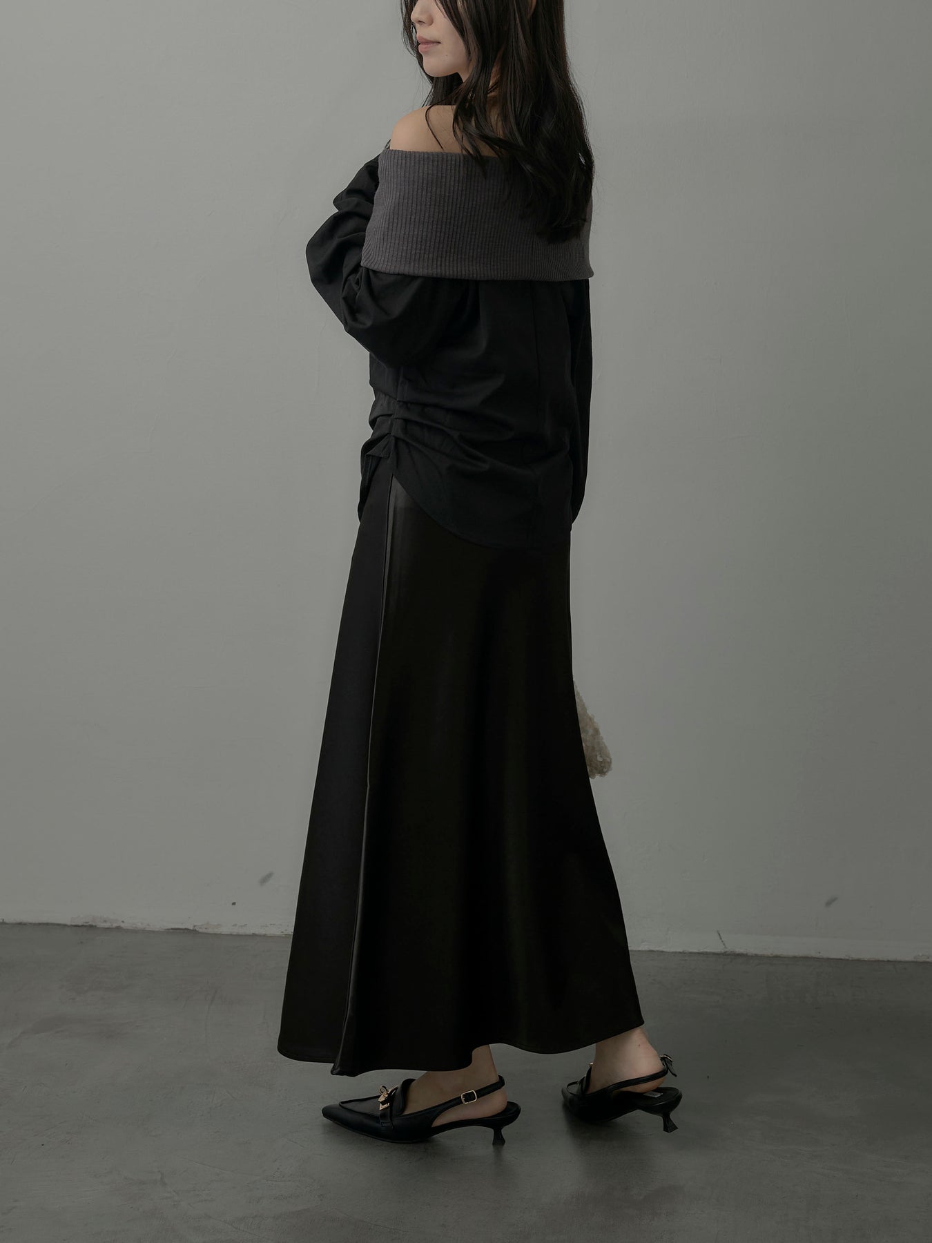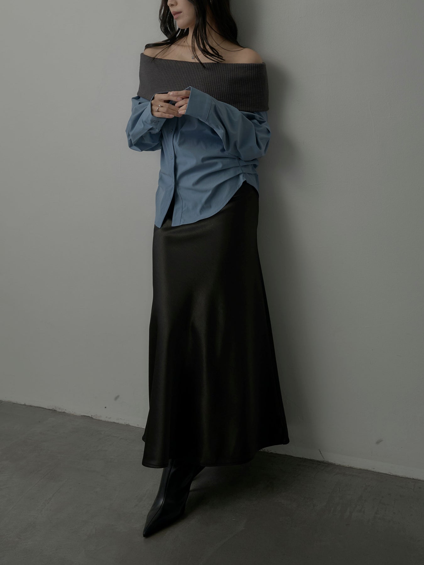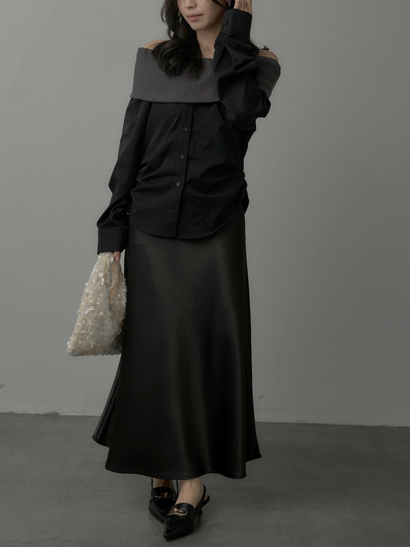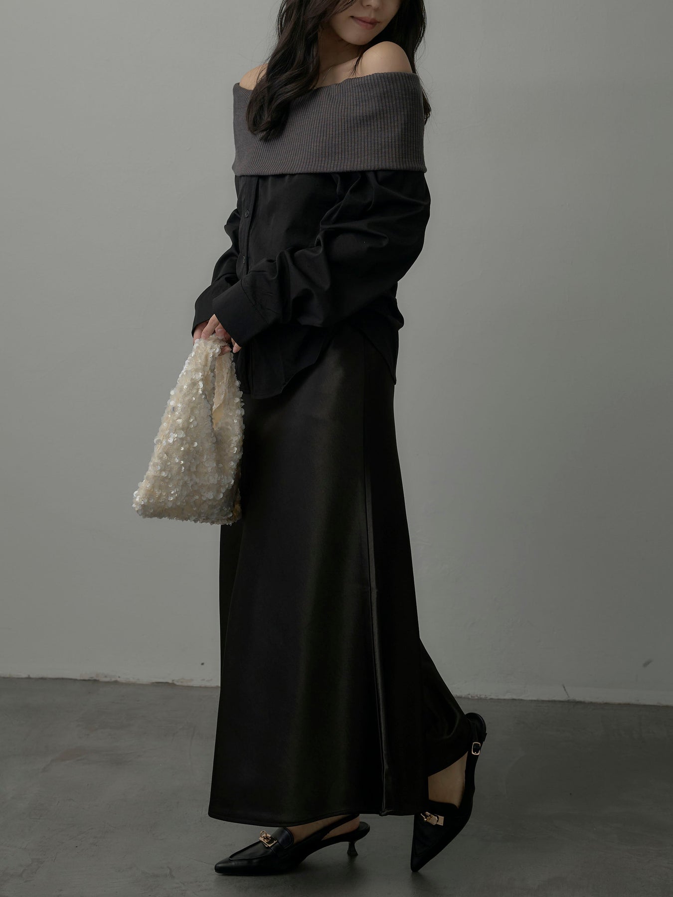 リブニットとシャツを組み合わせたドッキングデザインのオフショルトップス。肩を見せた抜け感のあるシルエットが印象的で、1枚でこなれたスタイルが完成します。異素材のコントラストが魅力的で、シンプルなボトムを合わせても存在感のある一枚。