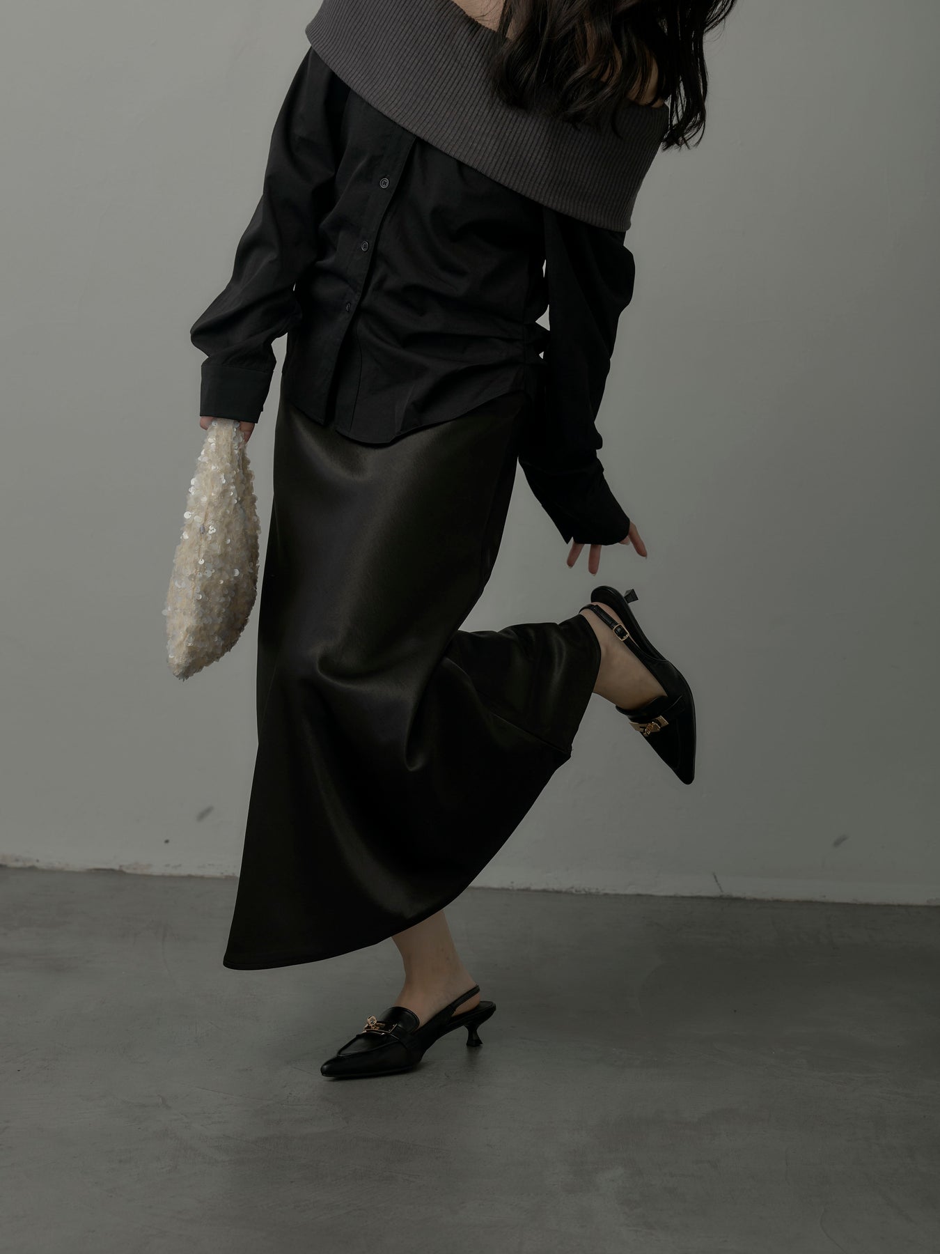 少し重めのサテン素材で今の気候にもぴったりです。光沢感も強すぎず、落ち着いた艶めきで大人っぽく着こなしていただけます。カジュアルアイテムも合わせると華やかさをプラスしてくれます。