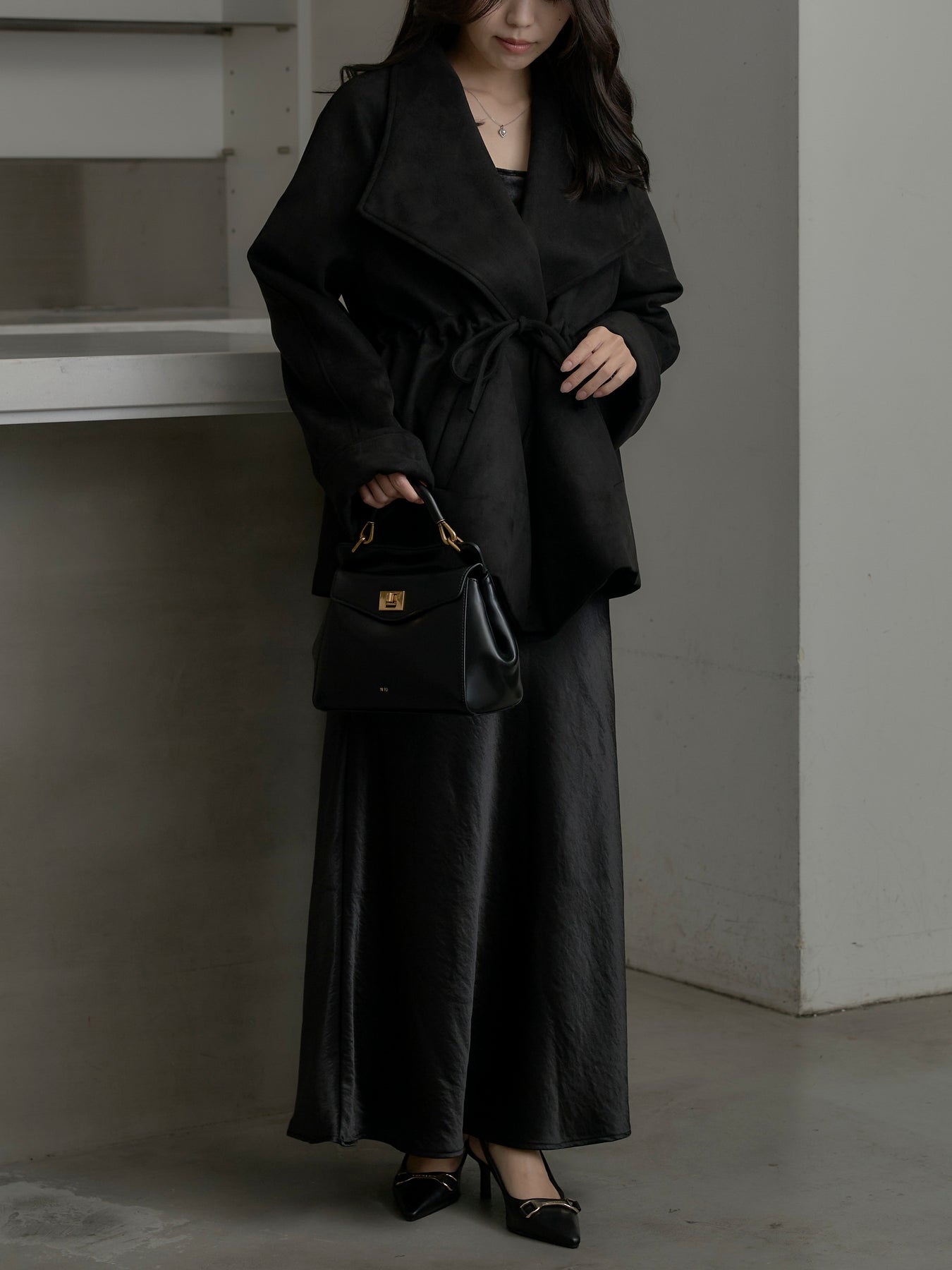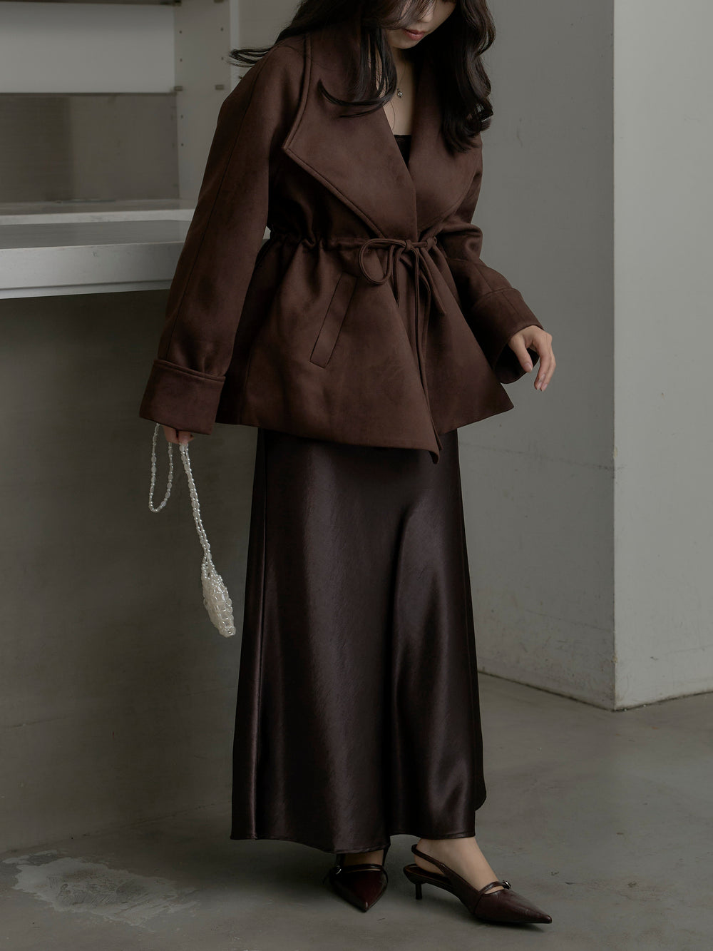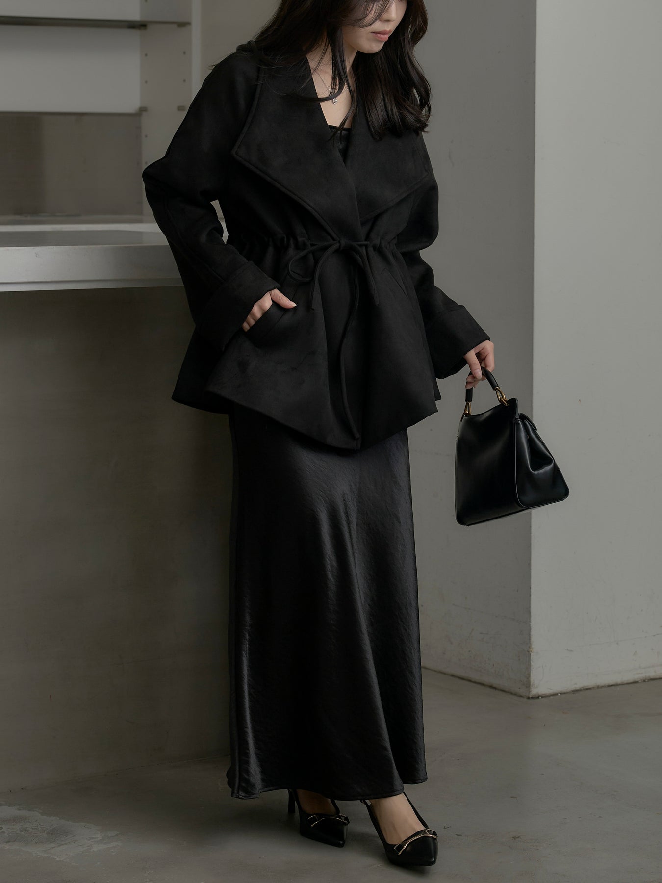 【SET】BIGカラースウェードジャケット+ナローAラインサテンスカート(2set)