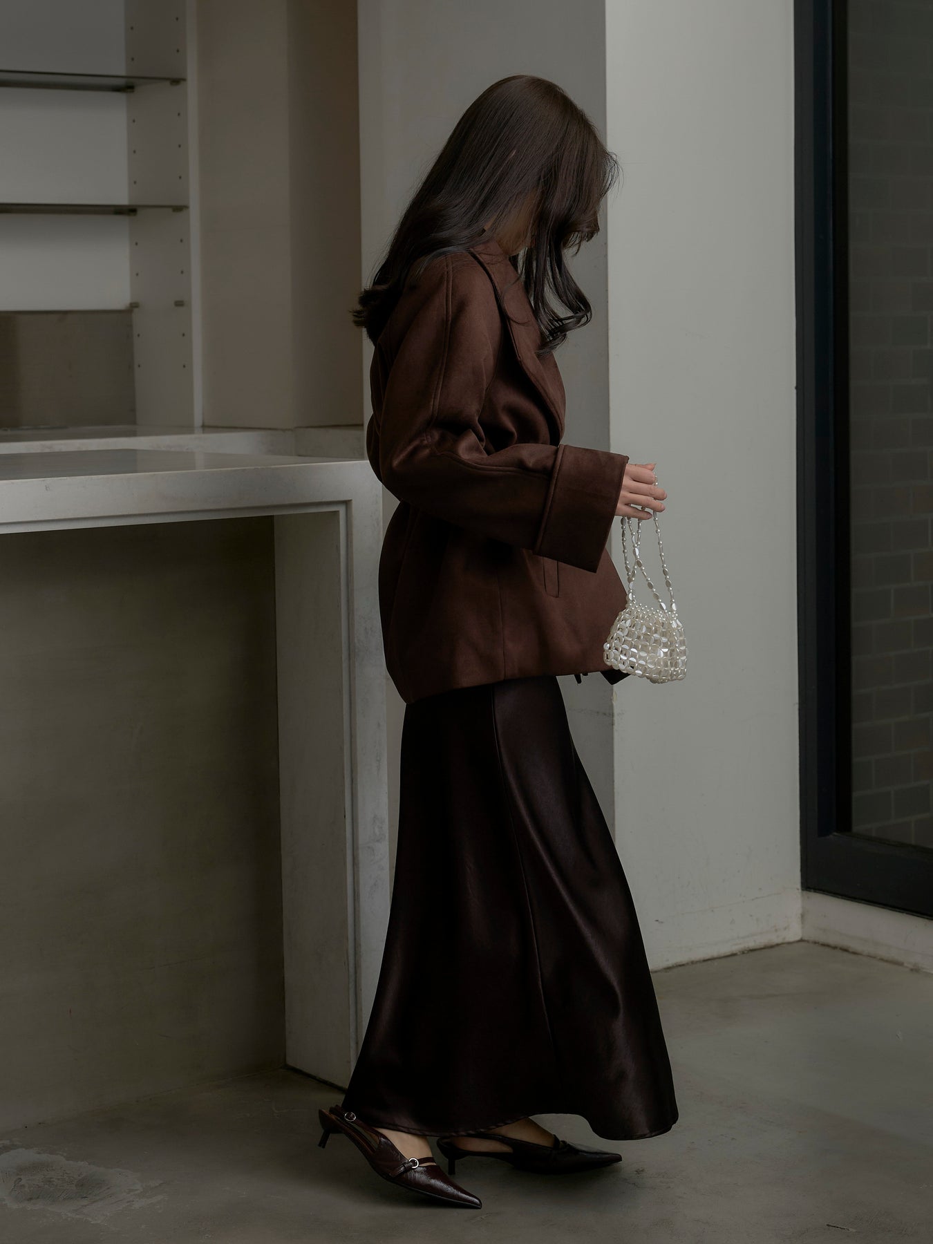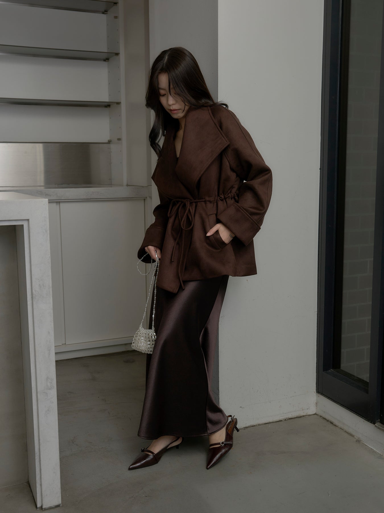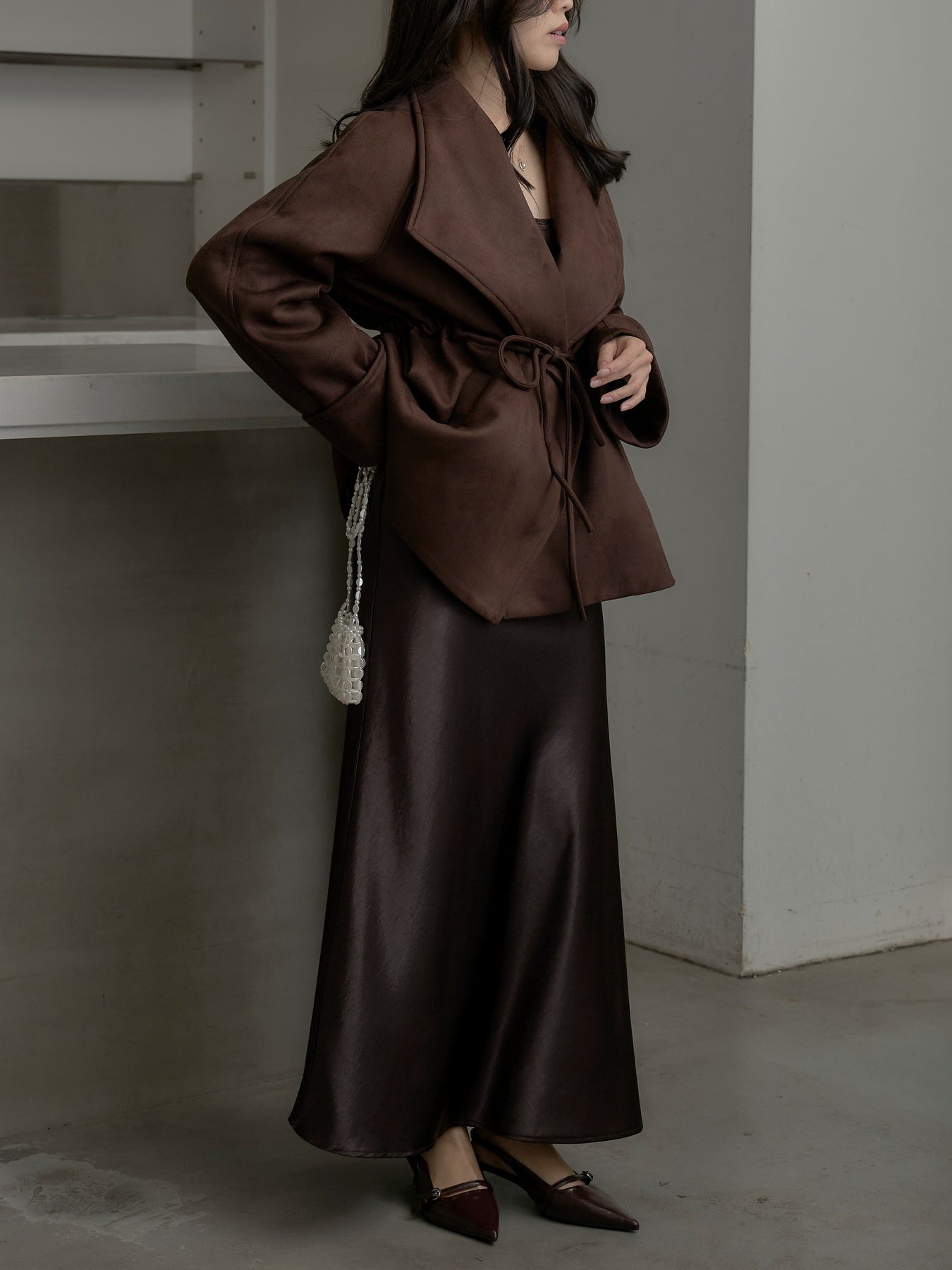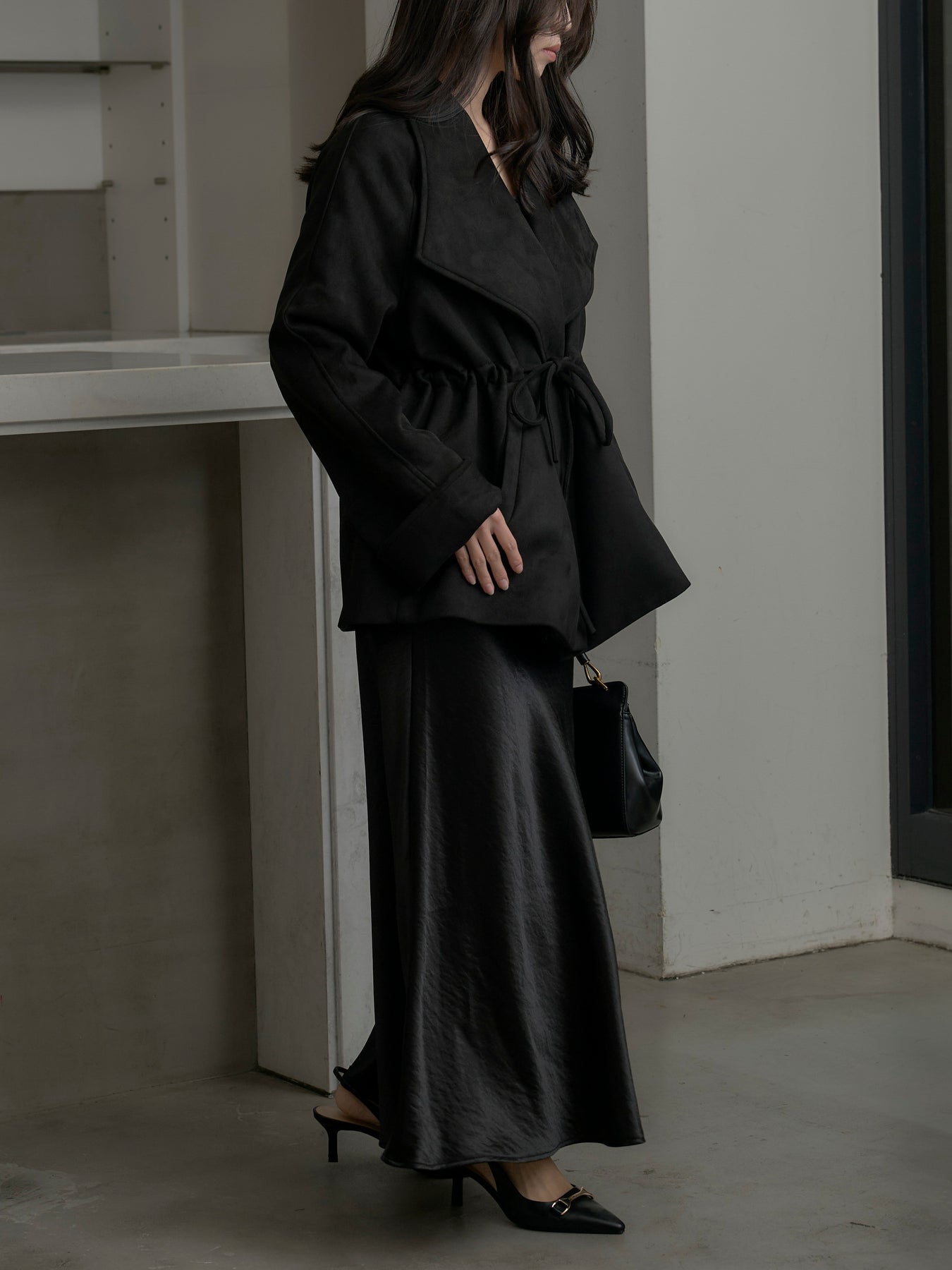 【SET】BIGカラースウェードジャケット+ナローAラインサテンスカート(2set)