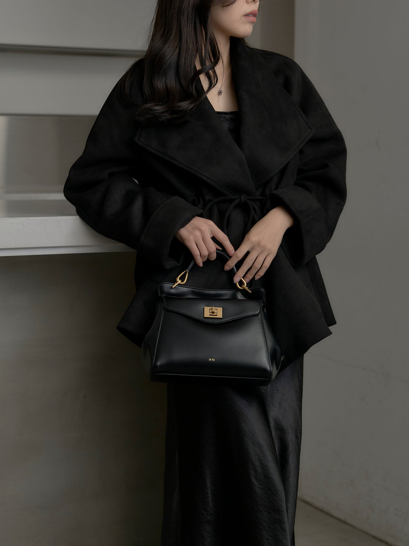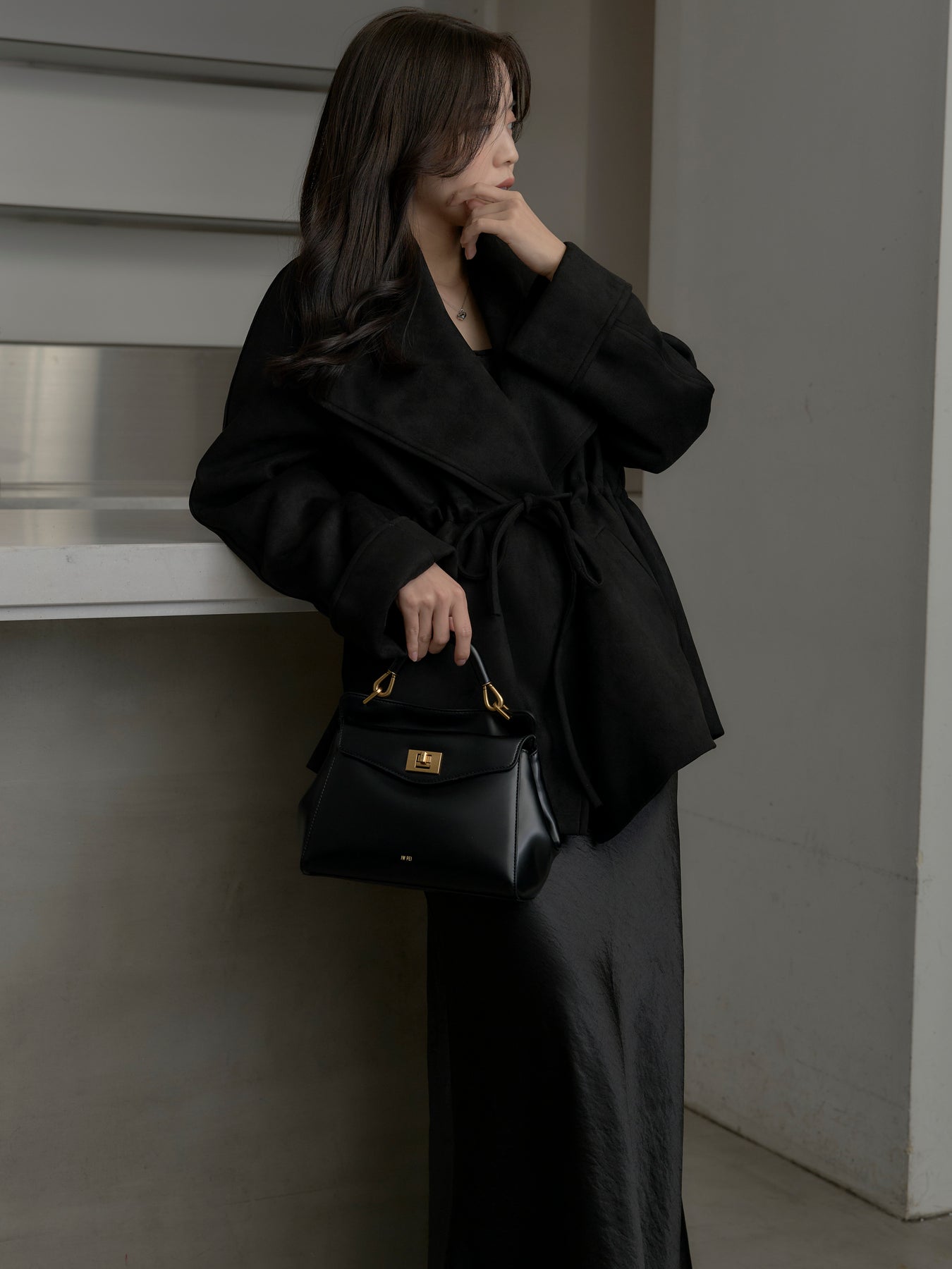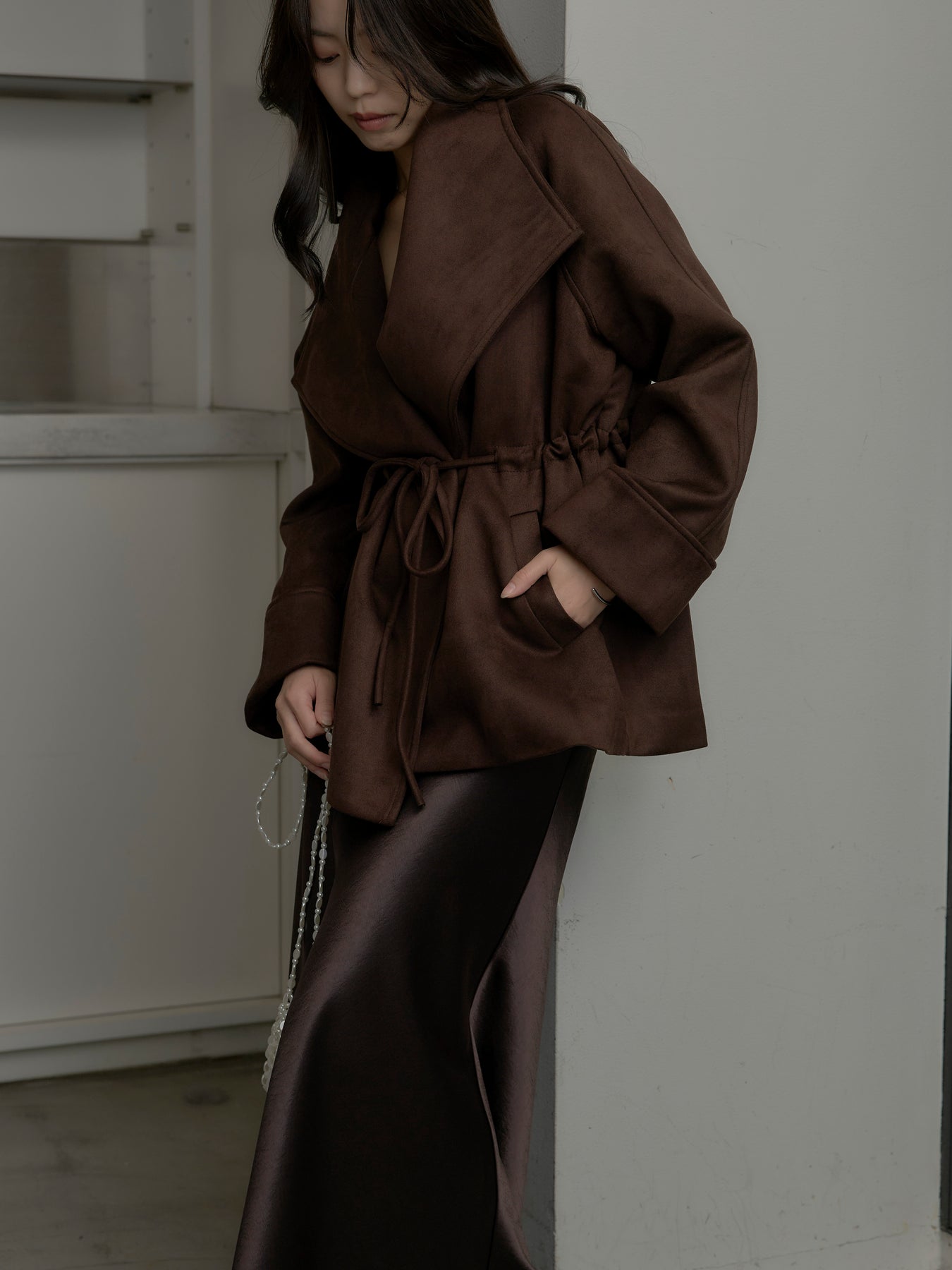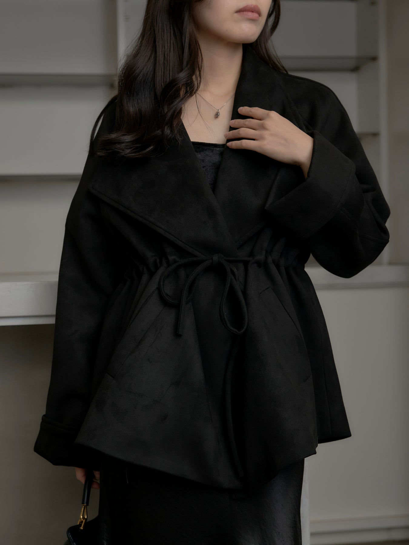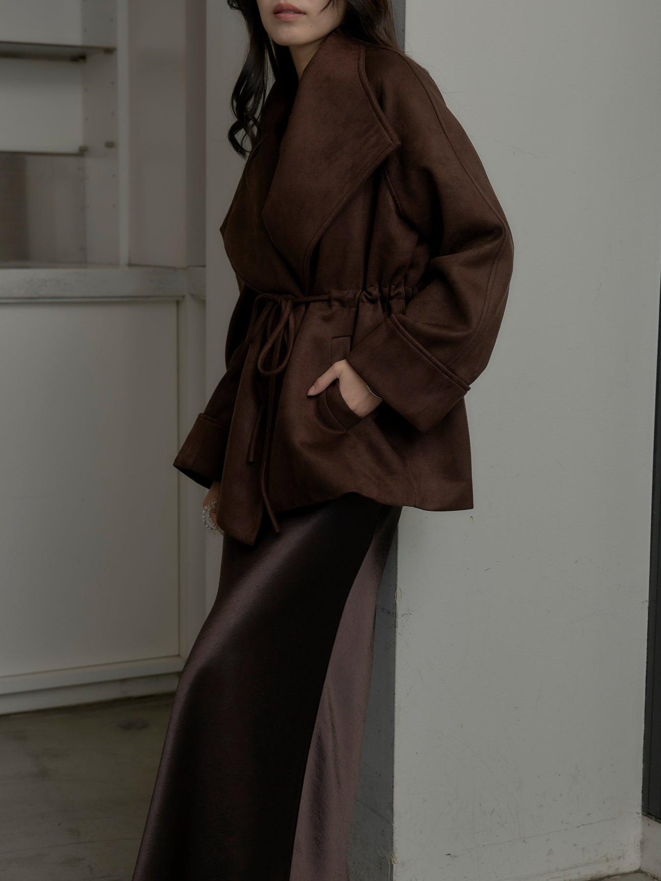 滑らかなスウェードタッチ素材を使用したBIGカラージャケット。 立体的な襟デザインが顔周りをすっきり見せ、羽織るだけで存在感のあるスタイルに。 ウエストを絞れるリボン付きで、スタイルアップ&シルエットの変化も楽しめる一枚。