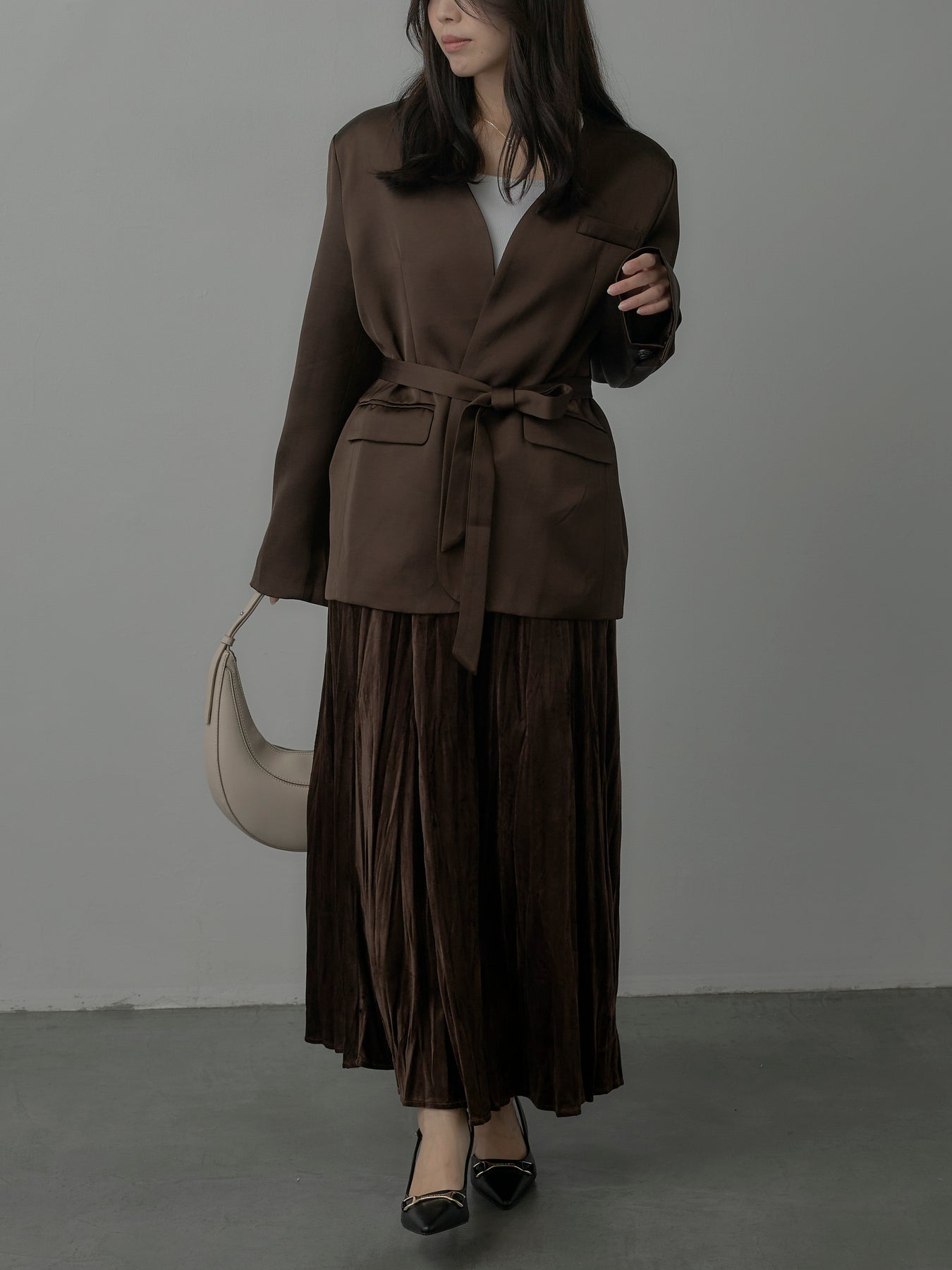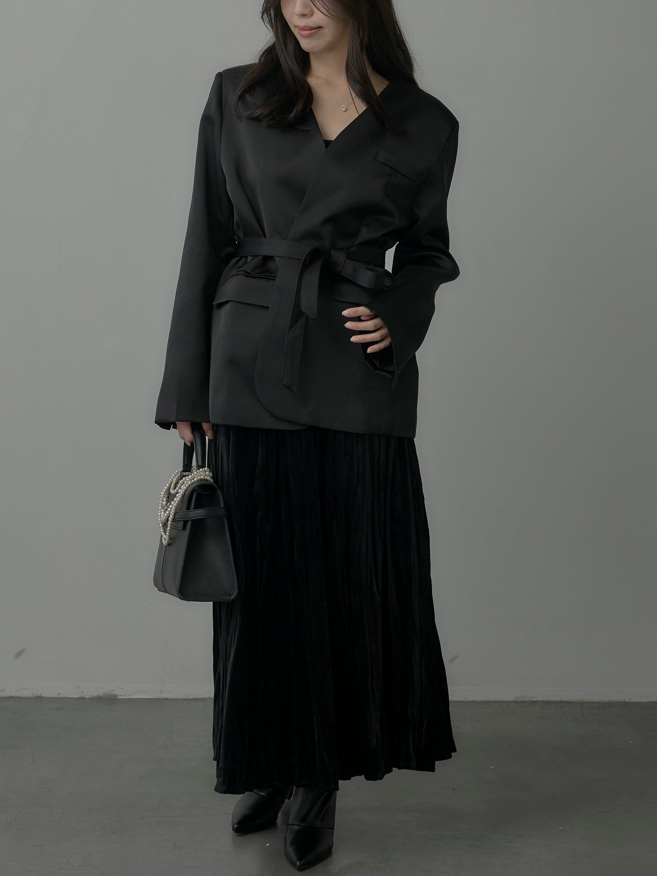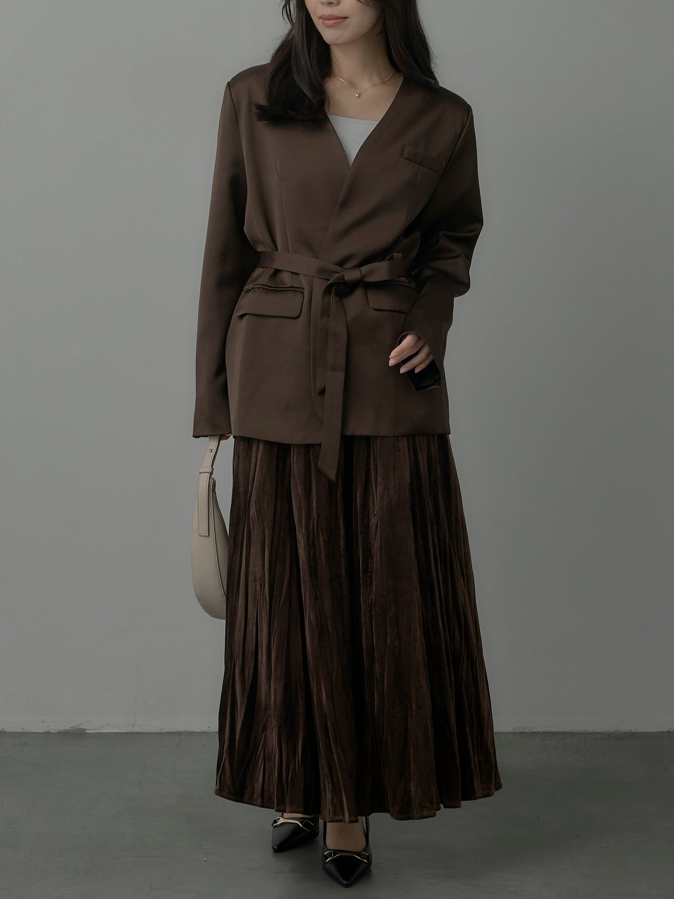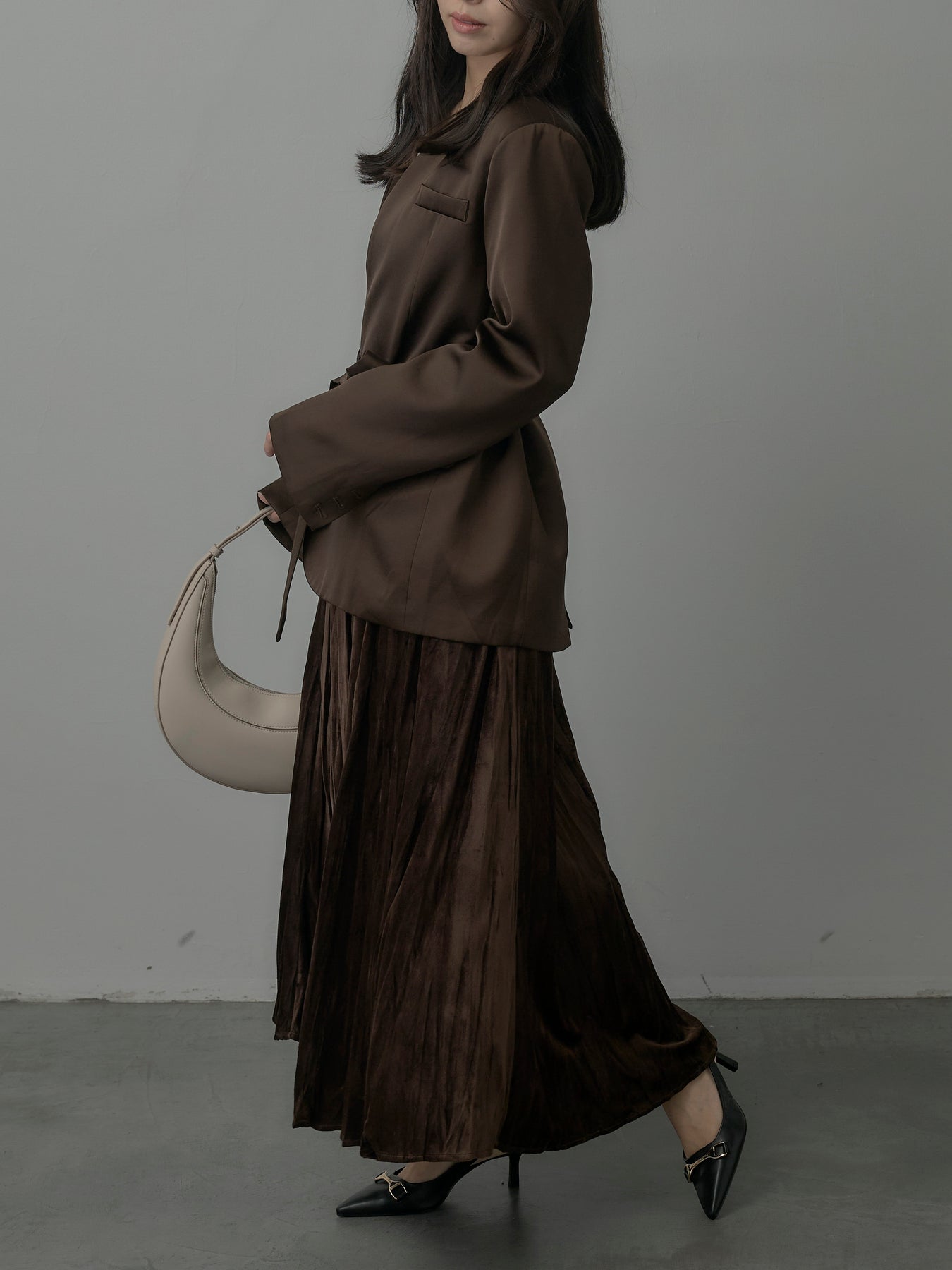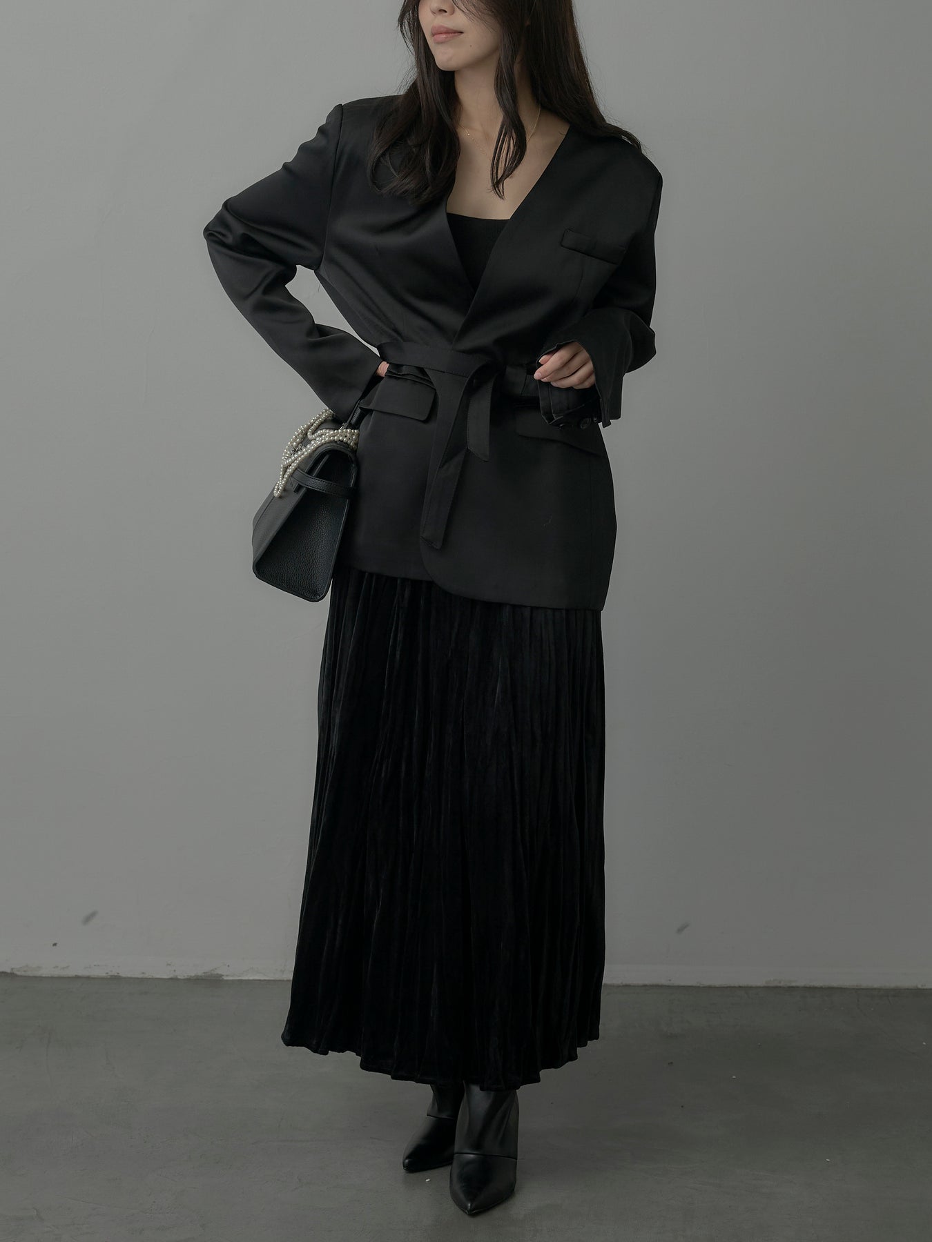 【SET】ノーカラーサテンジャケット+ベロアワッシャープリーツスカート(2set)