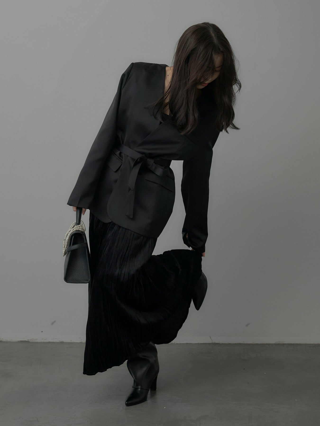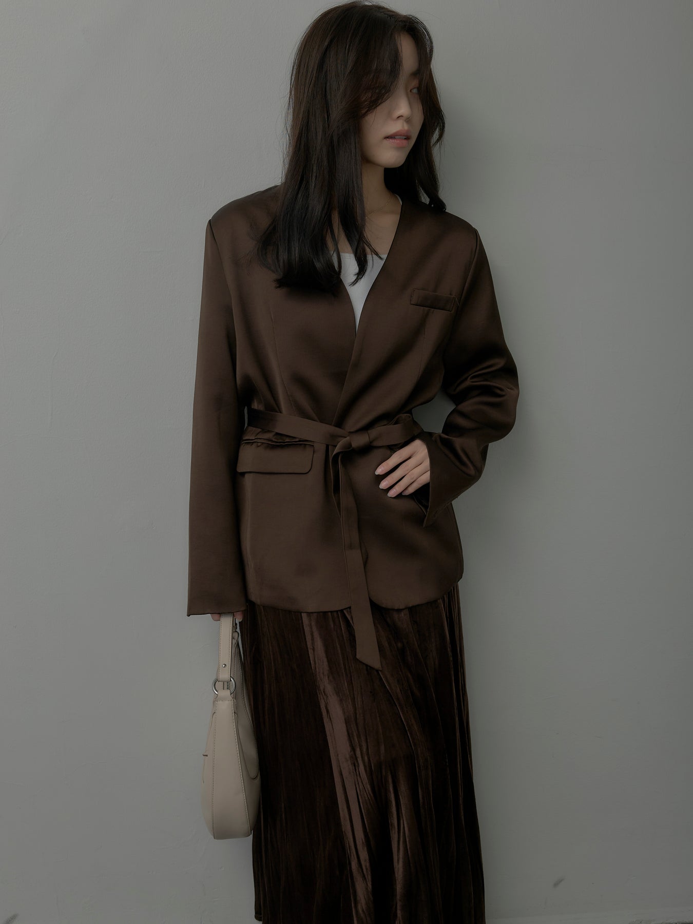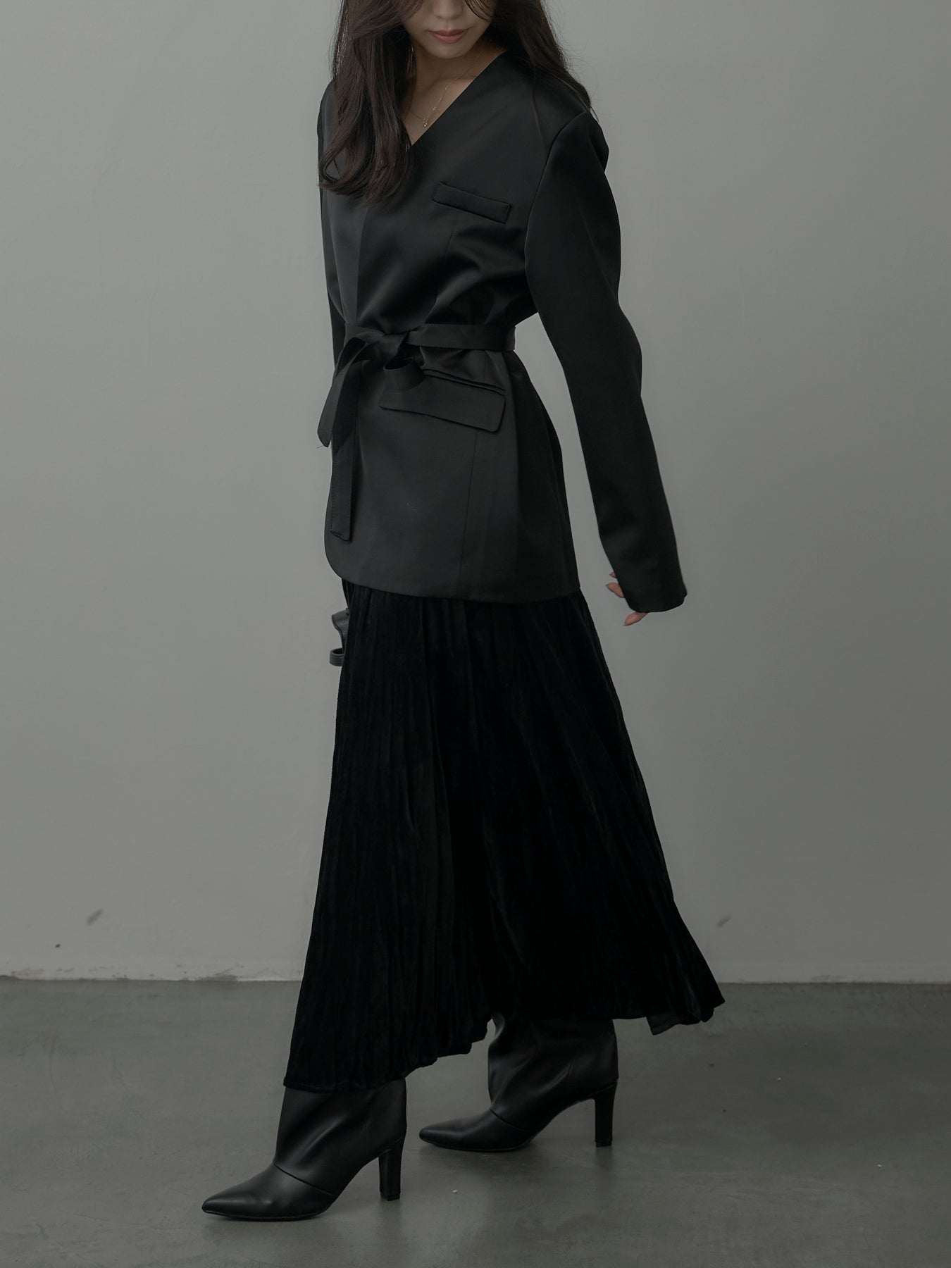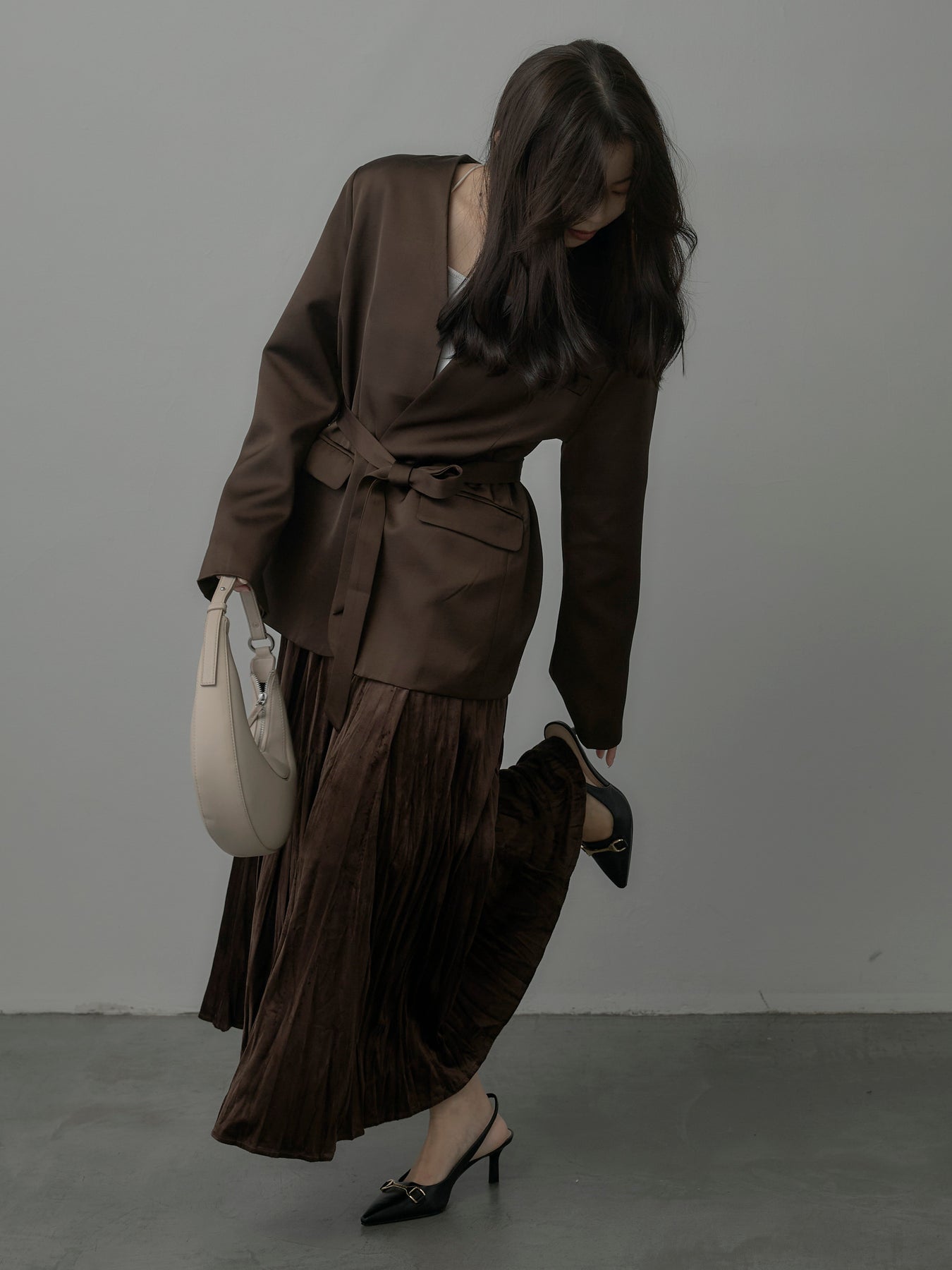 【SET】ノーカラーサテンジャケット+ベロアワッシャープリーツスカート(2set)