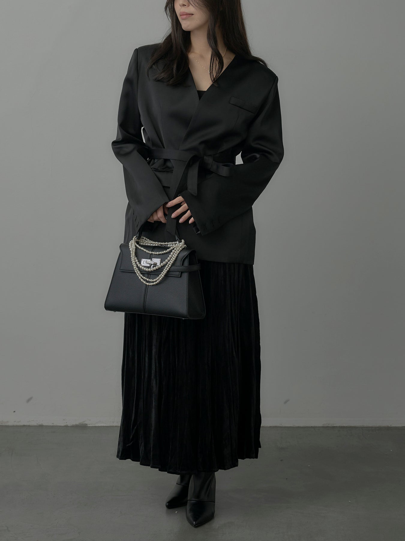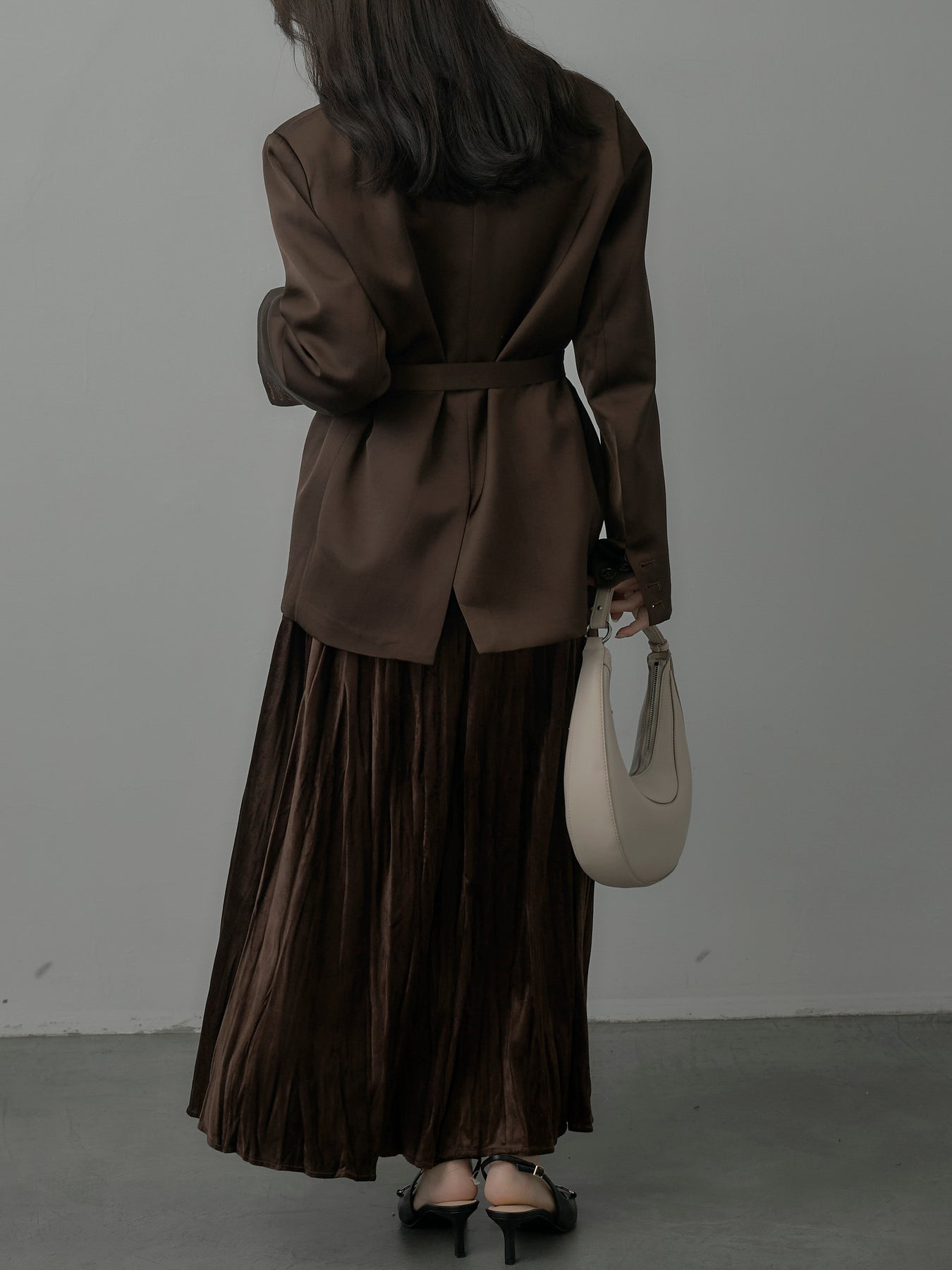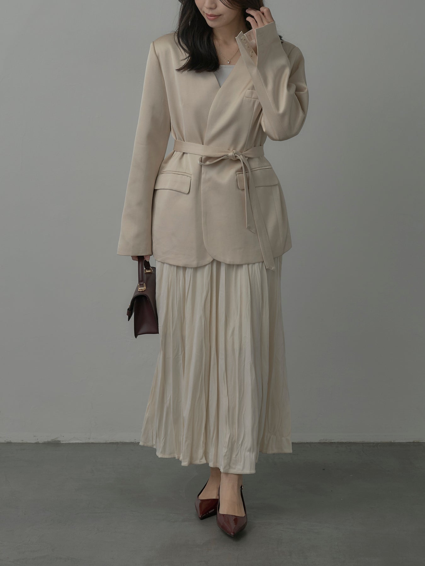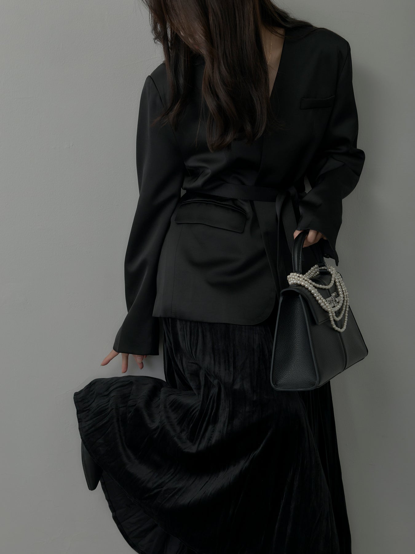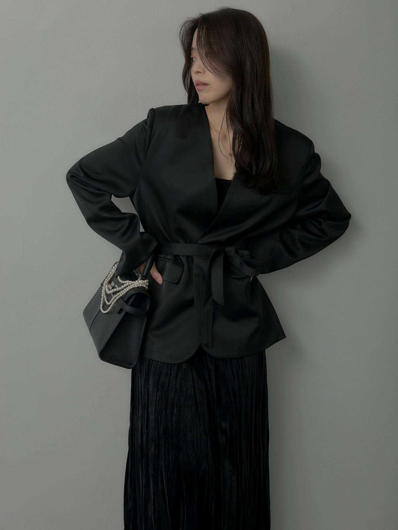 【SET】ノーカラーサテンジャケット+ベロアワッシャープリーツスカート(2set)