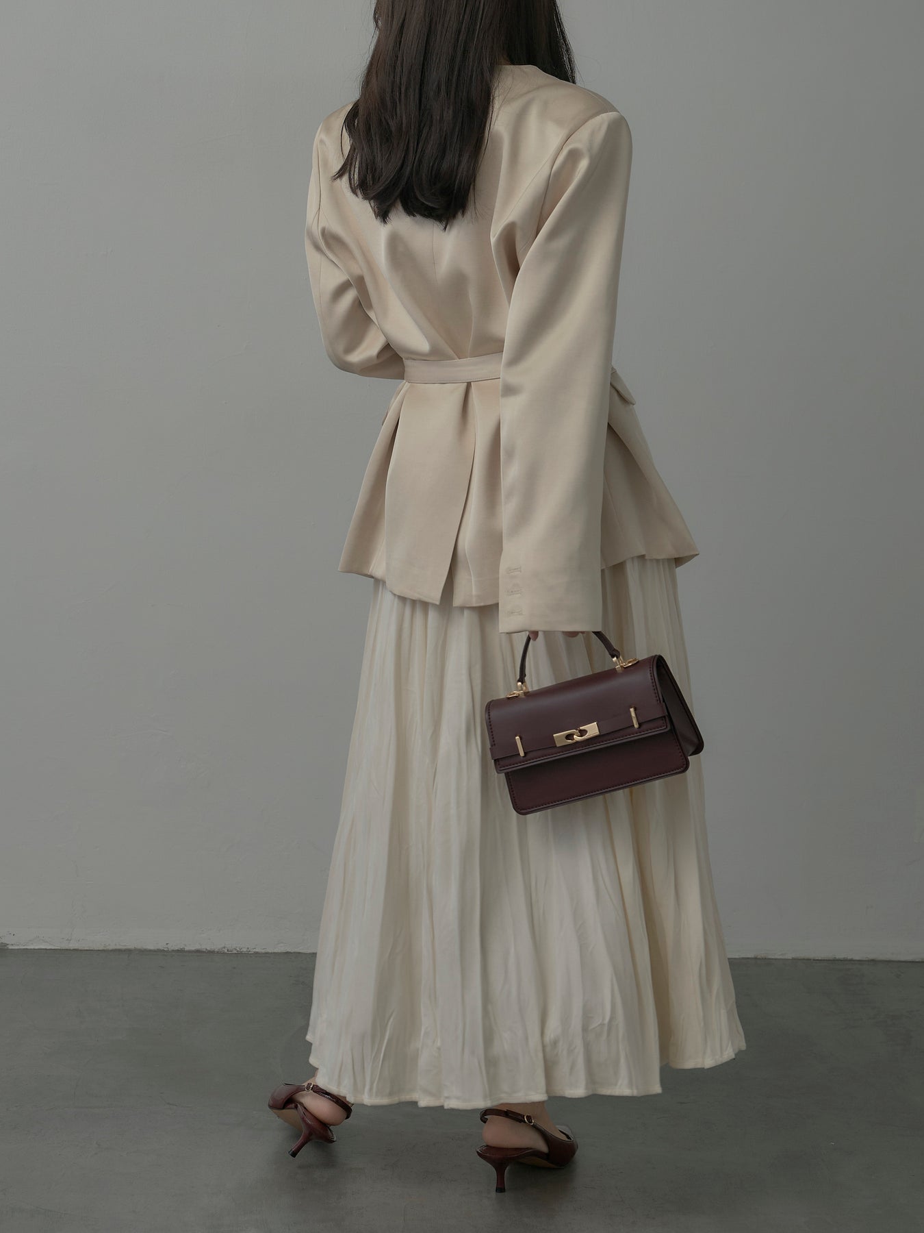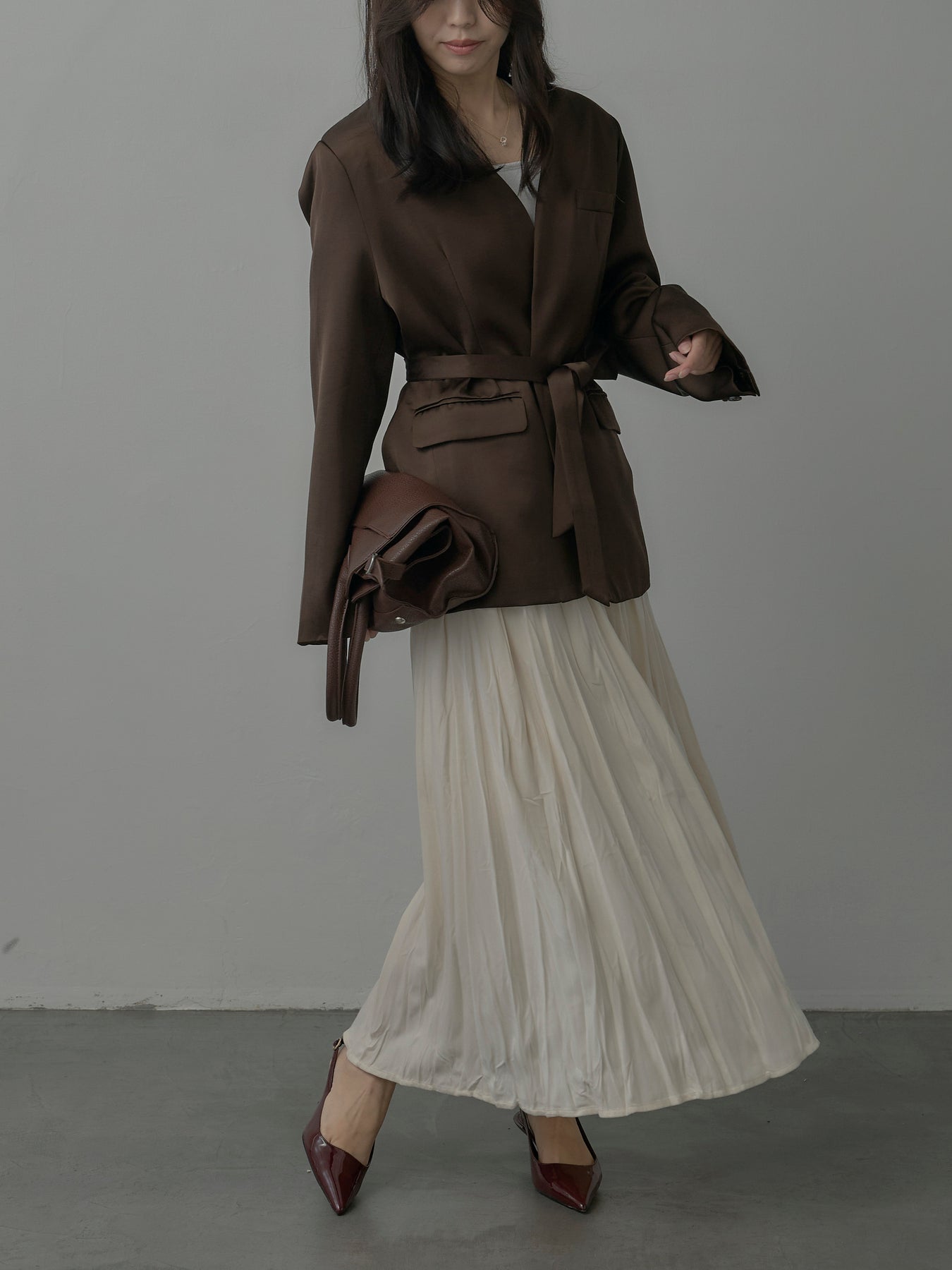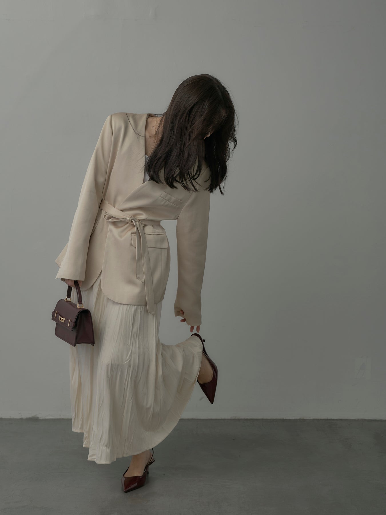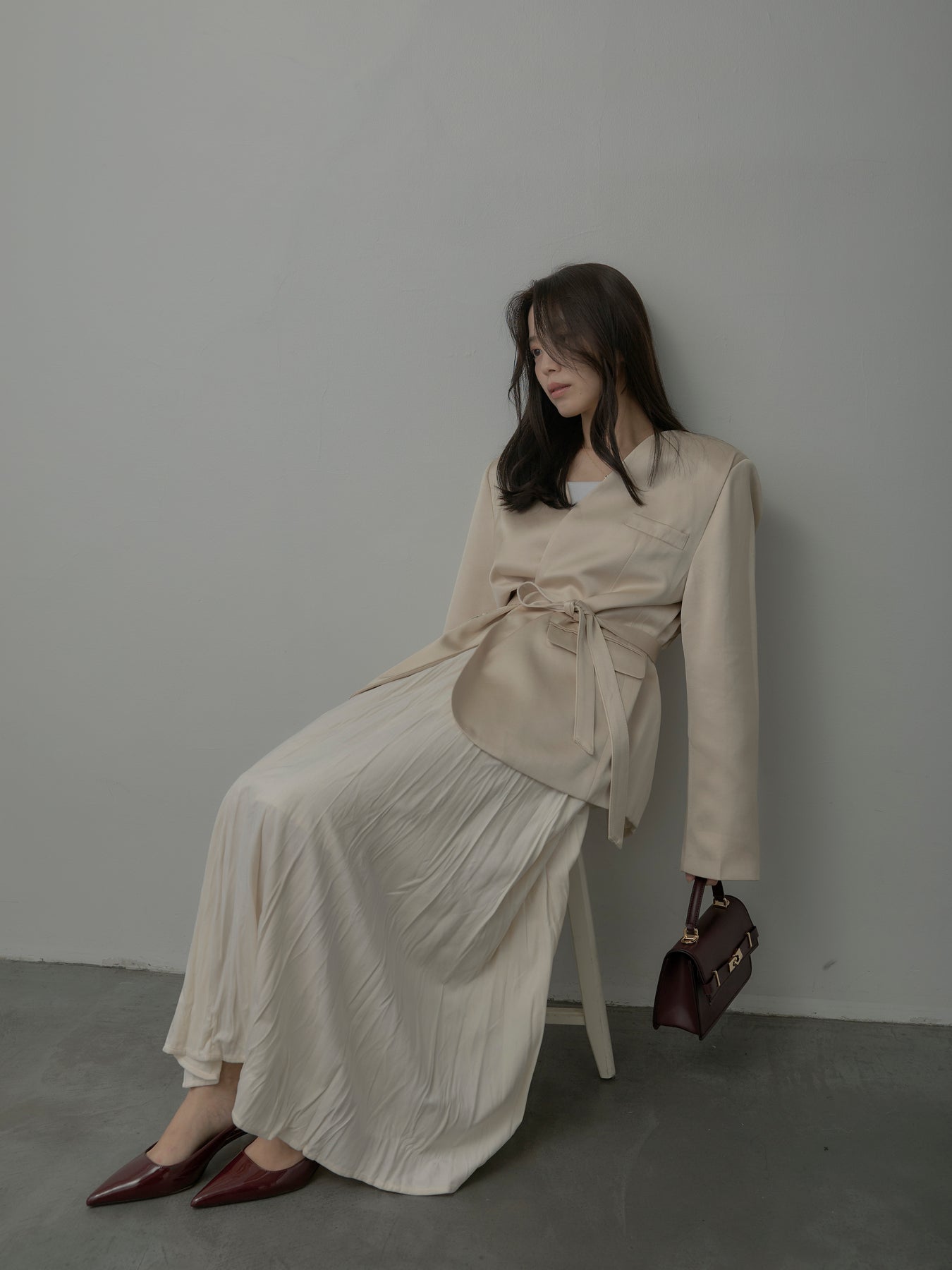 【SET】ノーカラーサテンジャケット+ベロアワッシャープリーツスカート(2set)