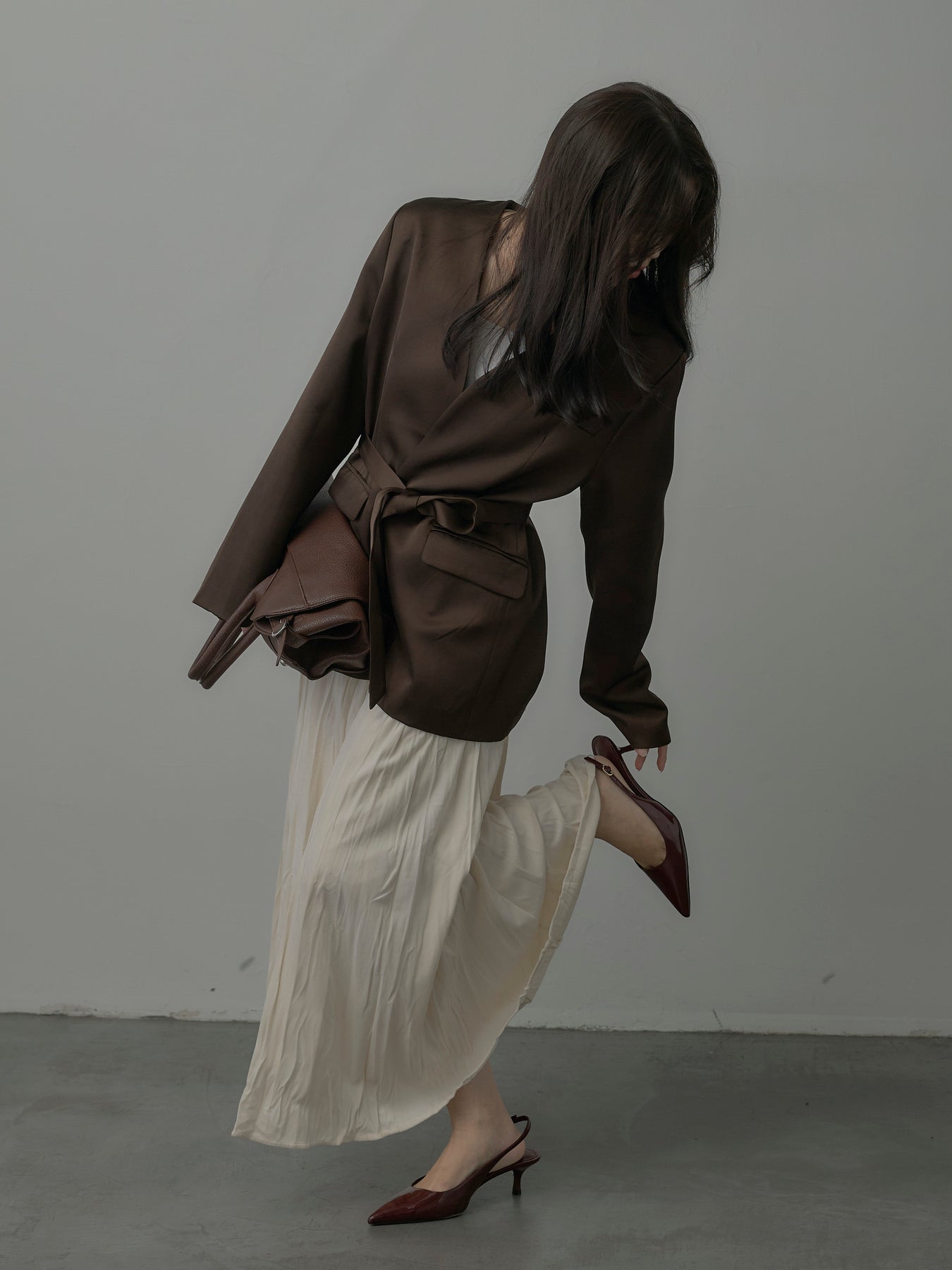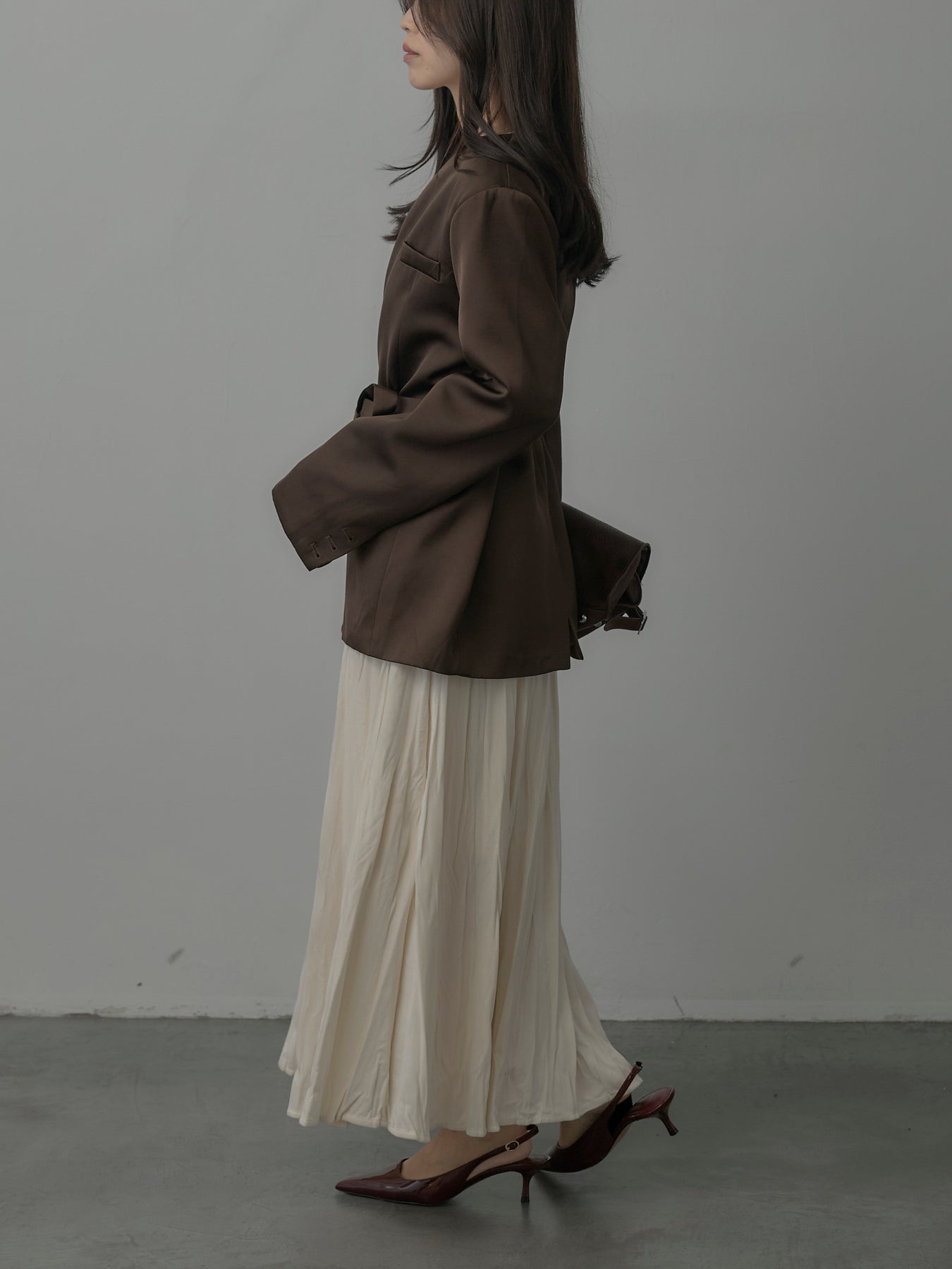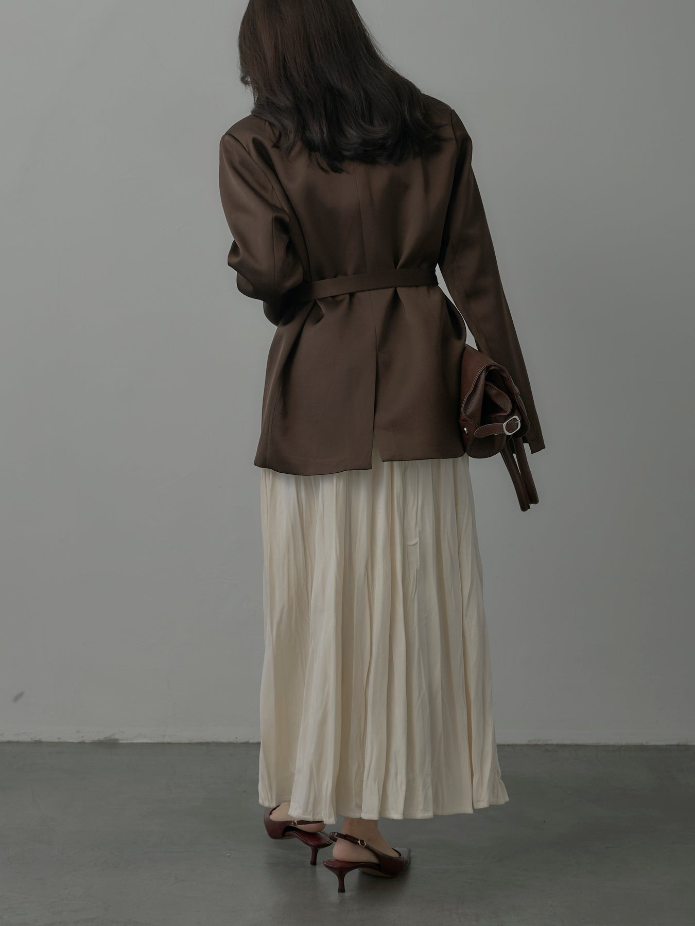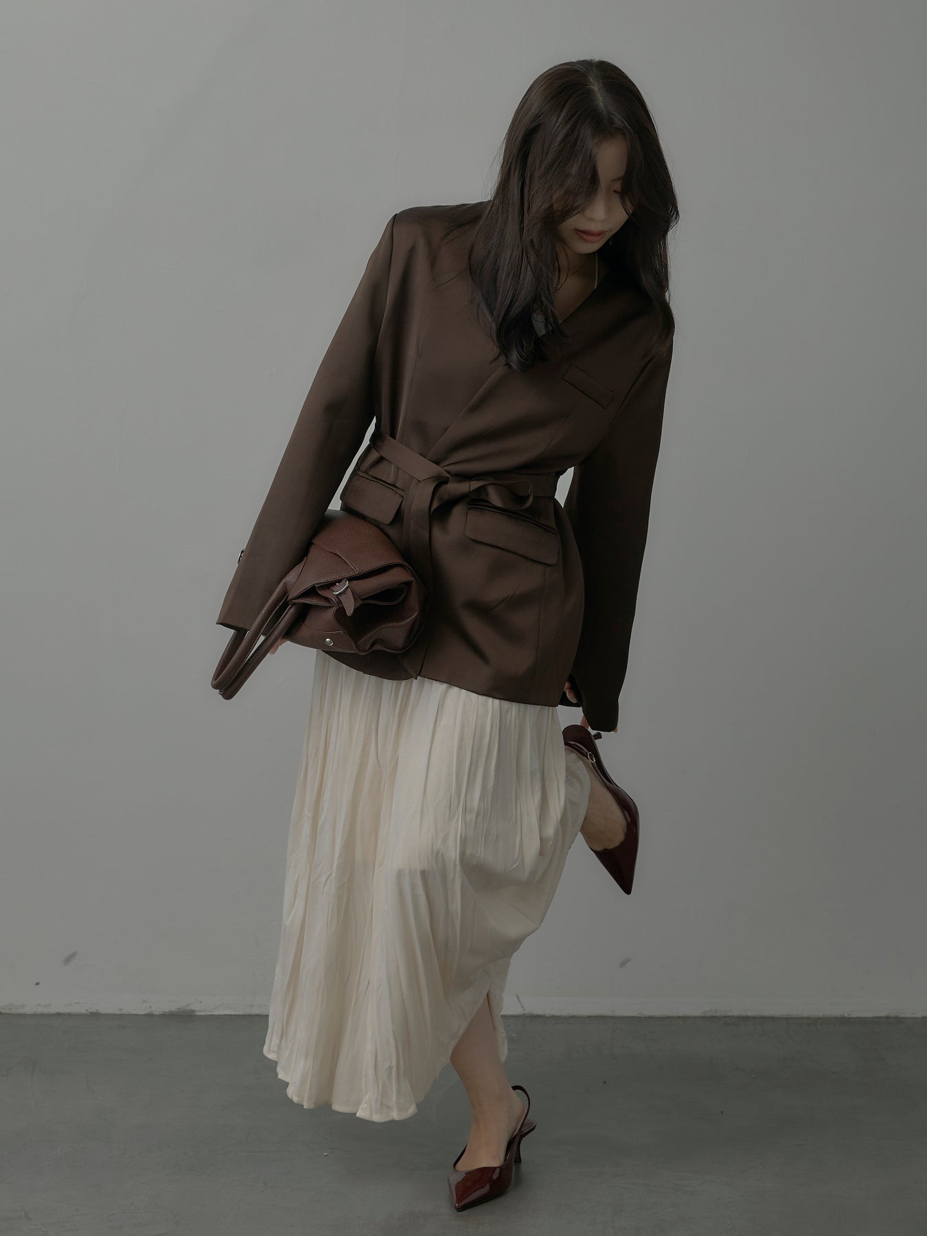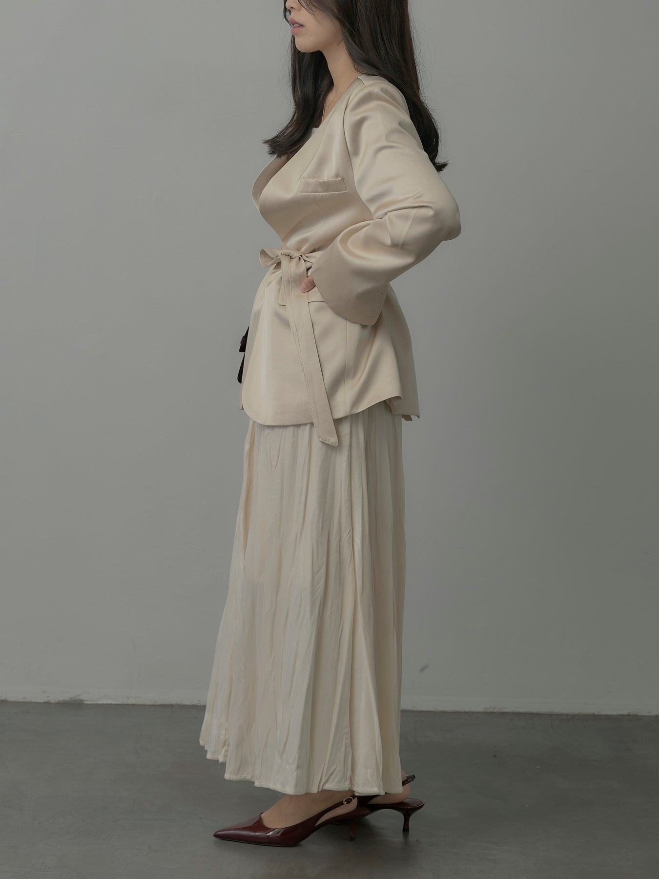 【SET】ノーカラーサテンジャケット+ベロアワッシャープリーツスカート(2set)