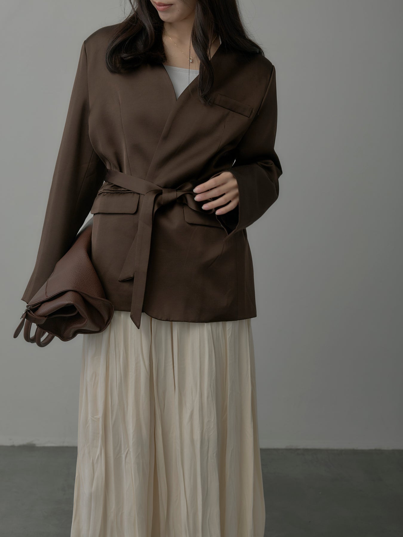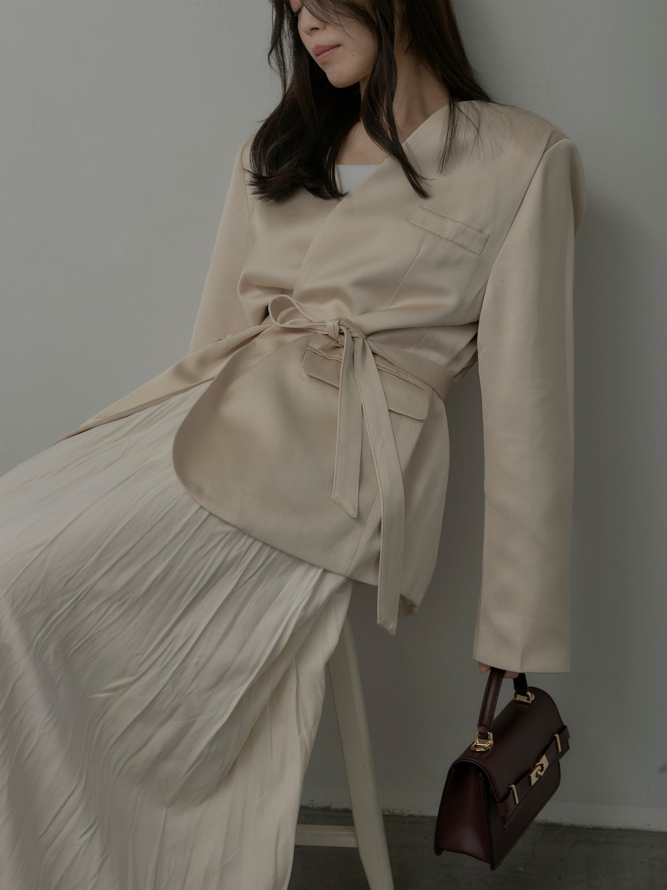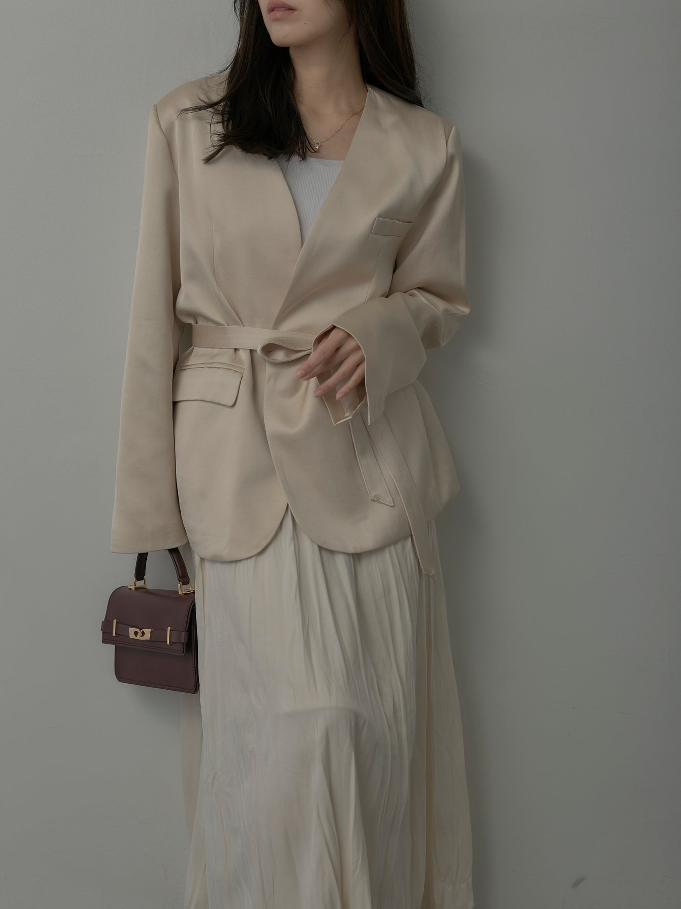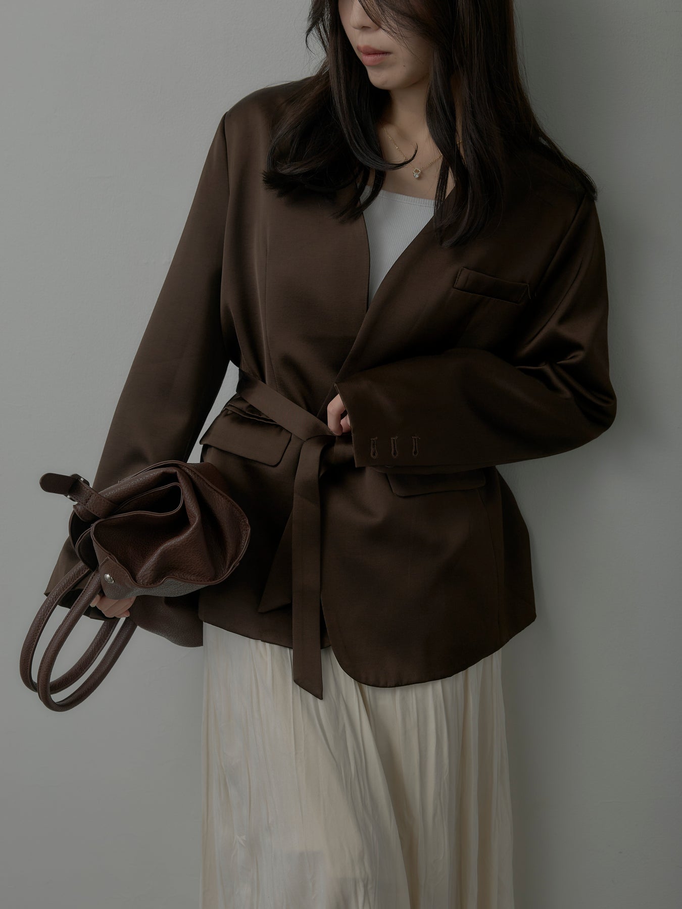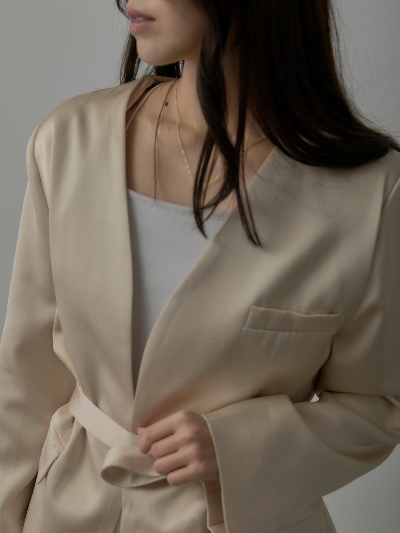 艶のあるサテン素材が上品なノーカラージャケット。 軽やかな落ち感としなやかな風合いが、洗練されたムードを漂わせます。 付属のベルトでウエストマークすれば、メリハリのあるシルエットを楽しめる一枚。