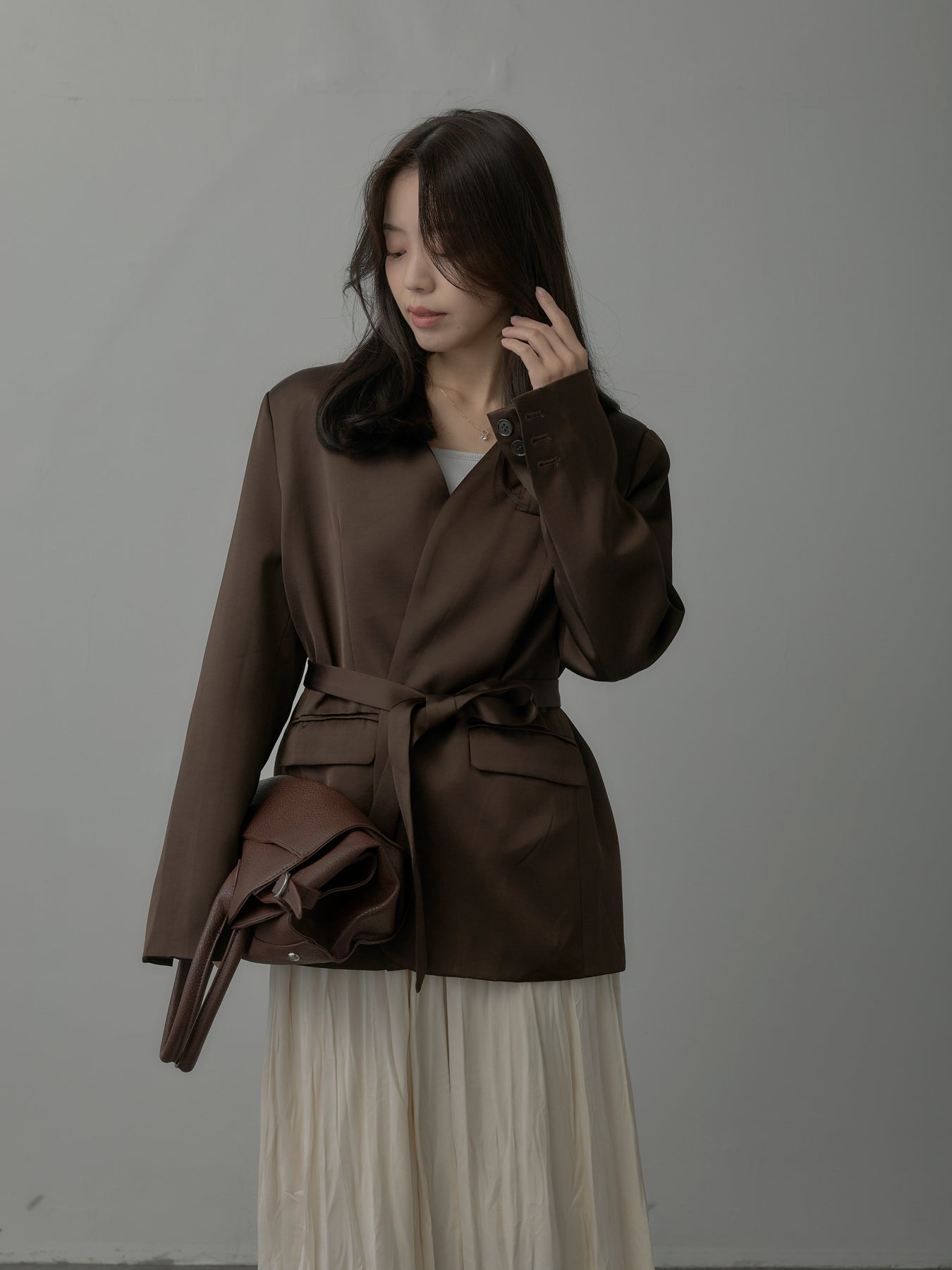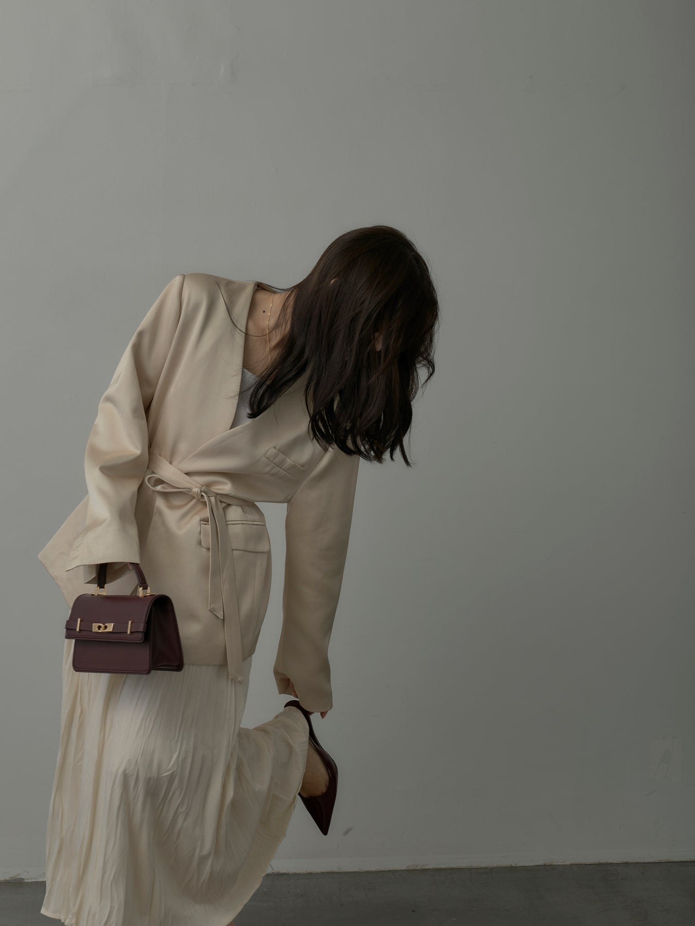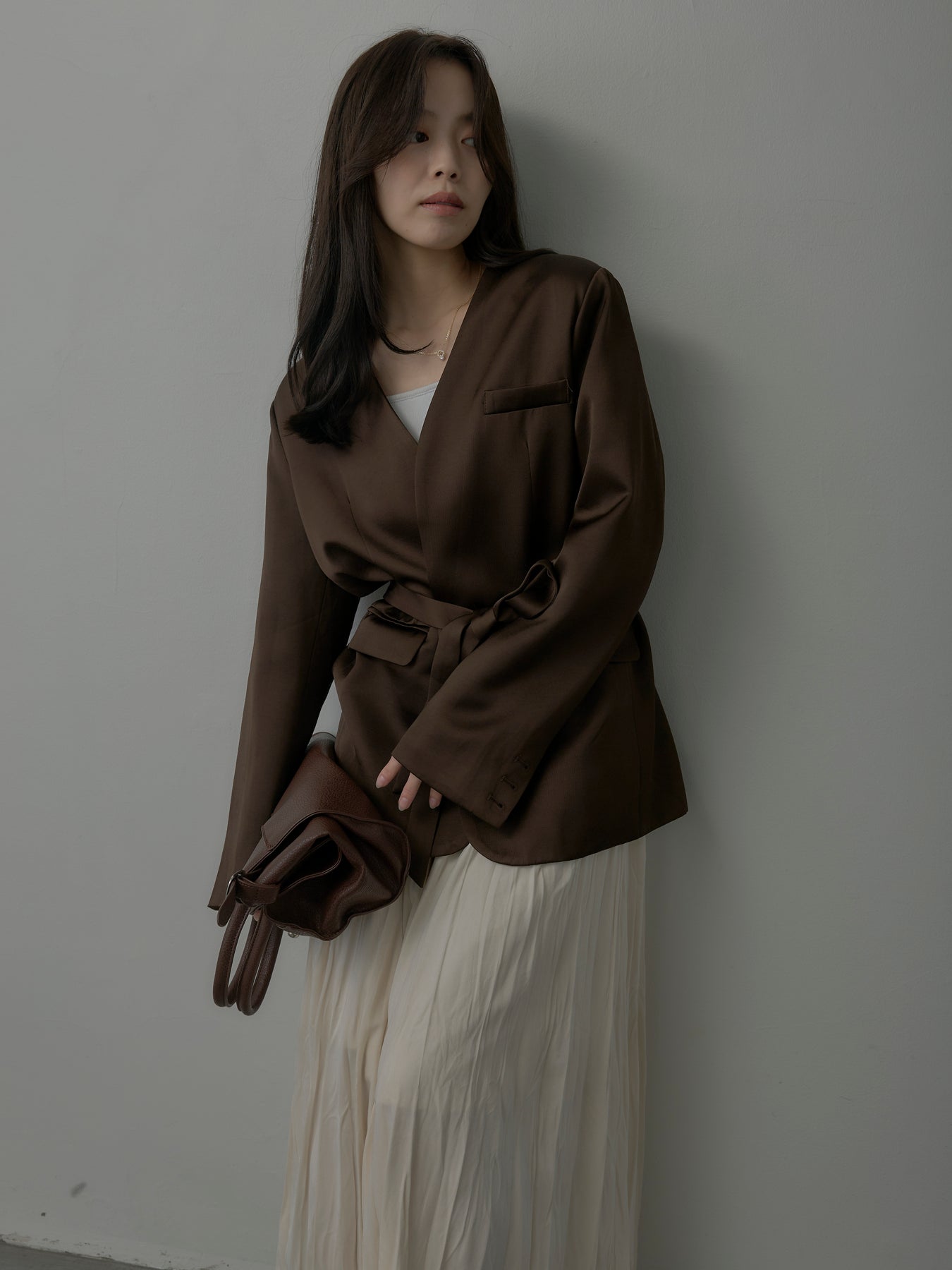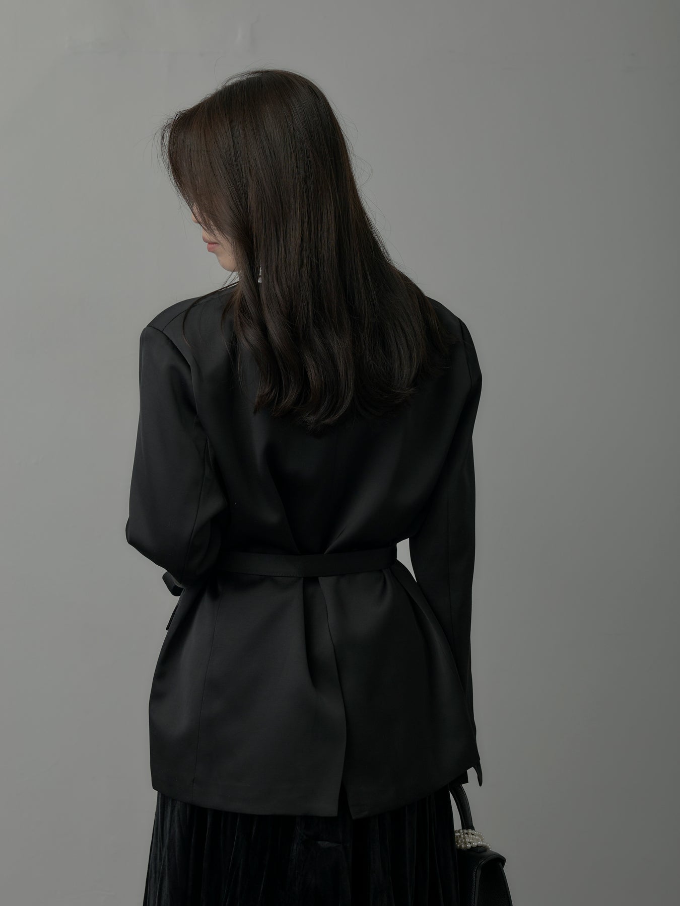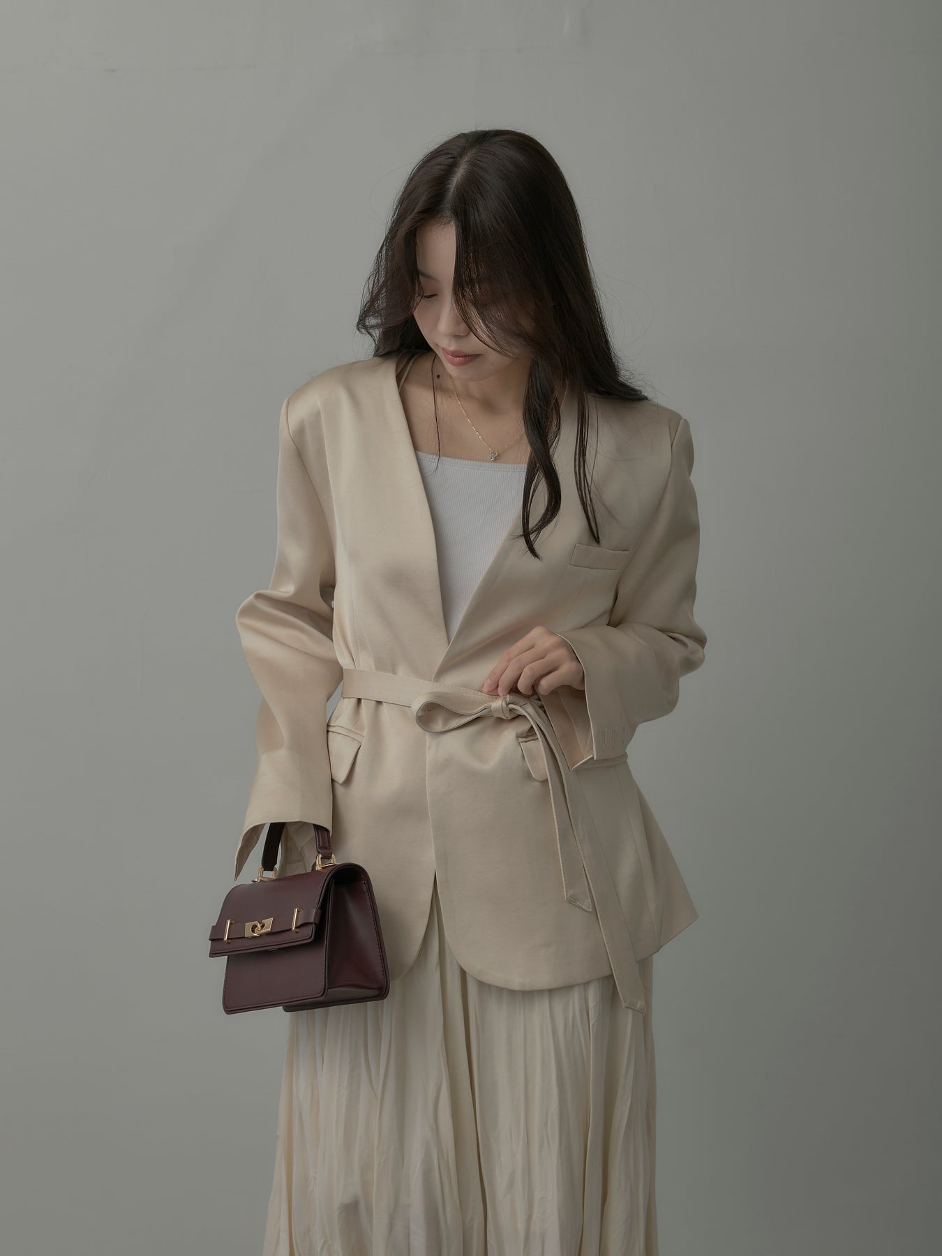 艶のあるサテン素材が上品なノーカラージャケット。 軽やかな落ち感としなやかな風合いが、洗練されたムードを漂わせます。 付属のベルトでウエストマークすれば、メリハリのあるシルエットを楽しめる一枚。